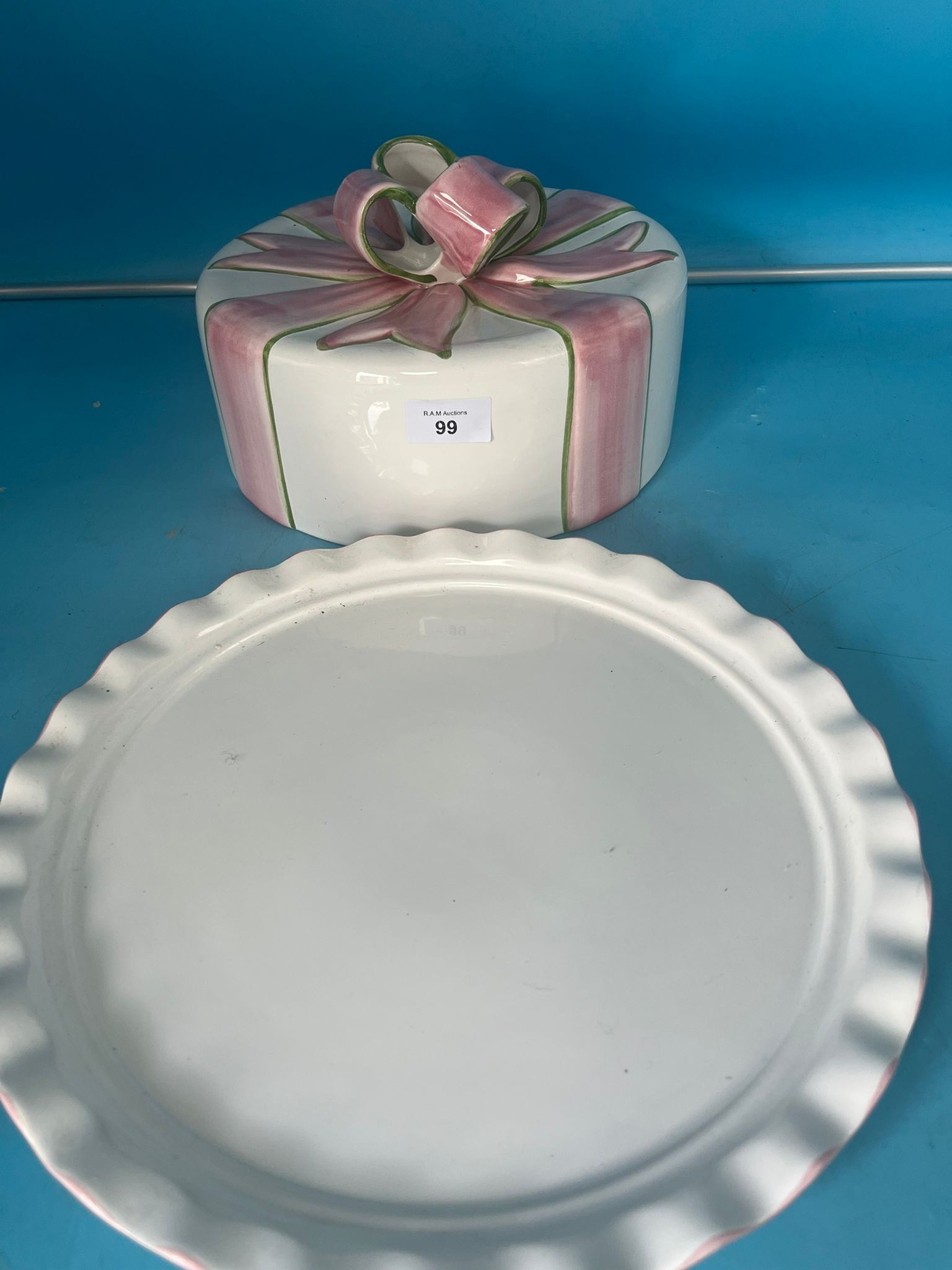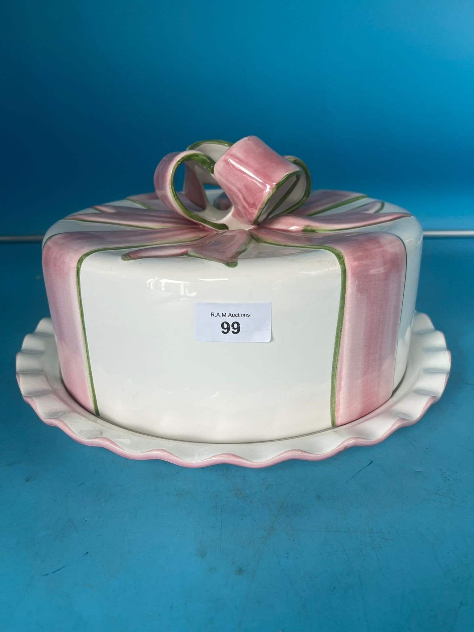 White ceramic cake dome and base shaped like a gift, with pink and green stripes and a pink bow.