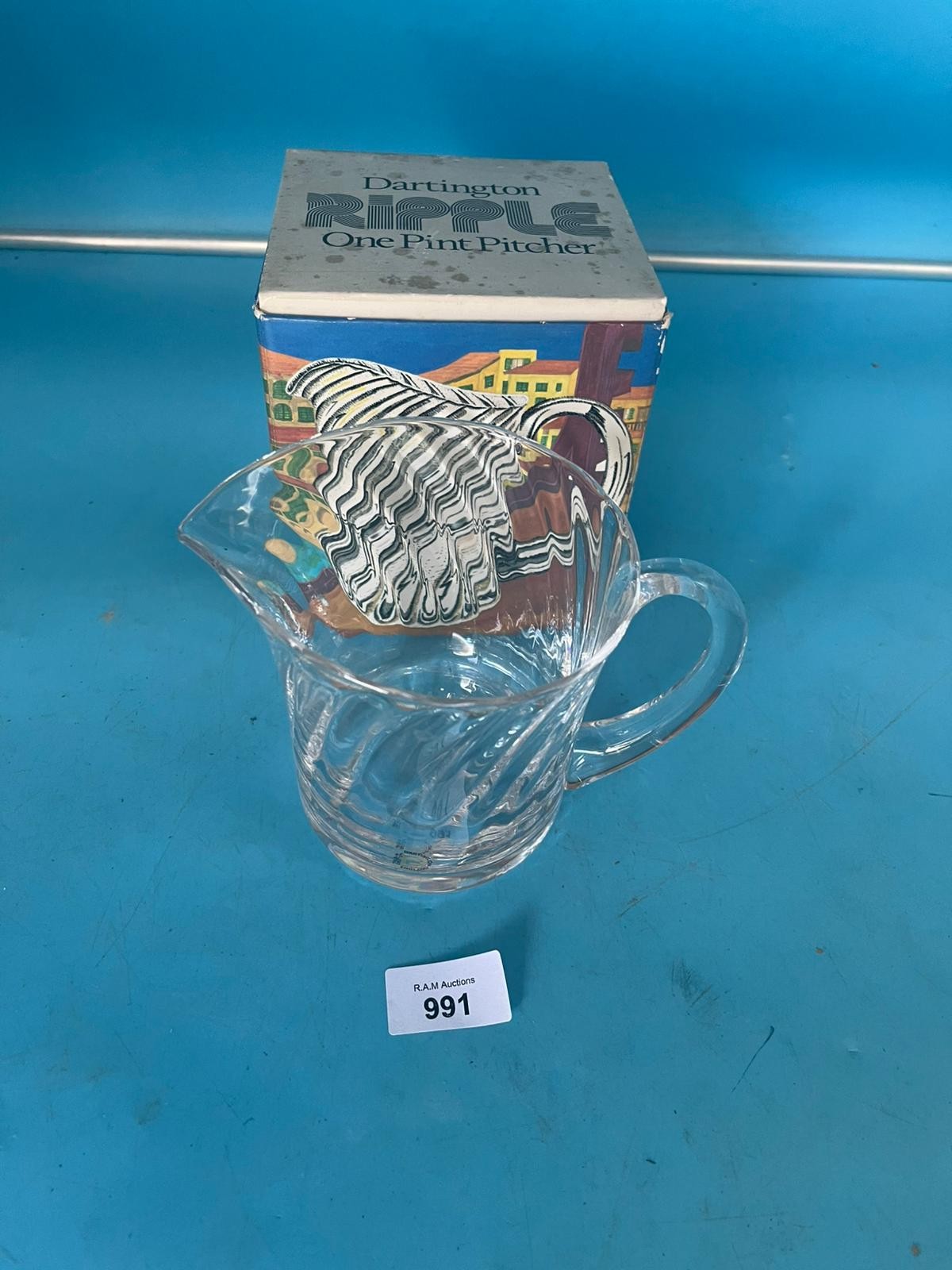 Clear glass pitcher with swirling ribbed pattern and C-shaped handle.