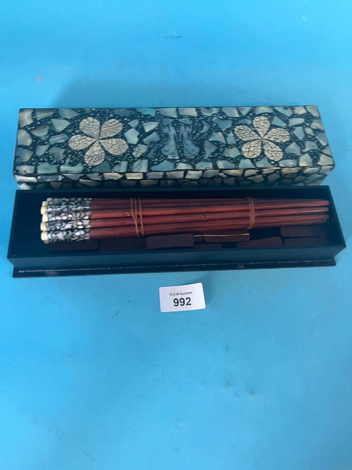 Dark wood chopsticks with inlays and matching rests in a mosaic-patterned box.