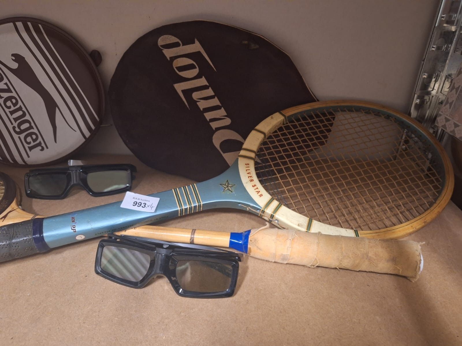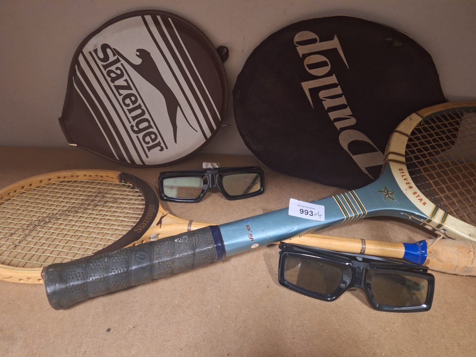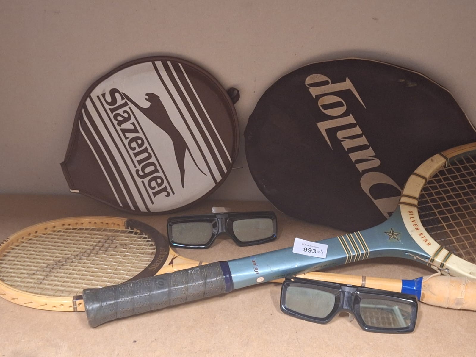 Lot includes Slazenger and Dunlop tennis racket covers, two wooden tennis rackets, and two pairs of 3D glasses.
