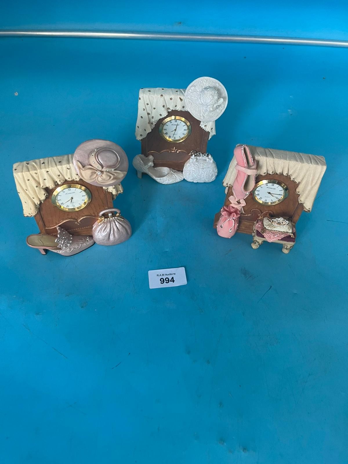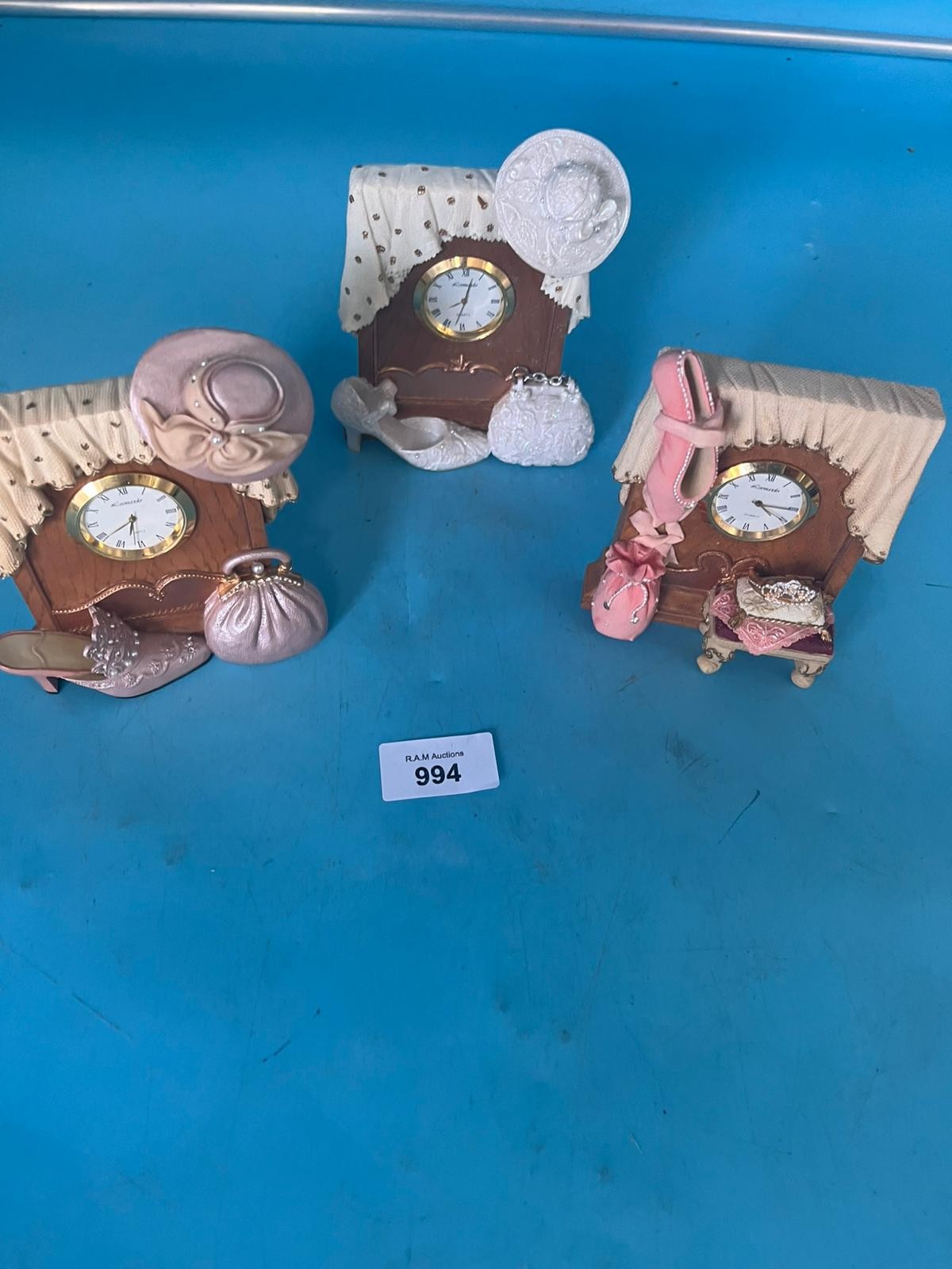 Miniature clock figurines in cabinet shapes with polka dot drapes and decorative bases.