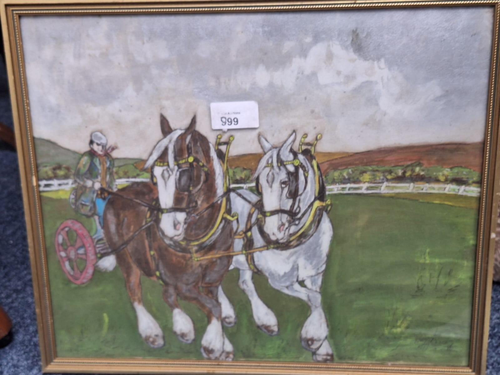 Framed artwork by Ray Parker depicting draft horses pulling a cart.