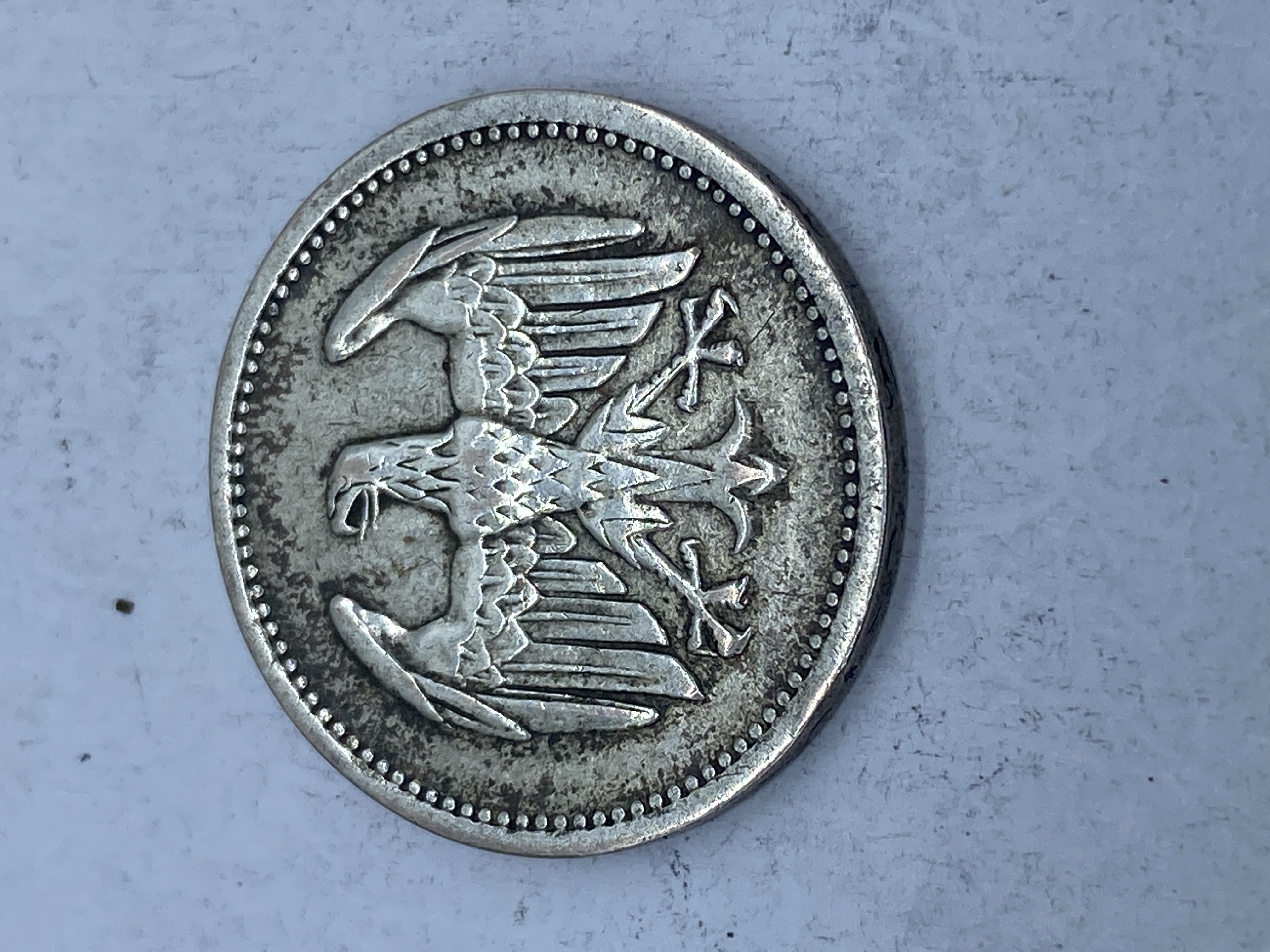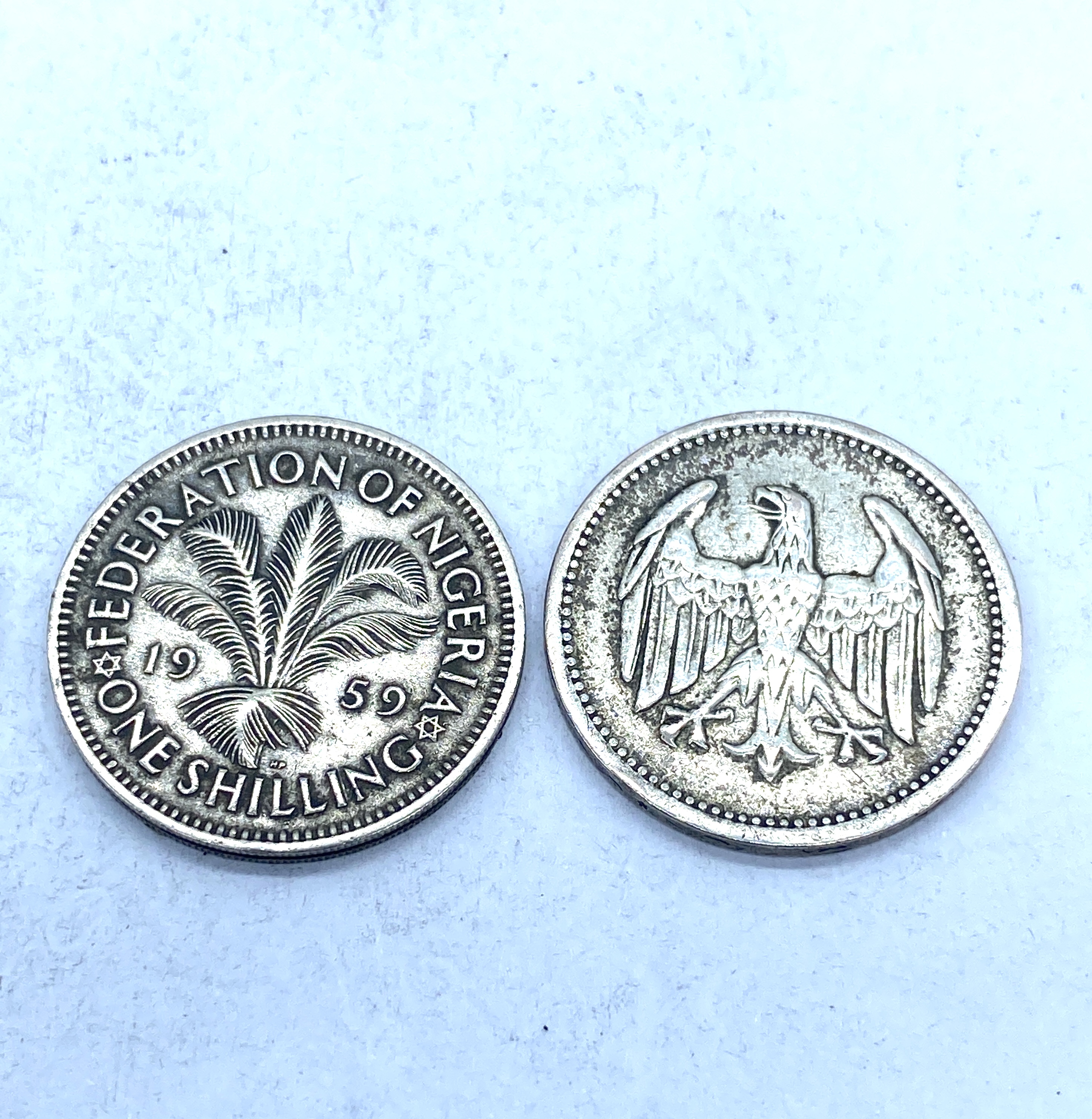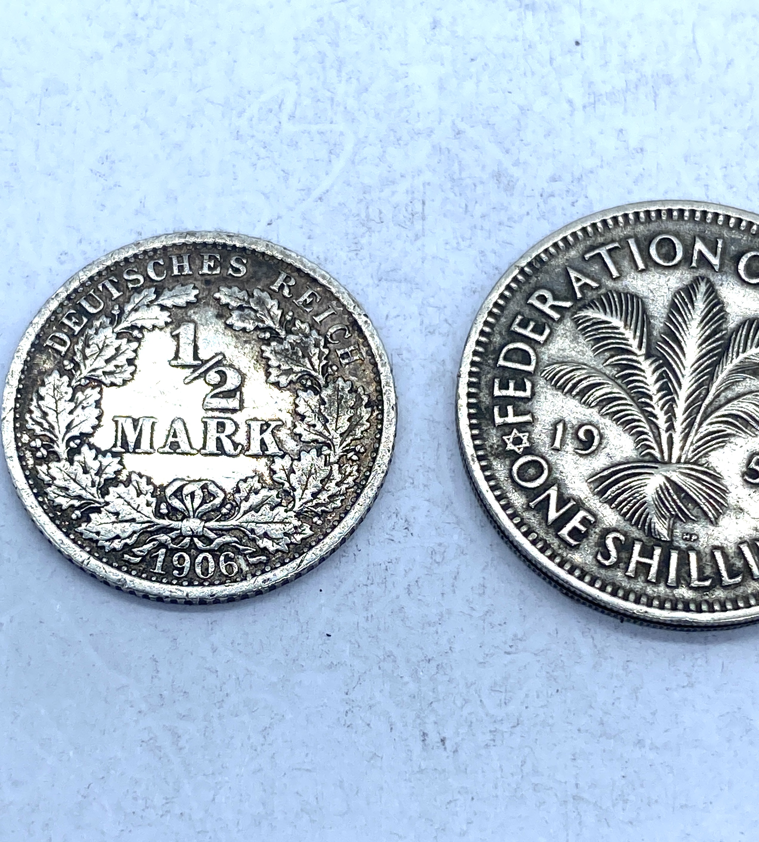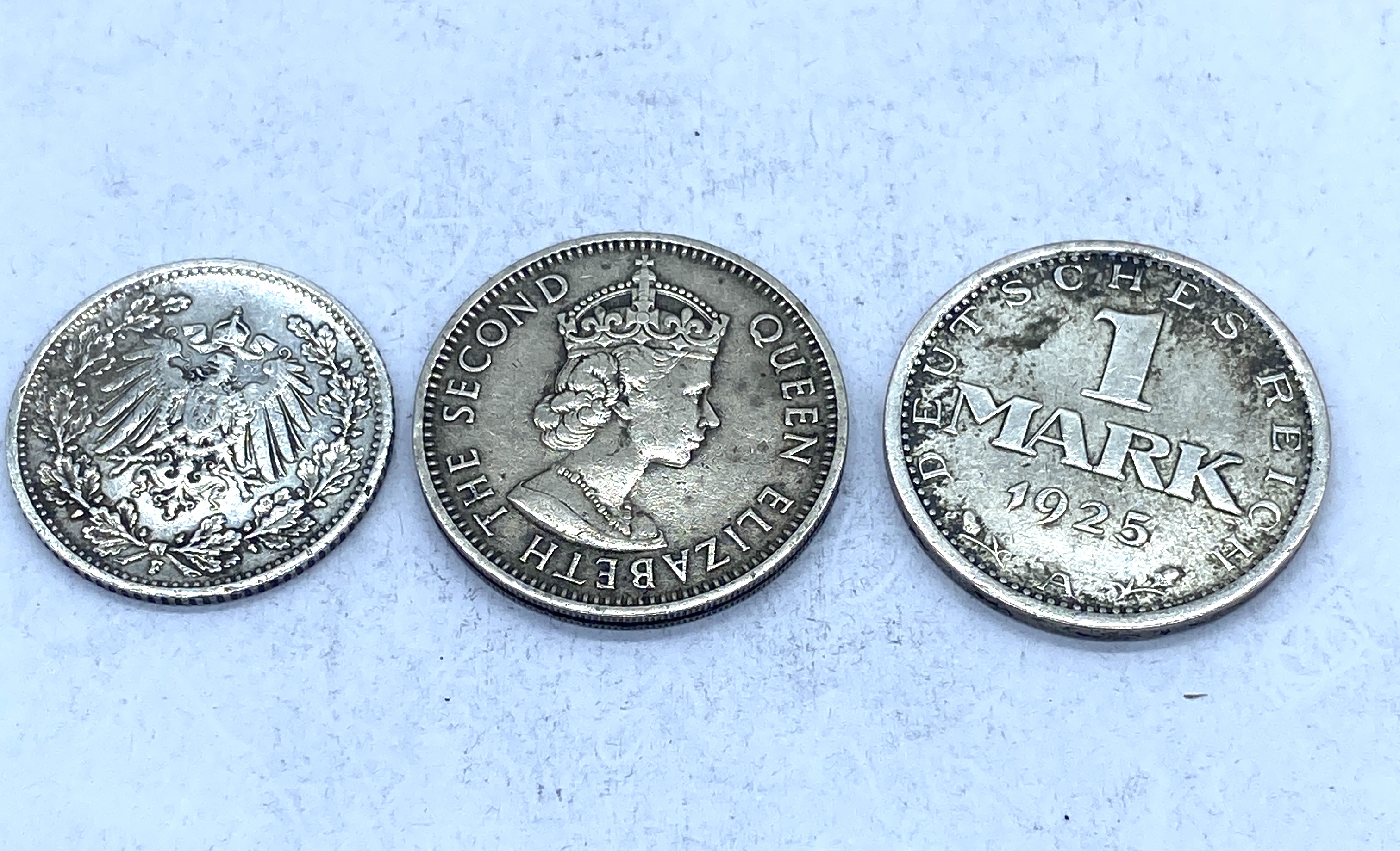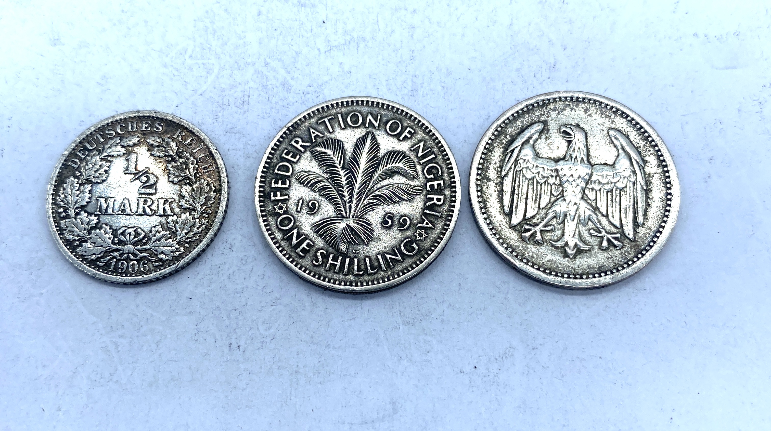 Collection of silver world coins including German, Nigerian, and a coin featuring Queen Elizabeth II.