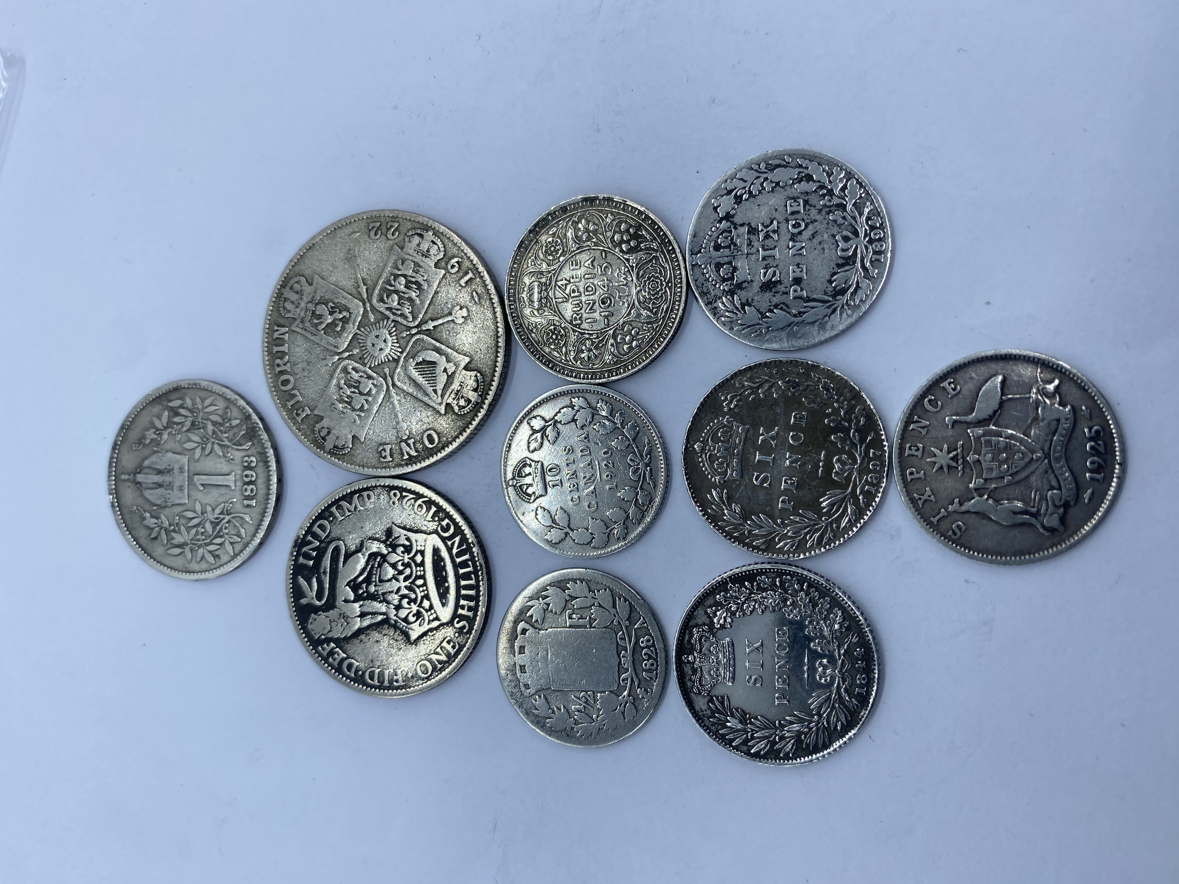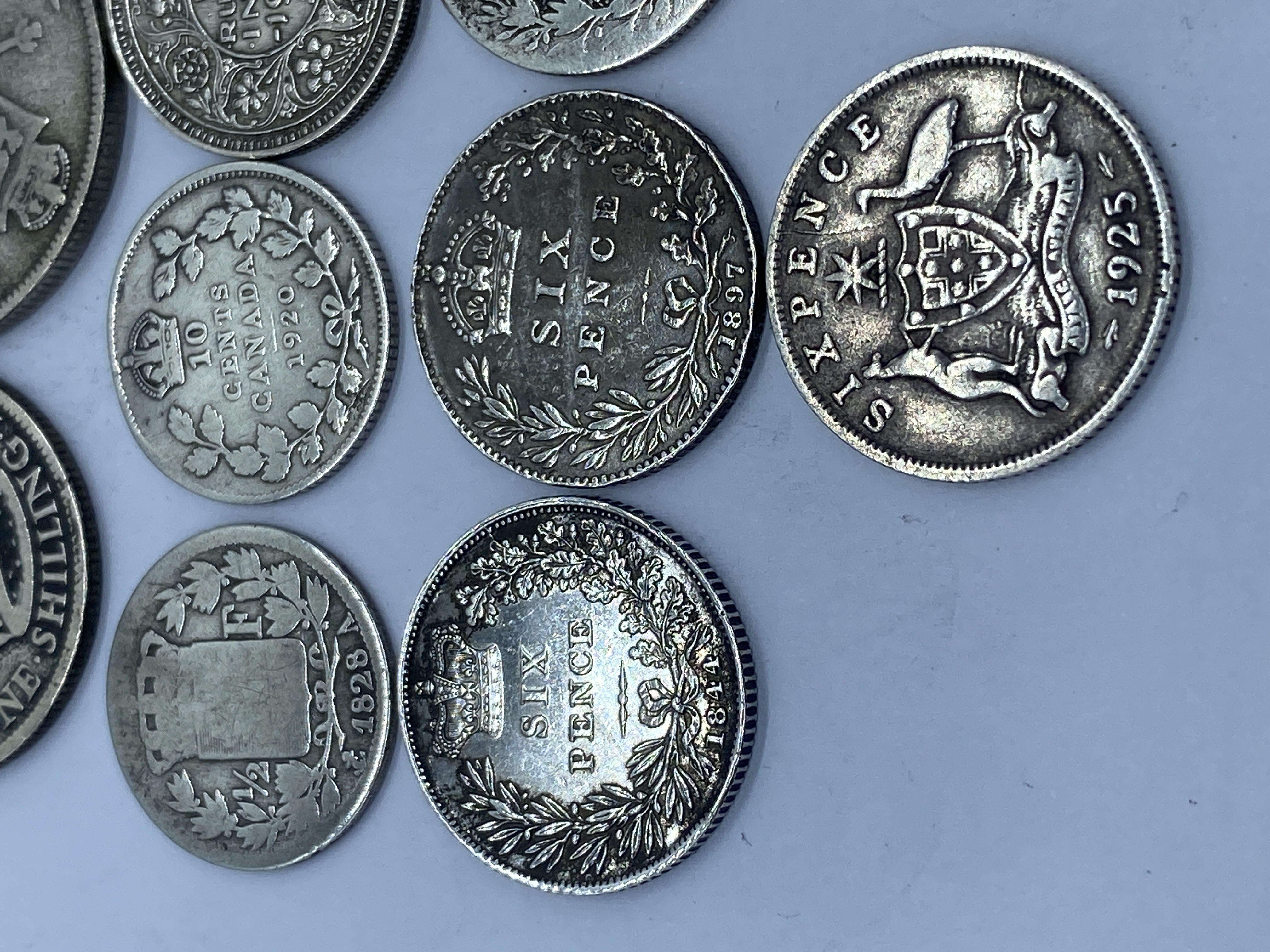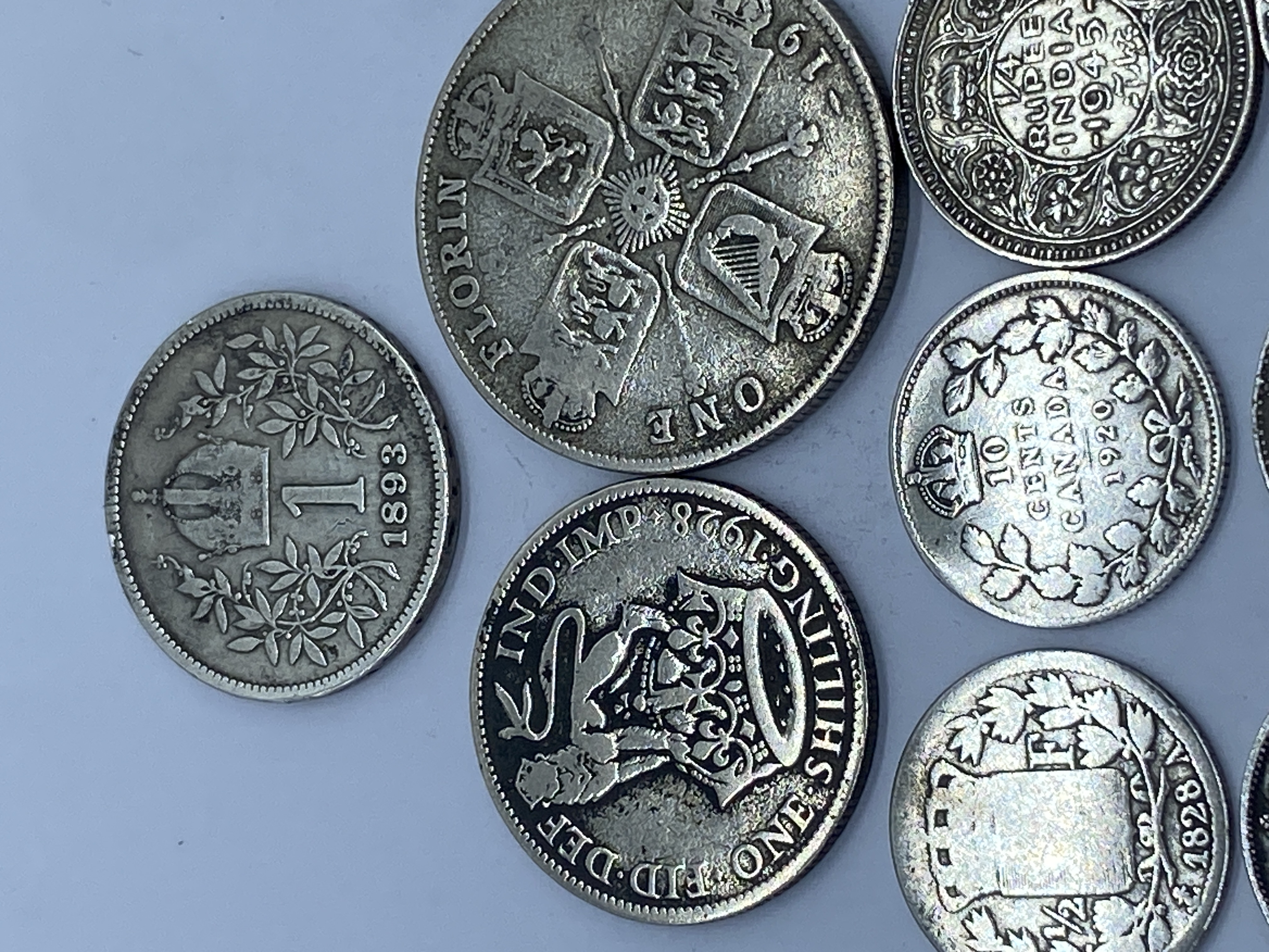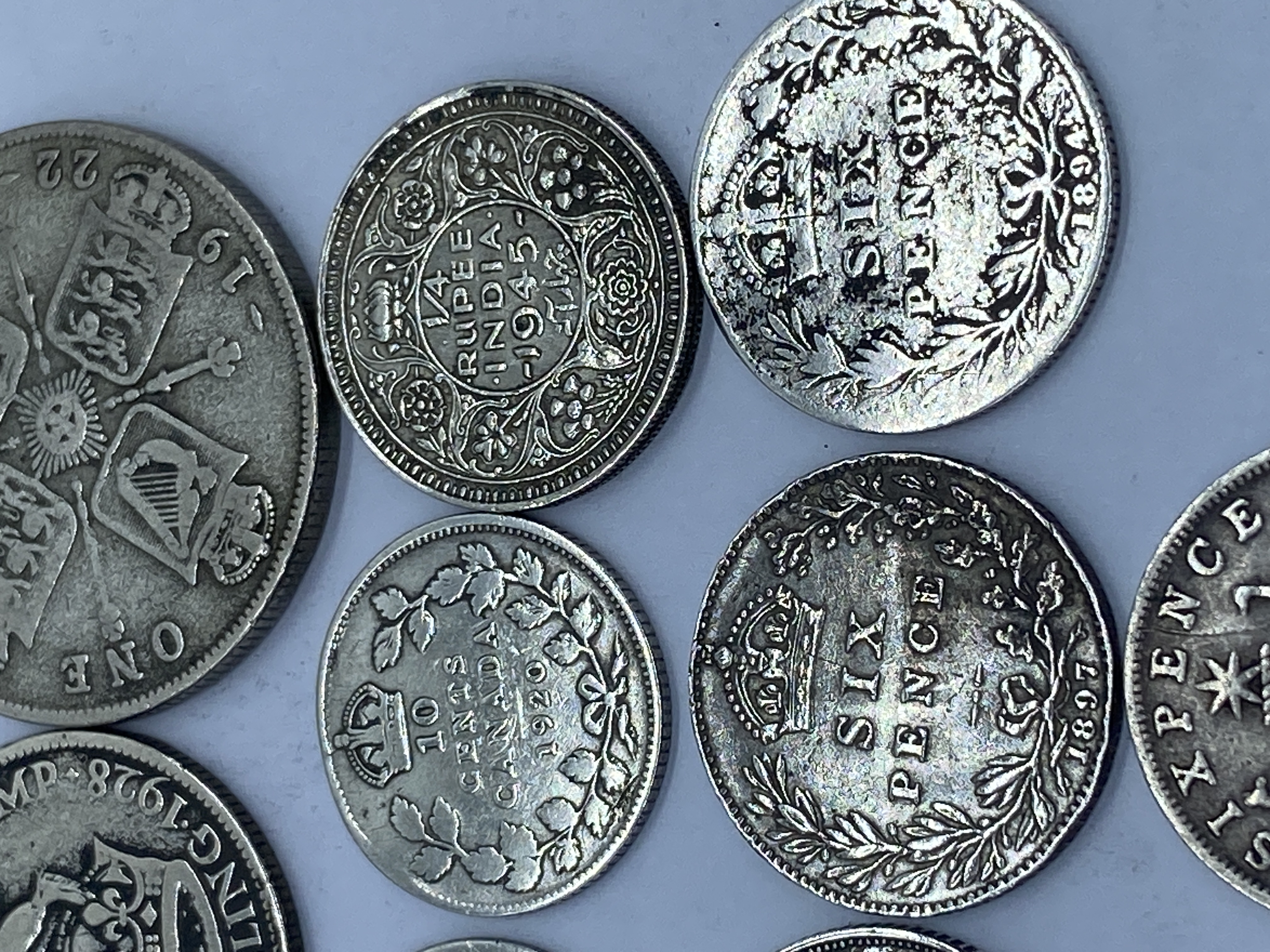 A collection of various silver coins, including Canadian dimes, British sixpence, and Indian rupees.