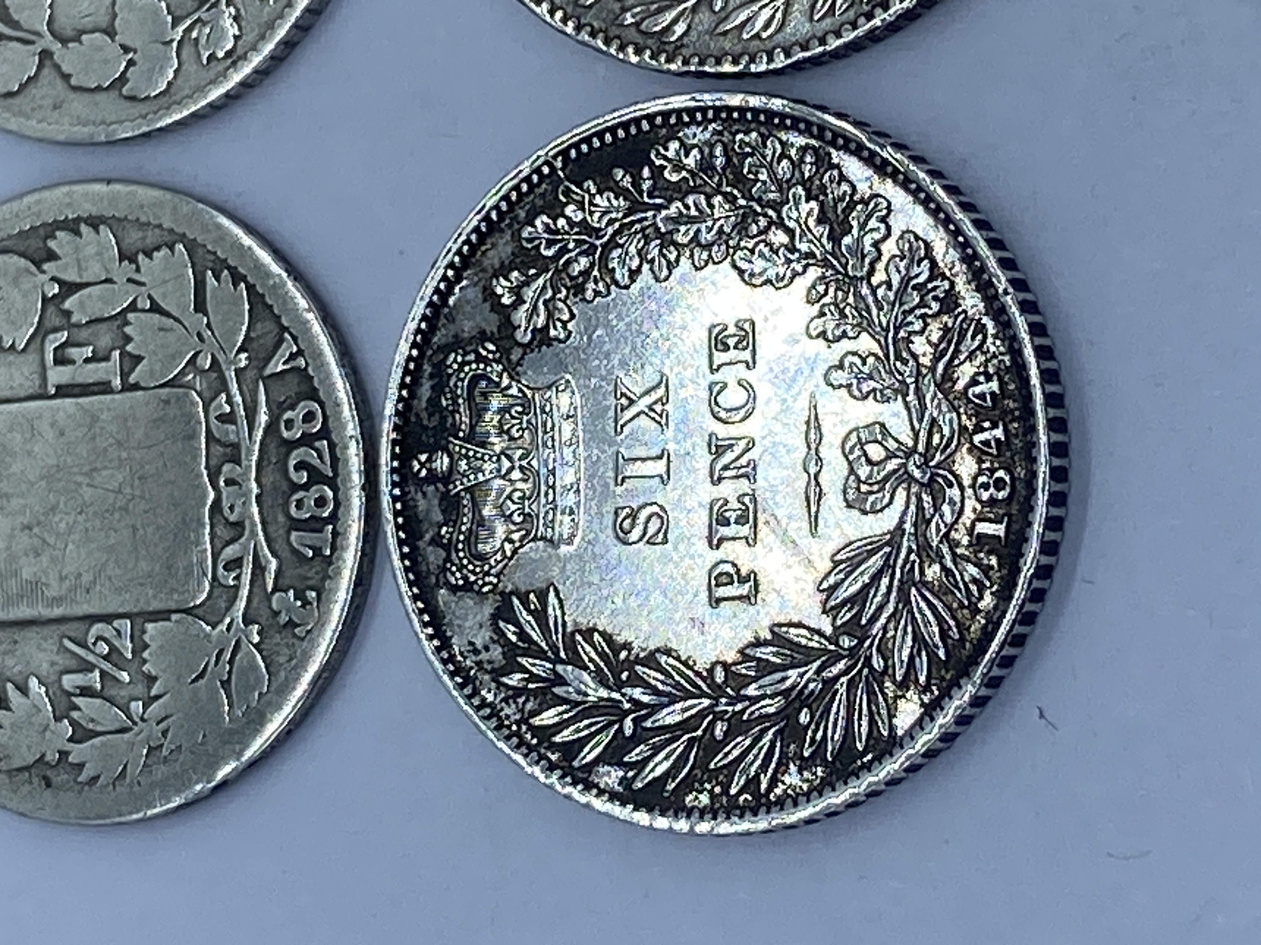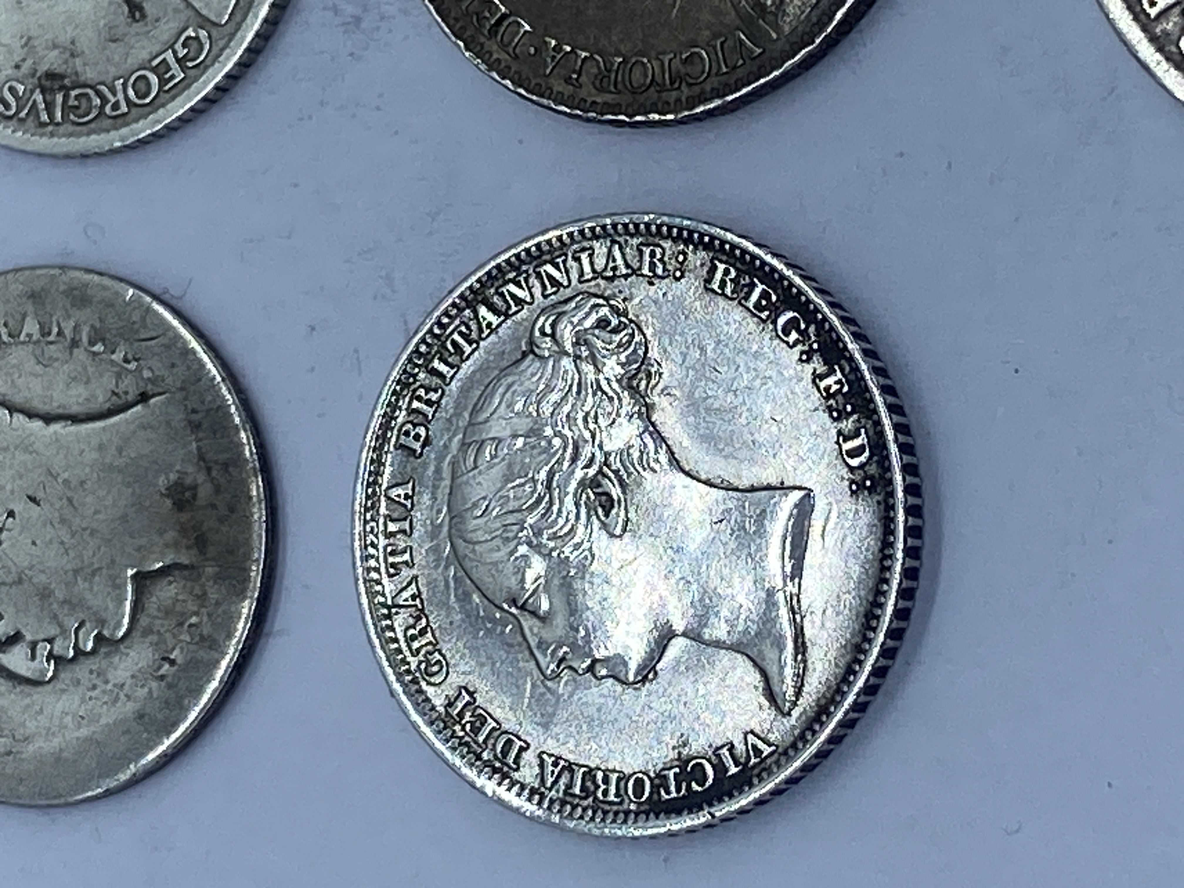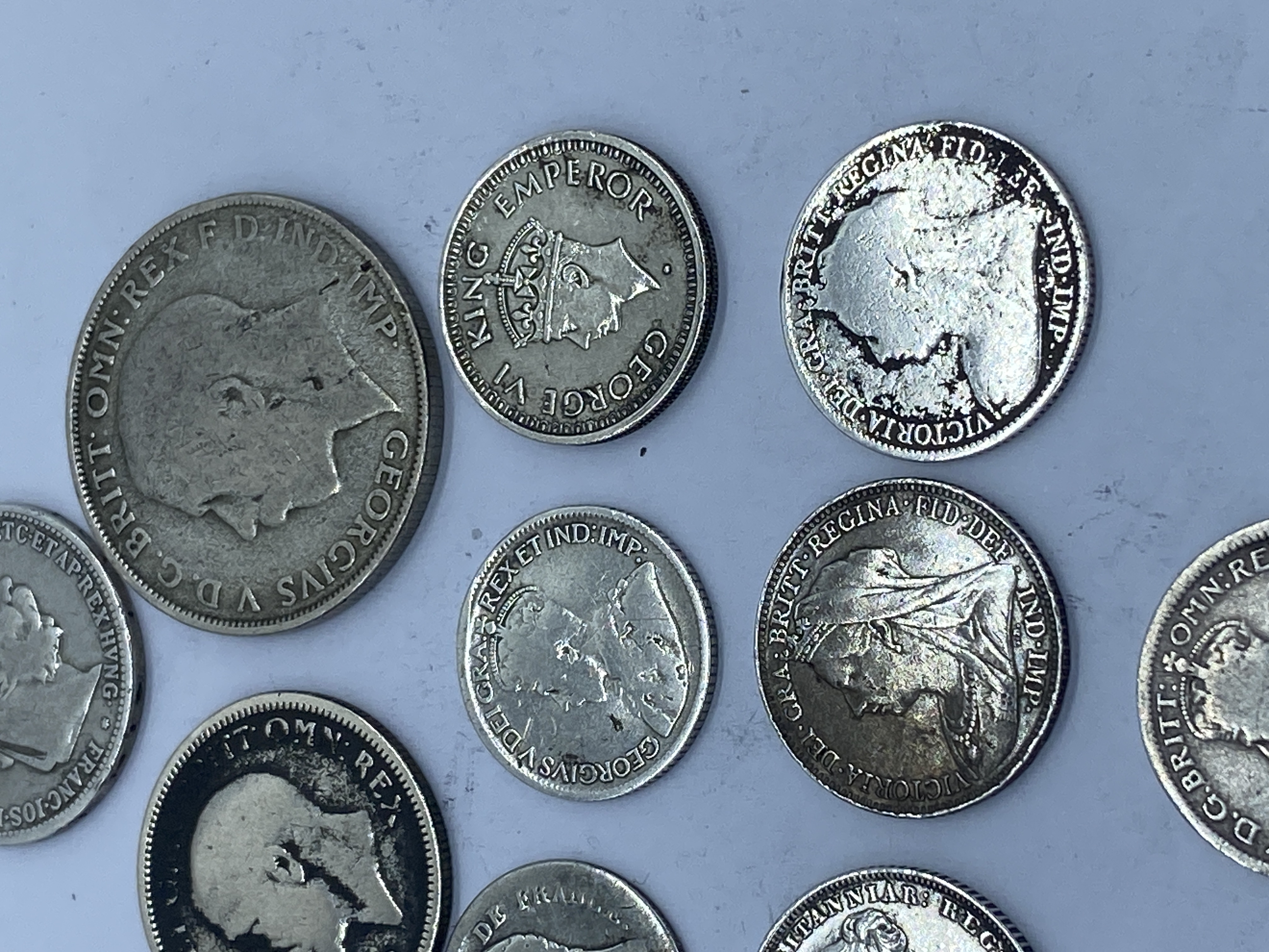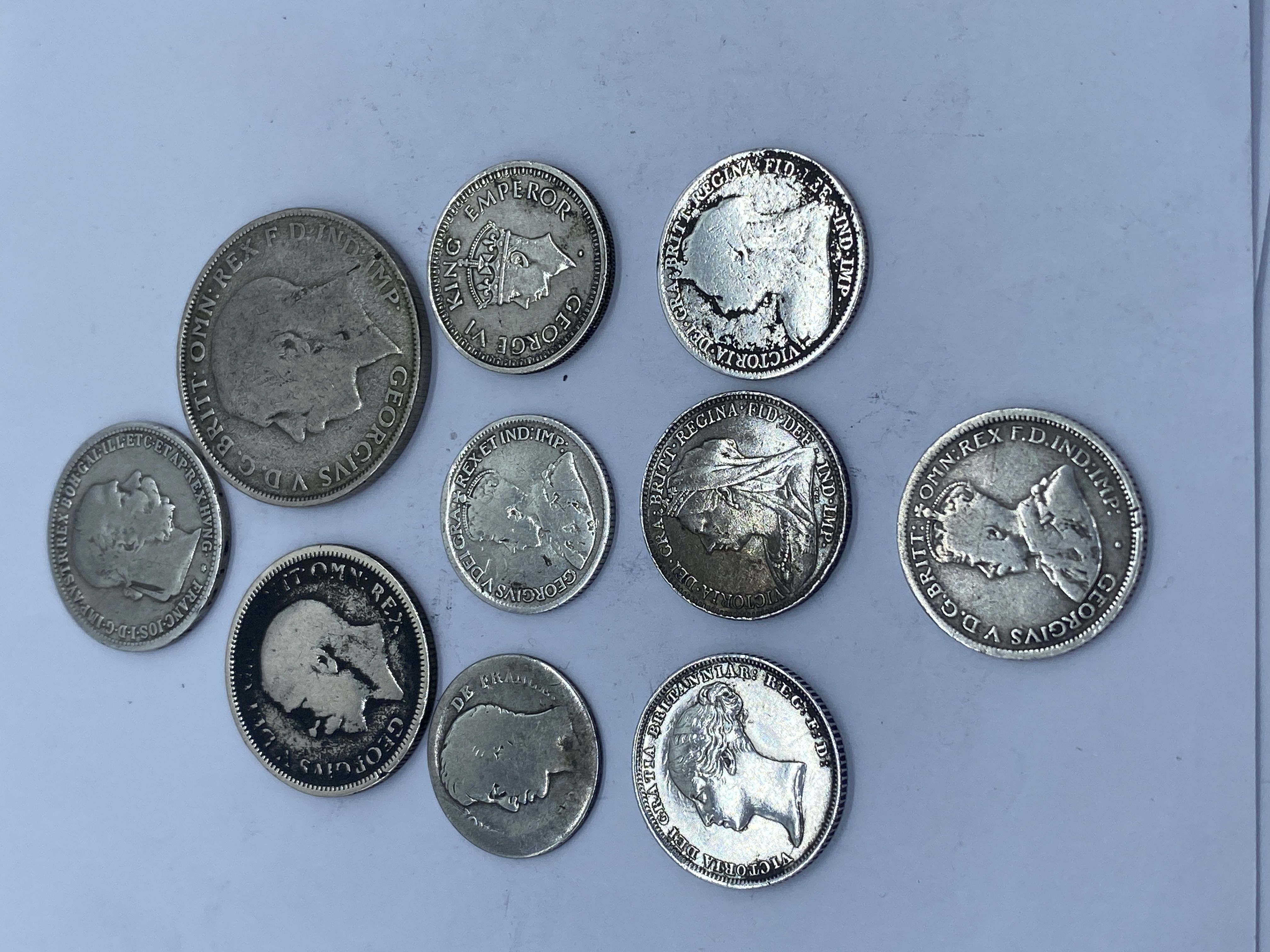 A collection of various silver coins, including Canadian dimes, British sixpence, and Indian rupees.