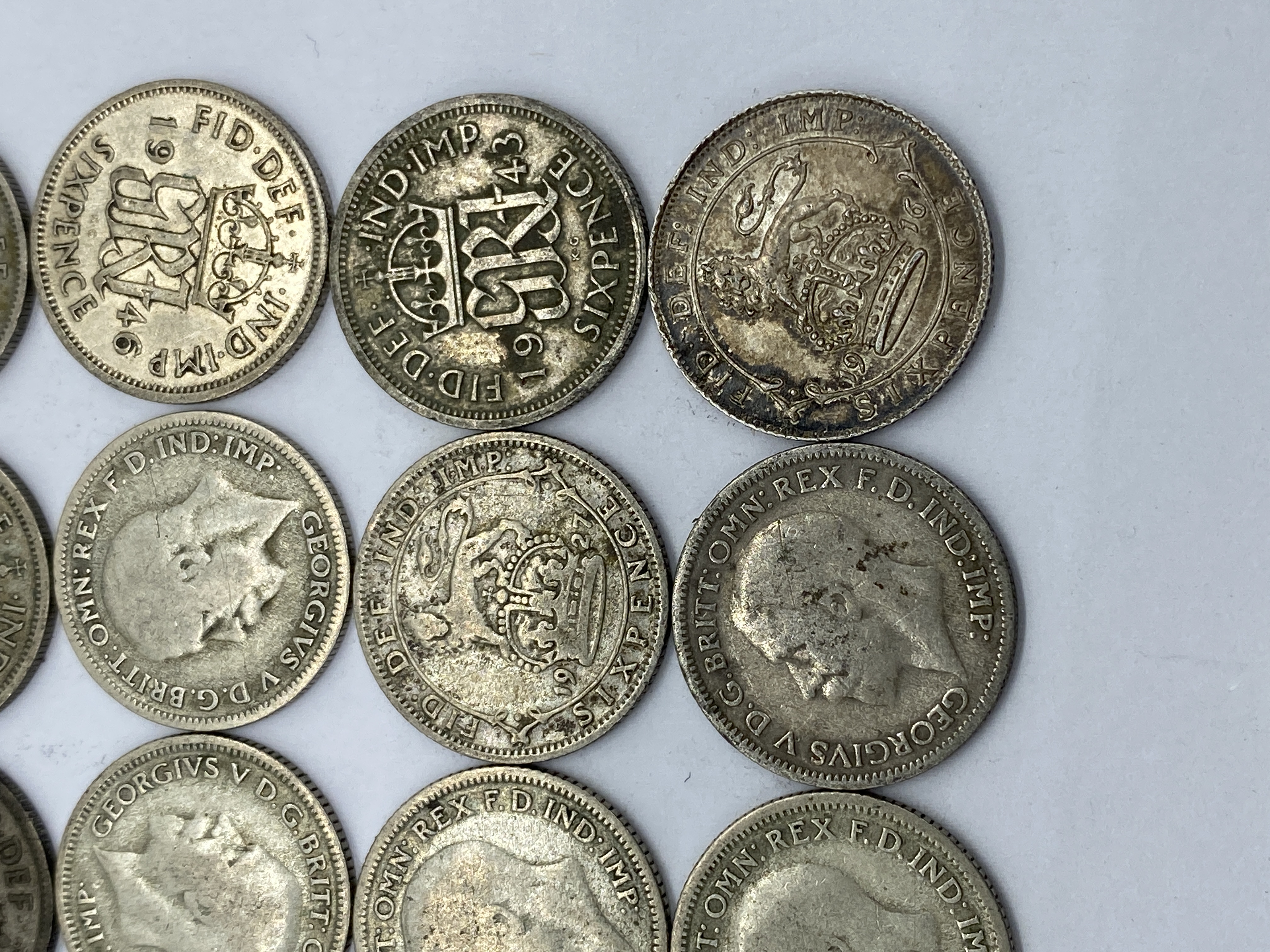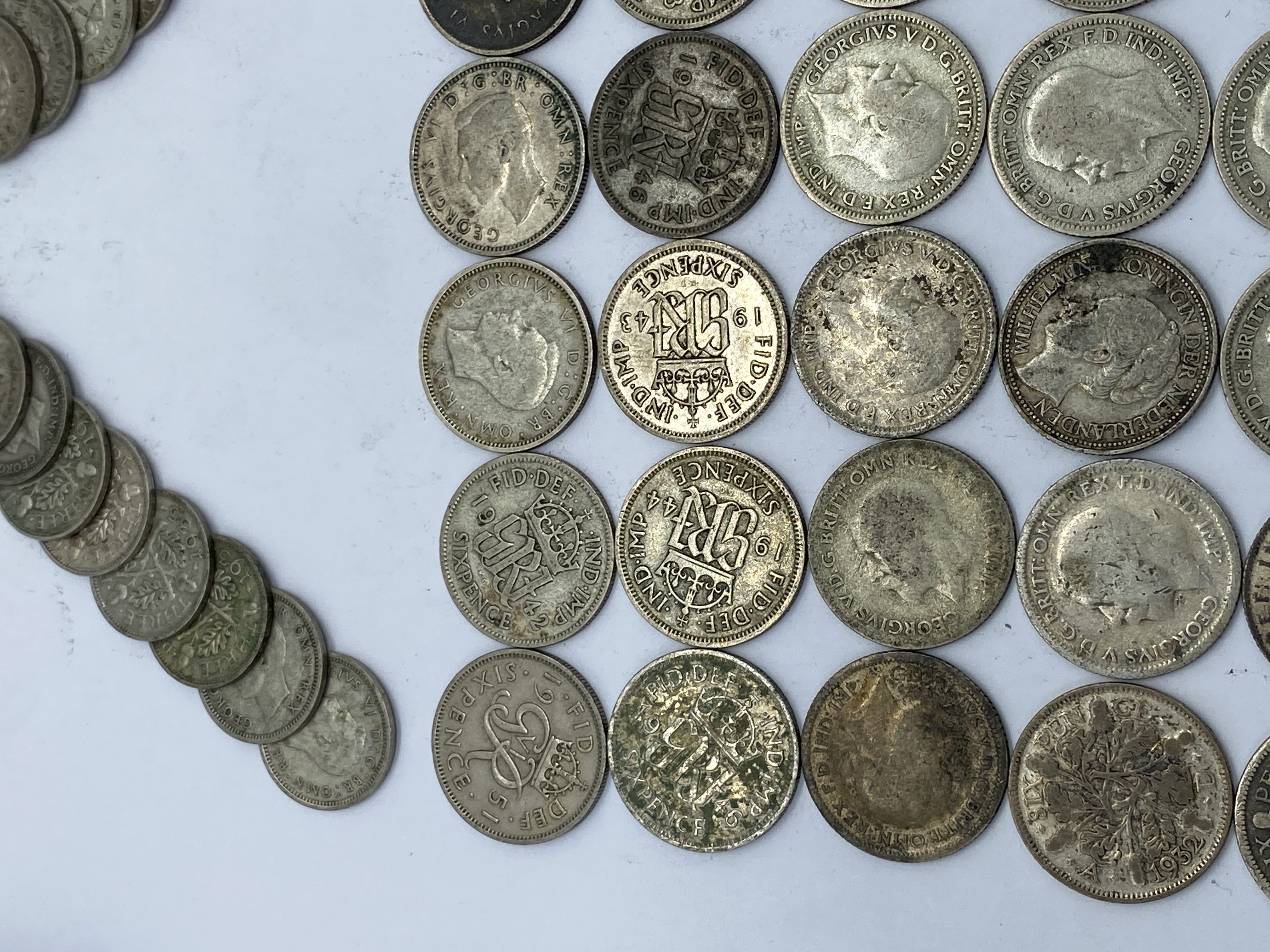 A collection of various silver-toned coins, including British and other world coins.