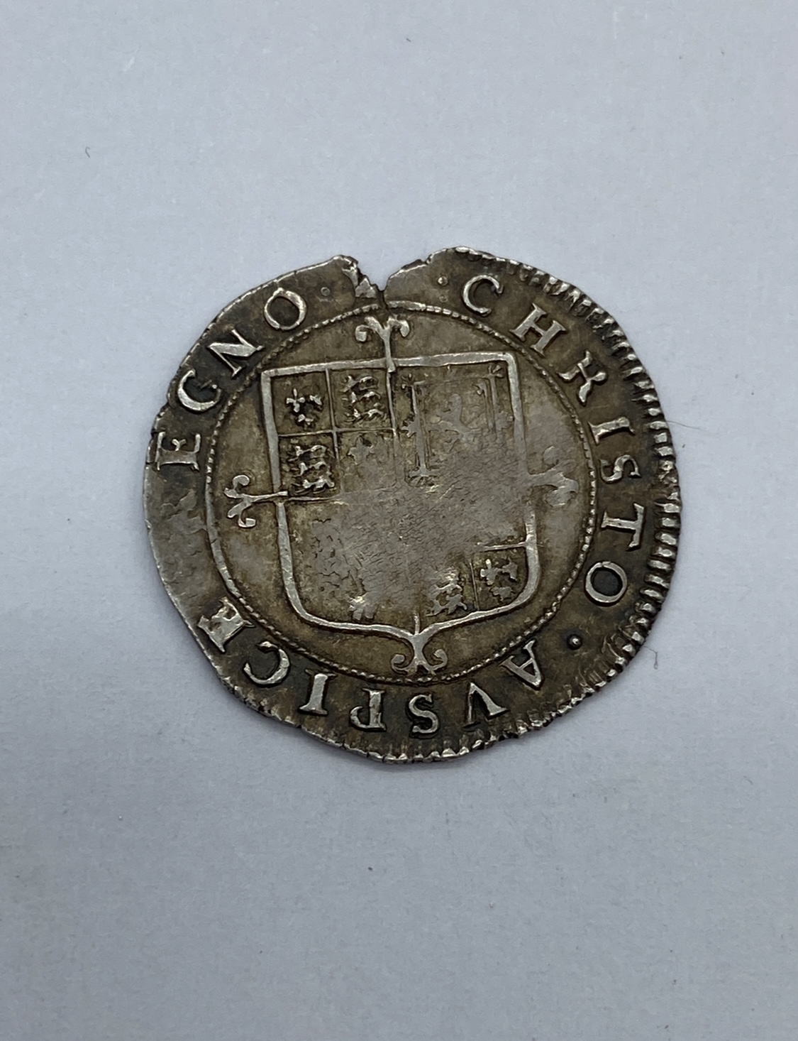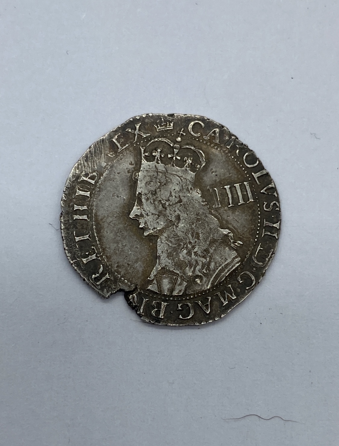 Silver hammered coin featuring a coat of arms and a portrait, possibly depicting Charles I.