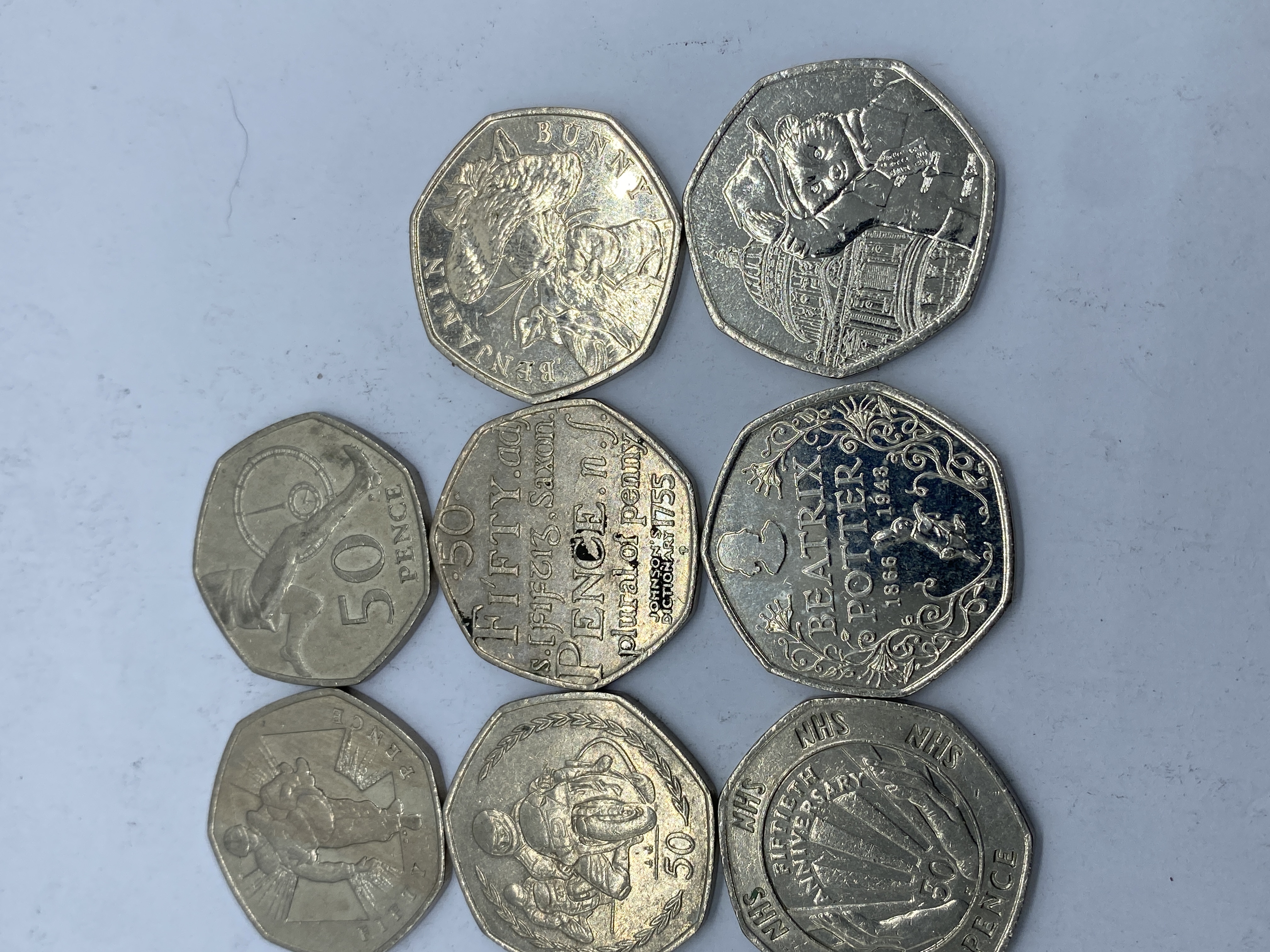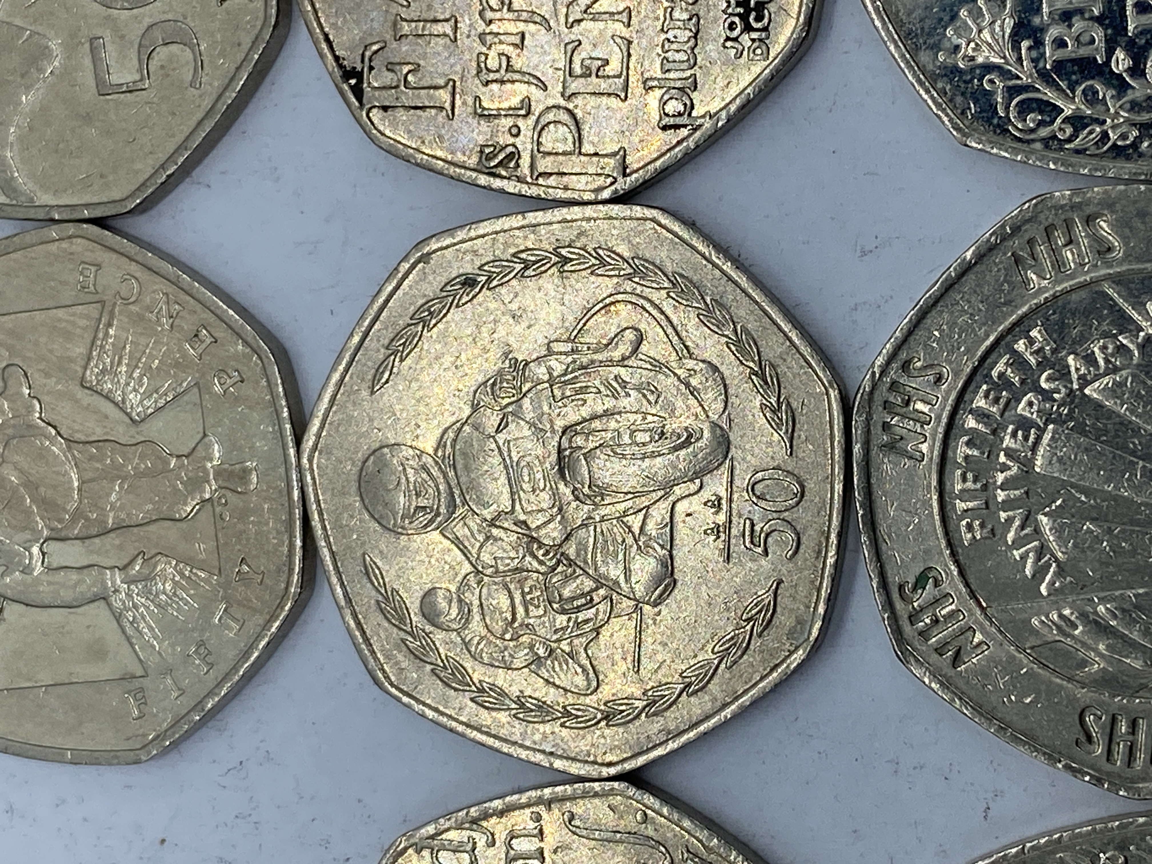 A collection of ten silver-colored UK fifty pence coins featuring various designs.