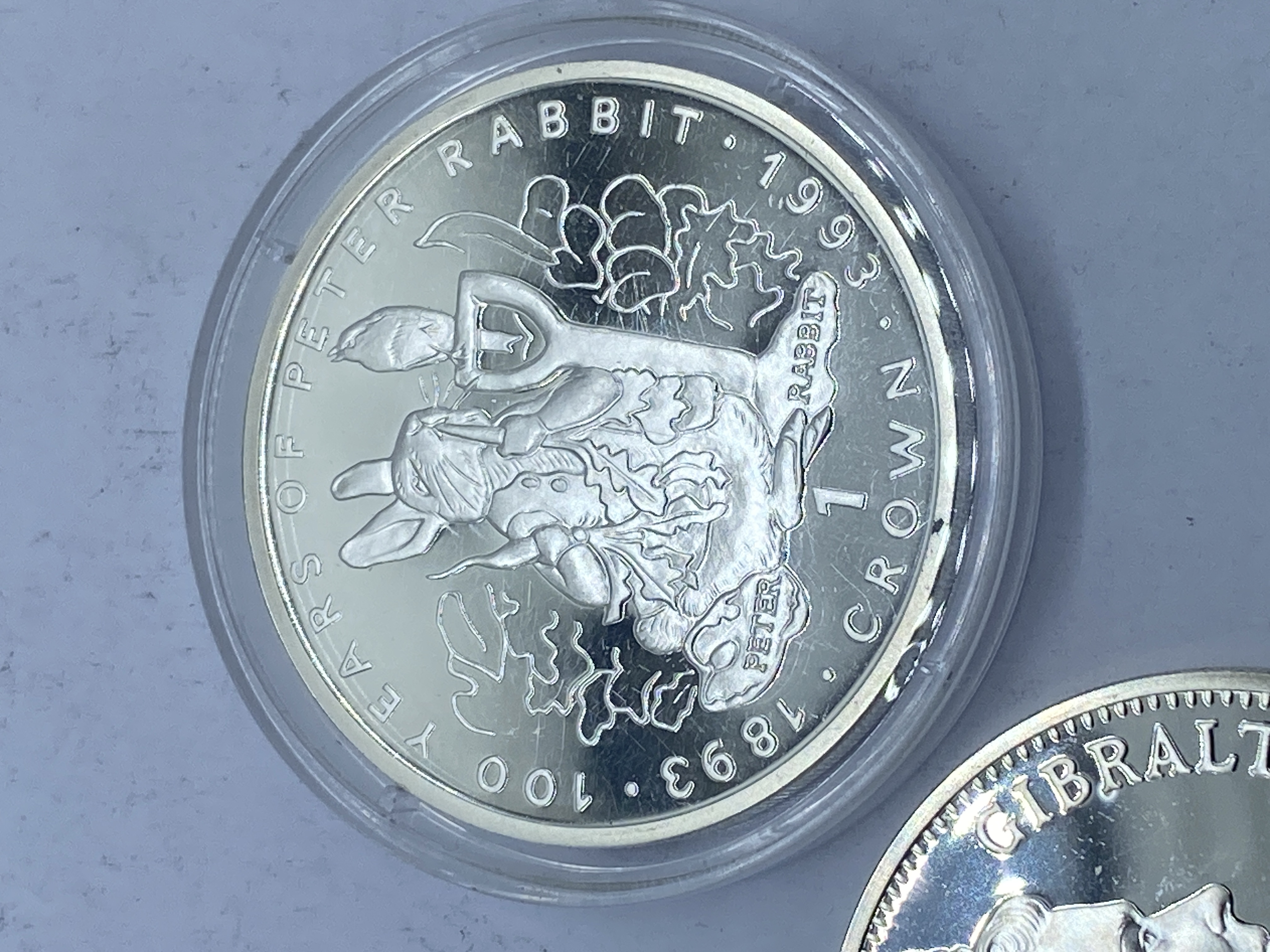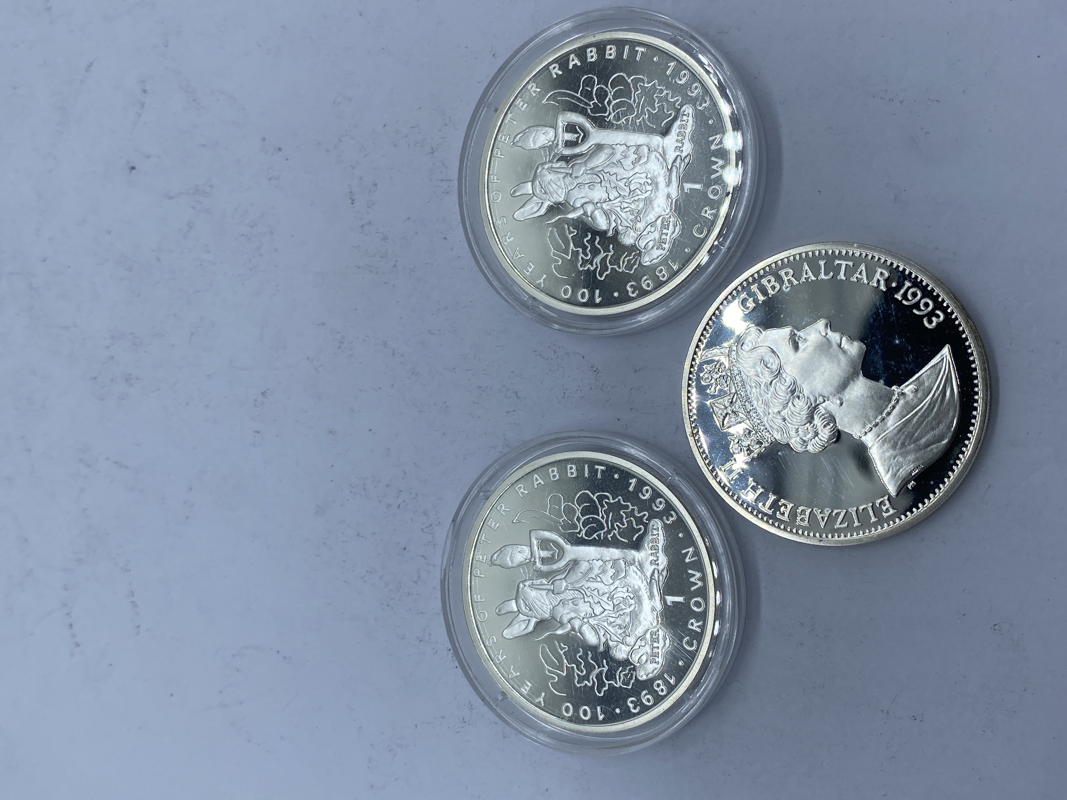 Three Gibraltar 1993 One Crown coins commemorating 100 years of Peter Rabbit.