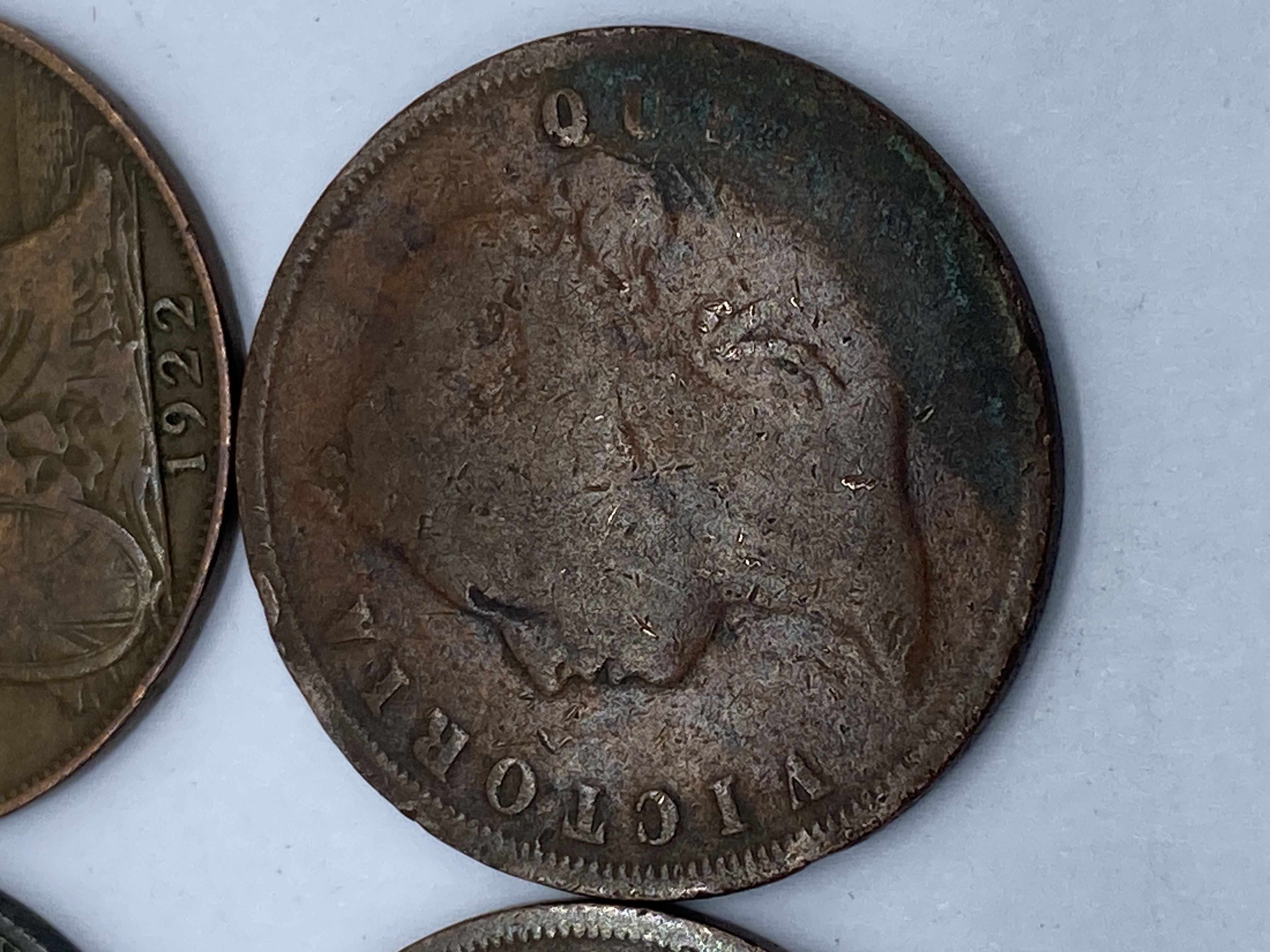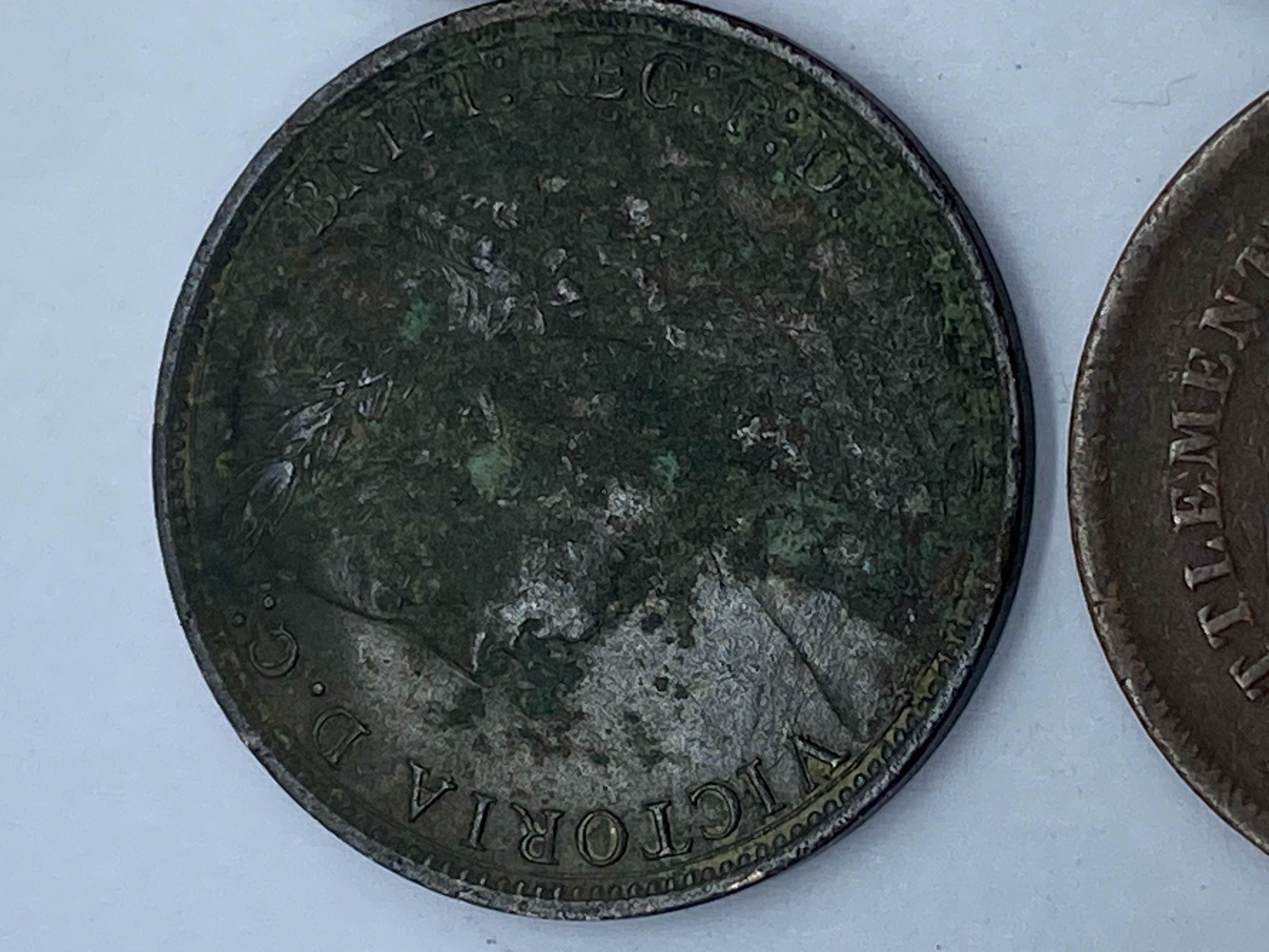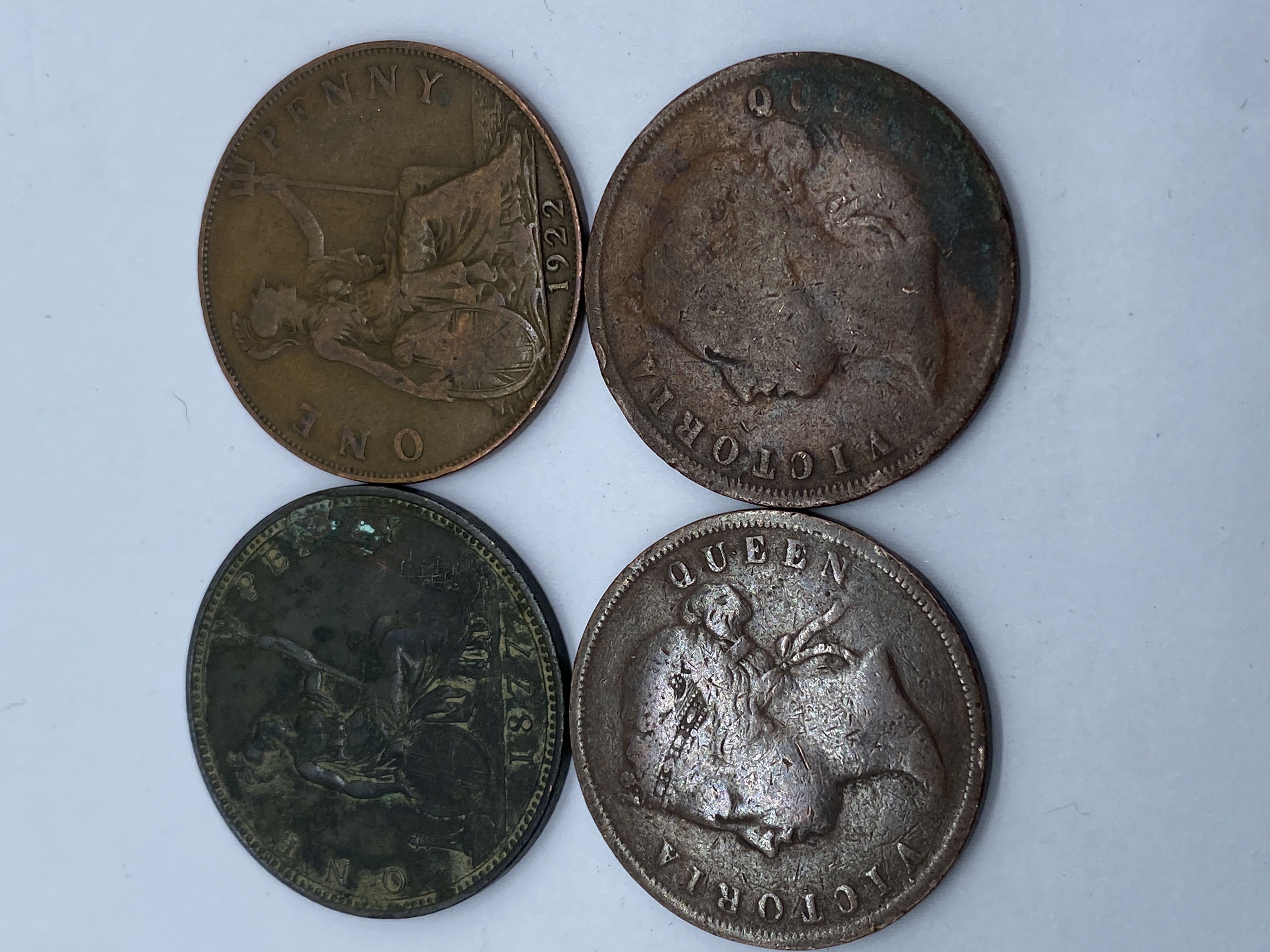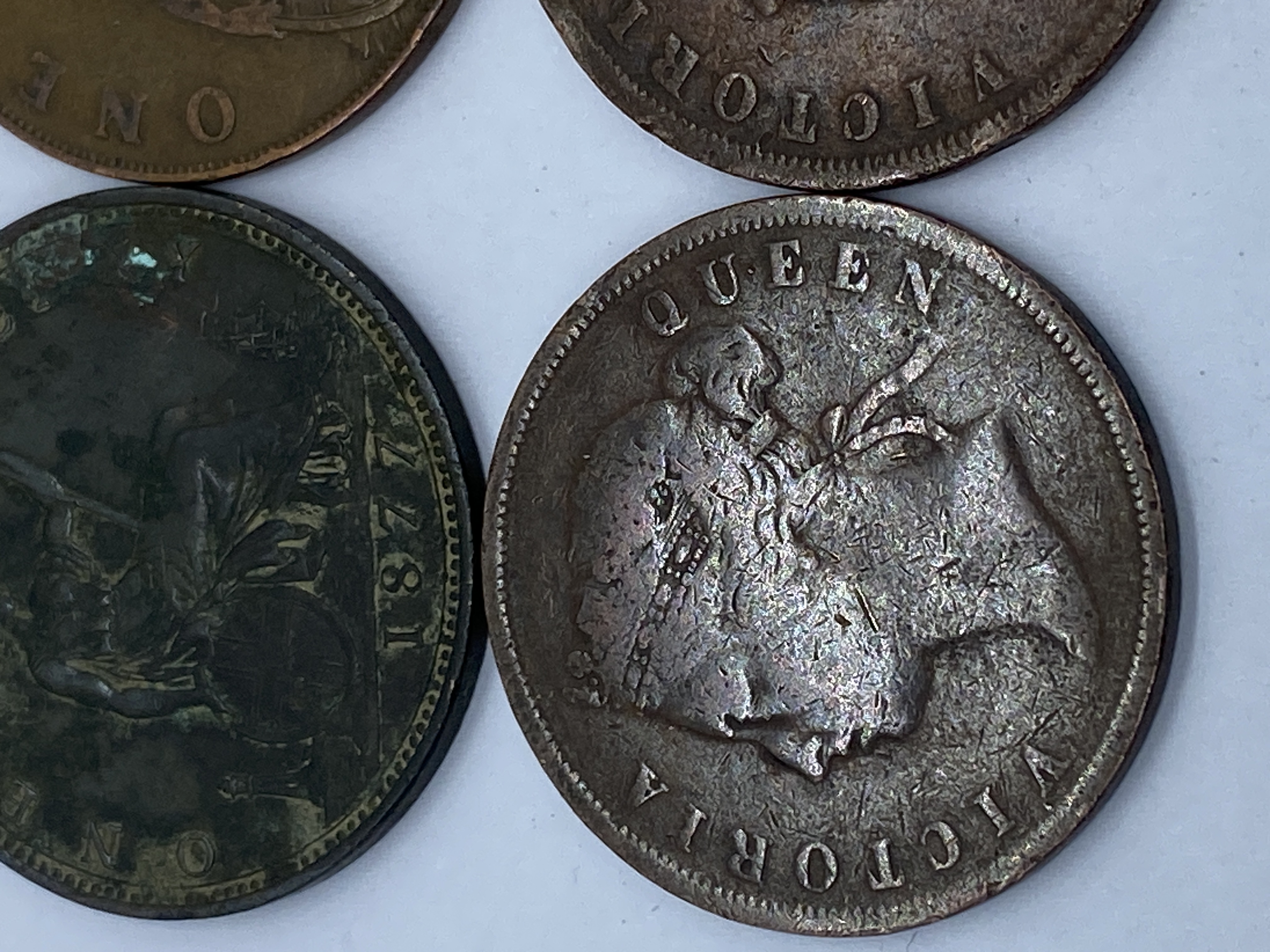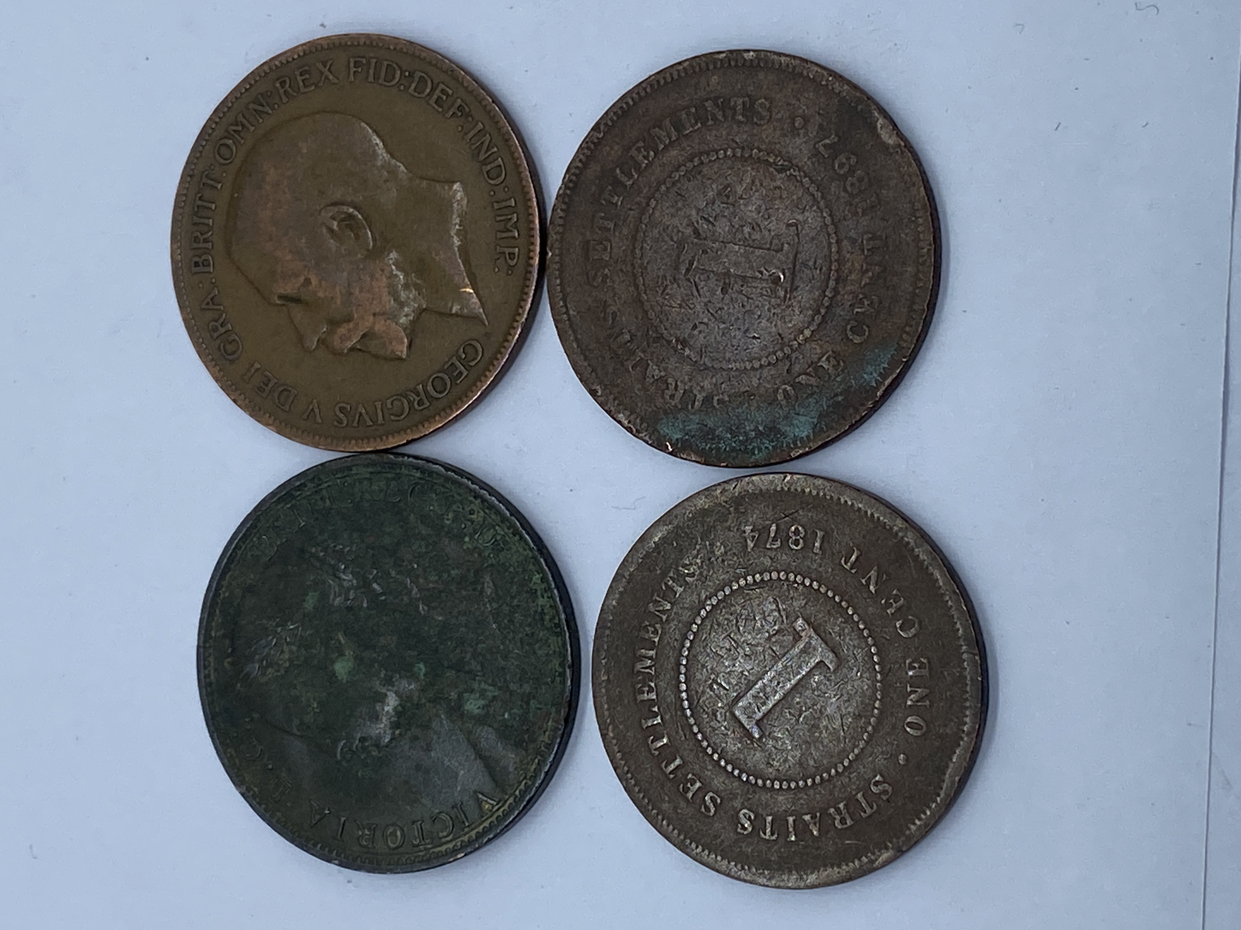Collection of eight copper and bronze Straits Settlements coins featuring Queen Victoria and George V.