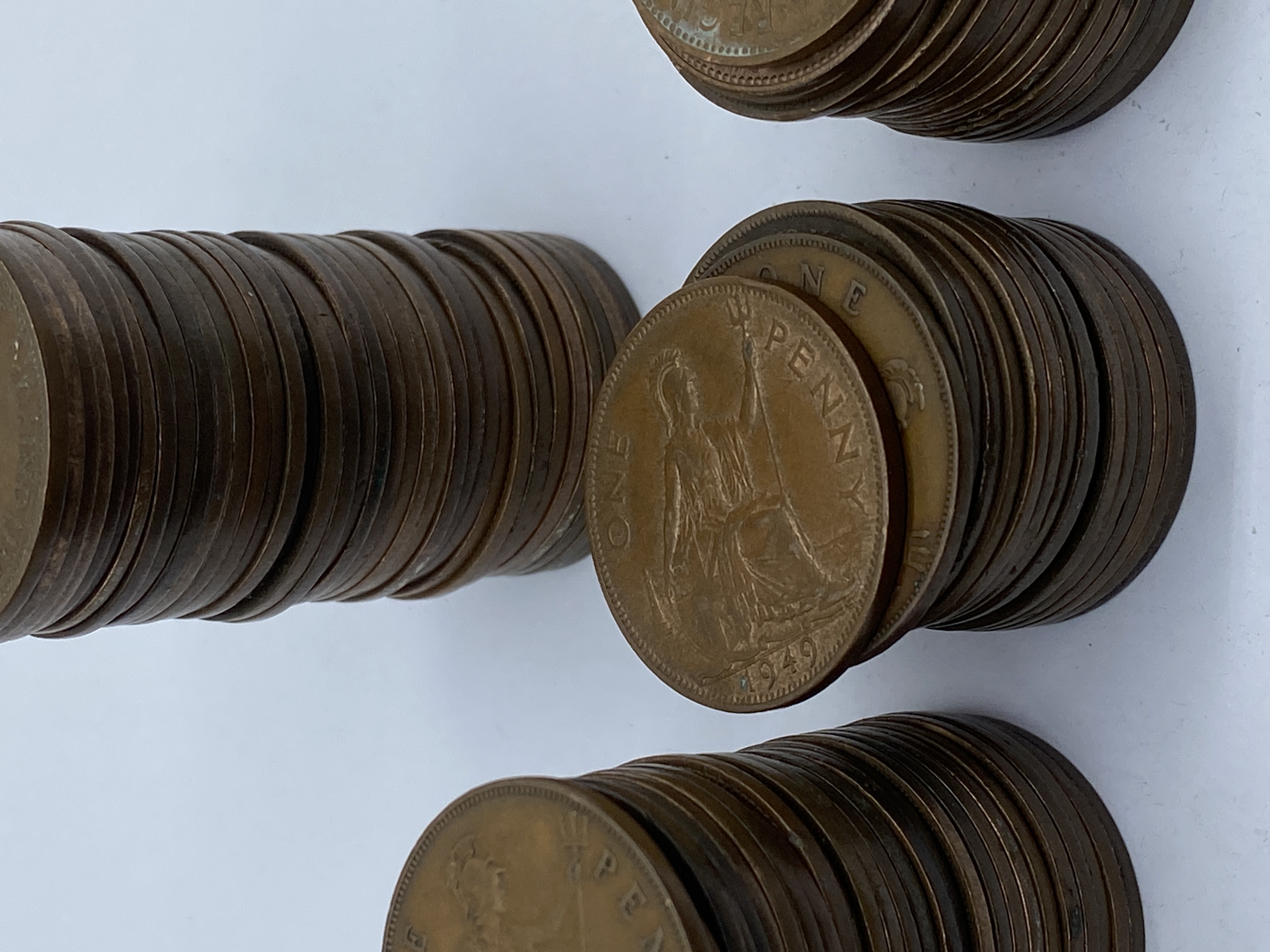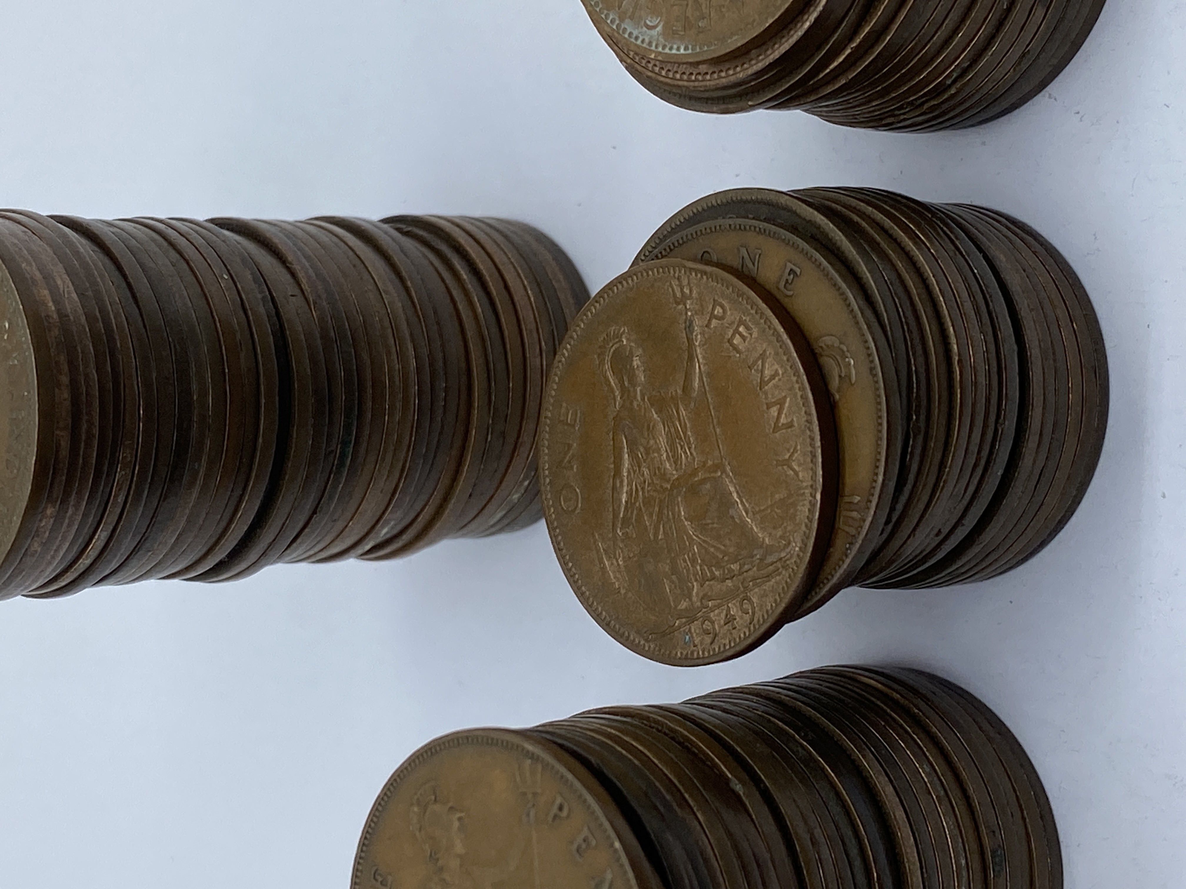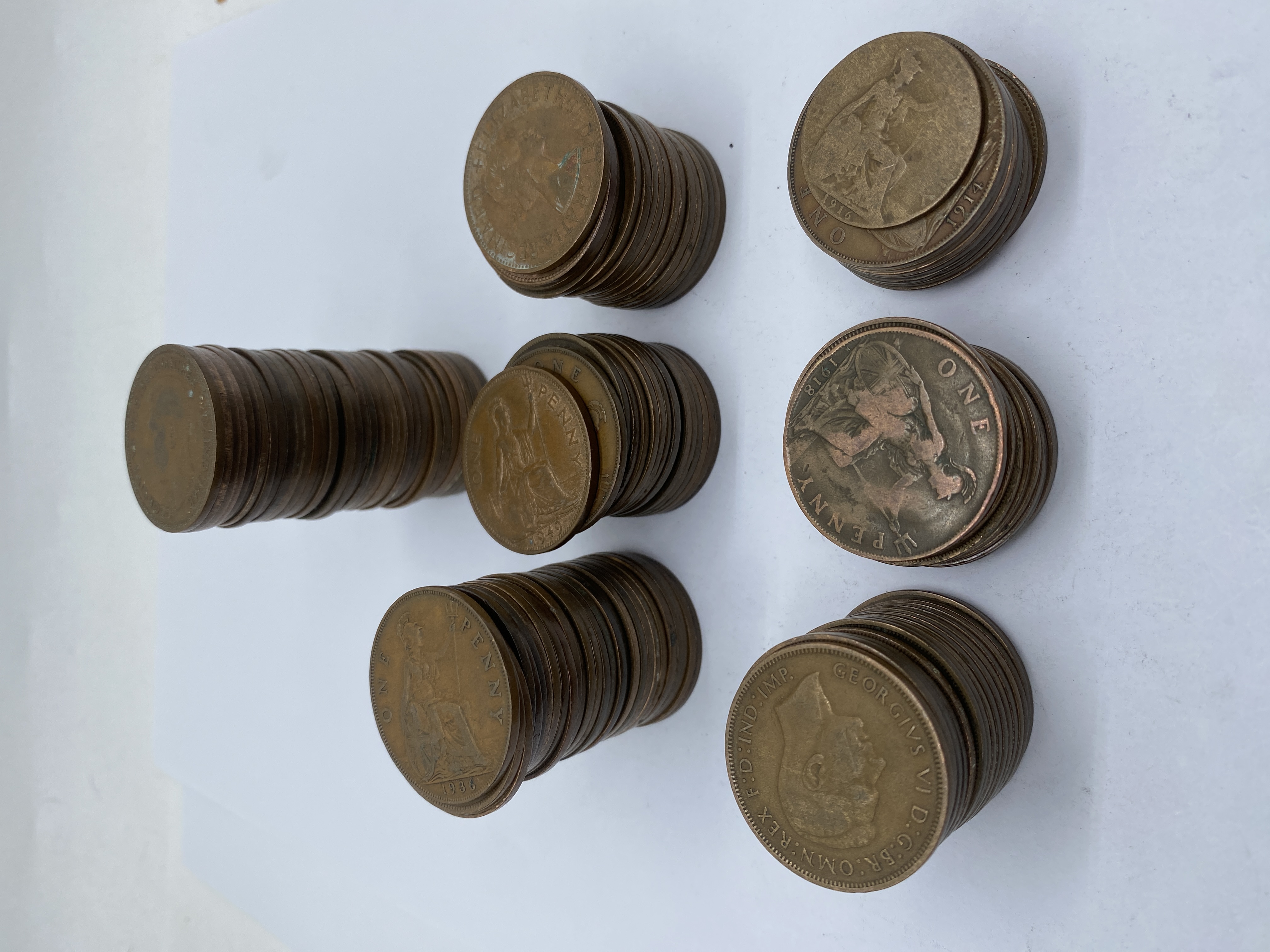 Six stacks of various dates of British bronze pennies.