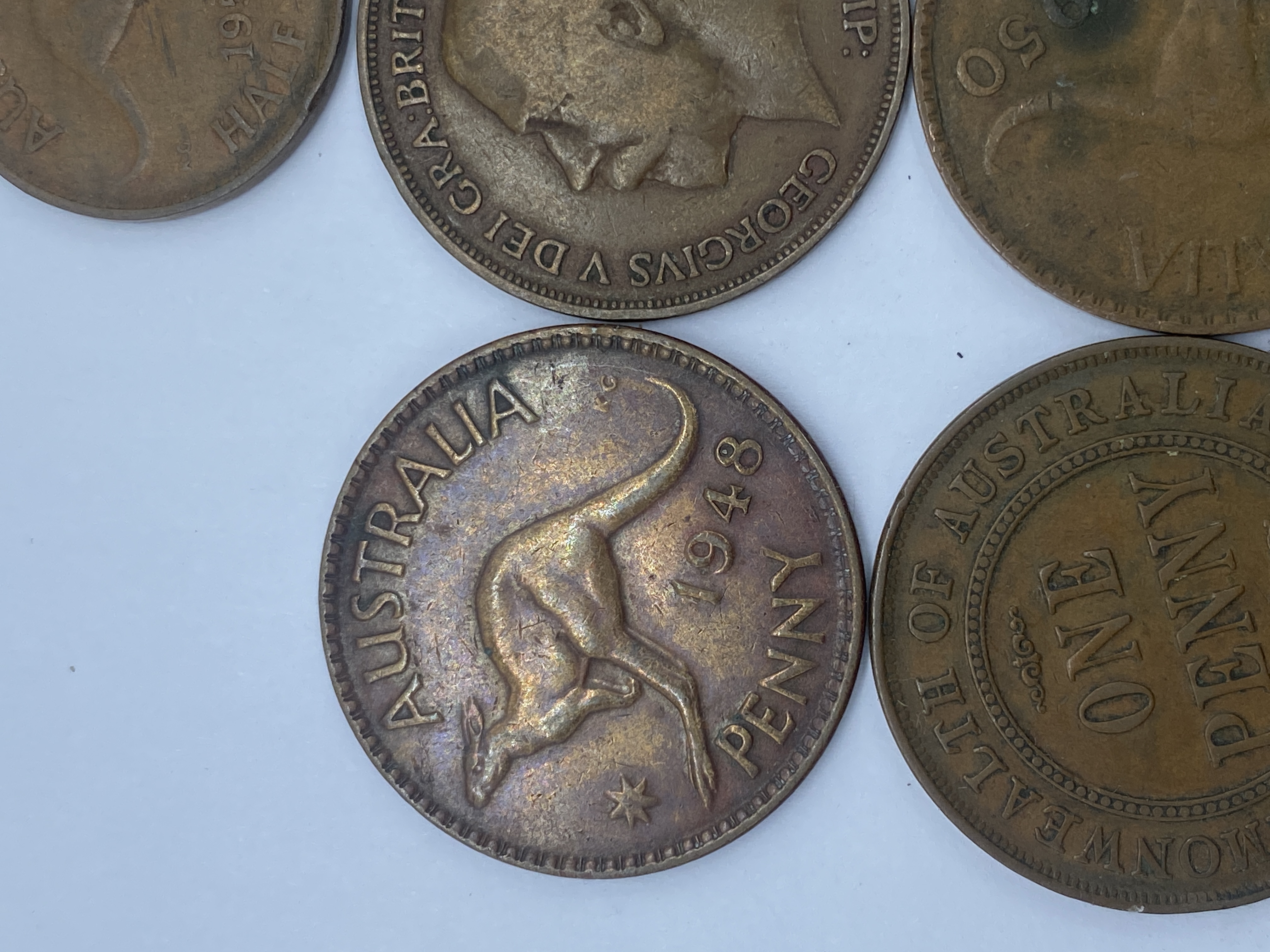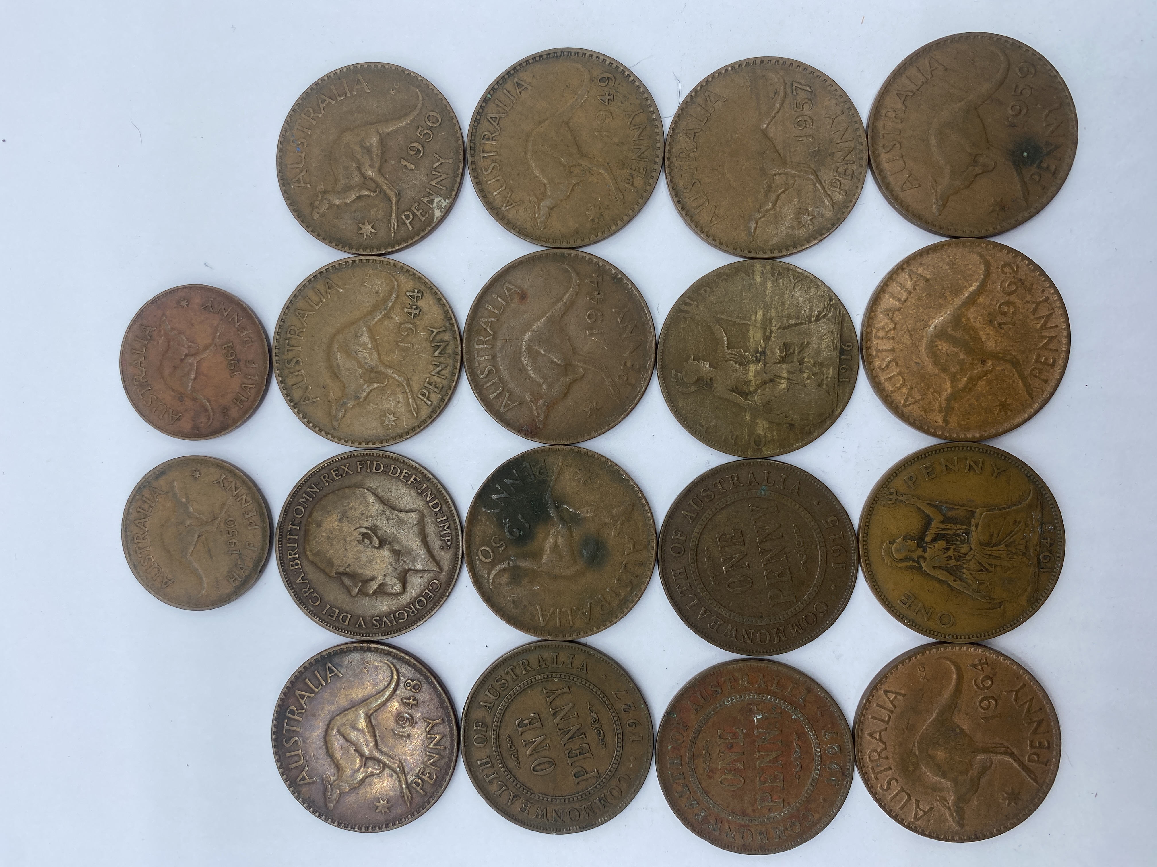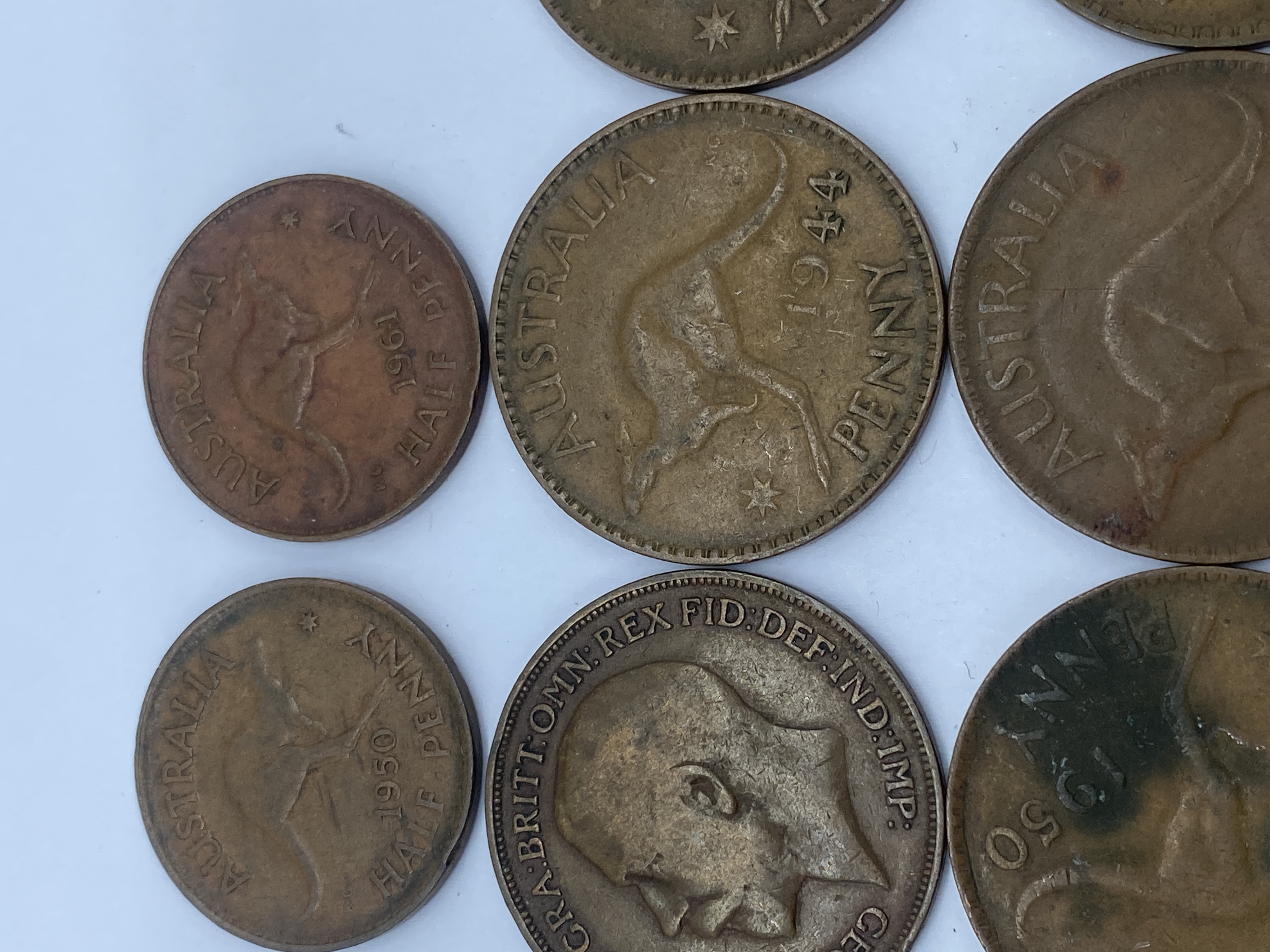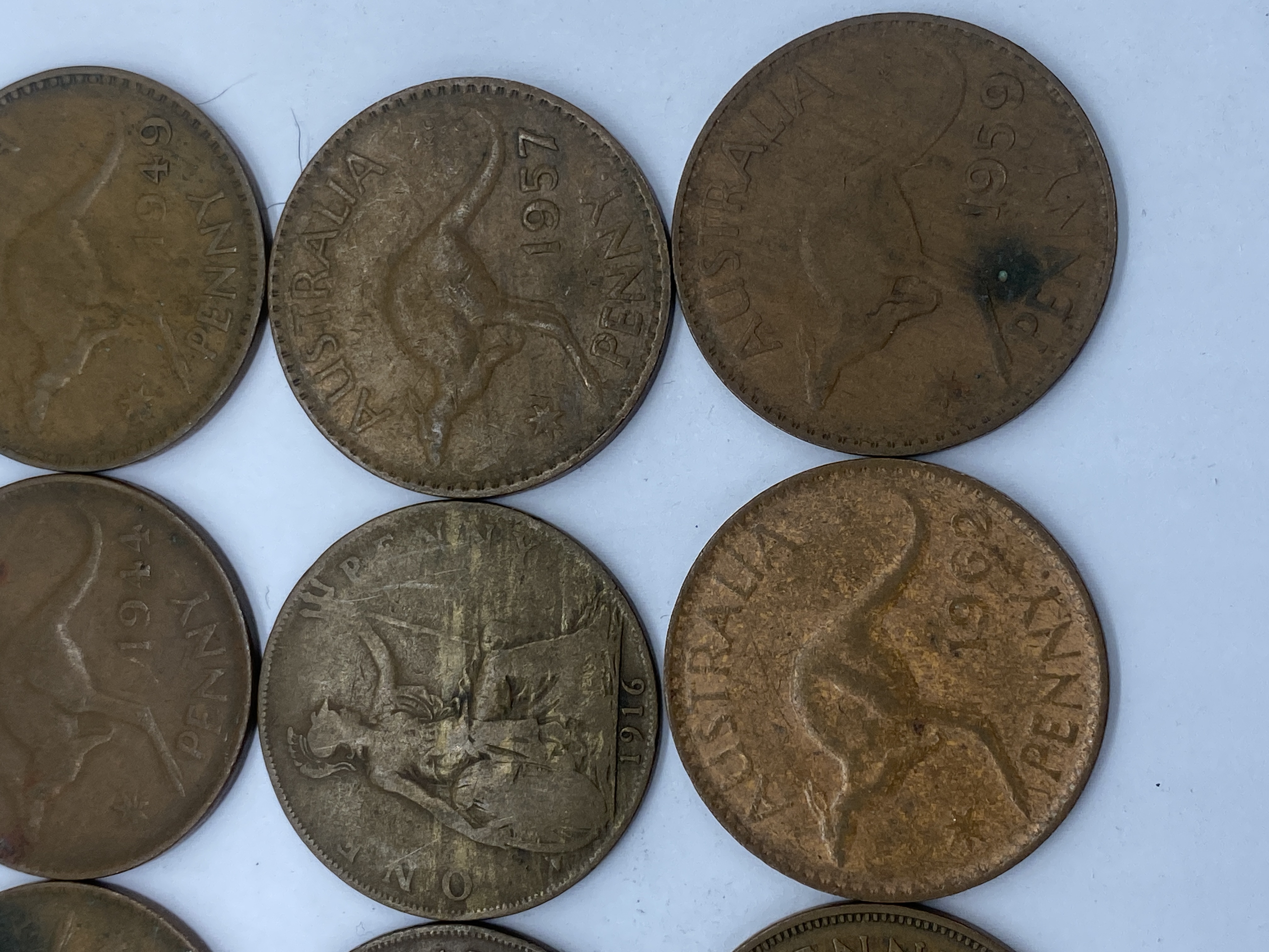 A collection of circulated Australian pennies featuring kangaroos and King George VI.