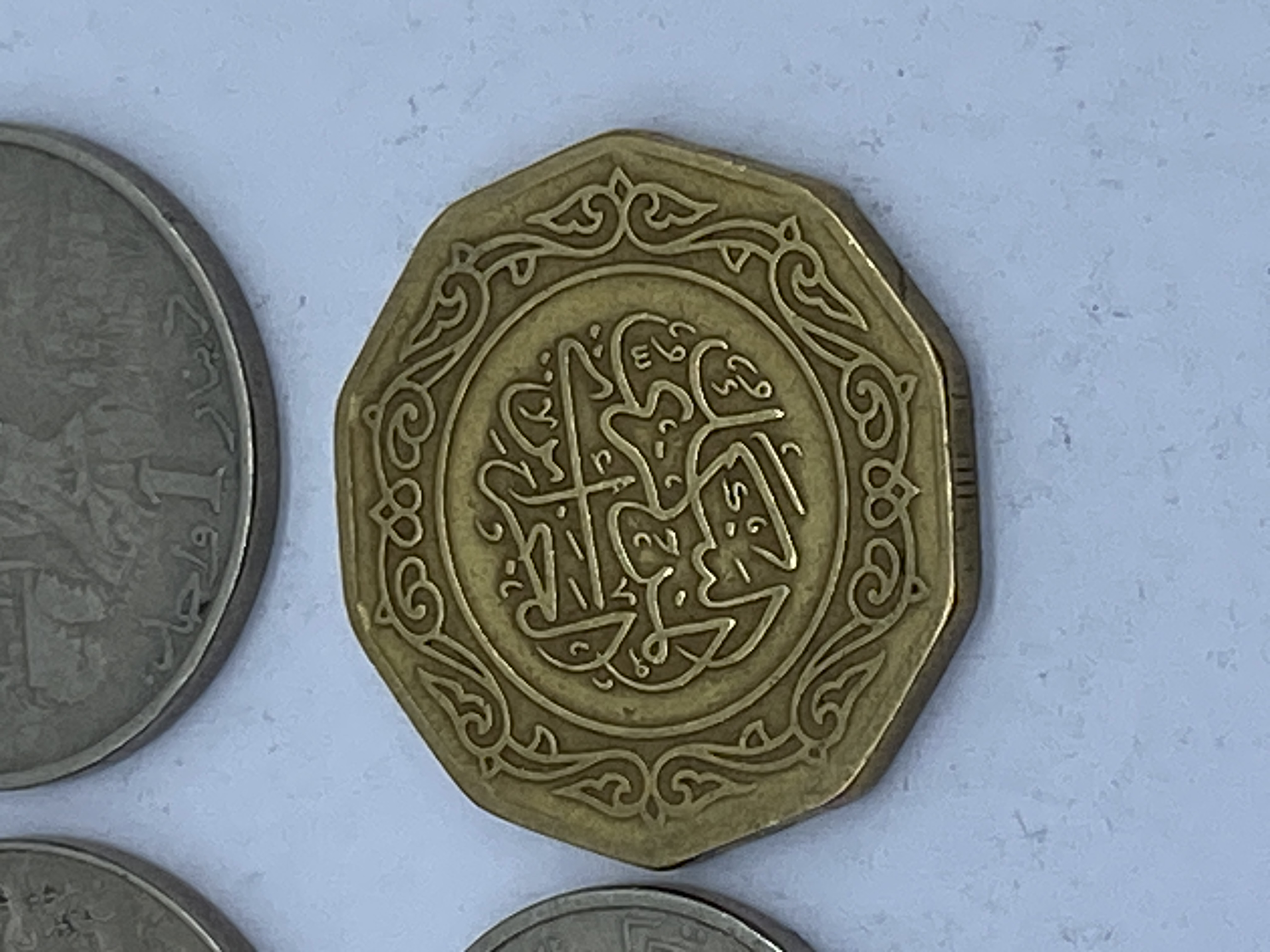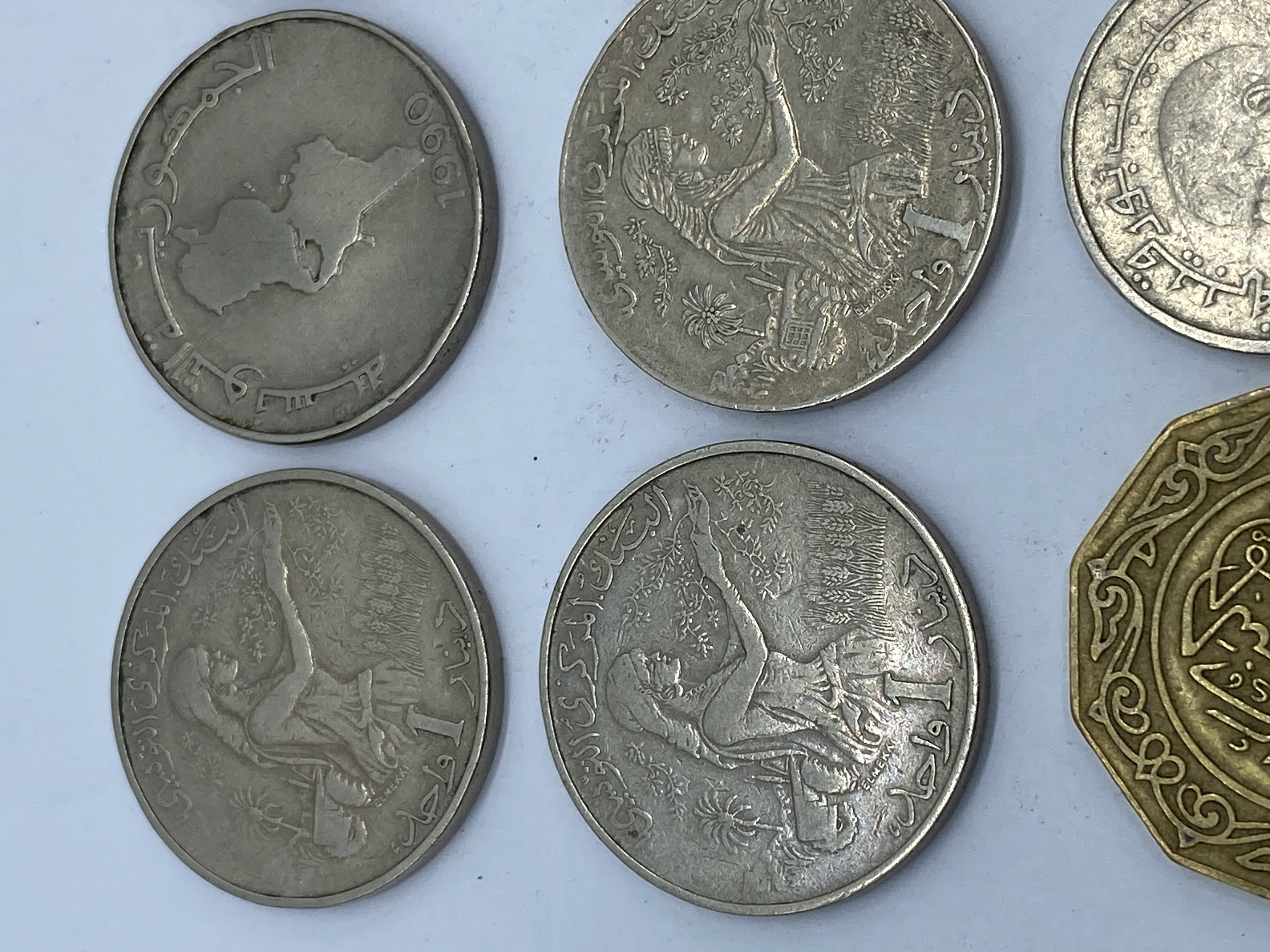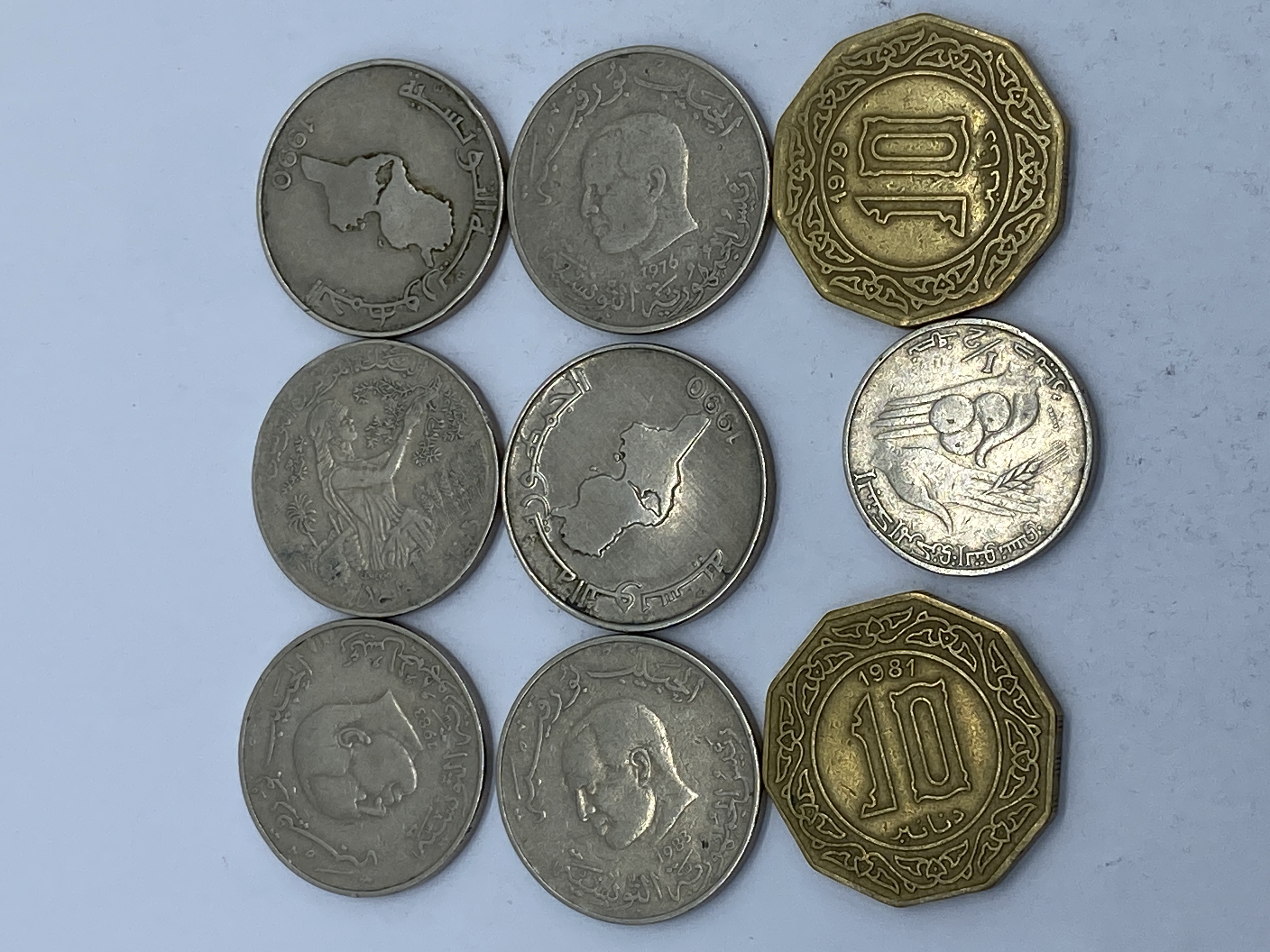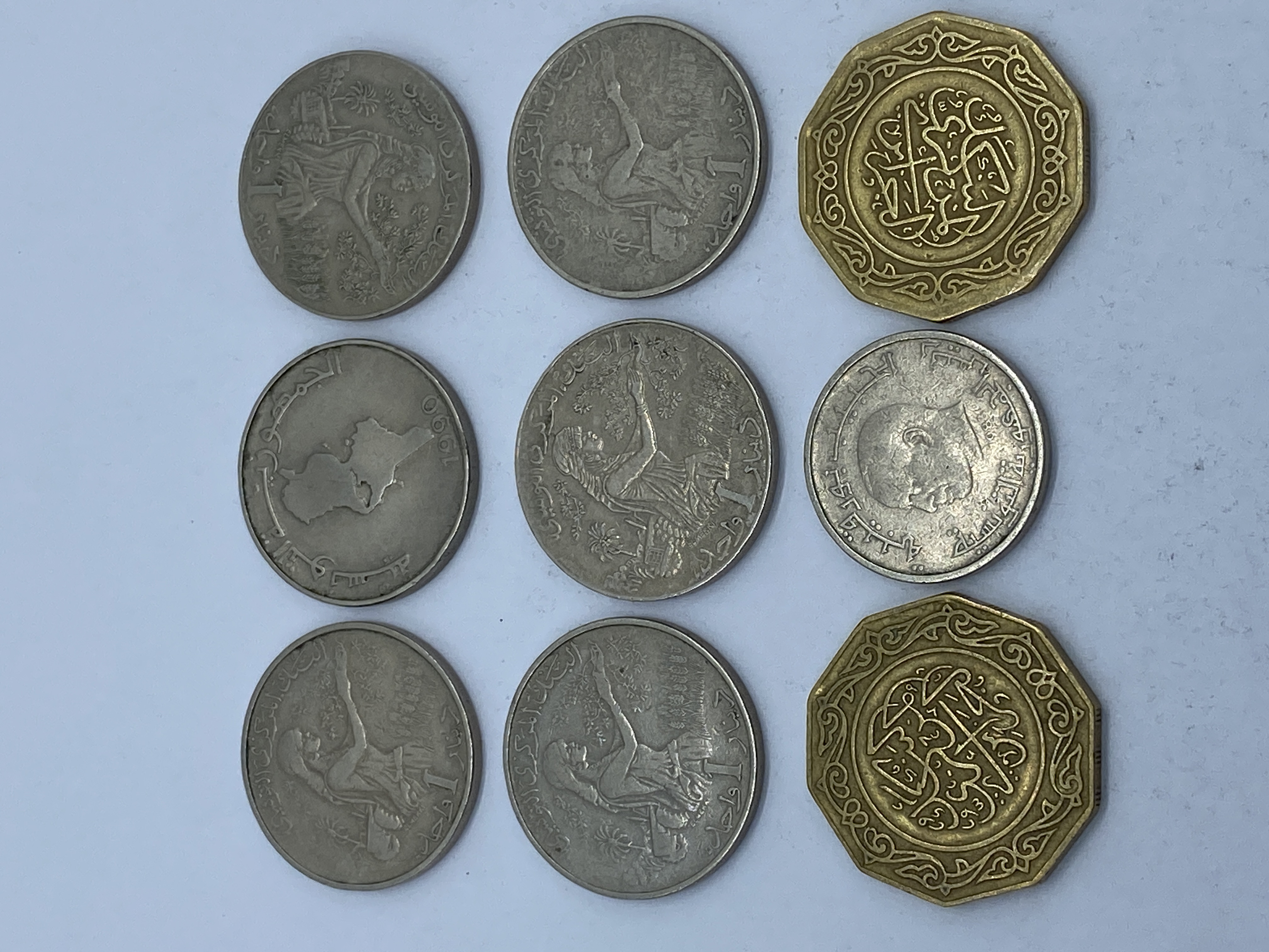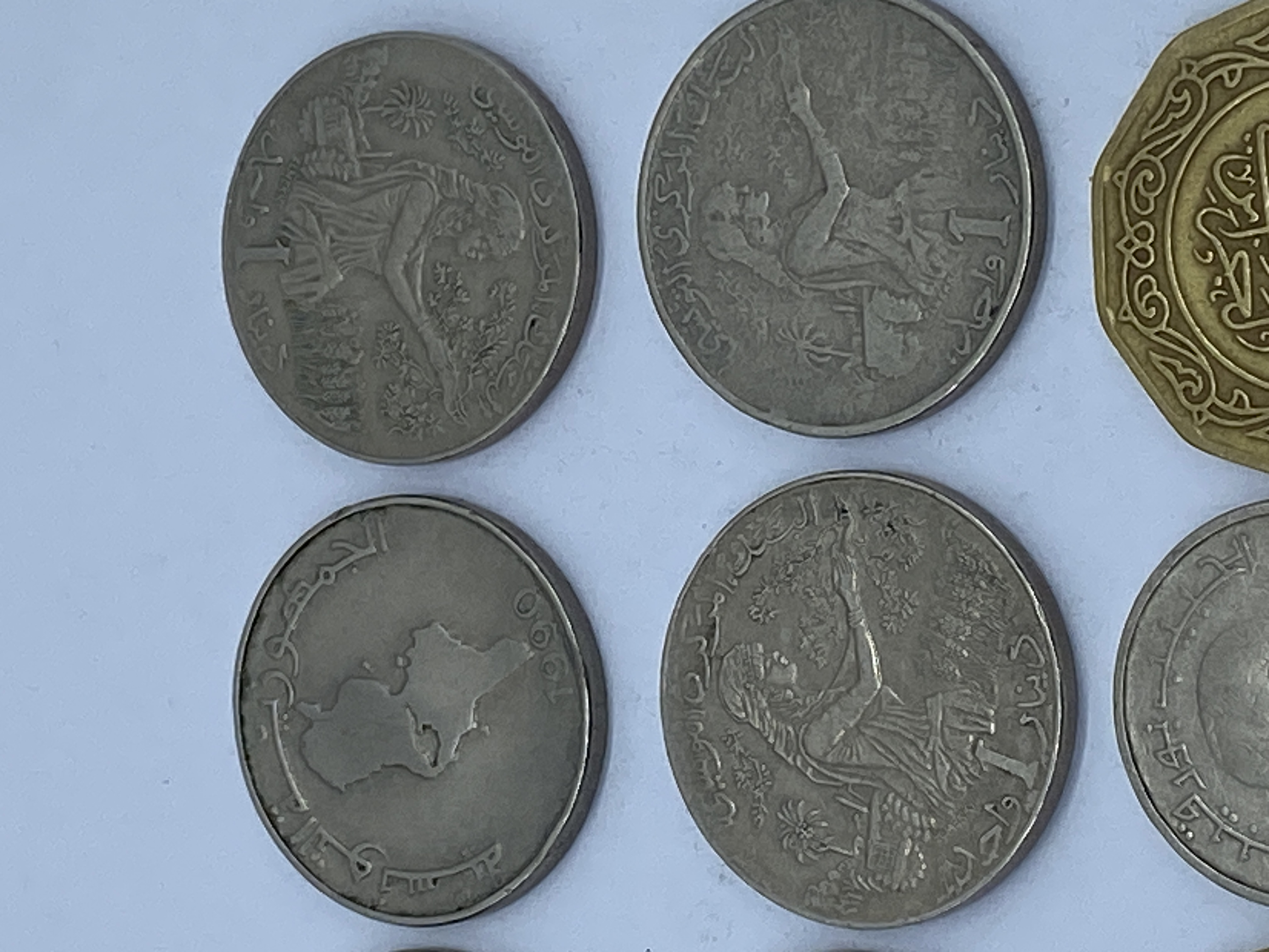 A collection of silver and gold Tunisian dinar coins.