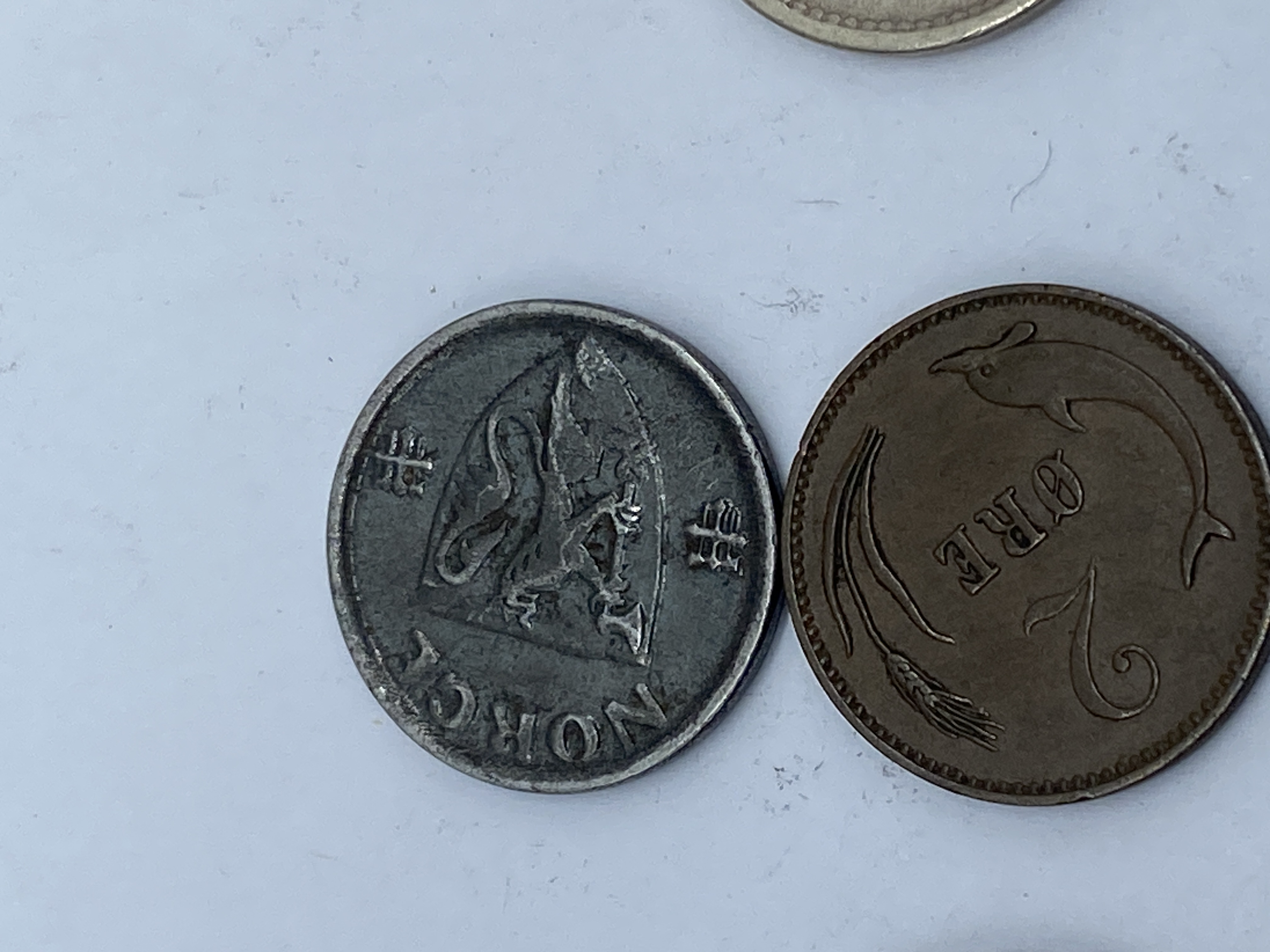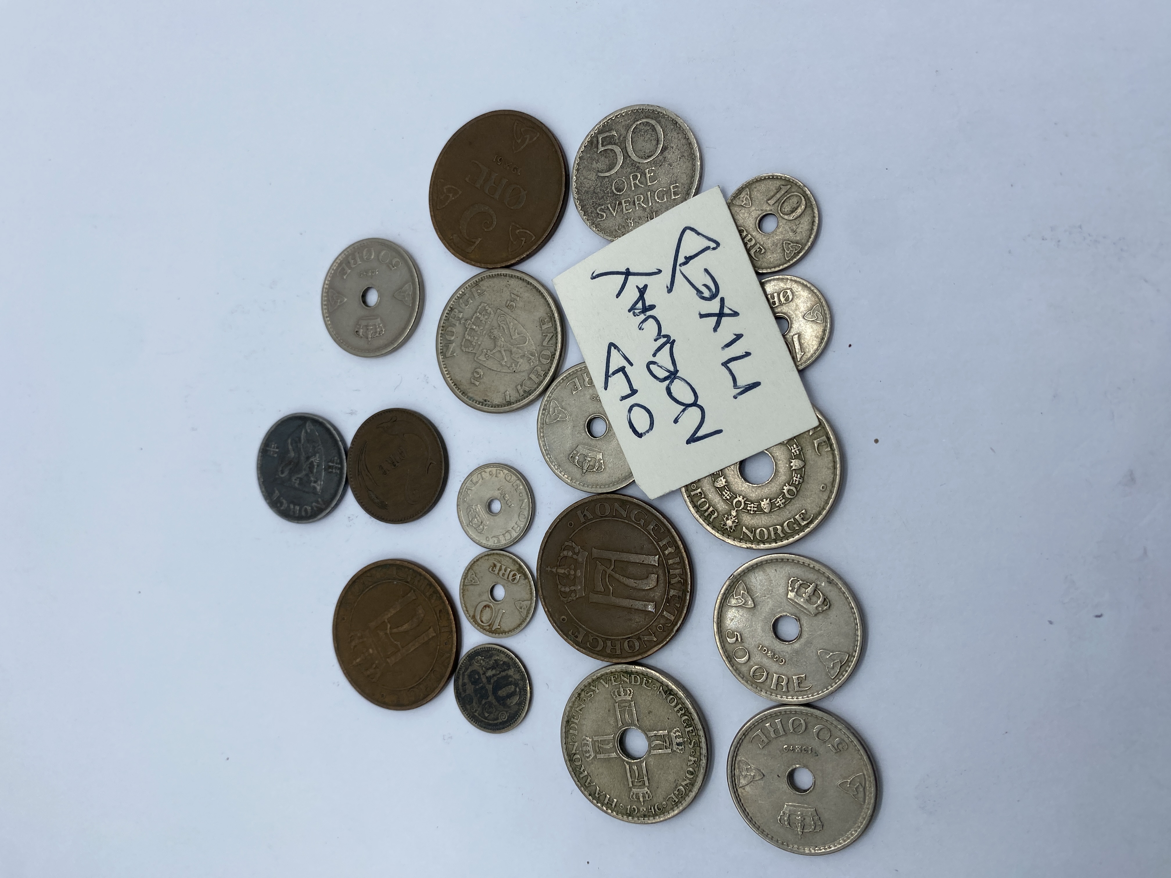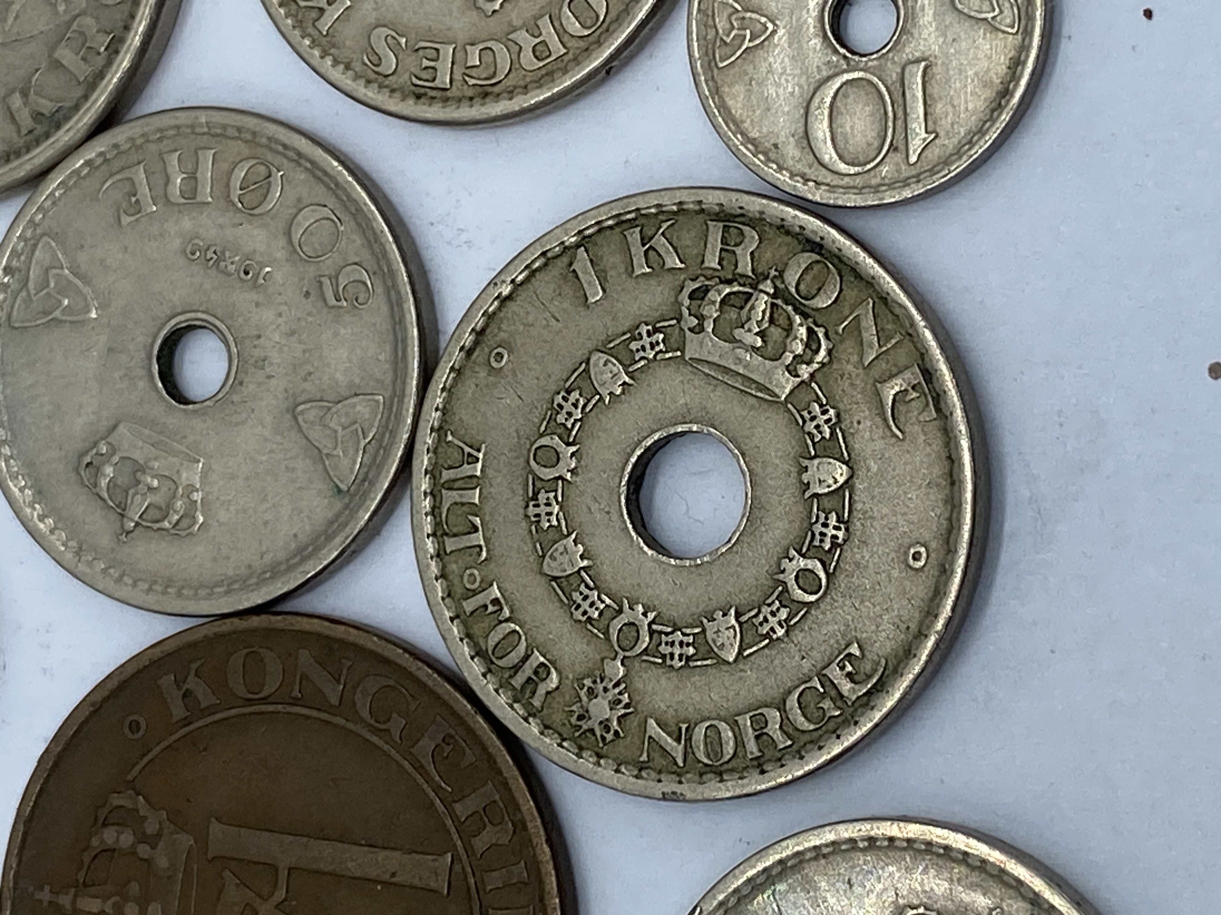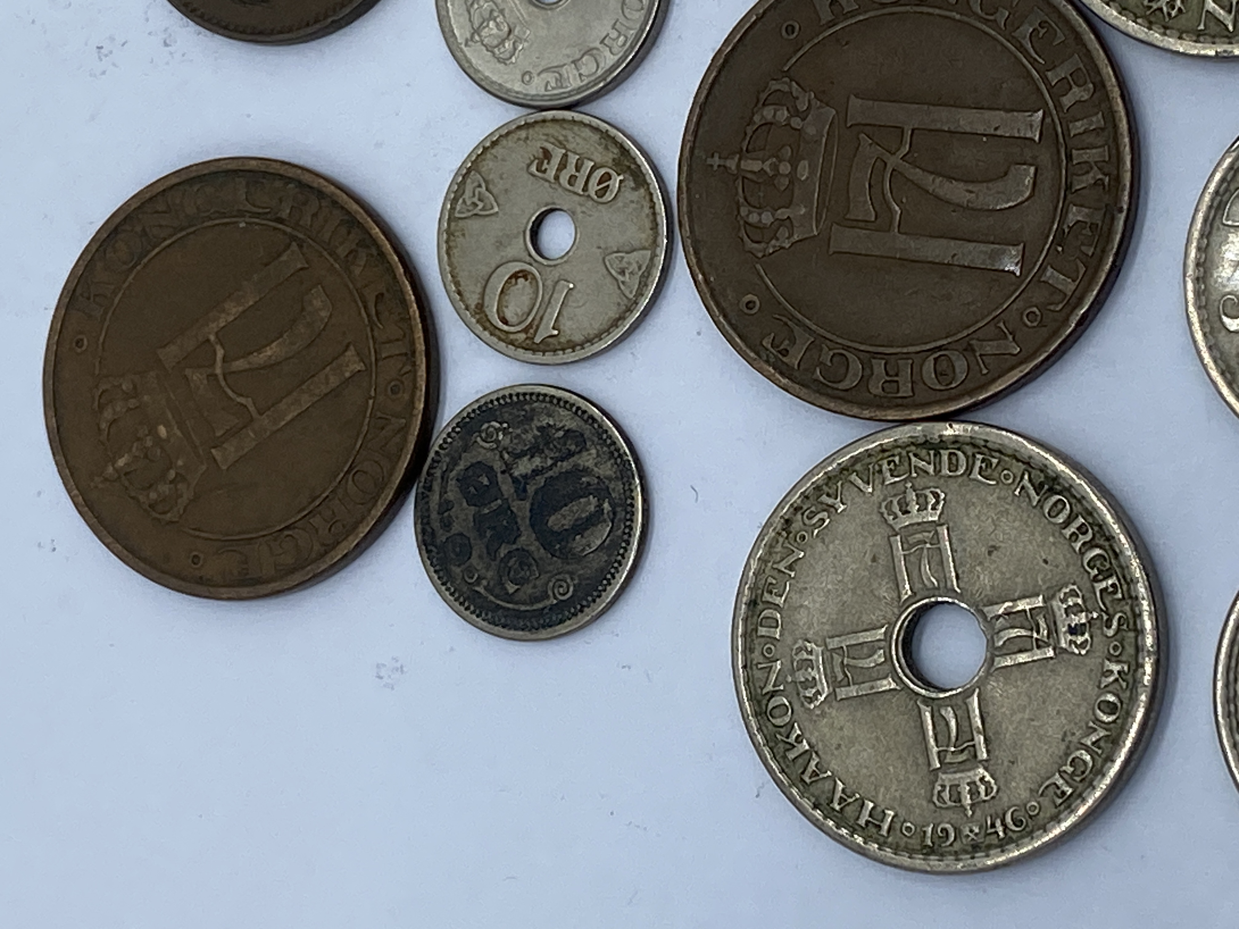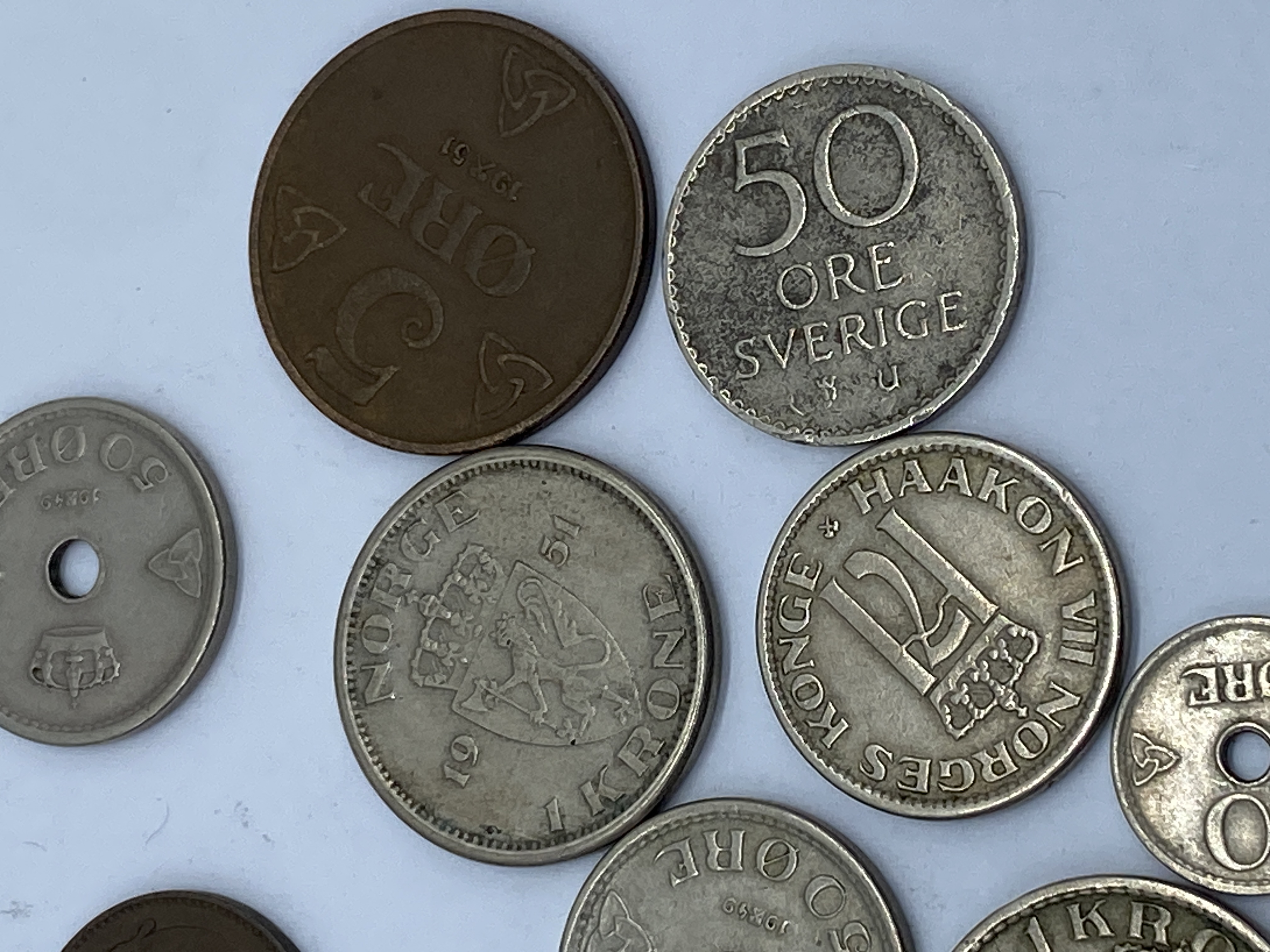 A collection of various silver and bronze coins from different countries, including Norway and Sweden.