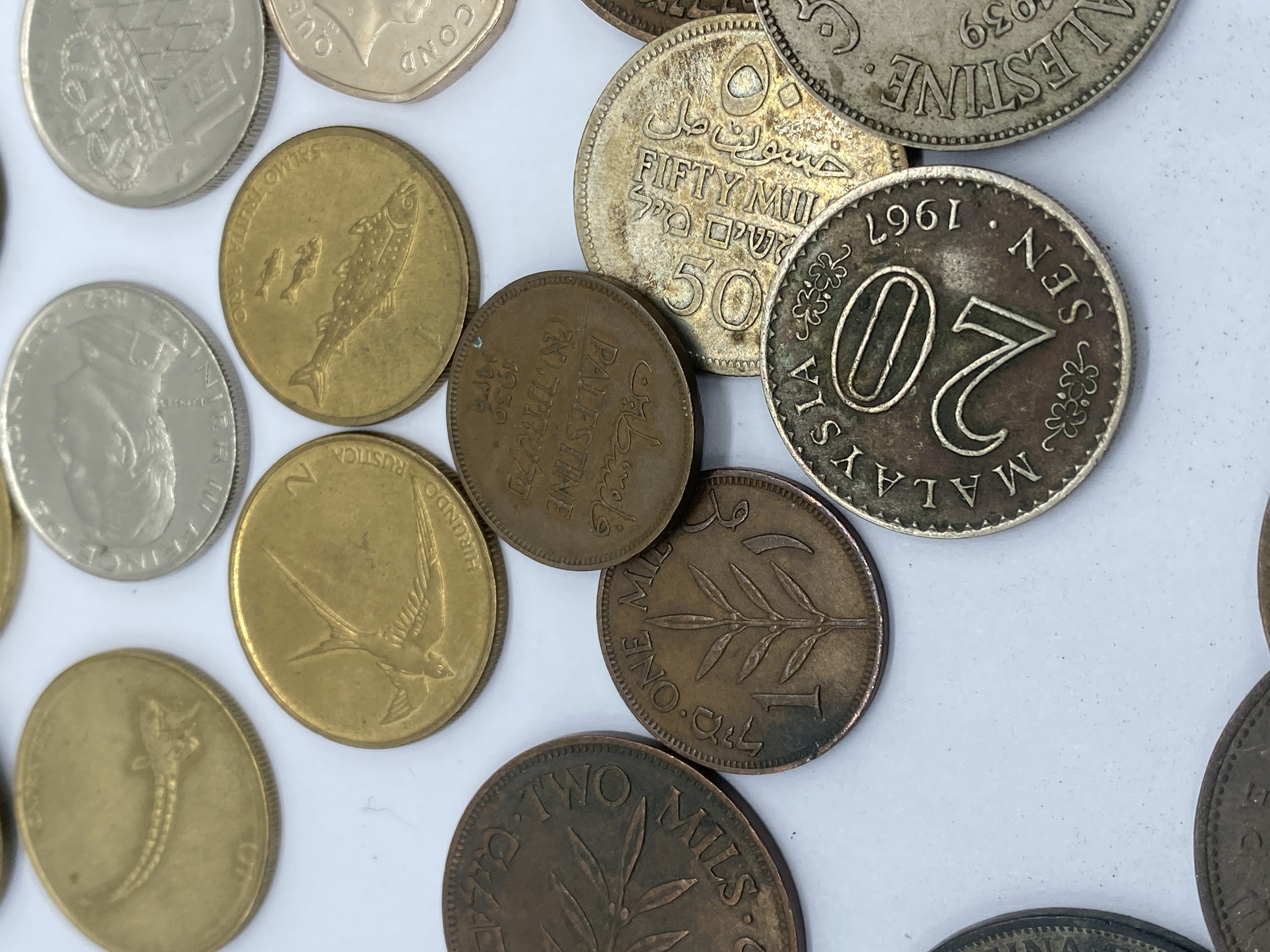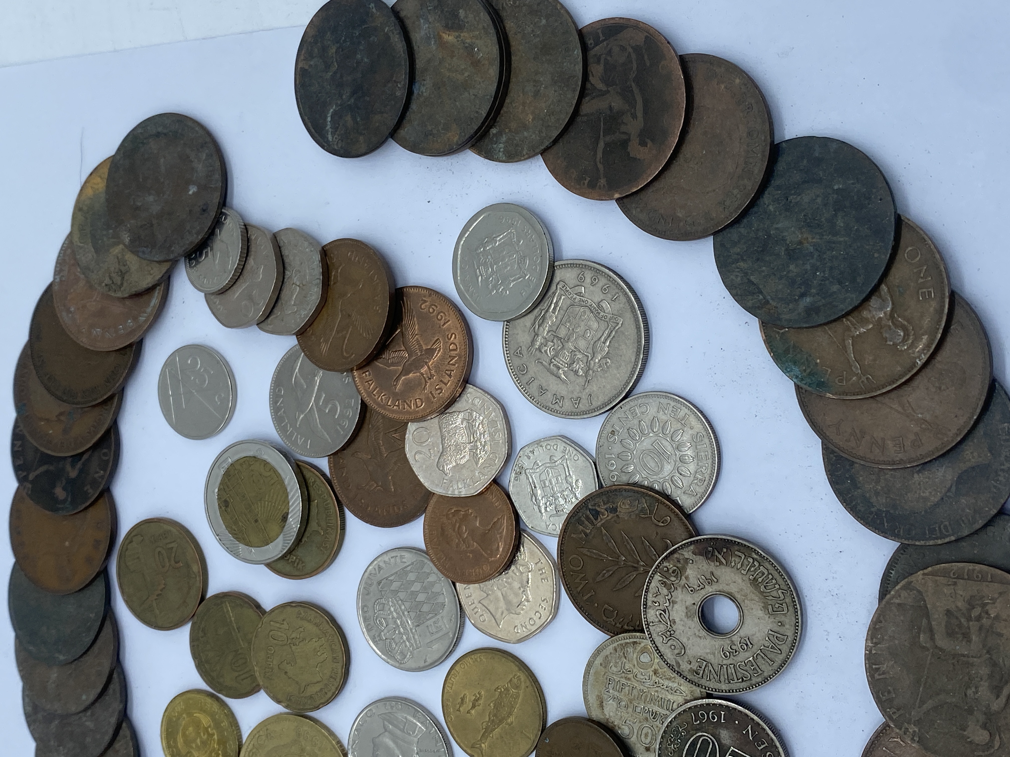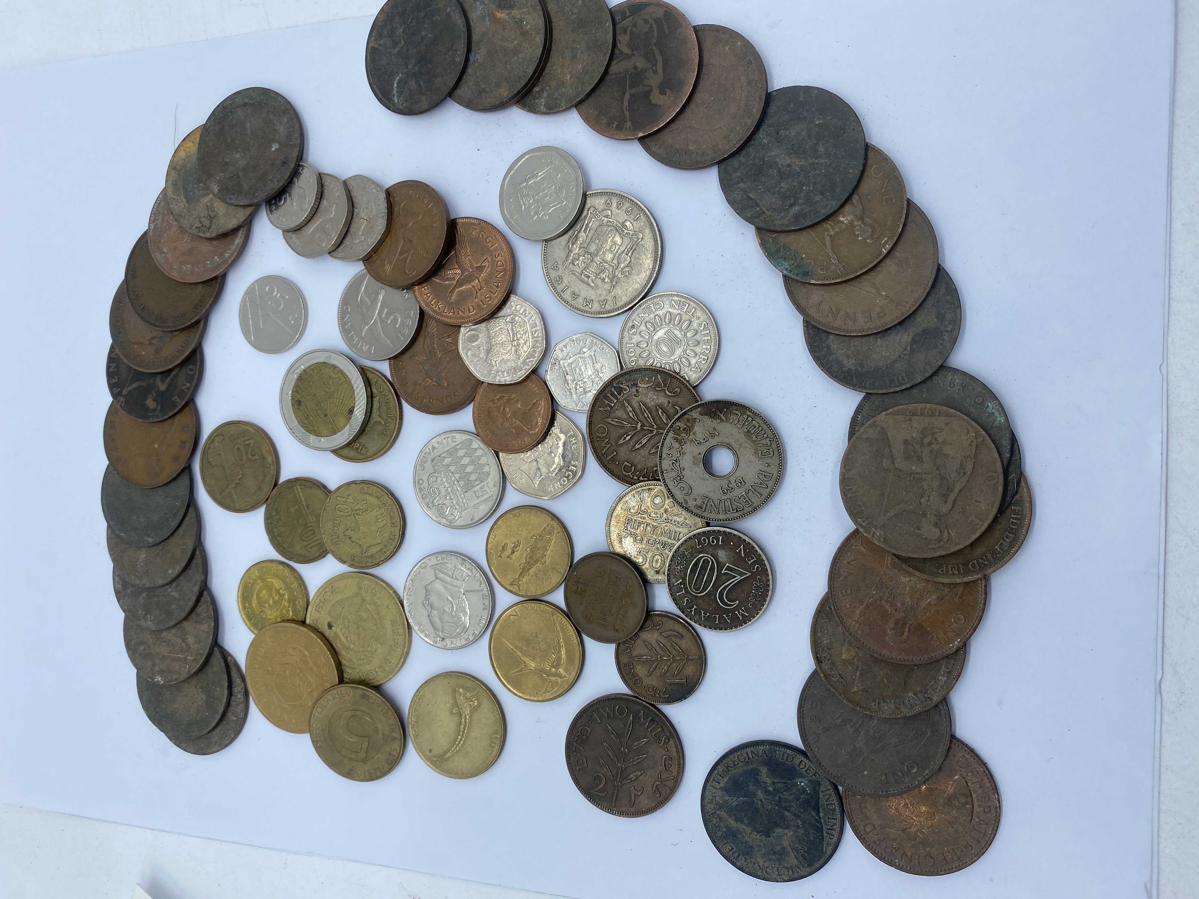 A collection of various foreign coins, including some featuring Queen Elizabeth II and others from various countries.