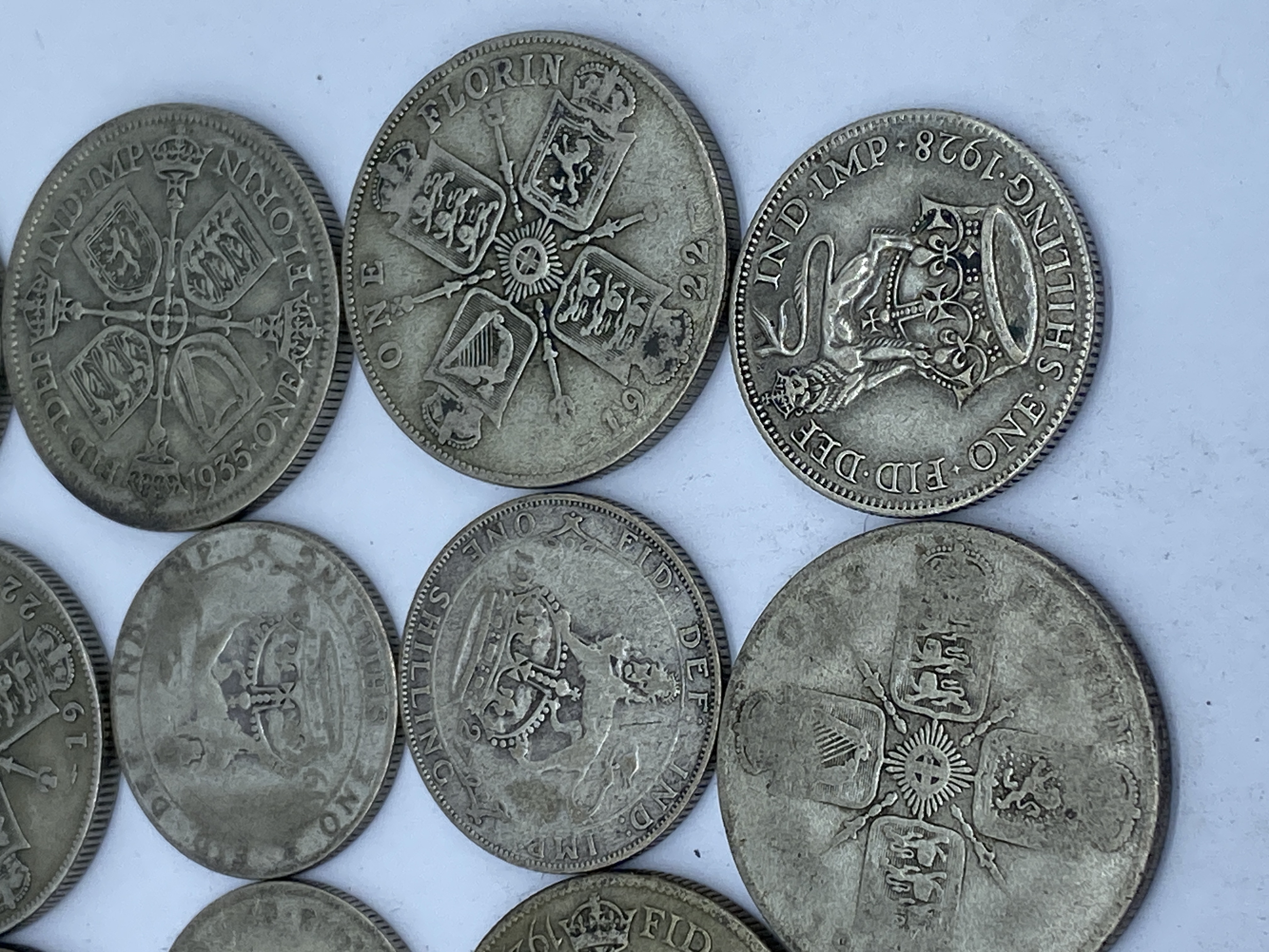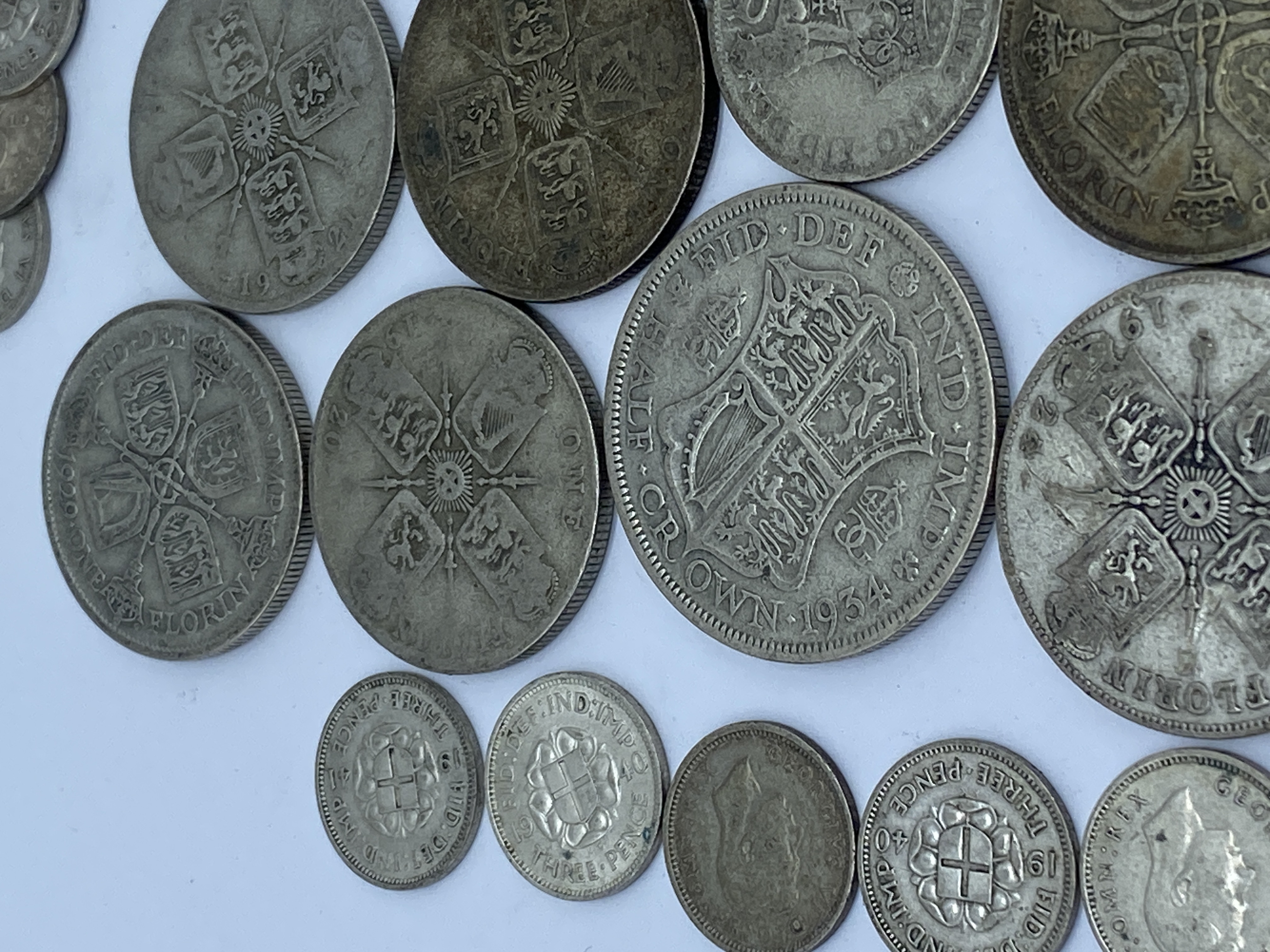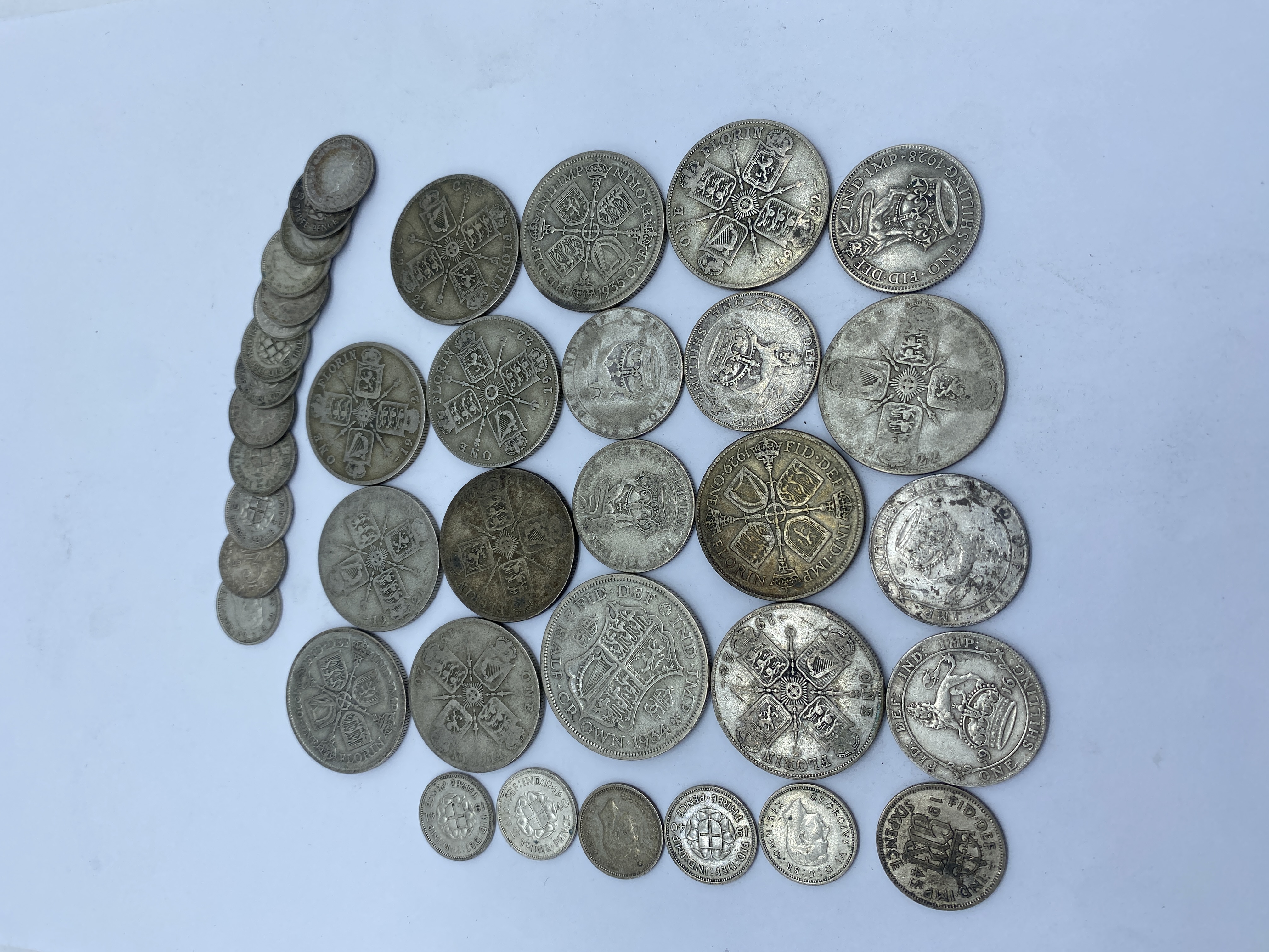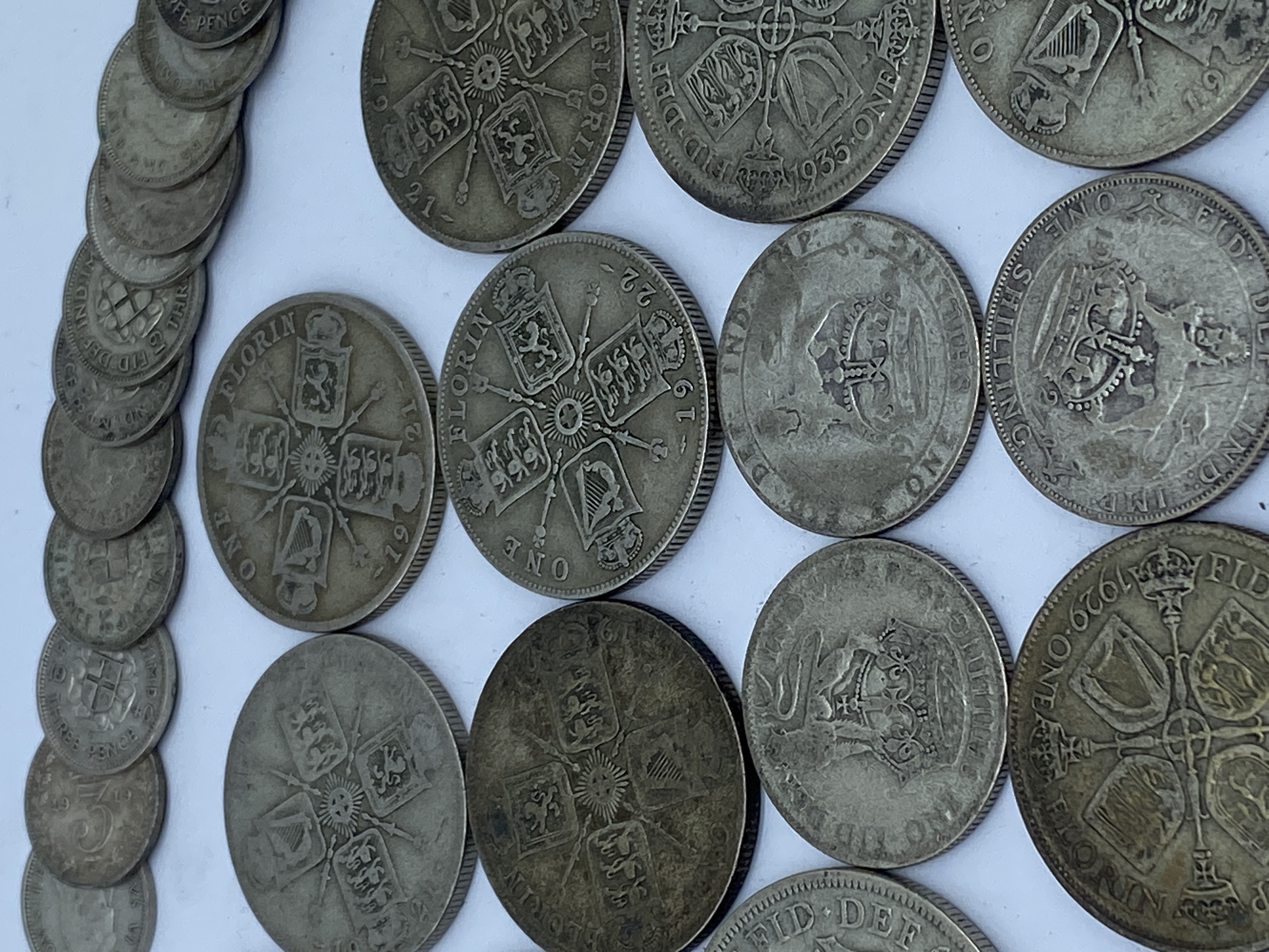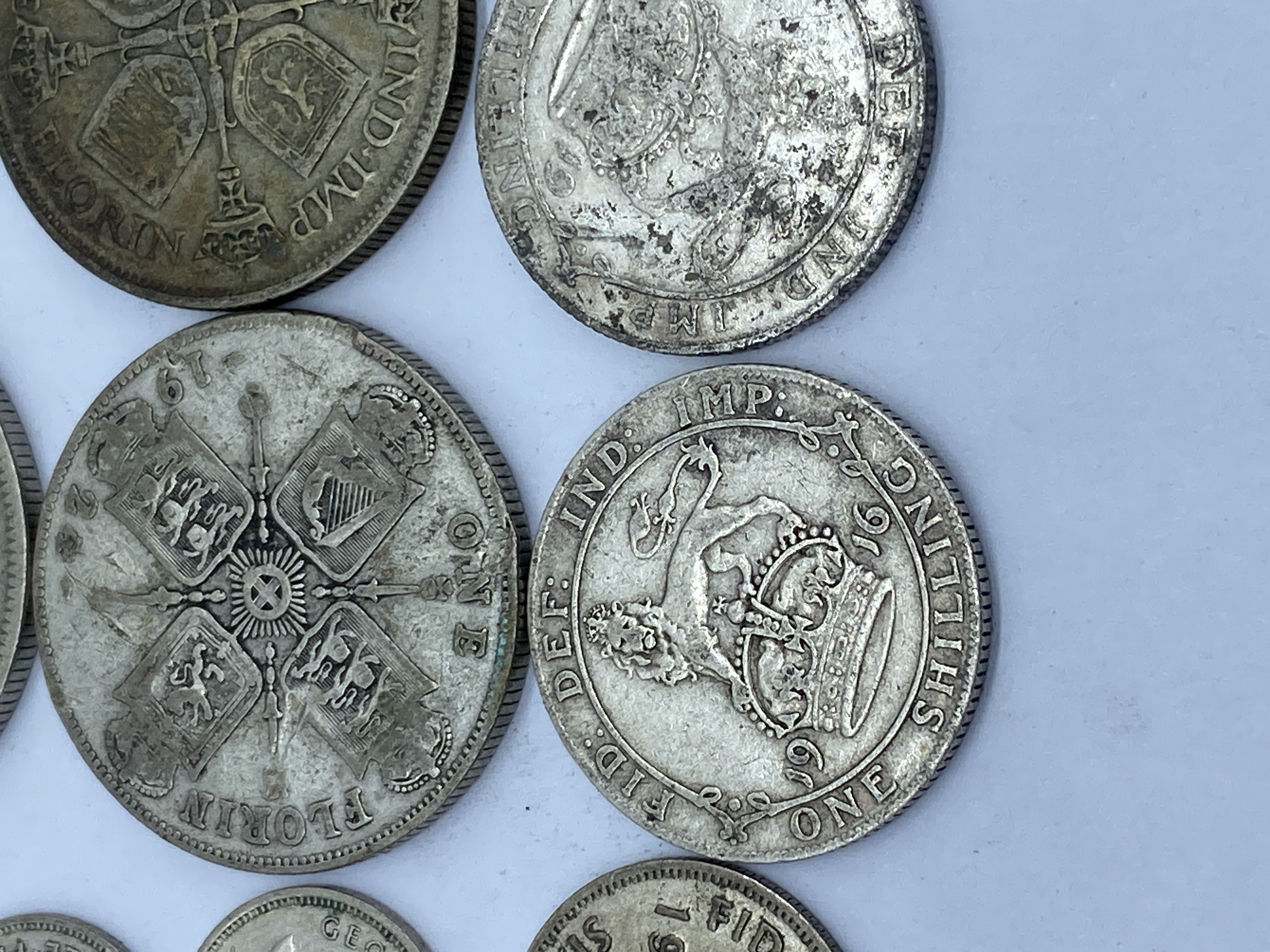 A collection of various silver British coins including half crowns, florins, shillings, and sixpences.