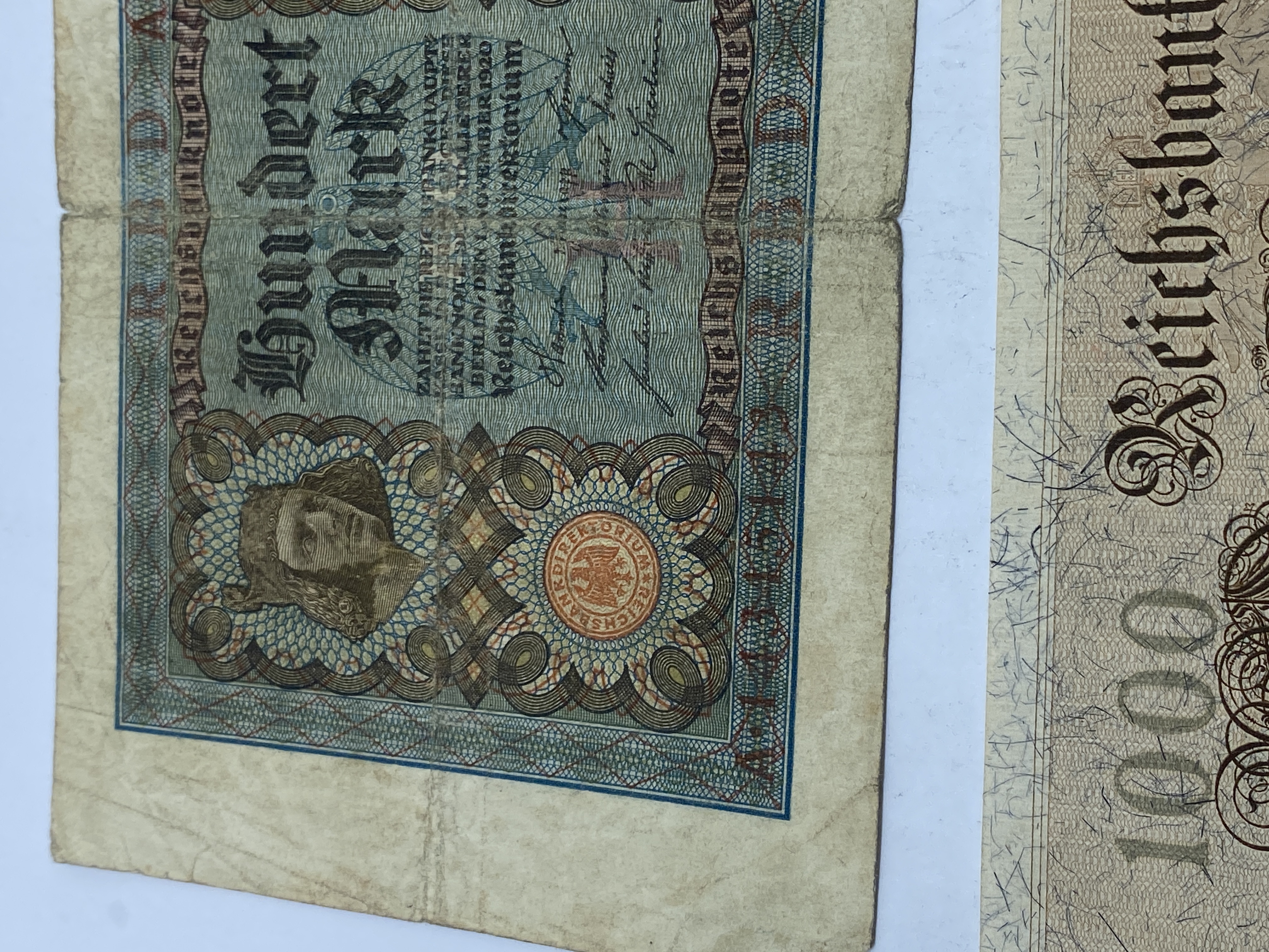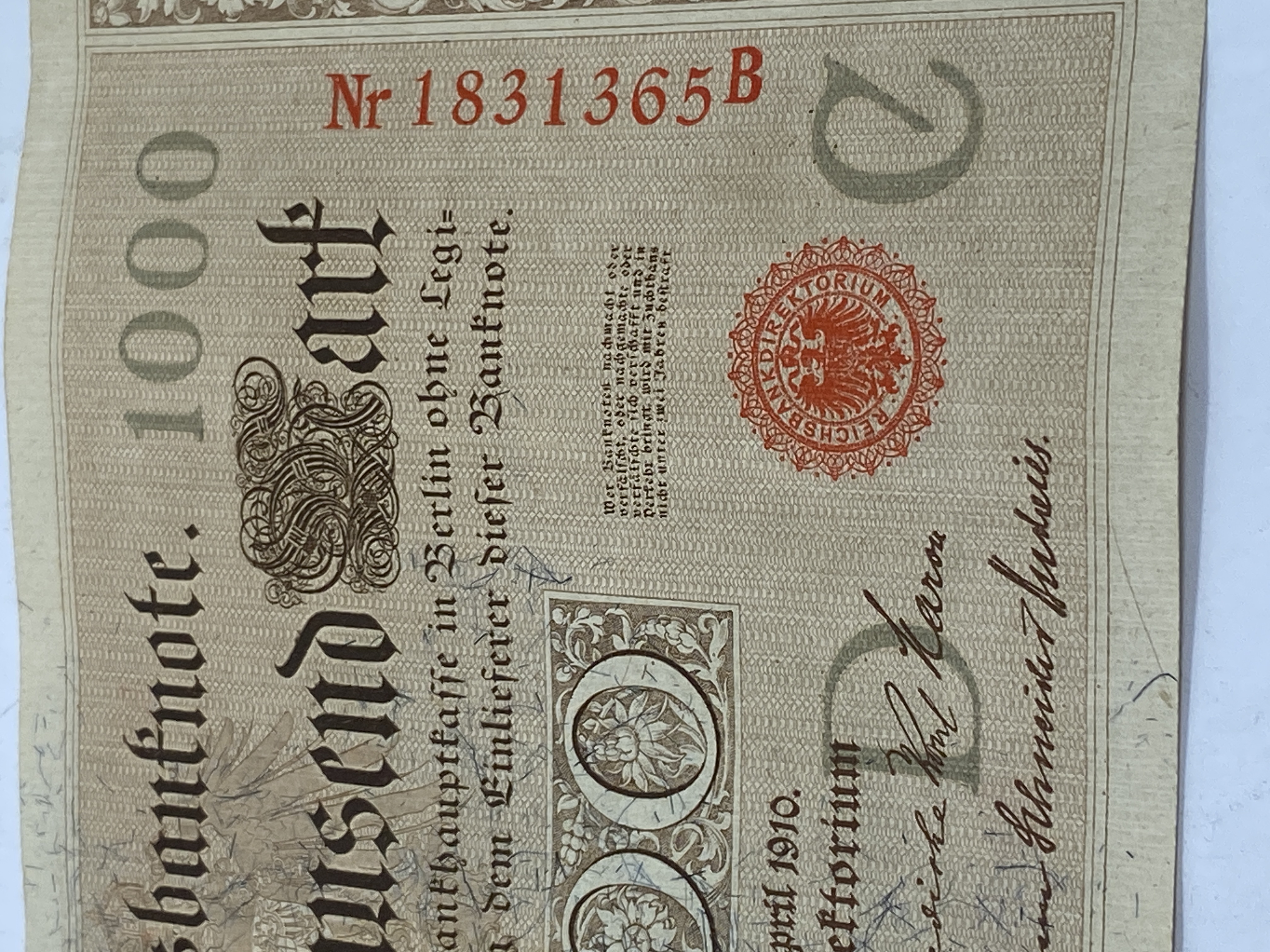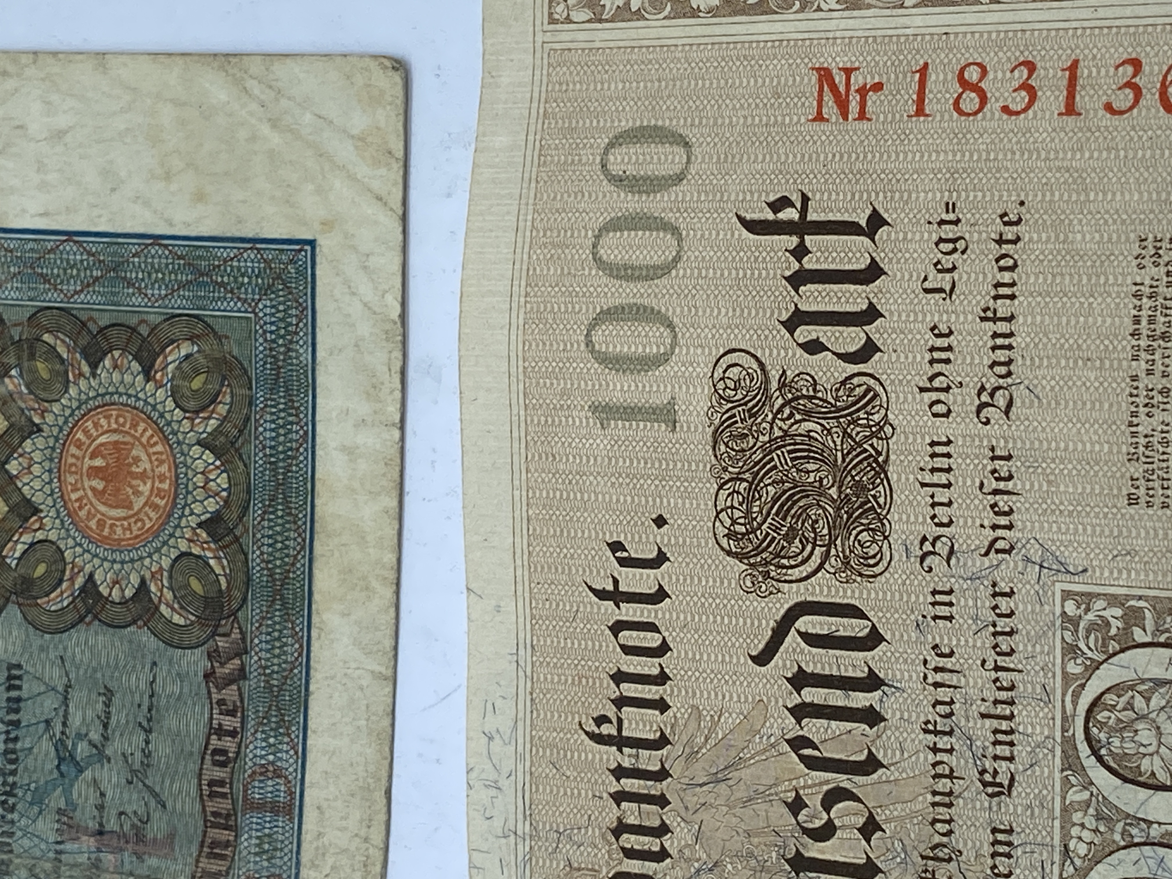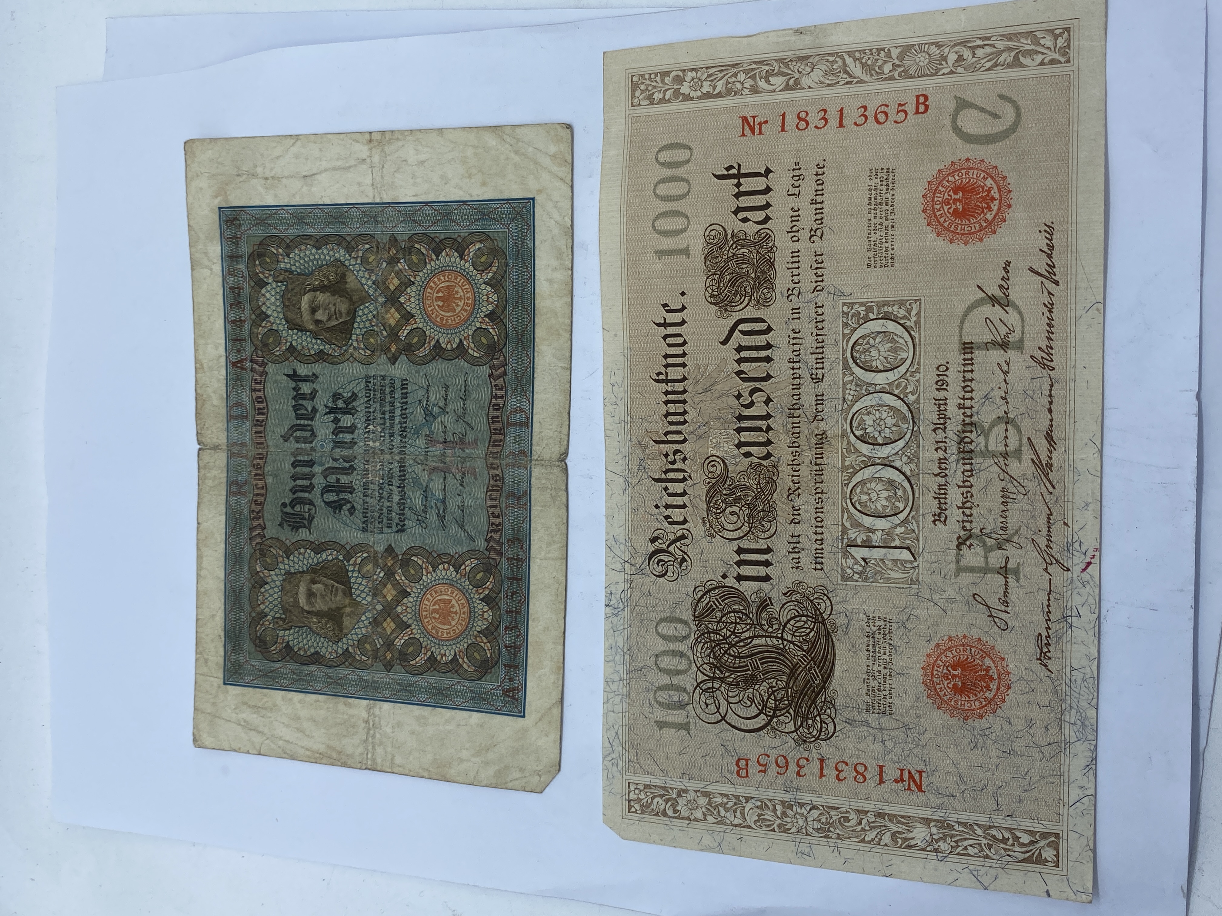 Two German 1000 Mark Reichsbanknote banknotes dated 1910.