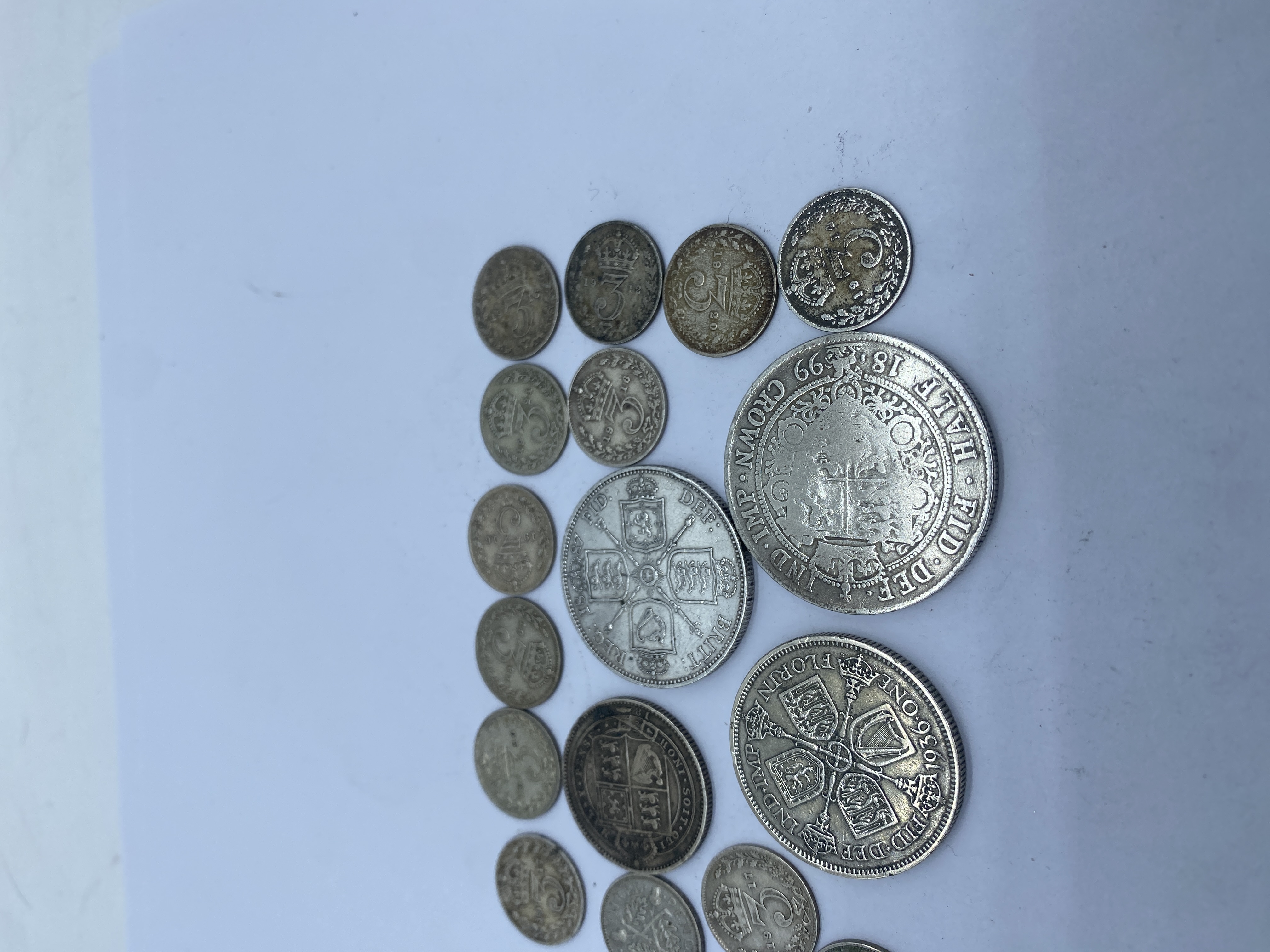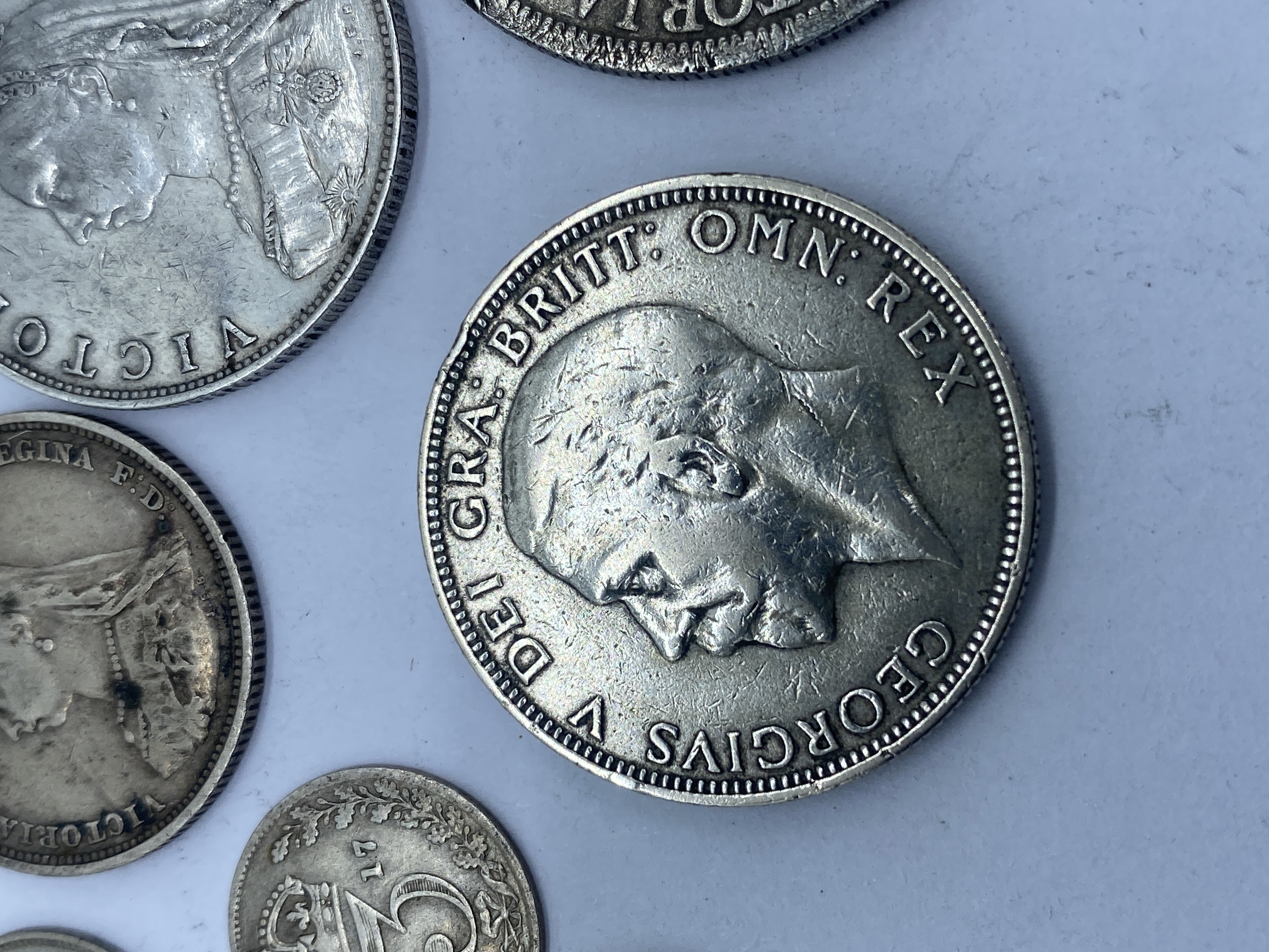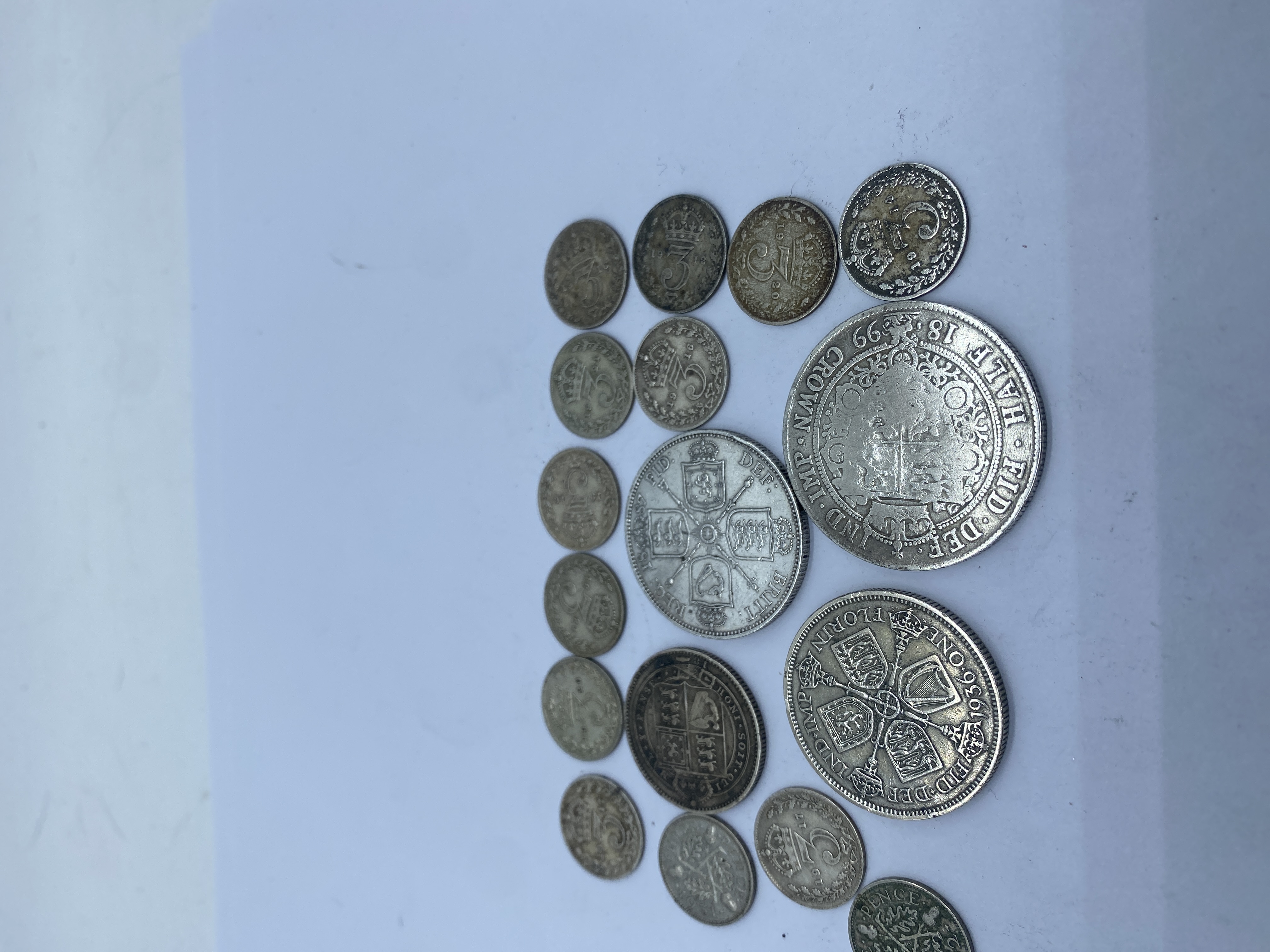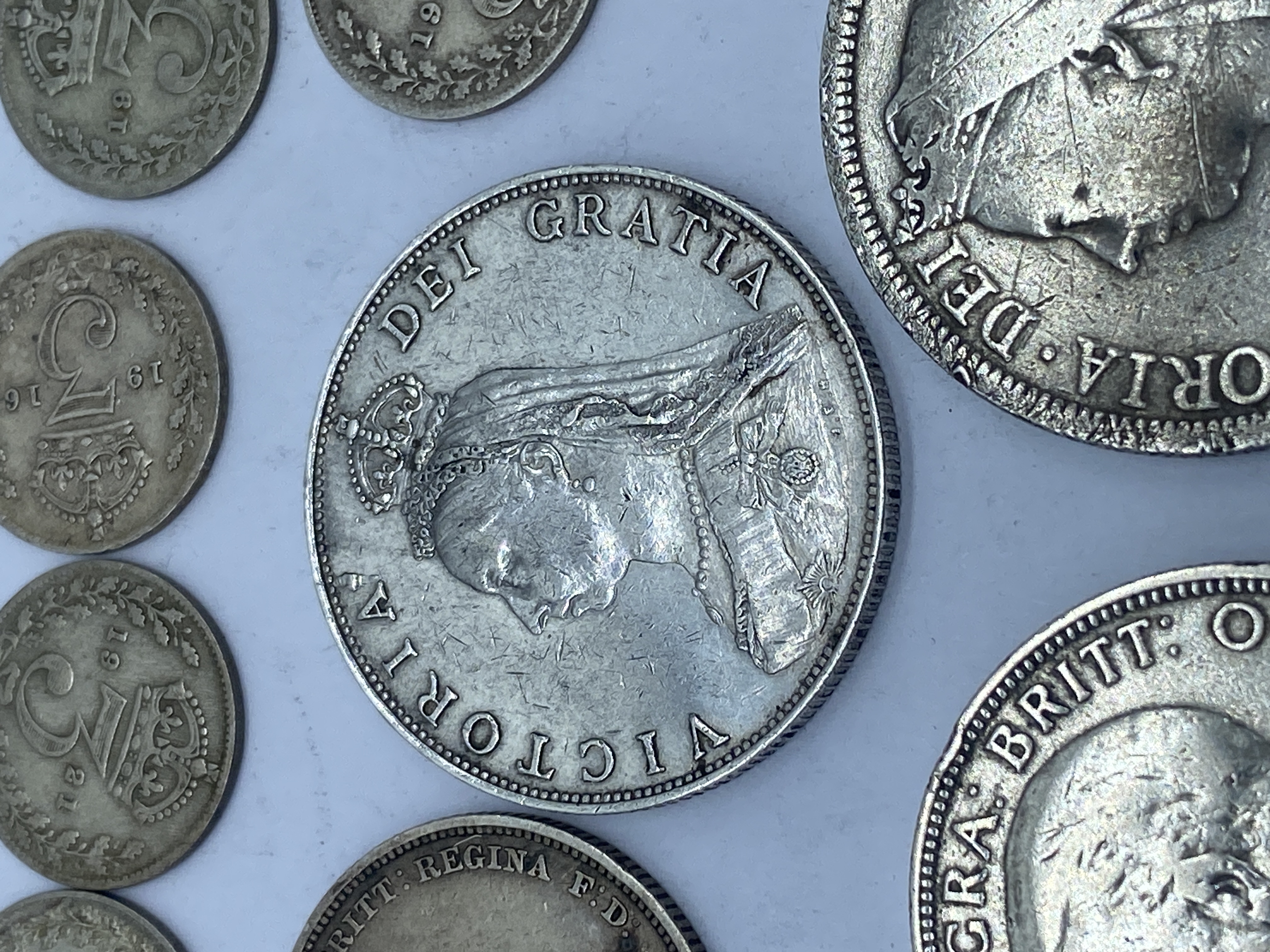 A collection of pre-1947 British silver coins including crowns, half crowns, florins, shillings, and sixpence.