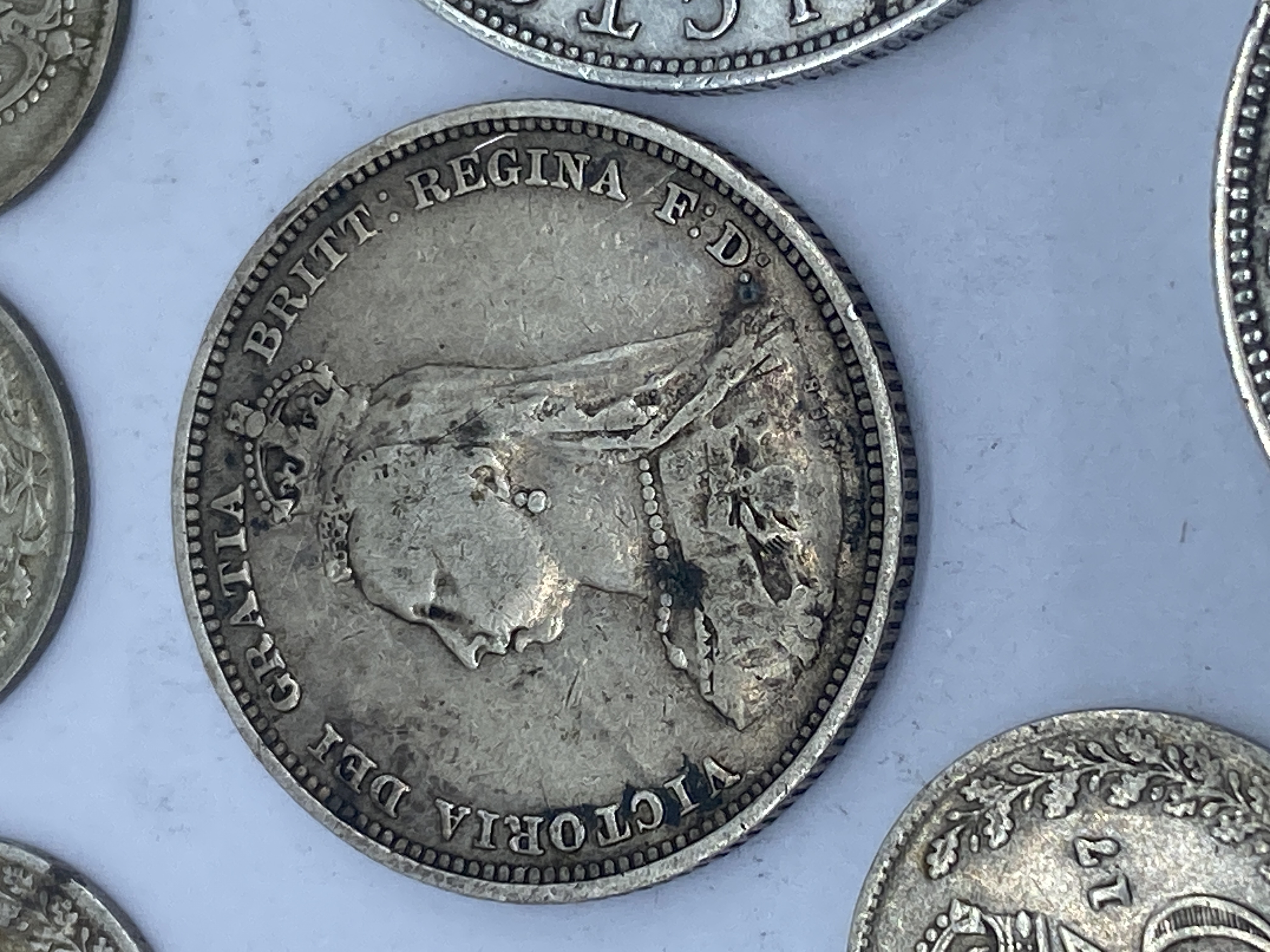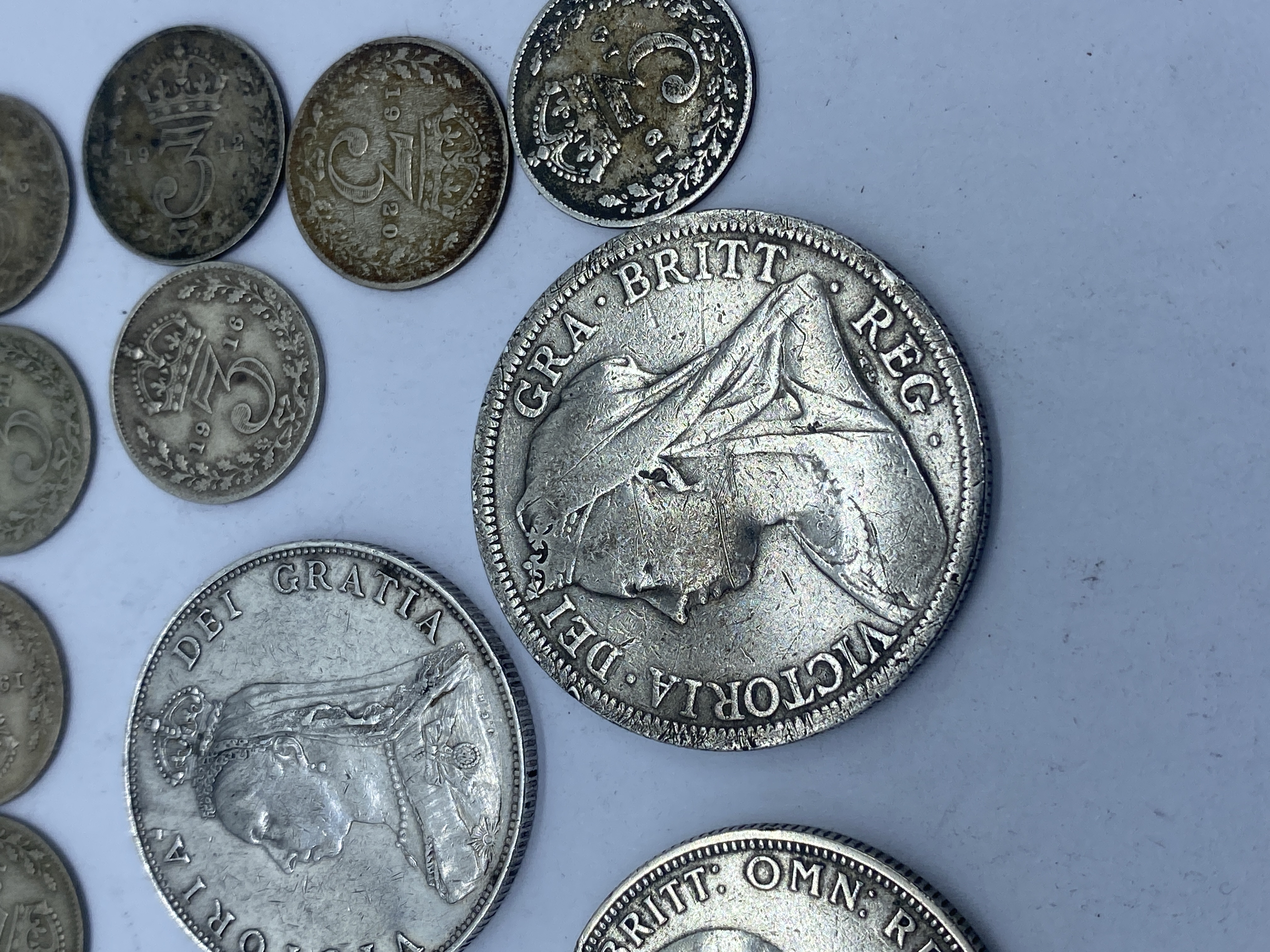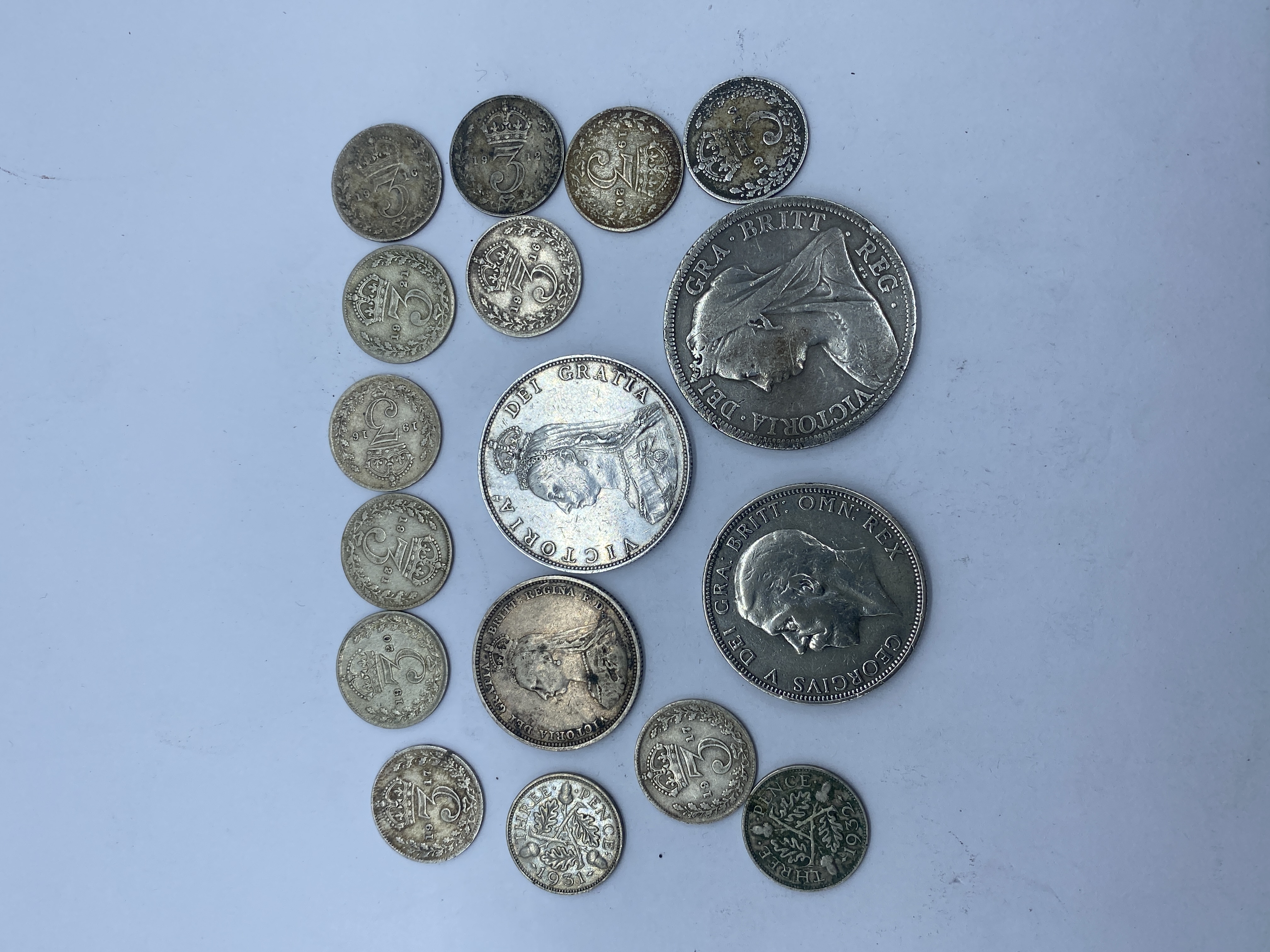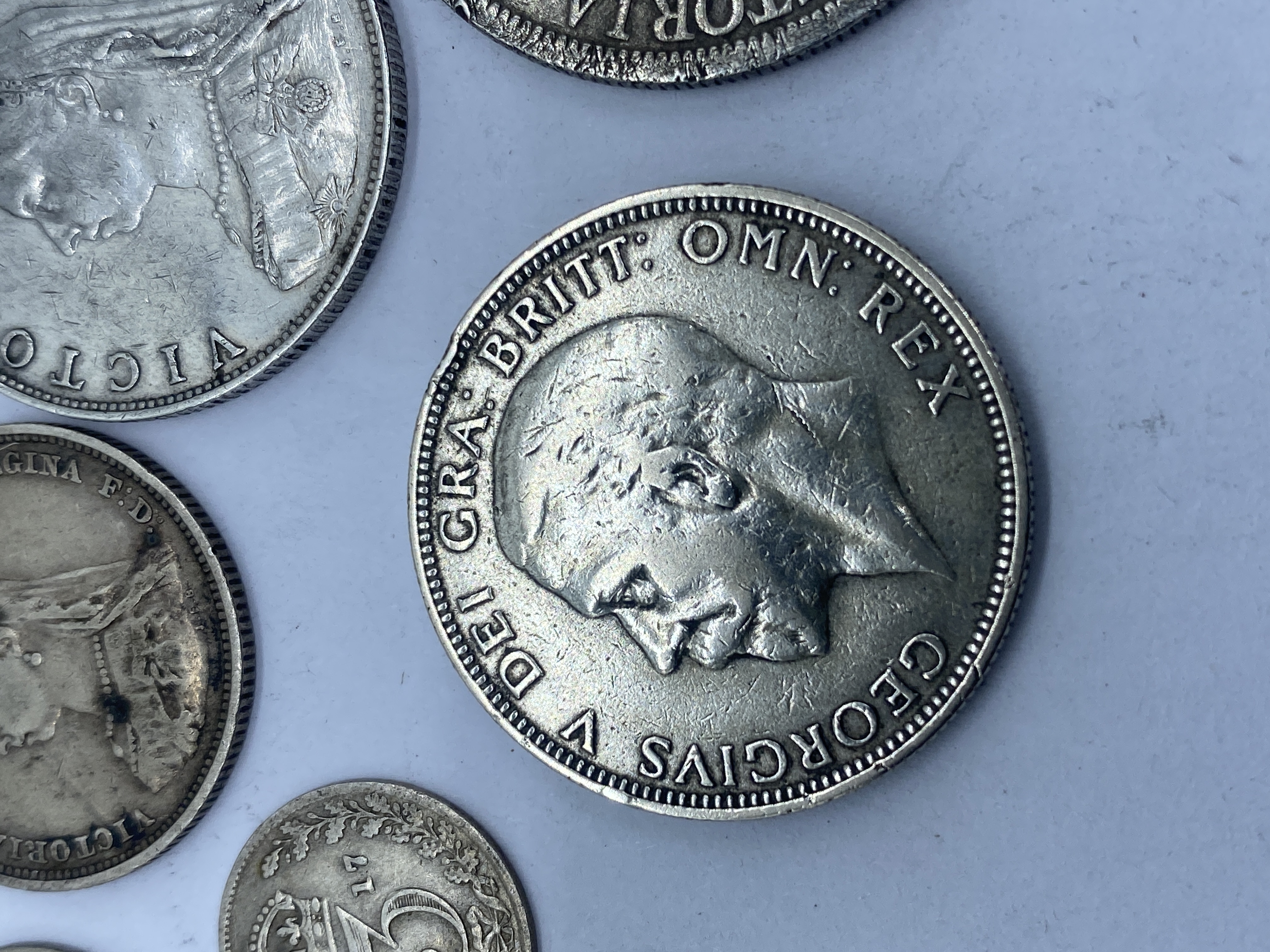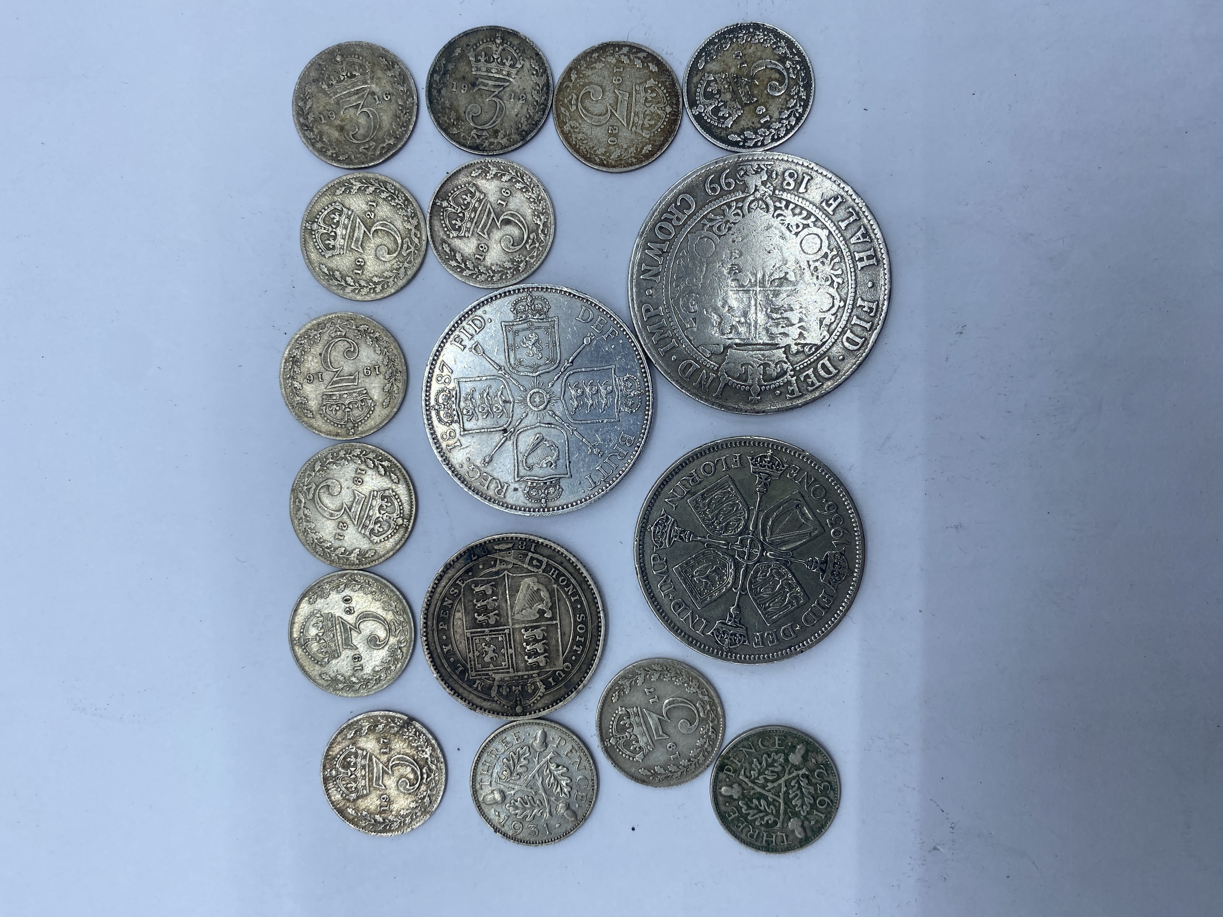 A collection of pre-1947 British silver coins including crowns, half crowns, florins, shillings, and sixpence.