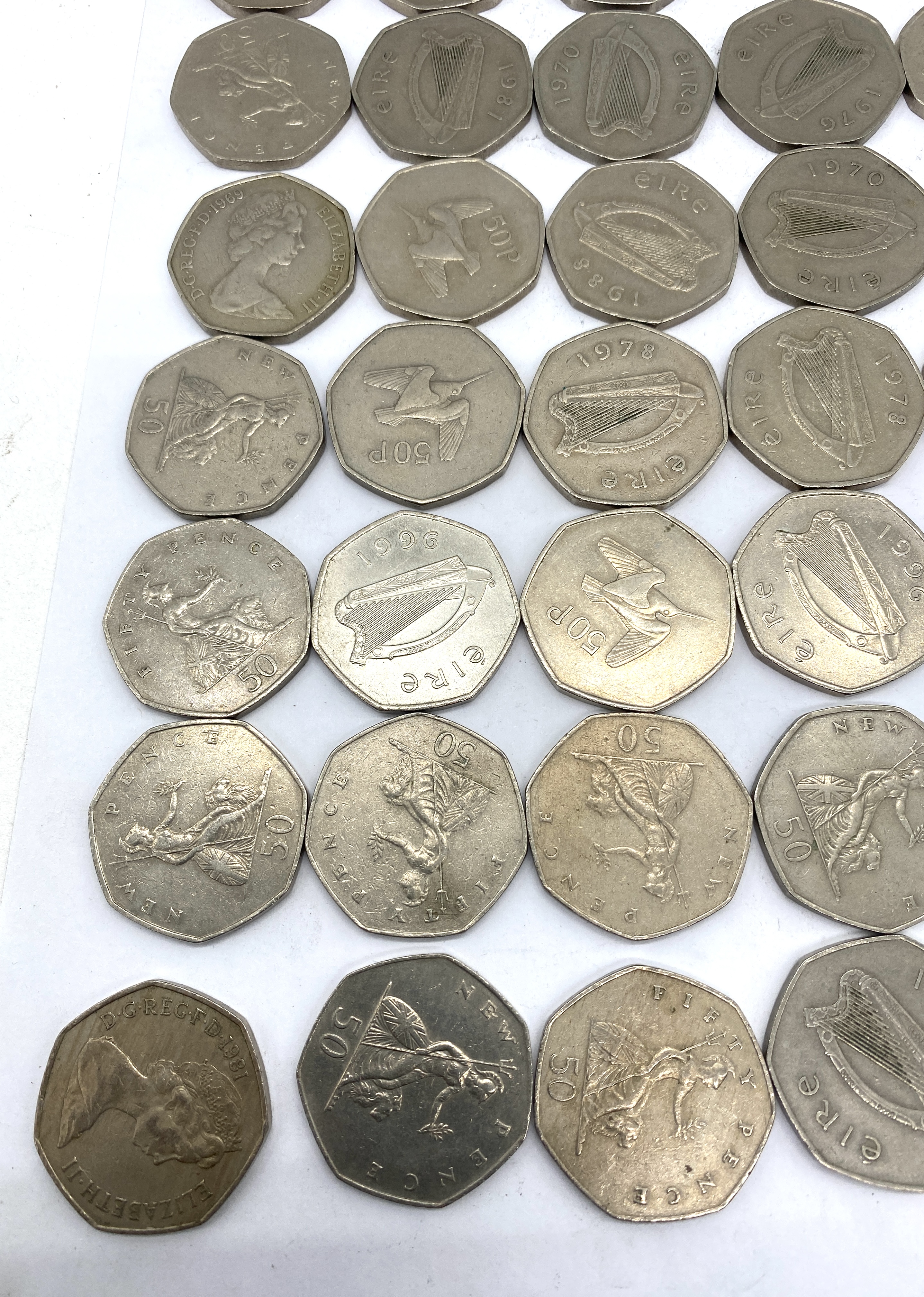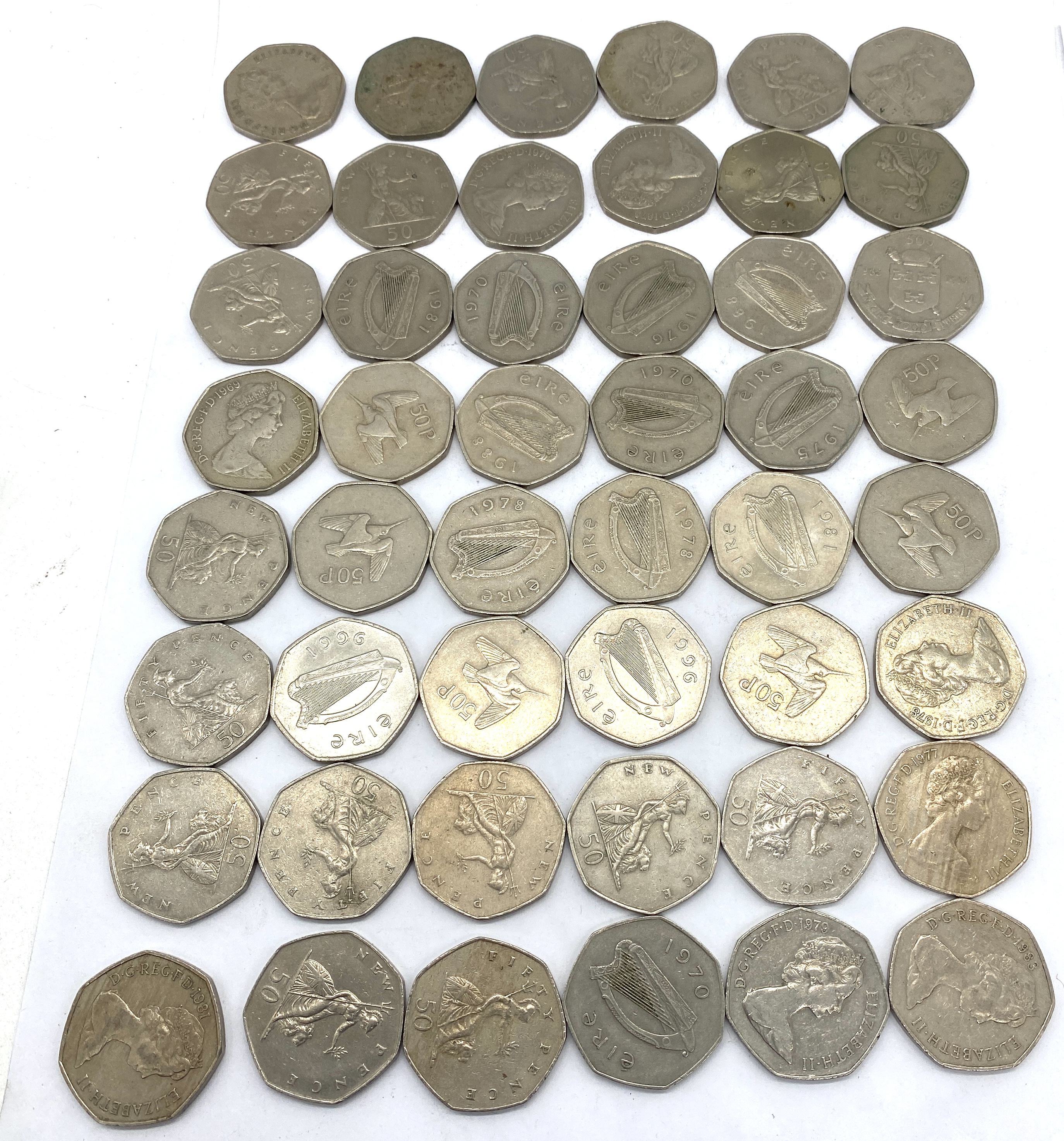 A collection of circulated Irish fifty pence coins featuring various designs.