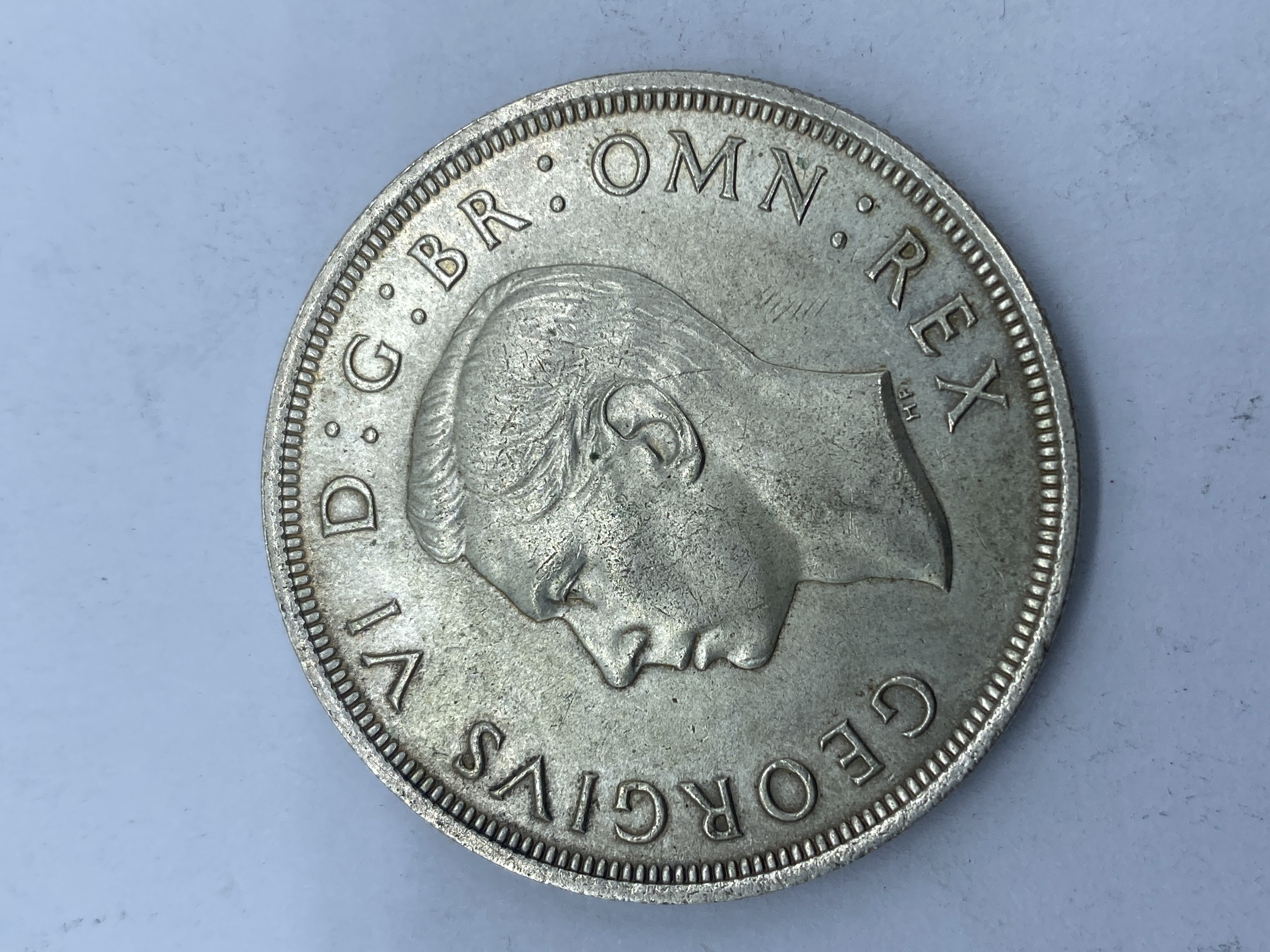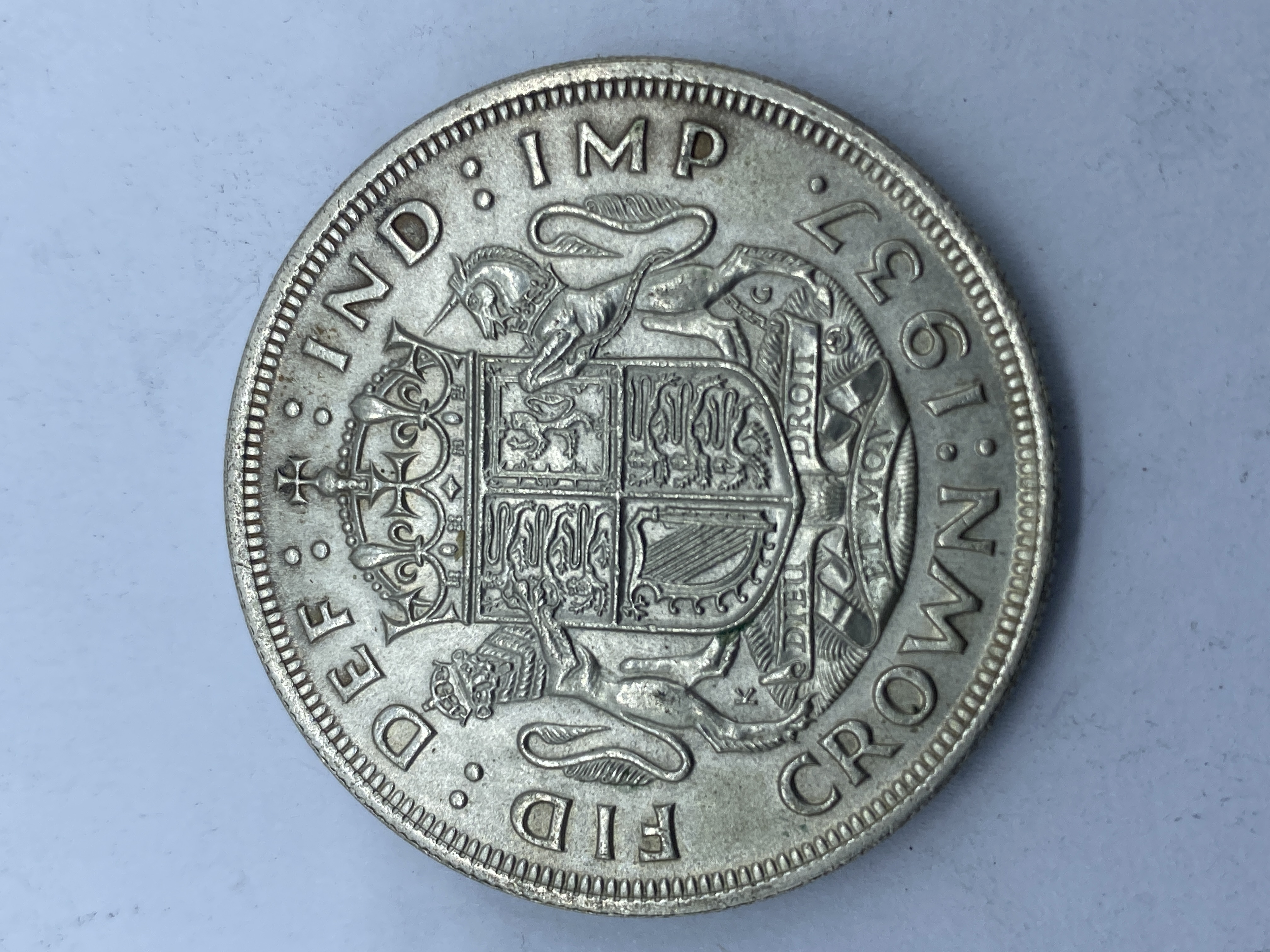 A silver British crown coin dated 1937, featuring George VI.