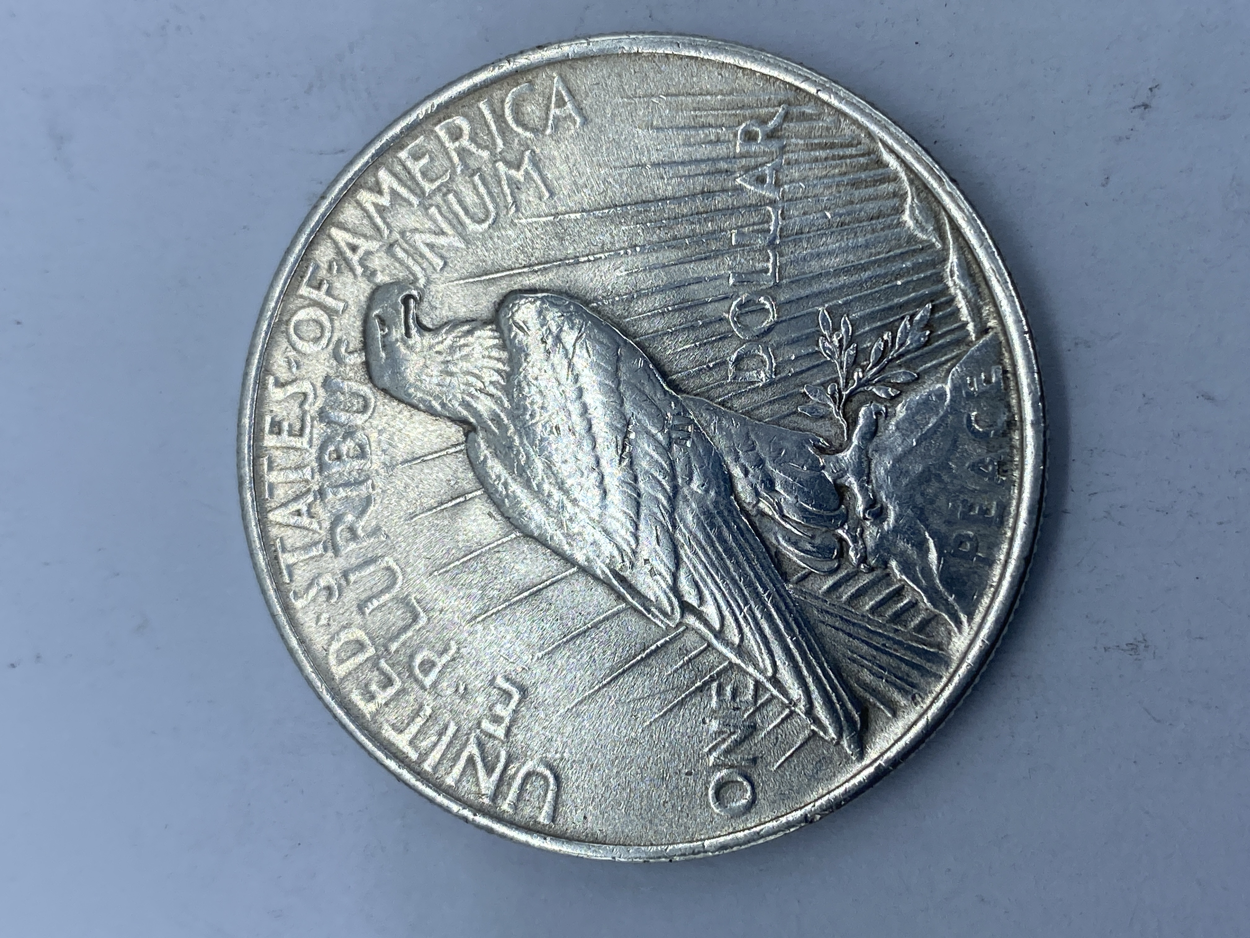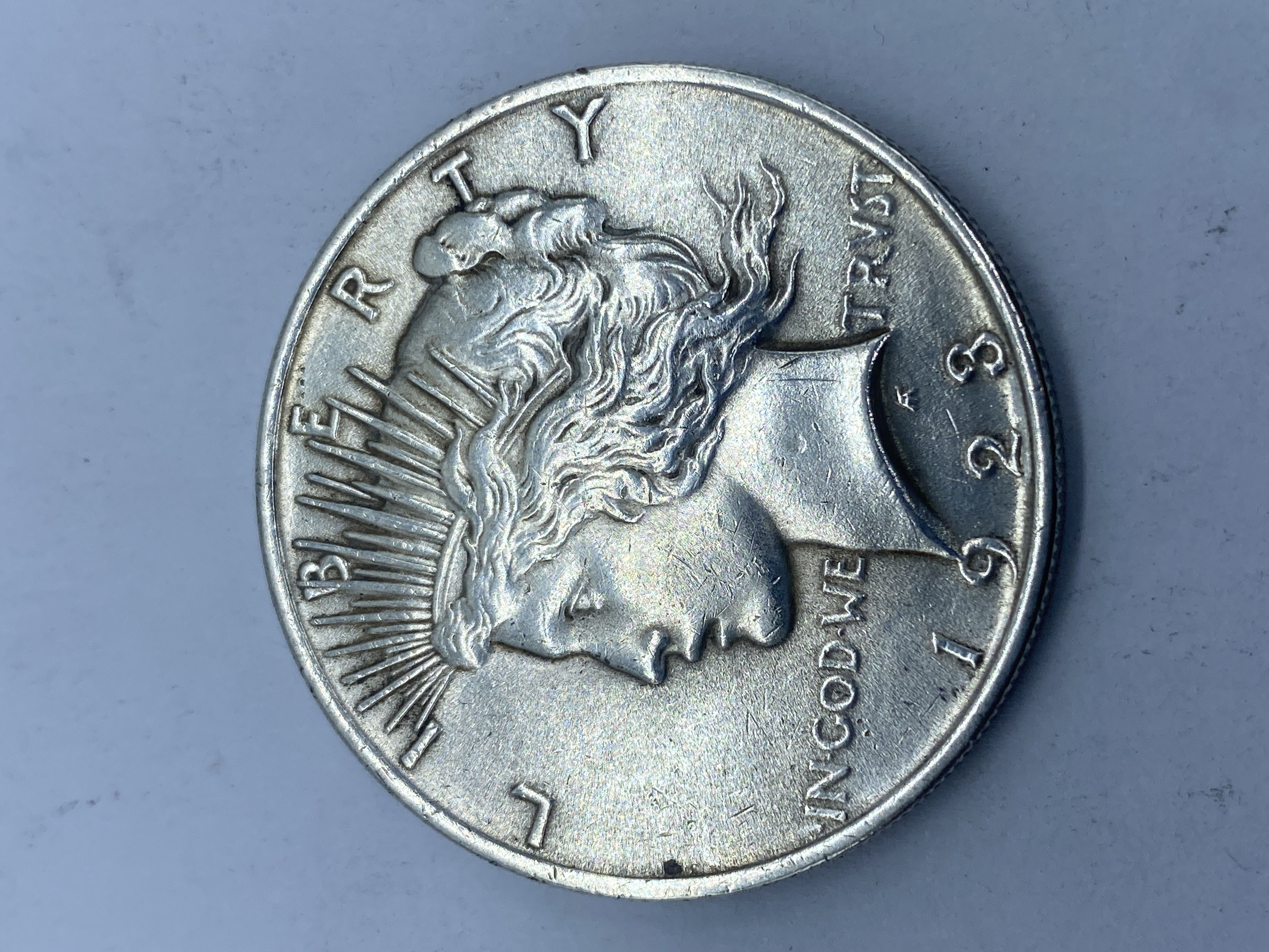 Silver Peace dollar coin dated 1923 with an “S” mint mark.