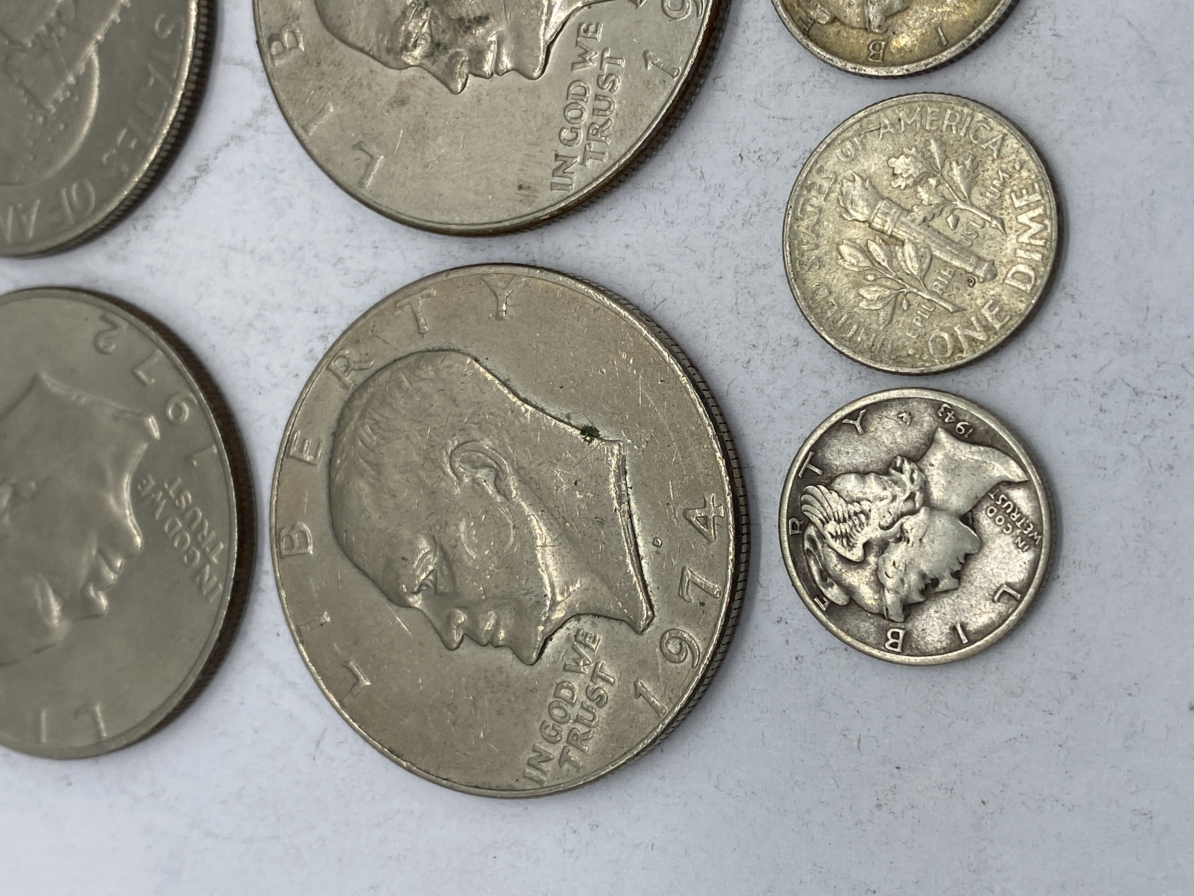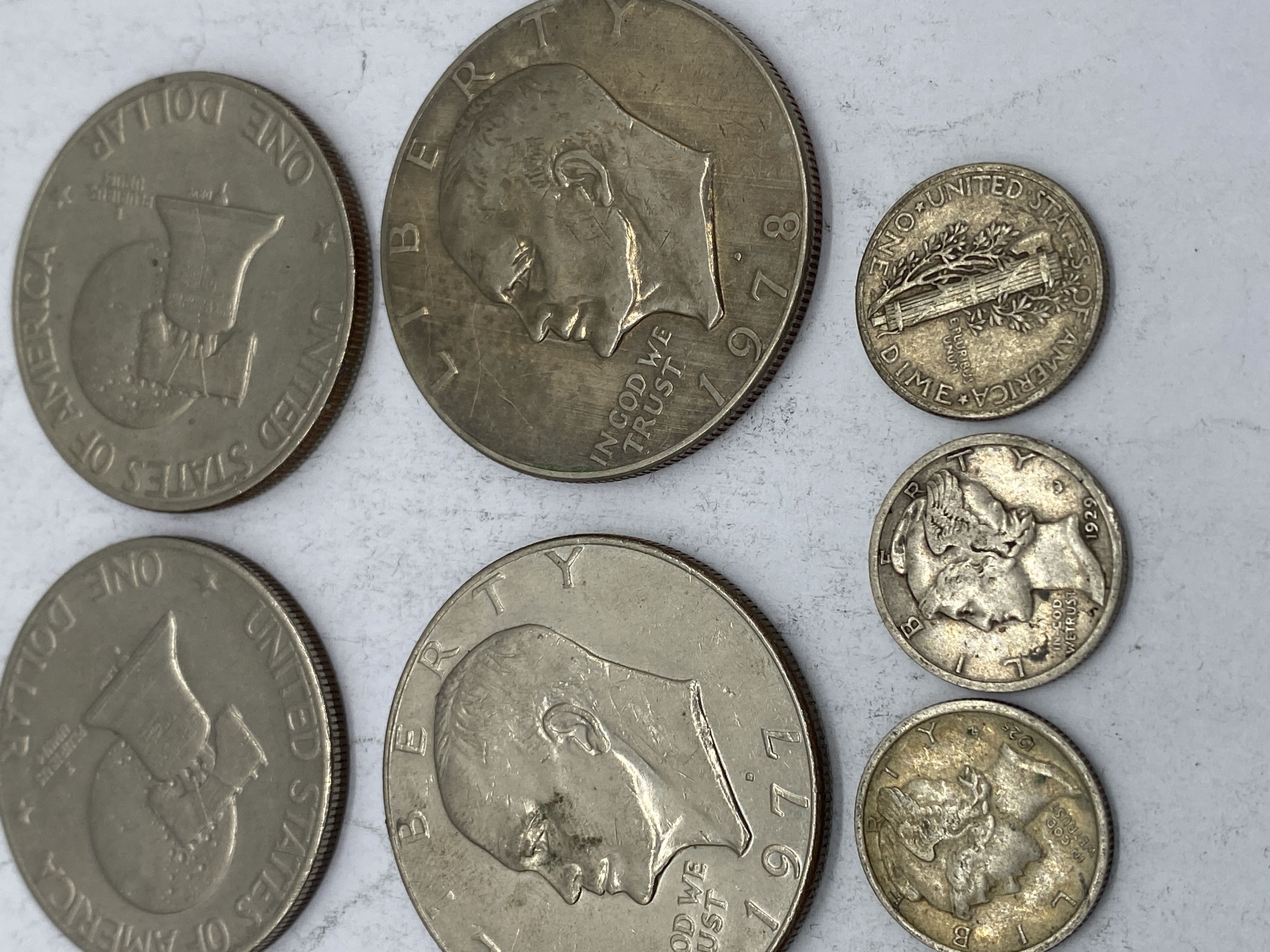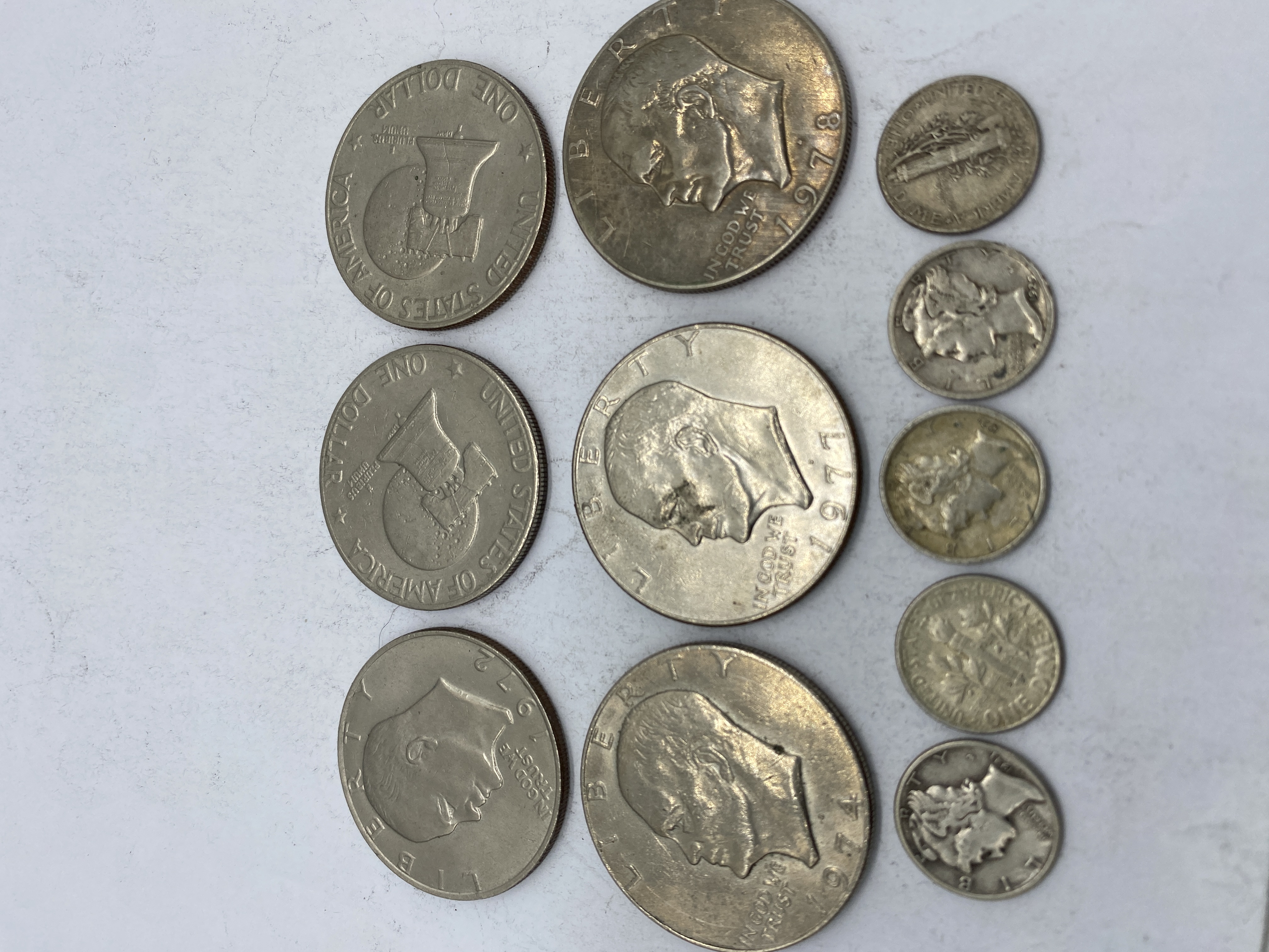 A collection of Eisenhower dollars and dimes of various dates and mint marks.