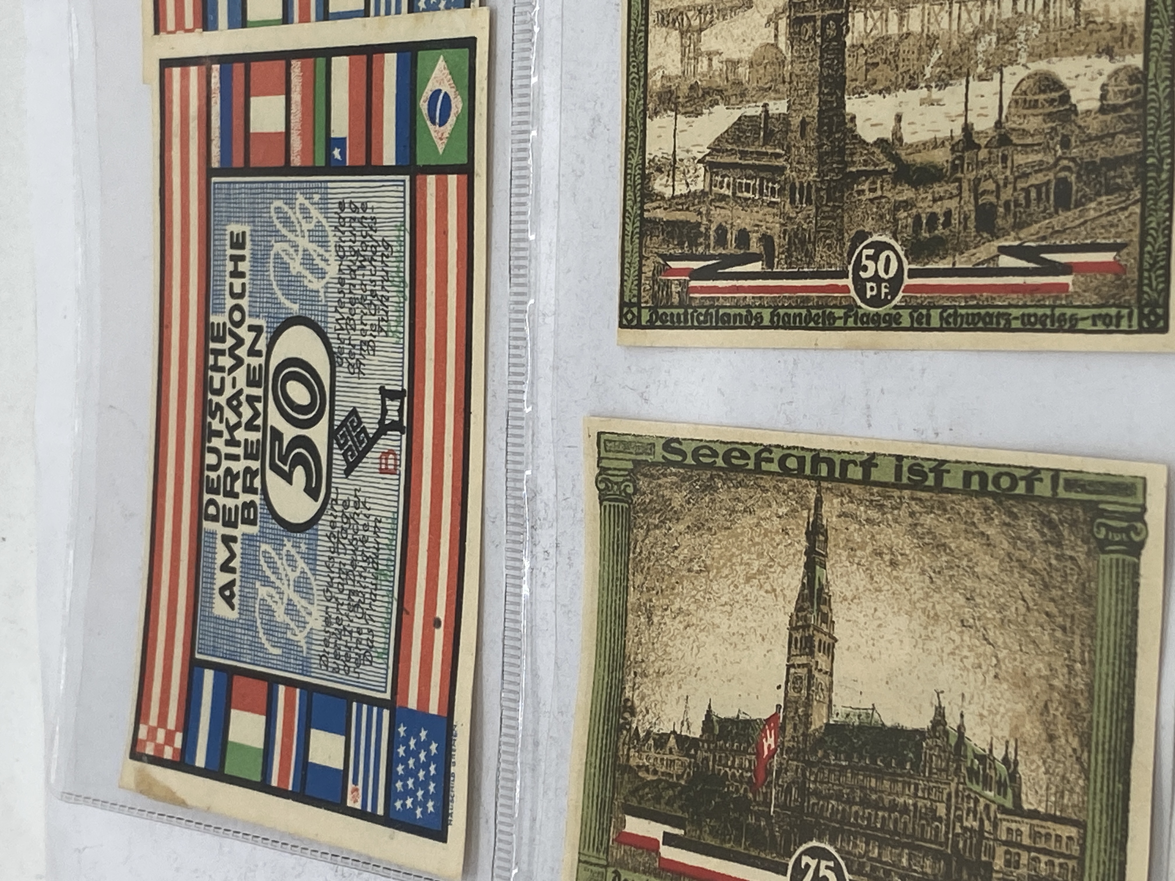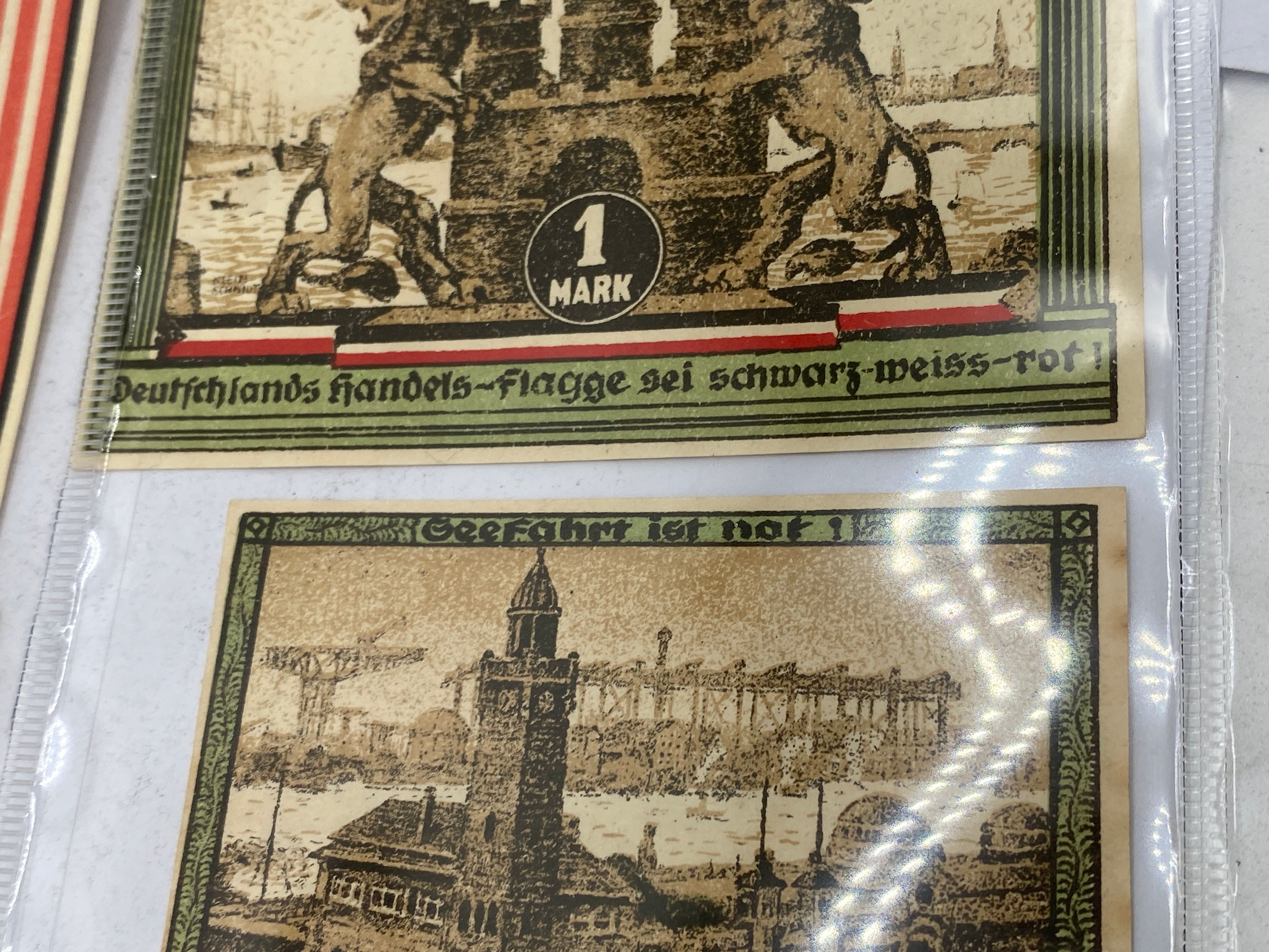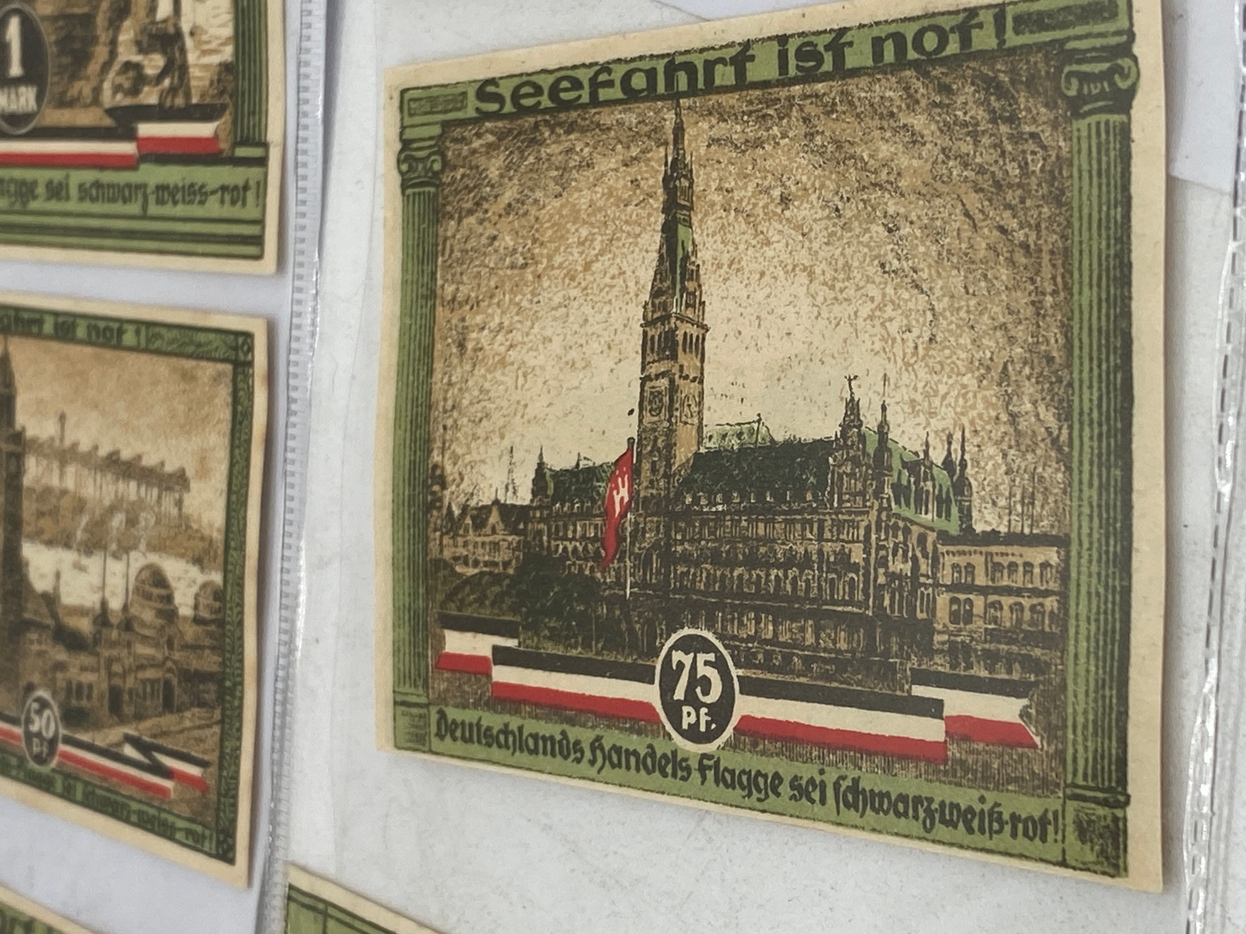 A collection of vintage German Notgeld banknotes featuring various denominations, cities, and themes.