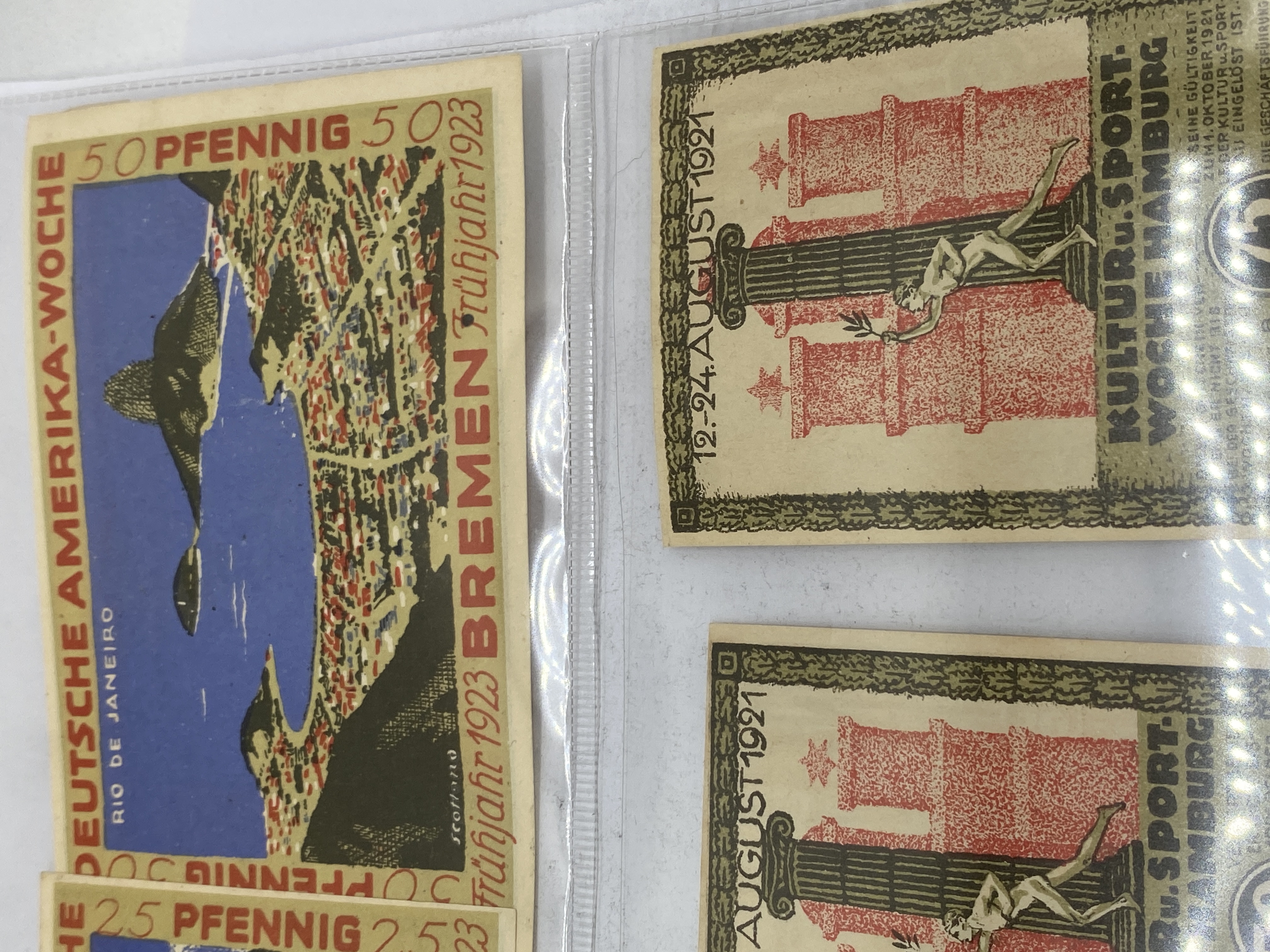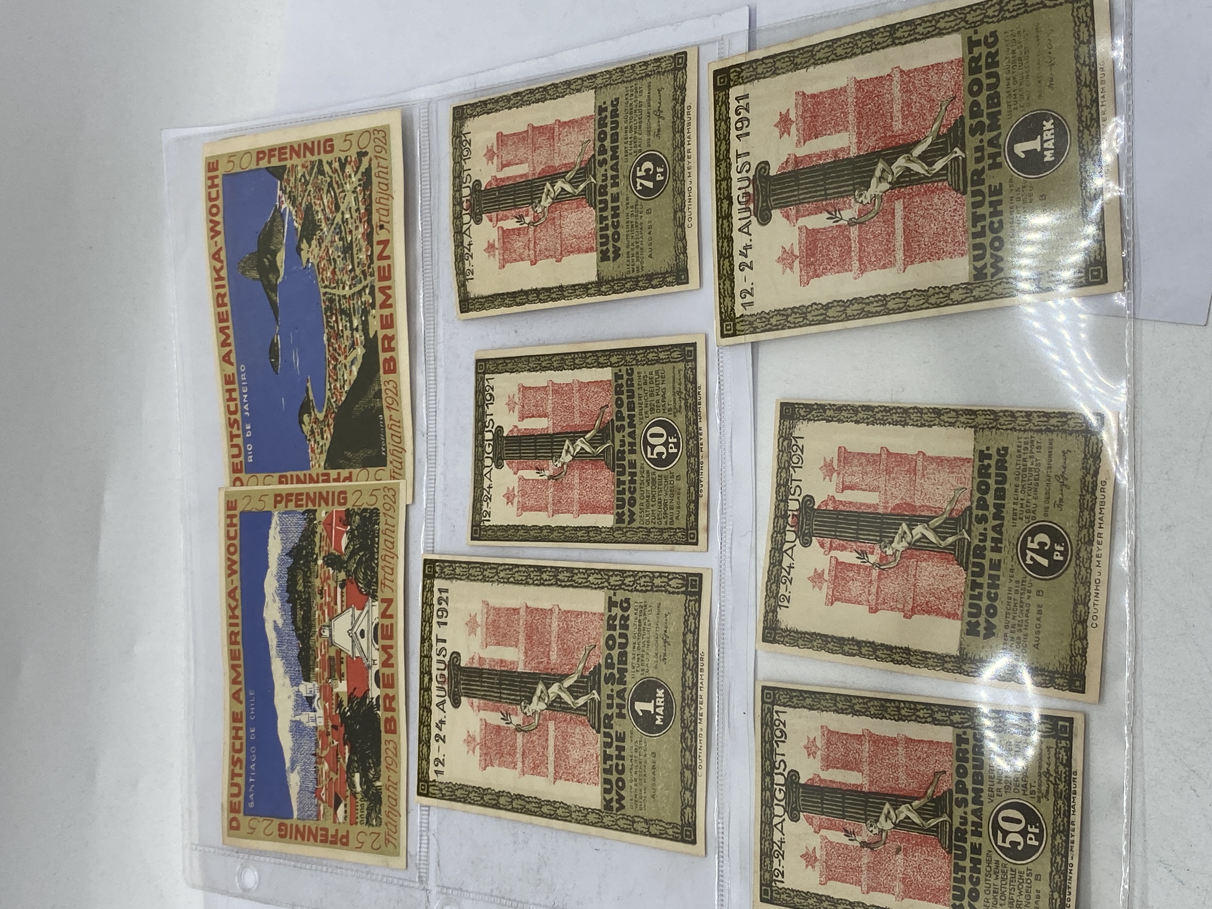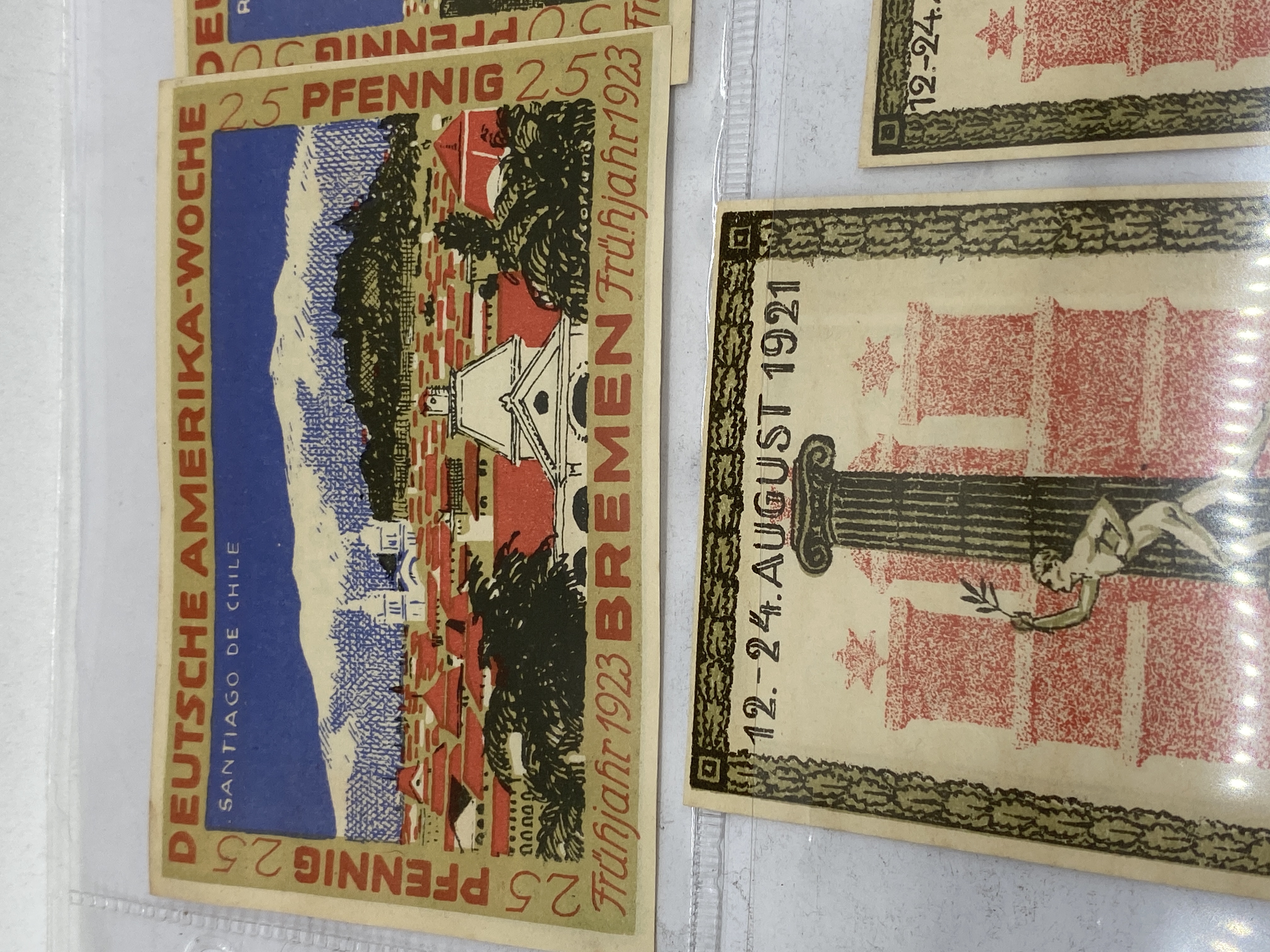 A collection of vintage German Notgeld banknotes featuring various denominations, cities, and themes.