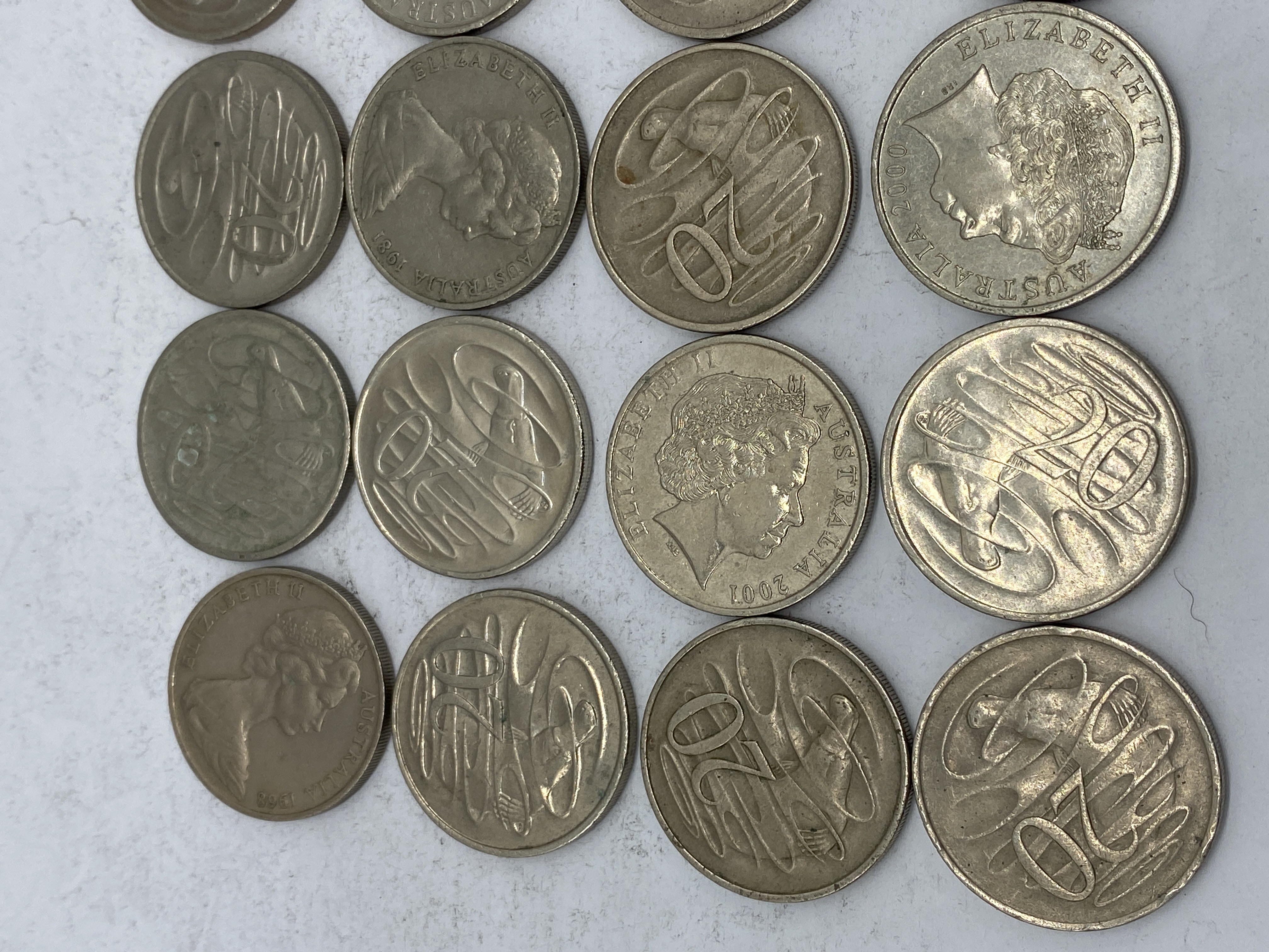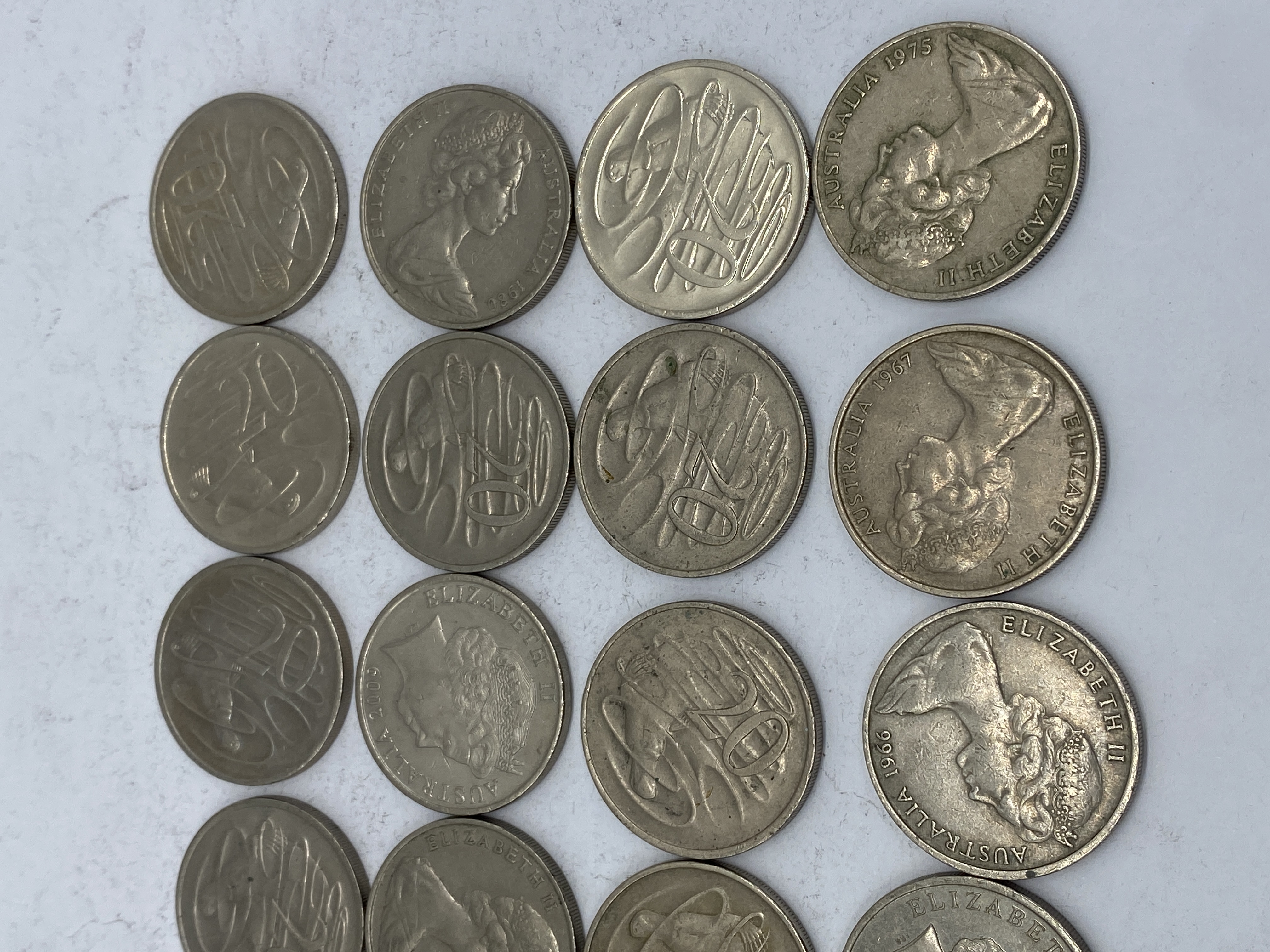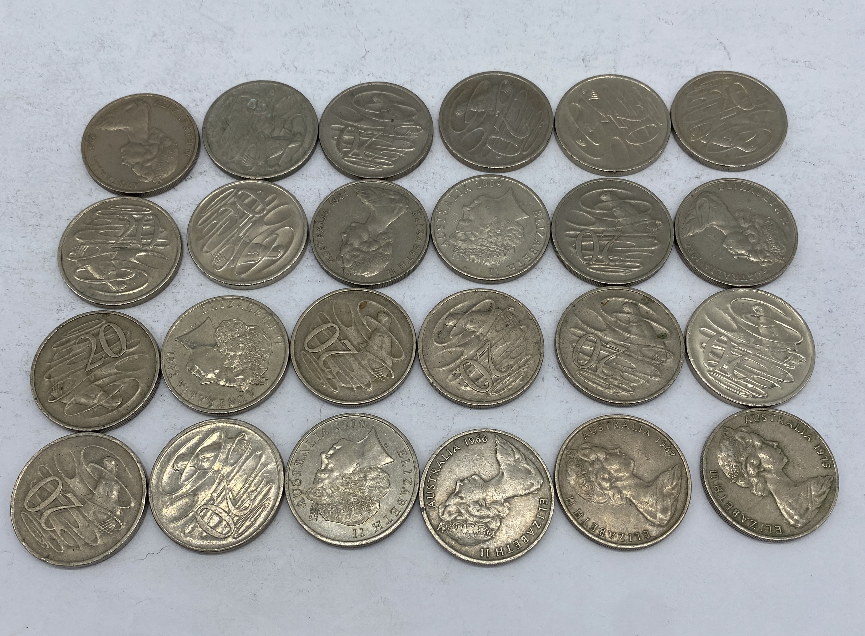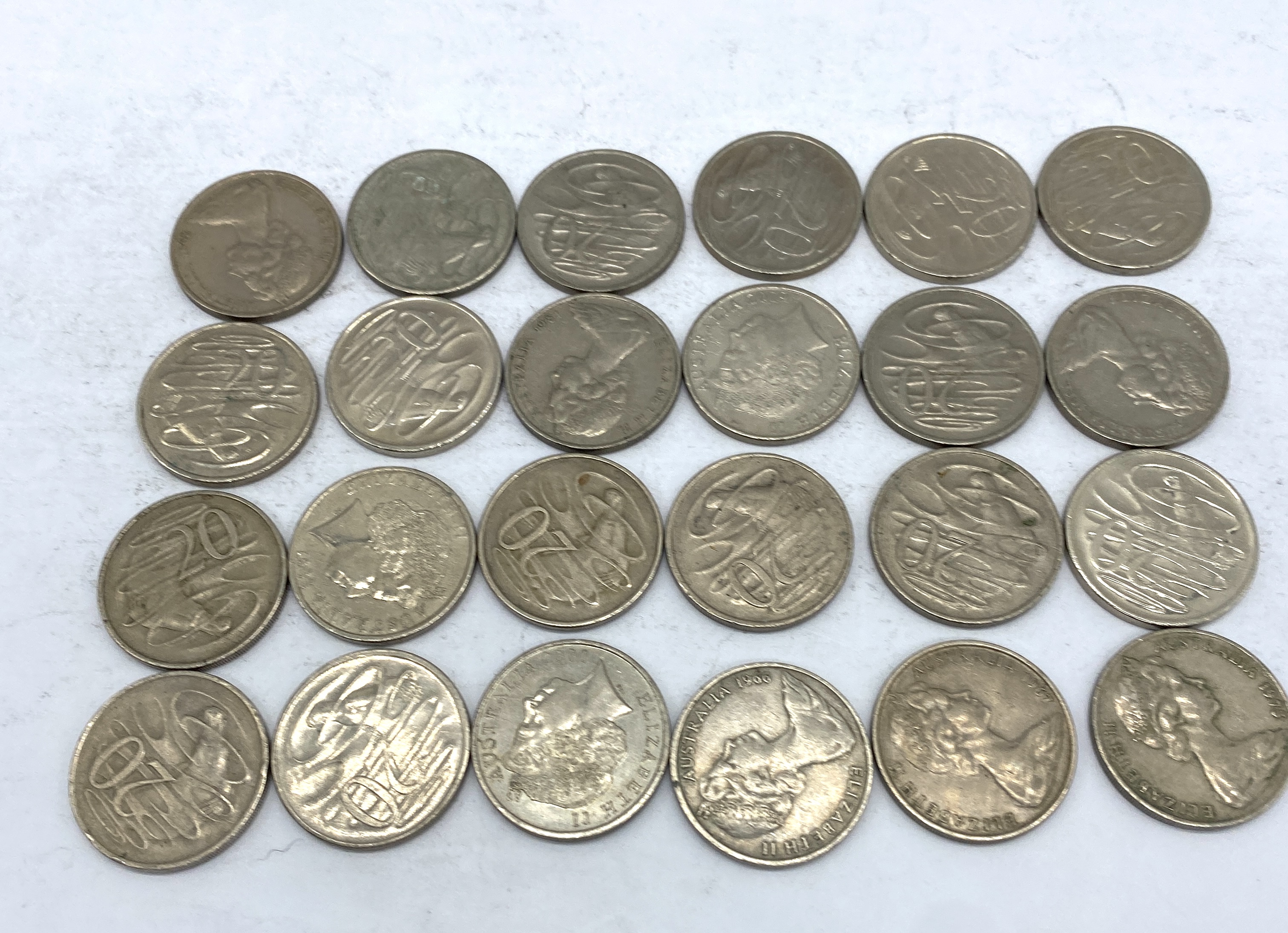 A collection of Australian 20 cent coins featuring various designs.