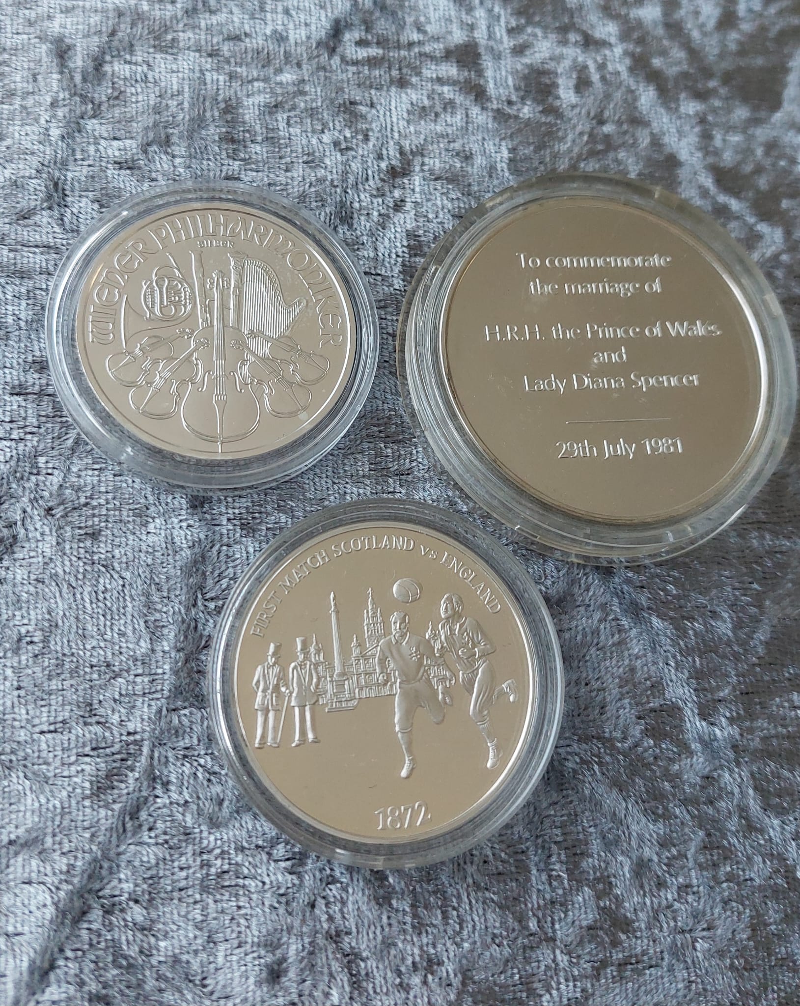 Three silver commemorative coins, including Euro 96, Royal Mint 1996, and a musical coin.