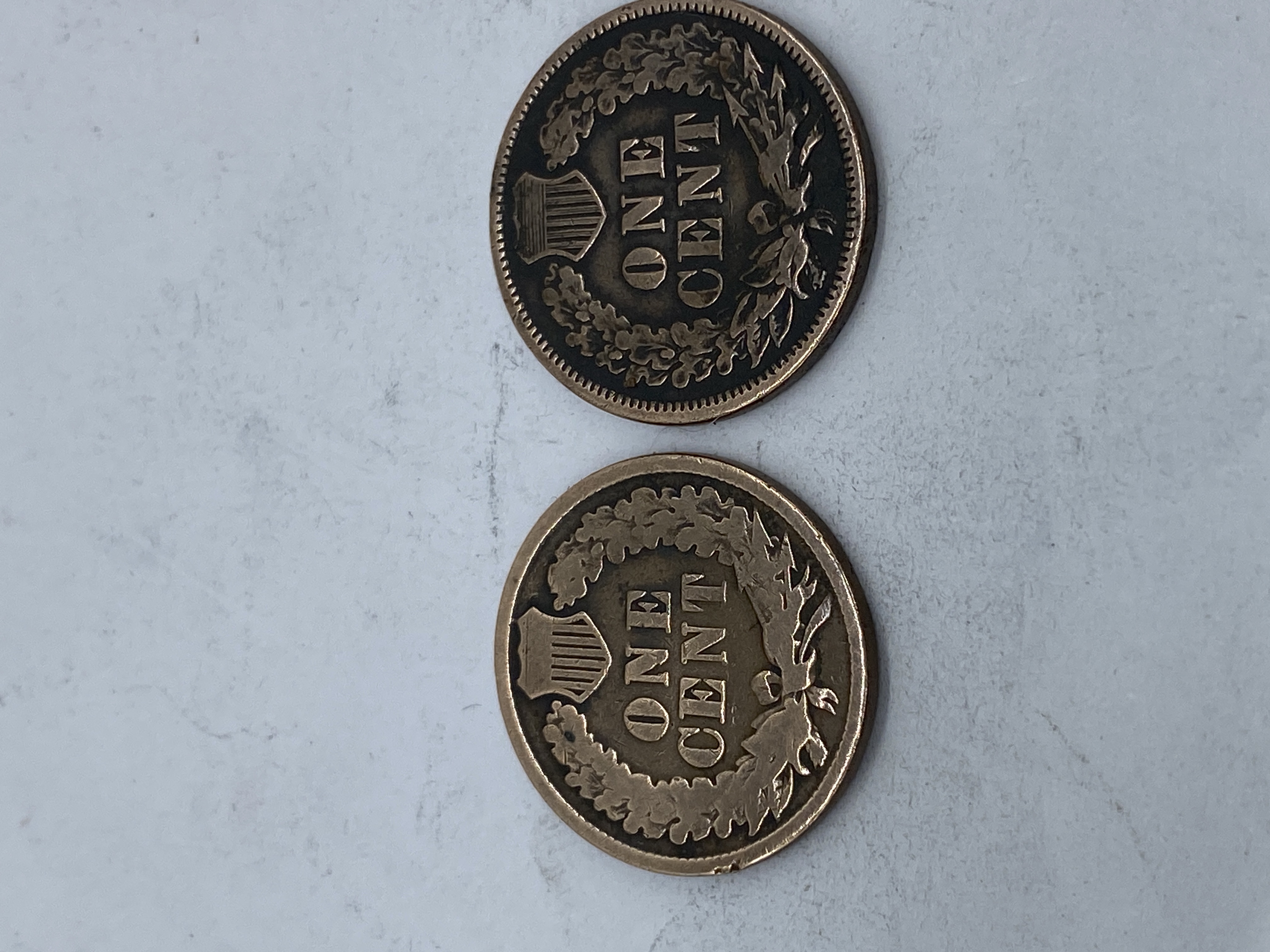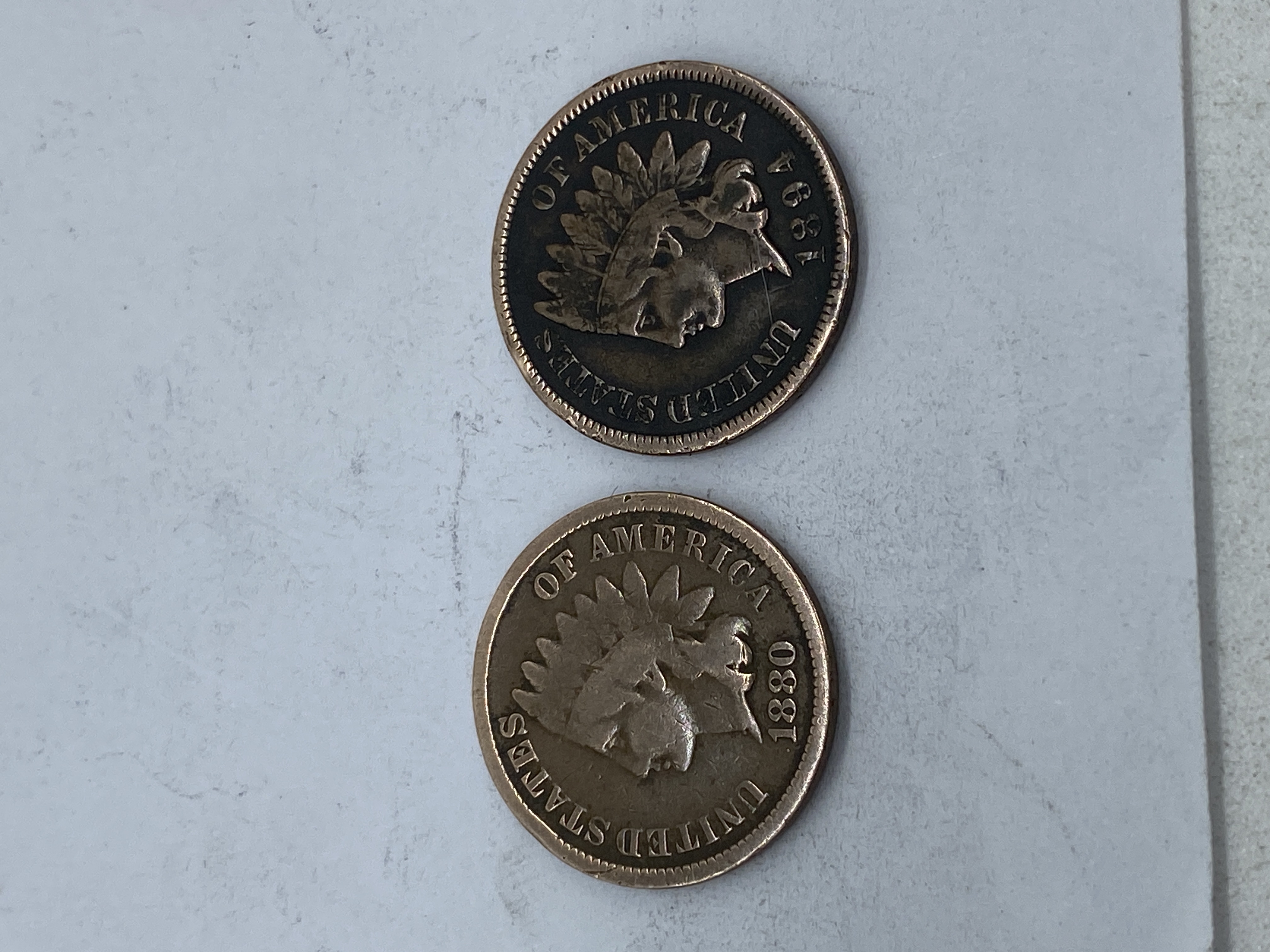 Two bronze Indian Head pennies, one 1864 and one 1881.