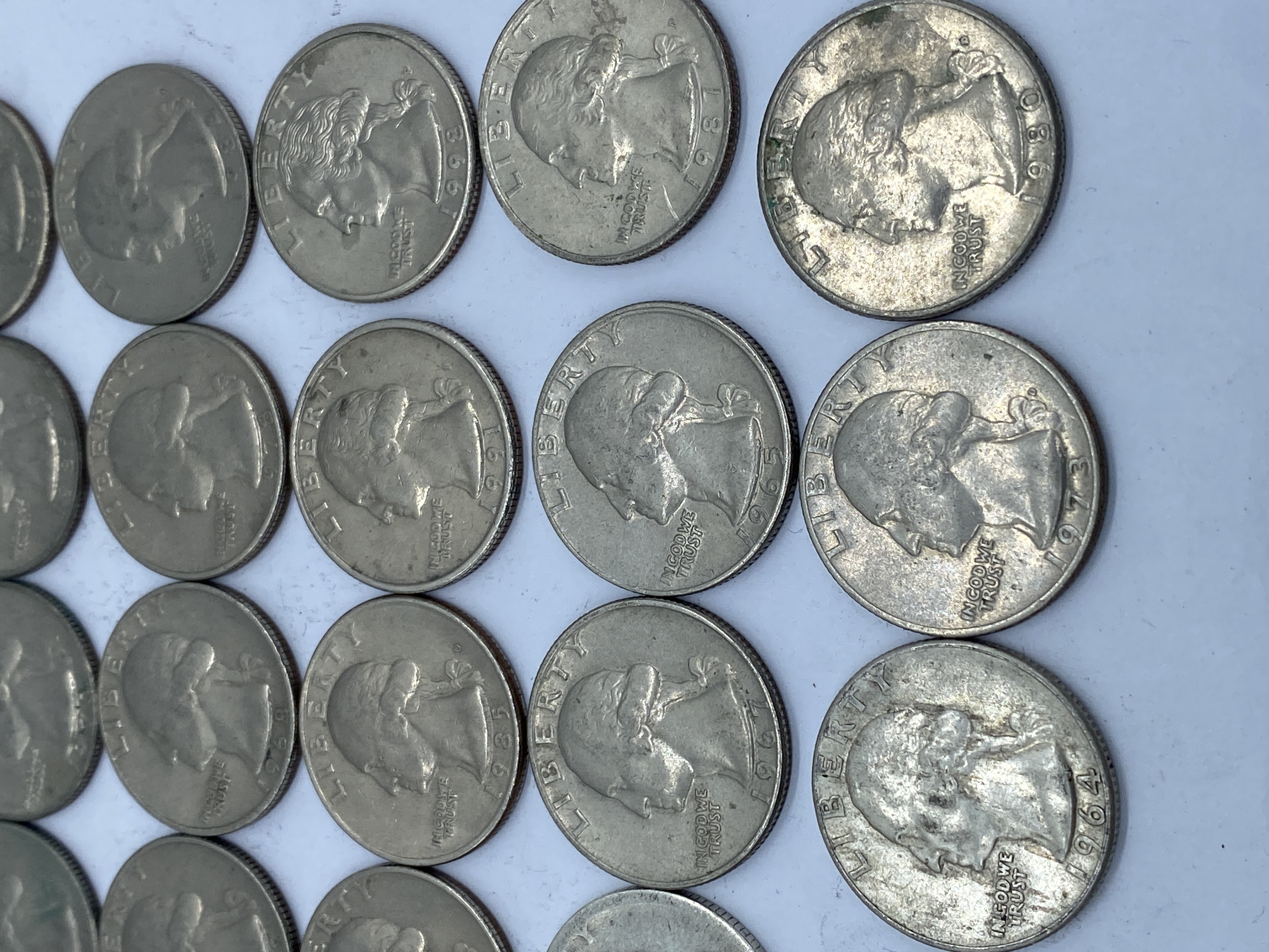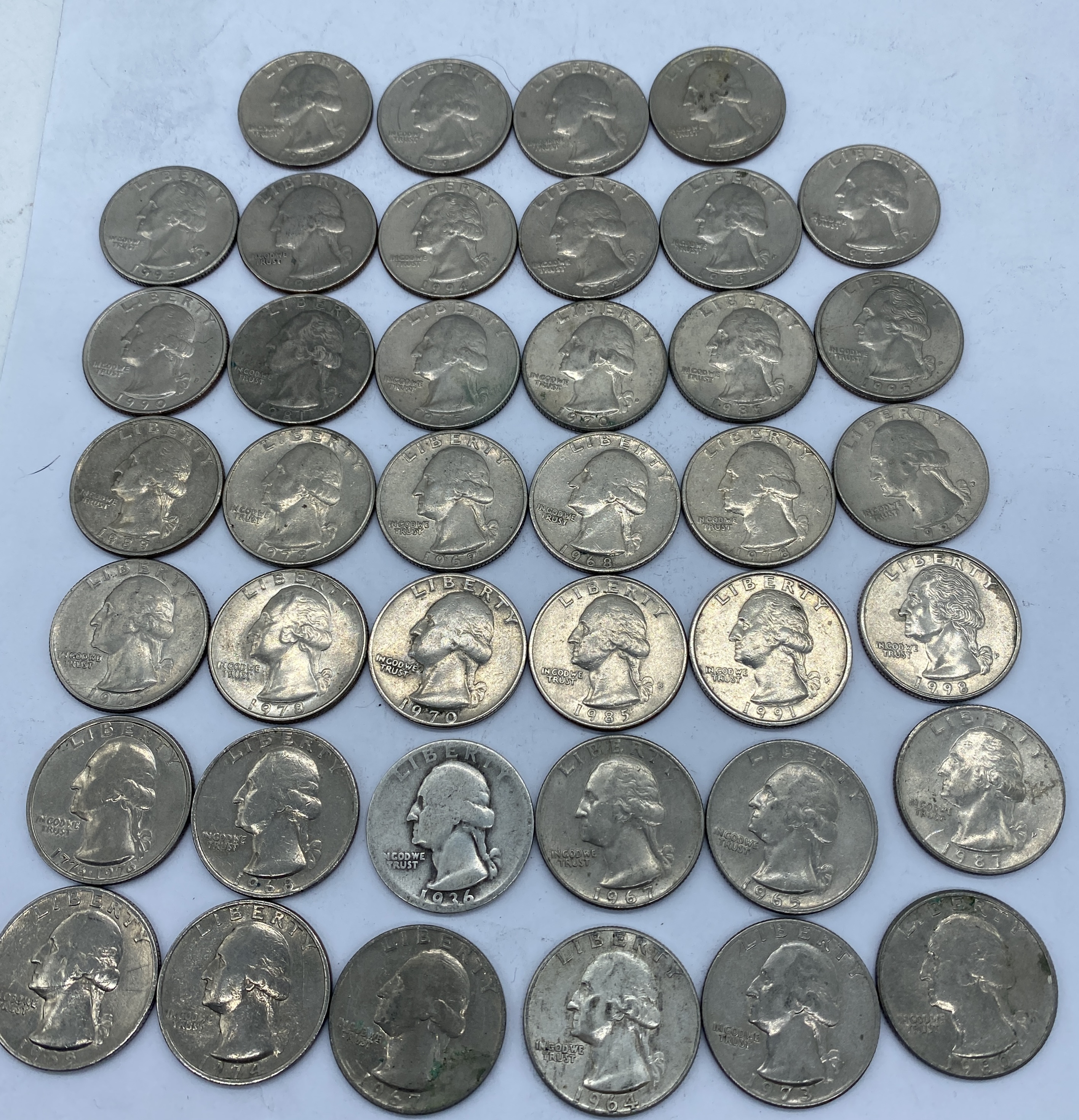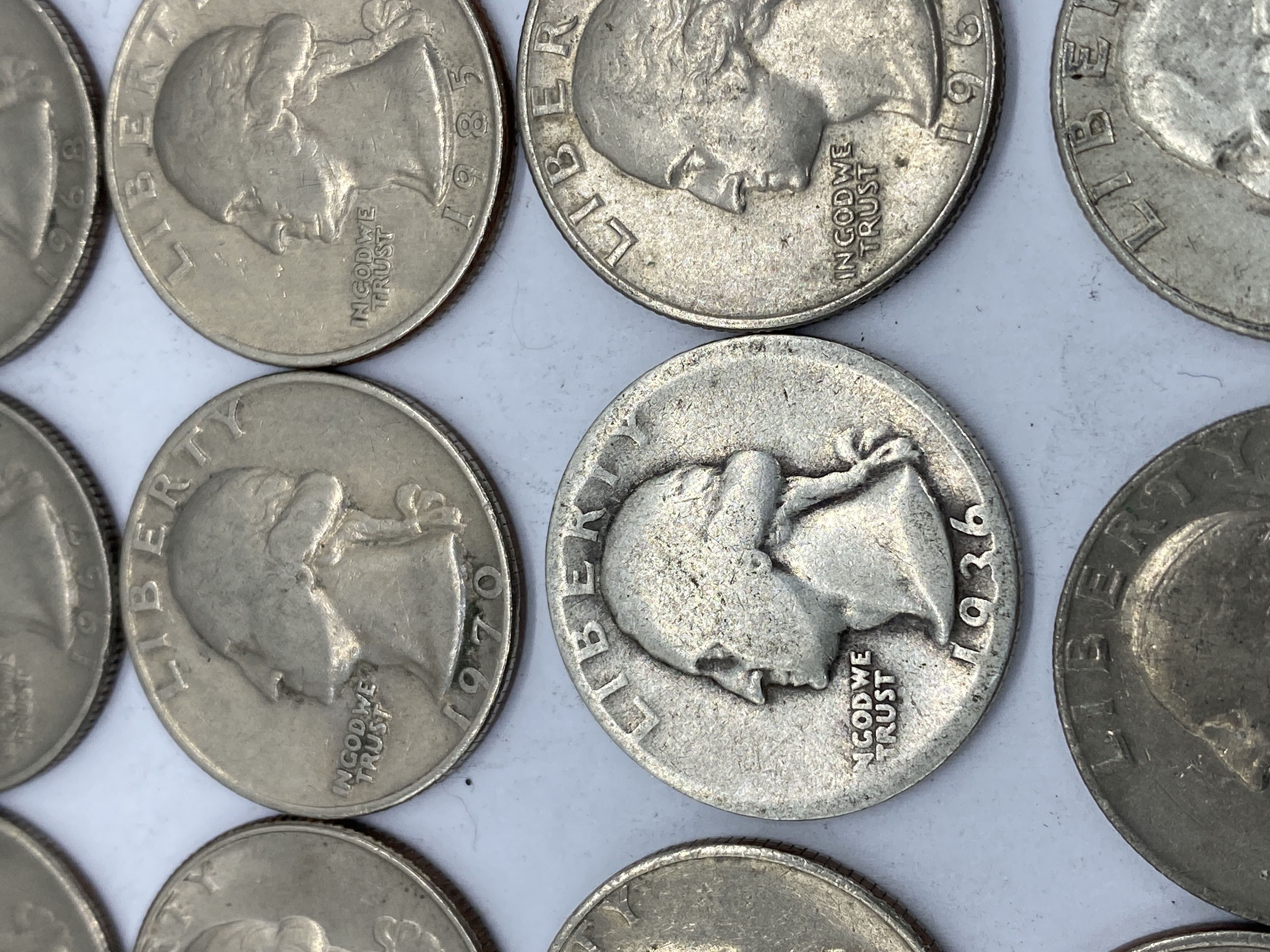 A collection of circulated silver Washington quarters of various dates.