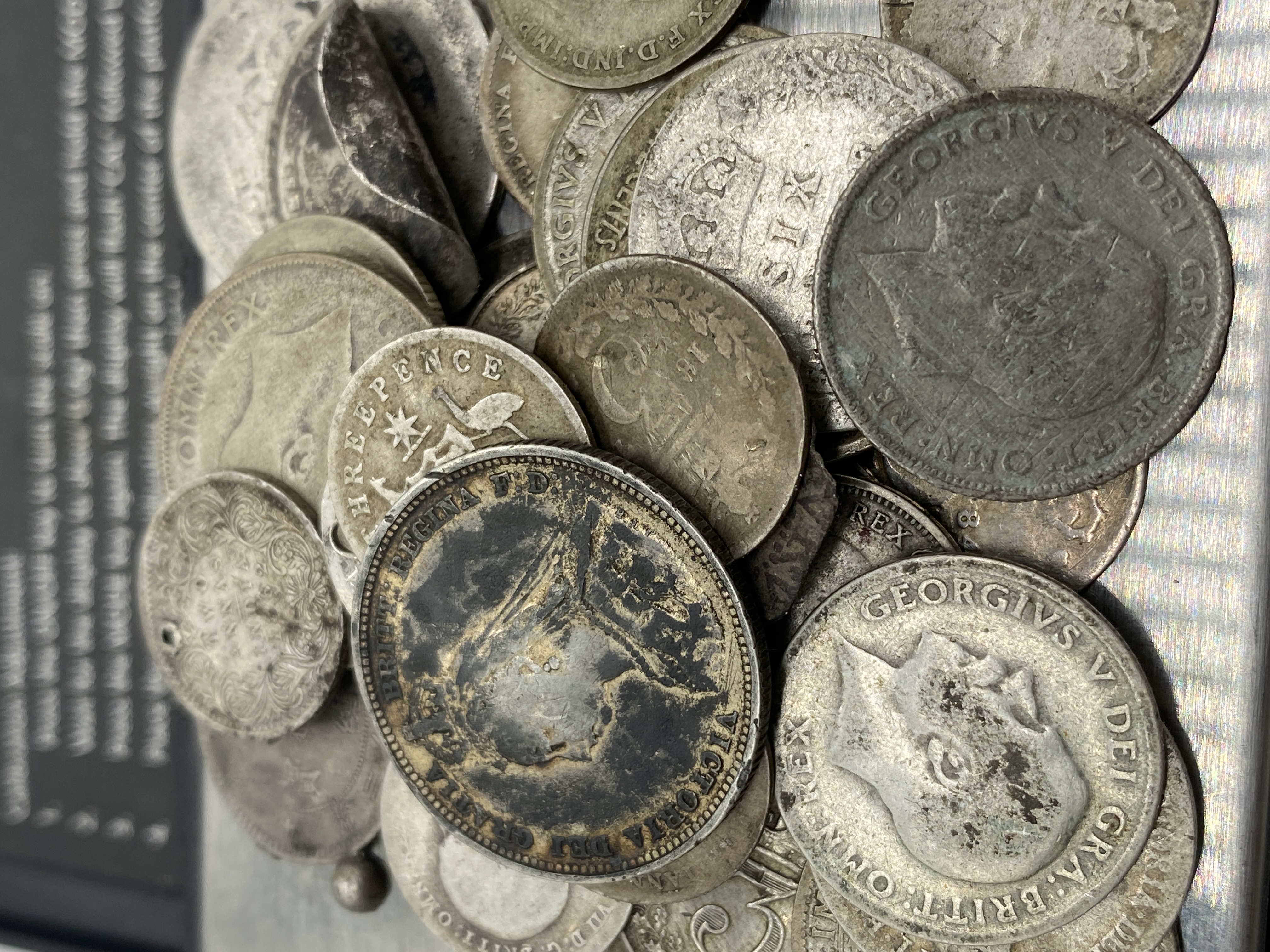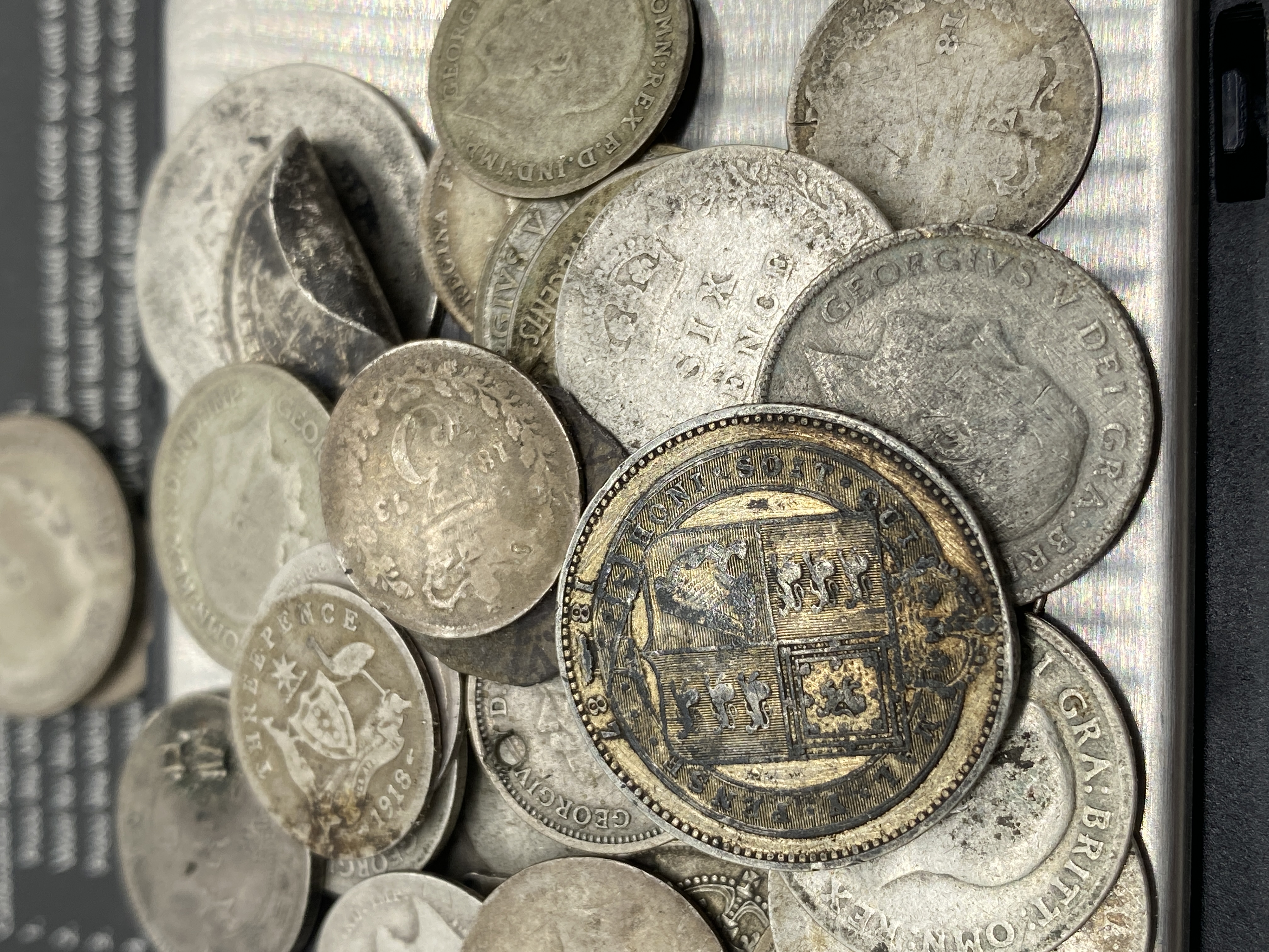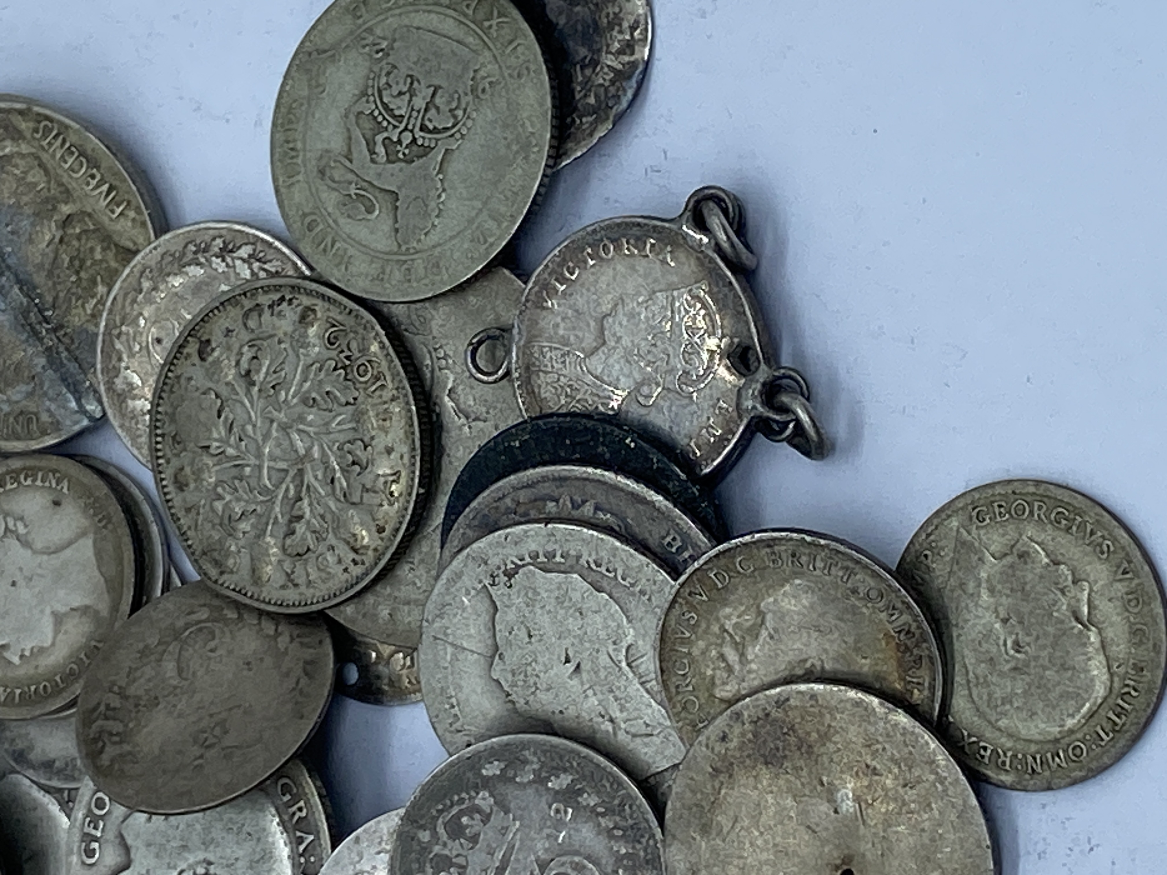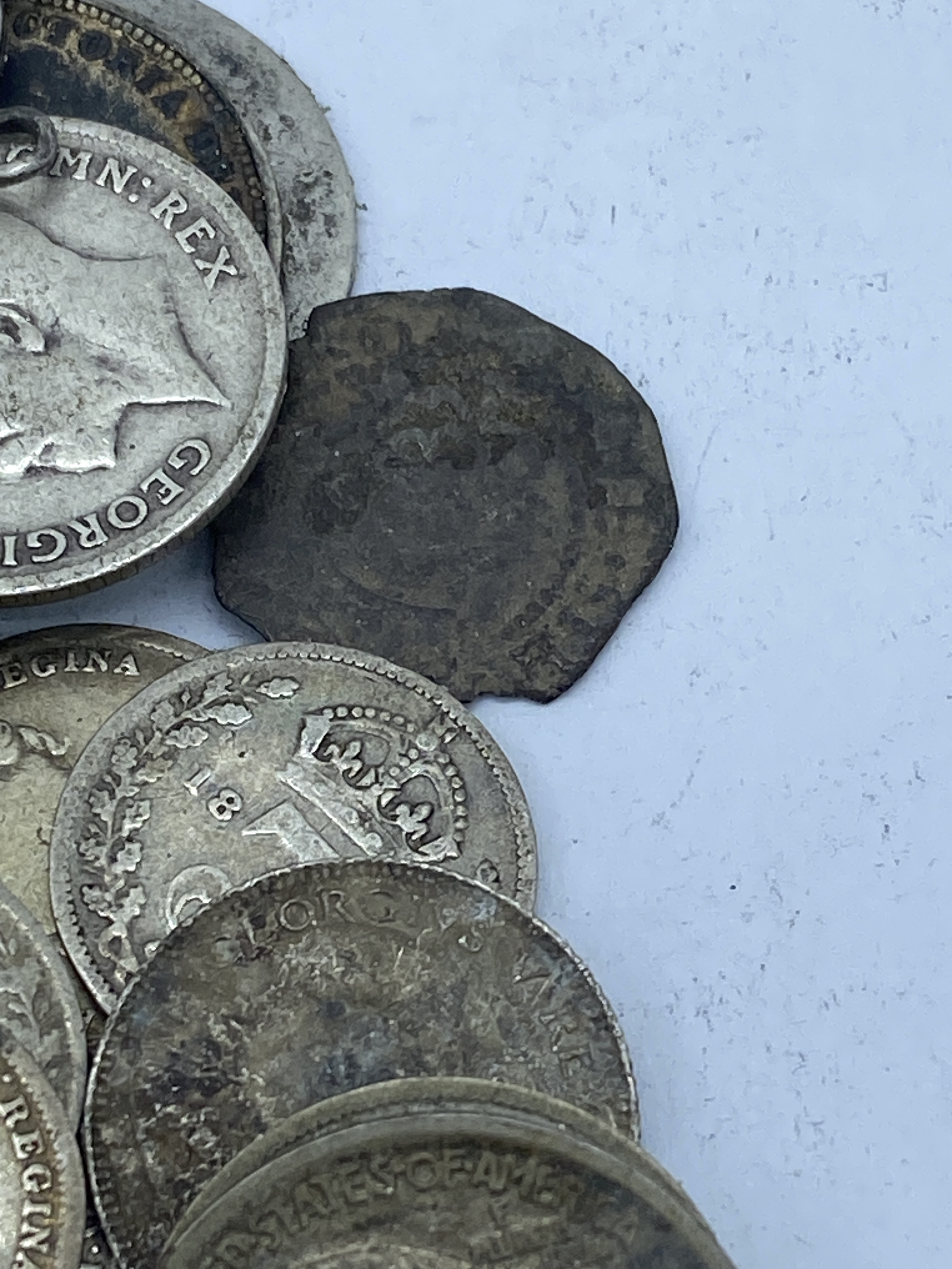 A mixed lot of various silver coins, including some that appear to be British and American.