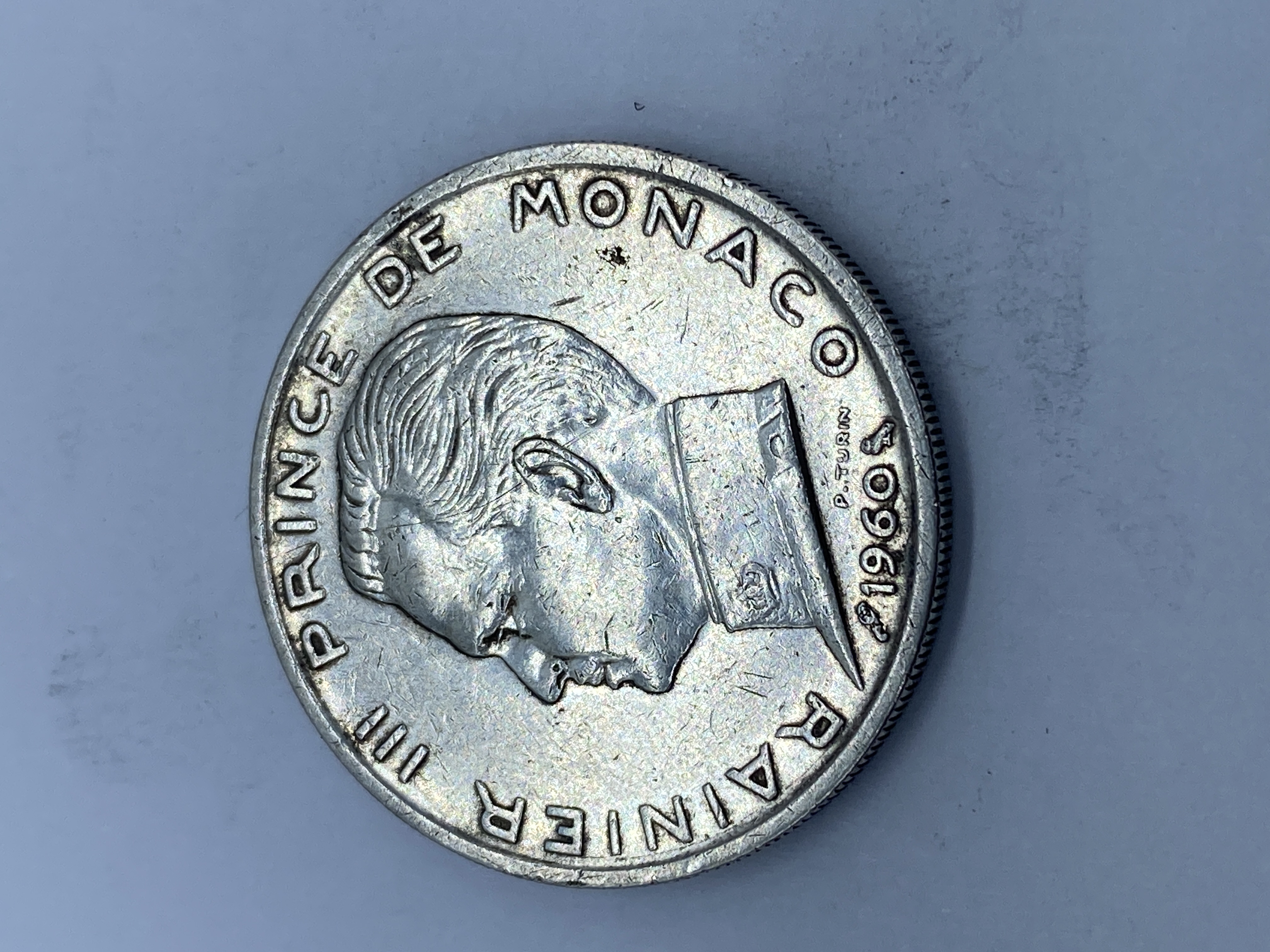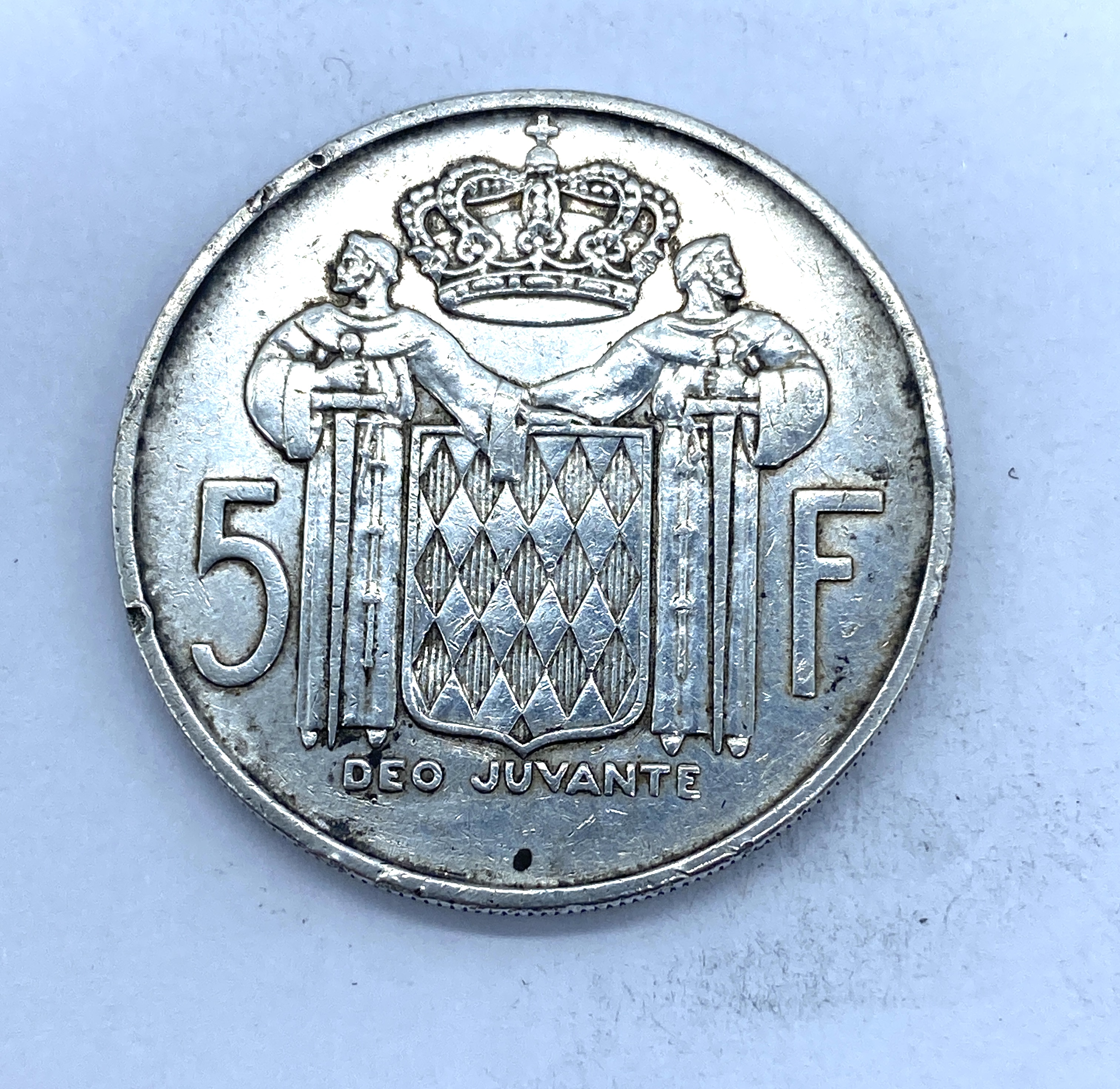 Silver Monaco 5 Francs coin featuring Rainier III, dated 1960.