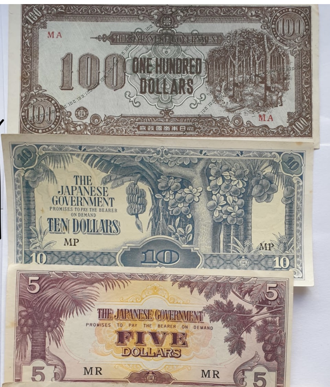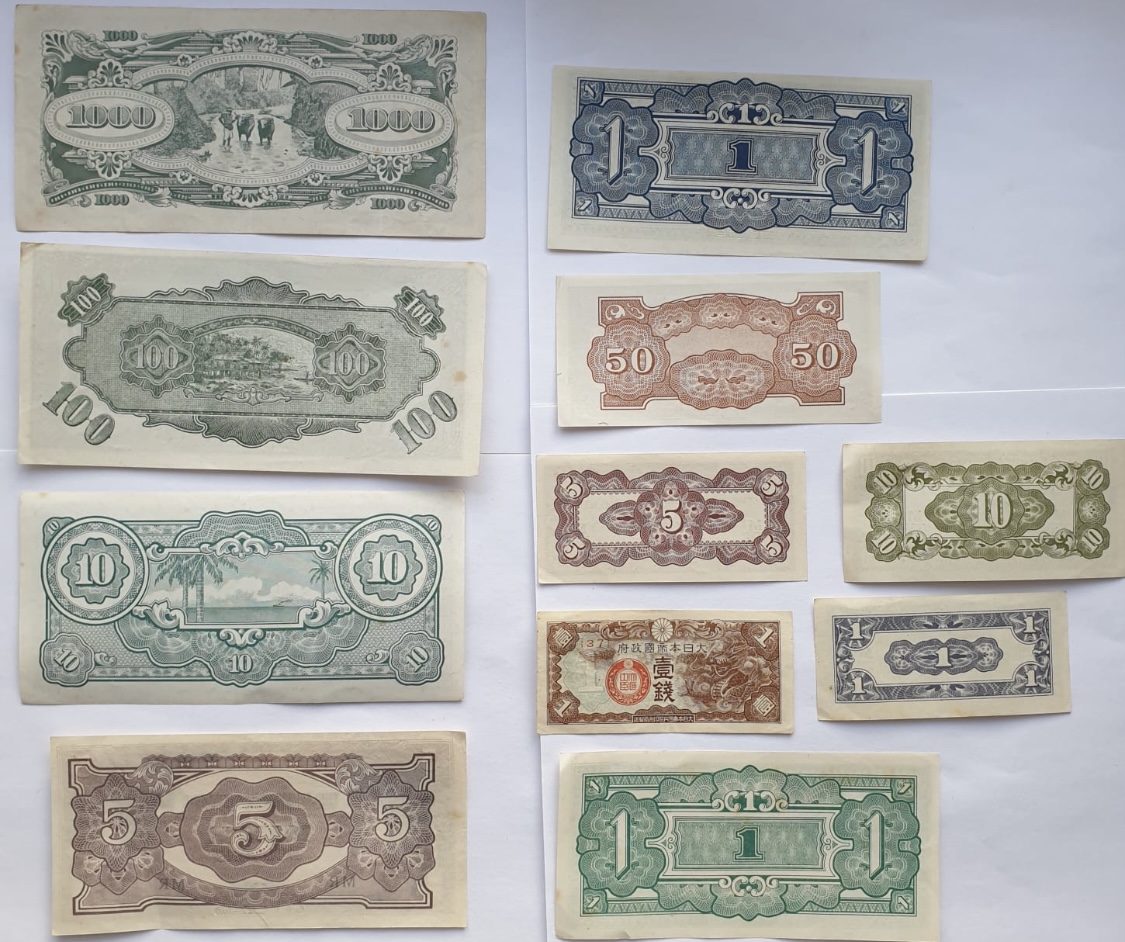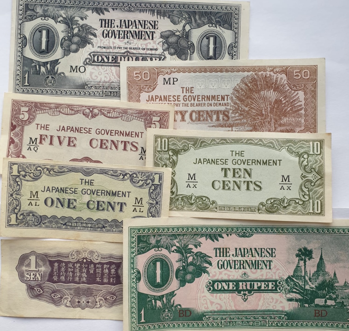 A collection of assorted Japanese occupation banknotes, including various denominations and territories.