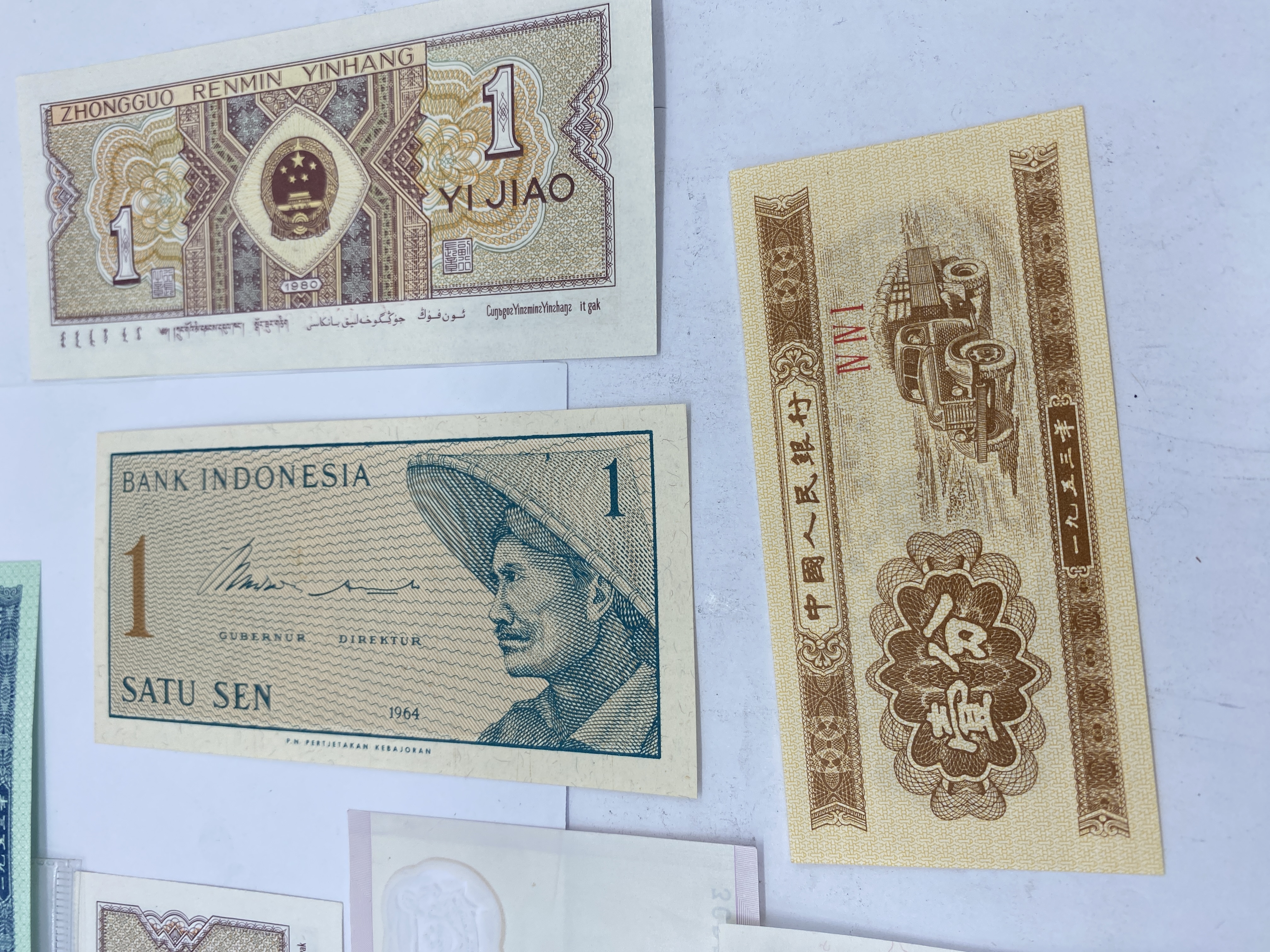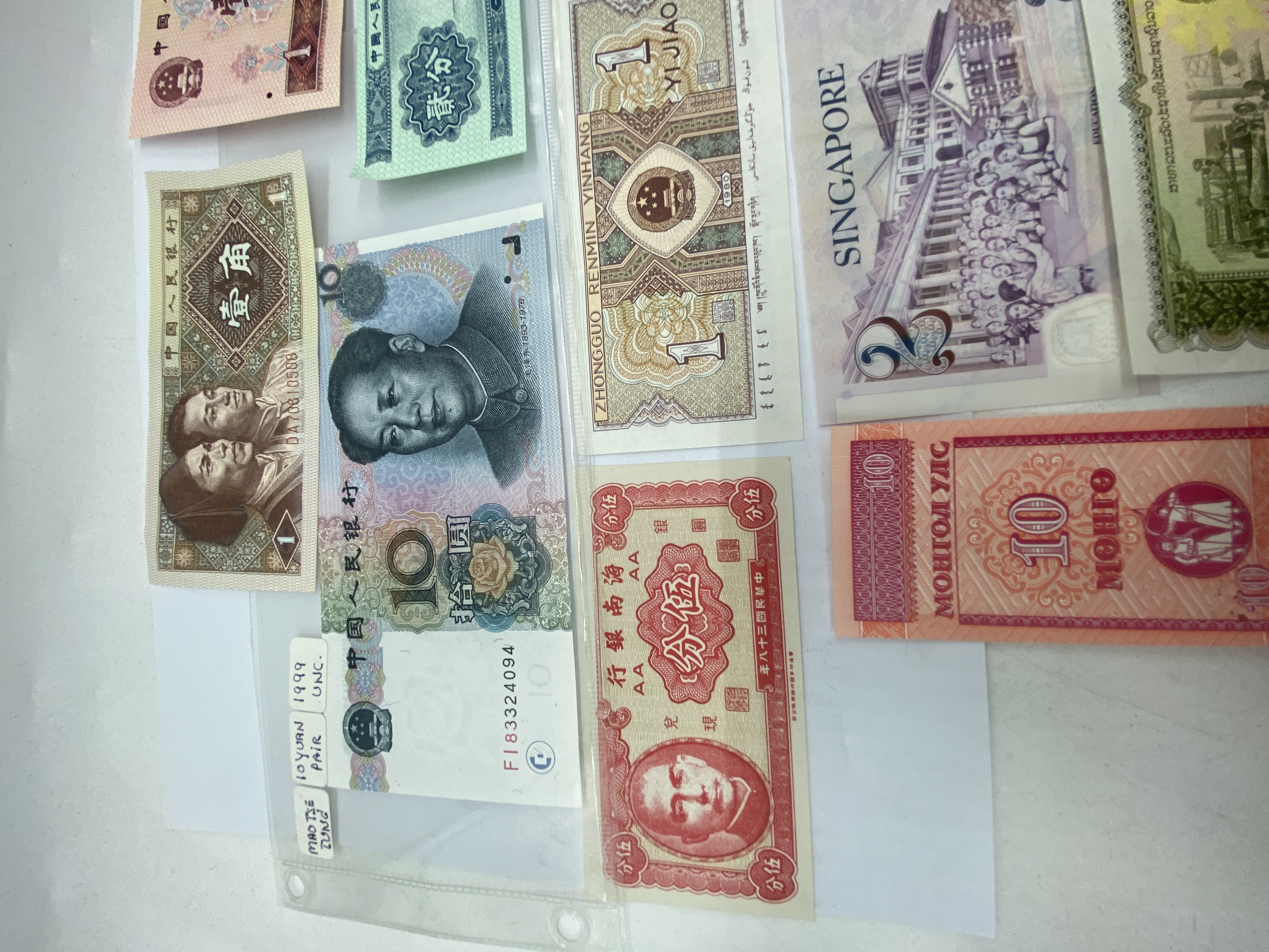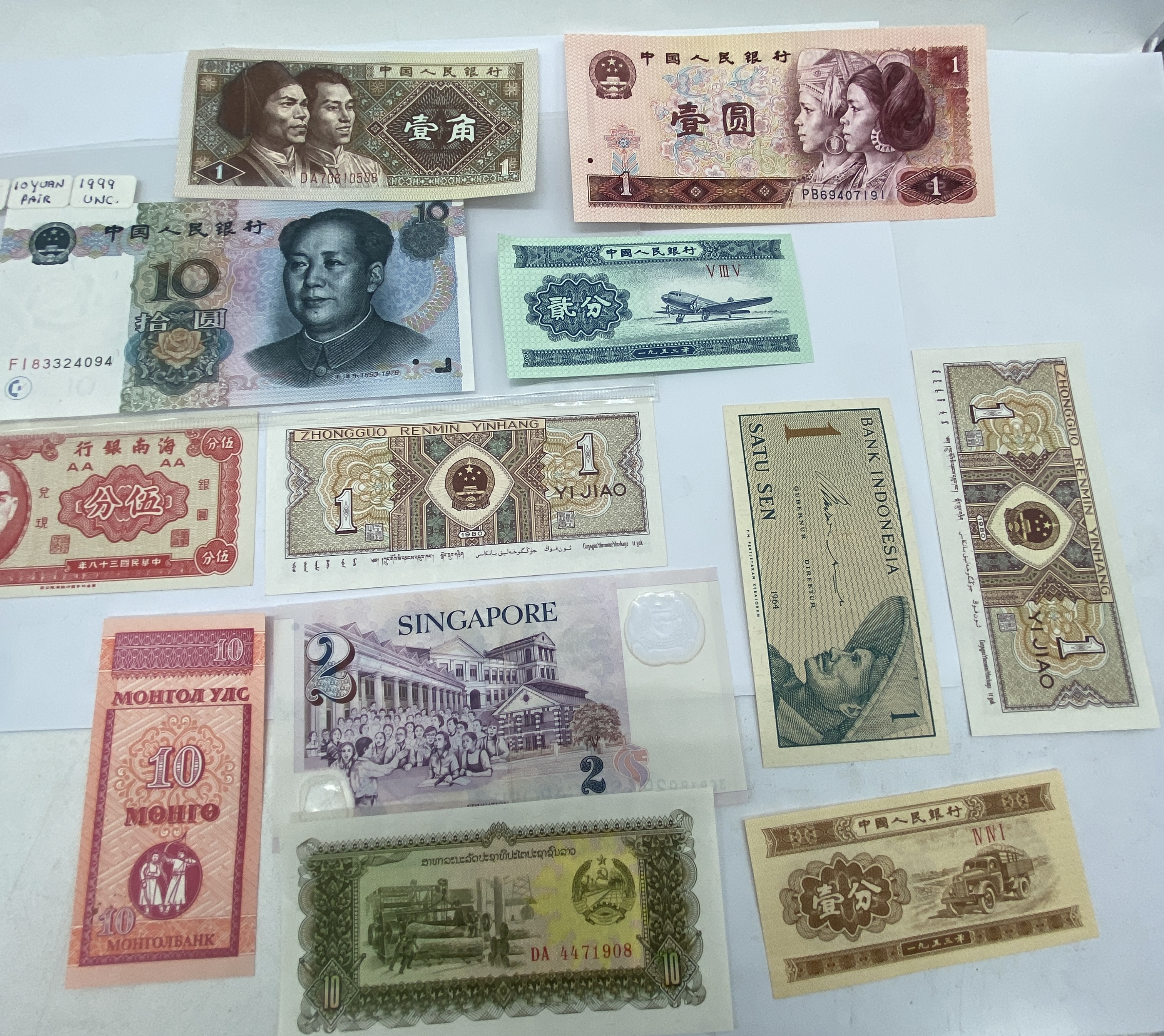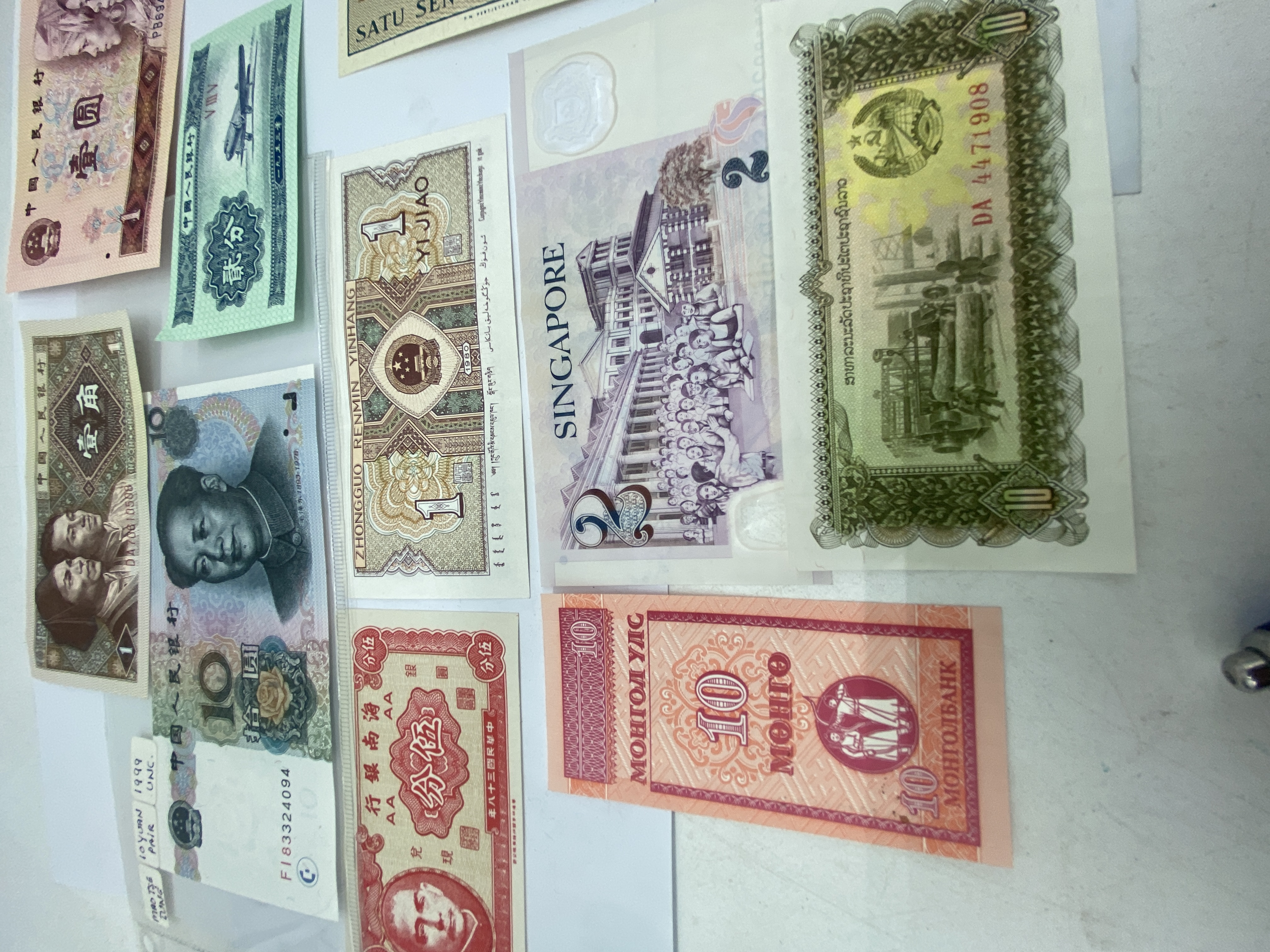 A collection of various Asian banknotes including Chinese, Indonesian, Singaporean, and Mongolian.