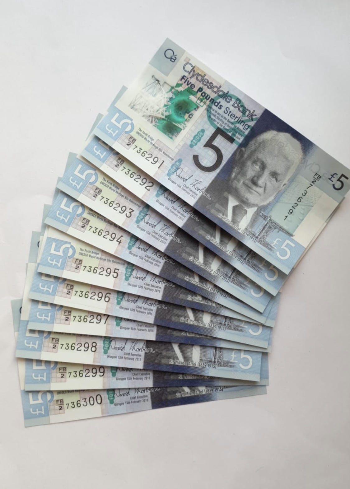 Ten consecutive uncirculated Clydesdale Bank £5 polymer banknotes from 2015 featuring the Forth Bridge.