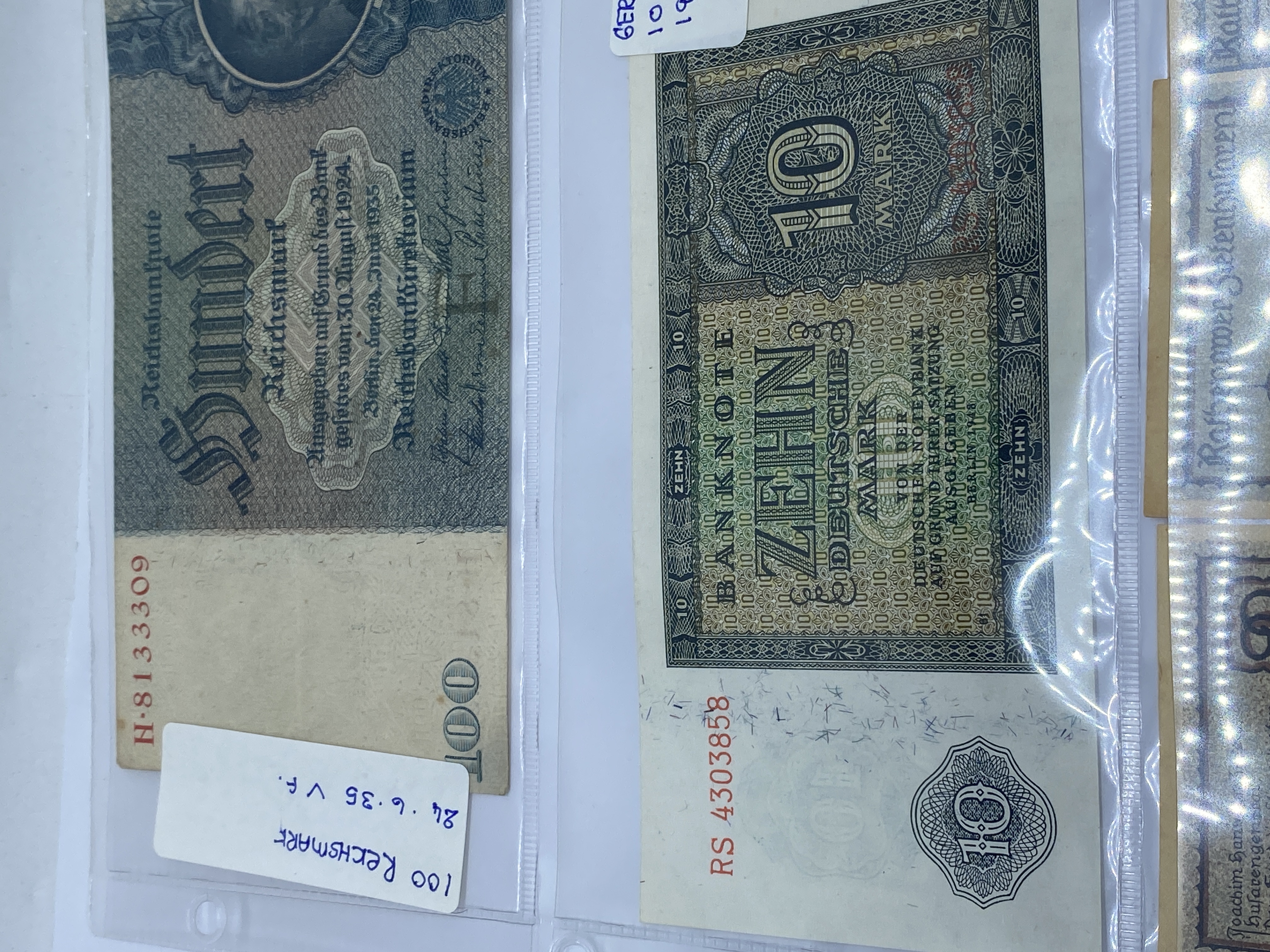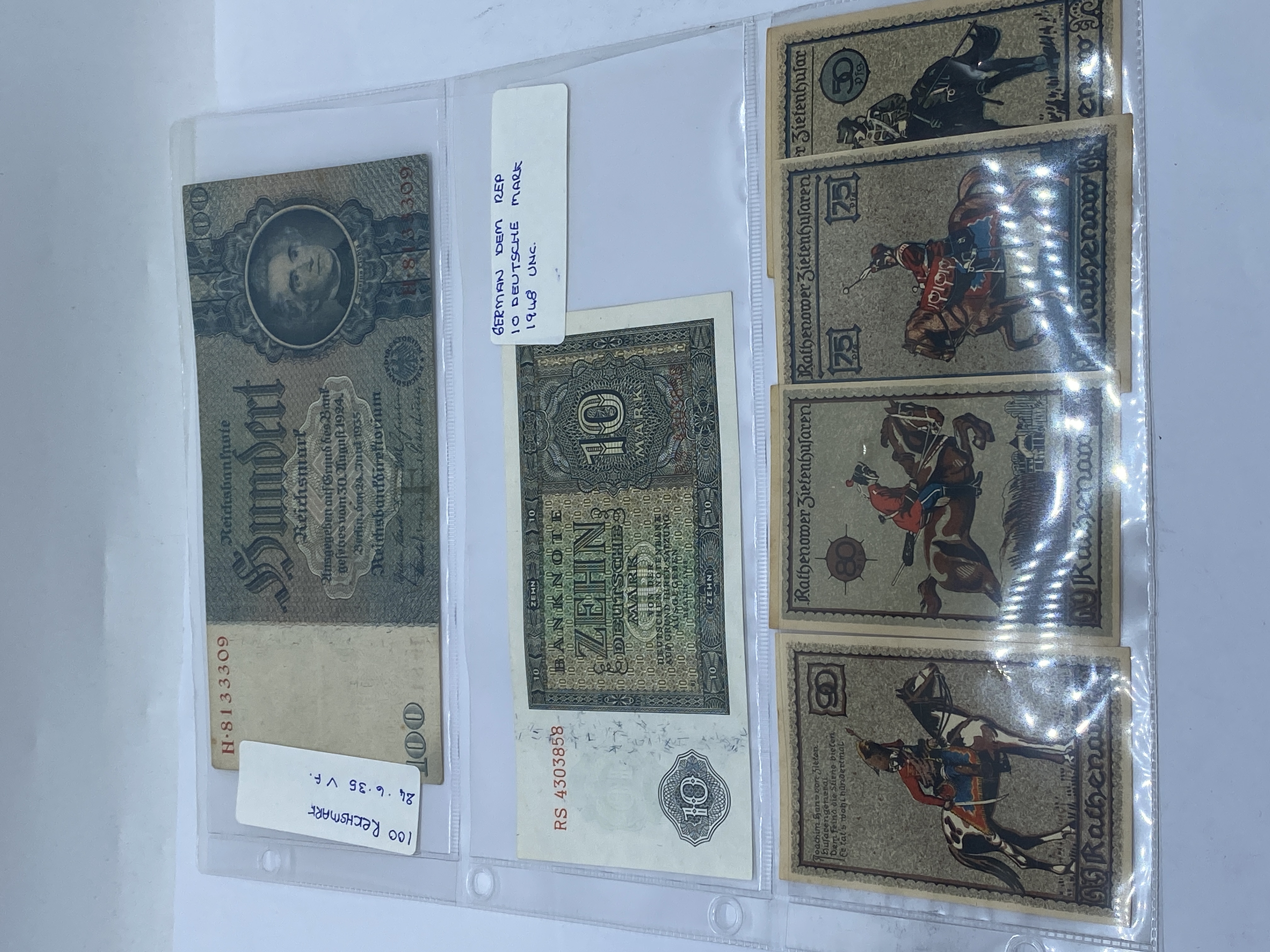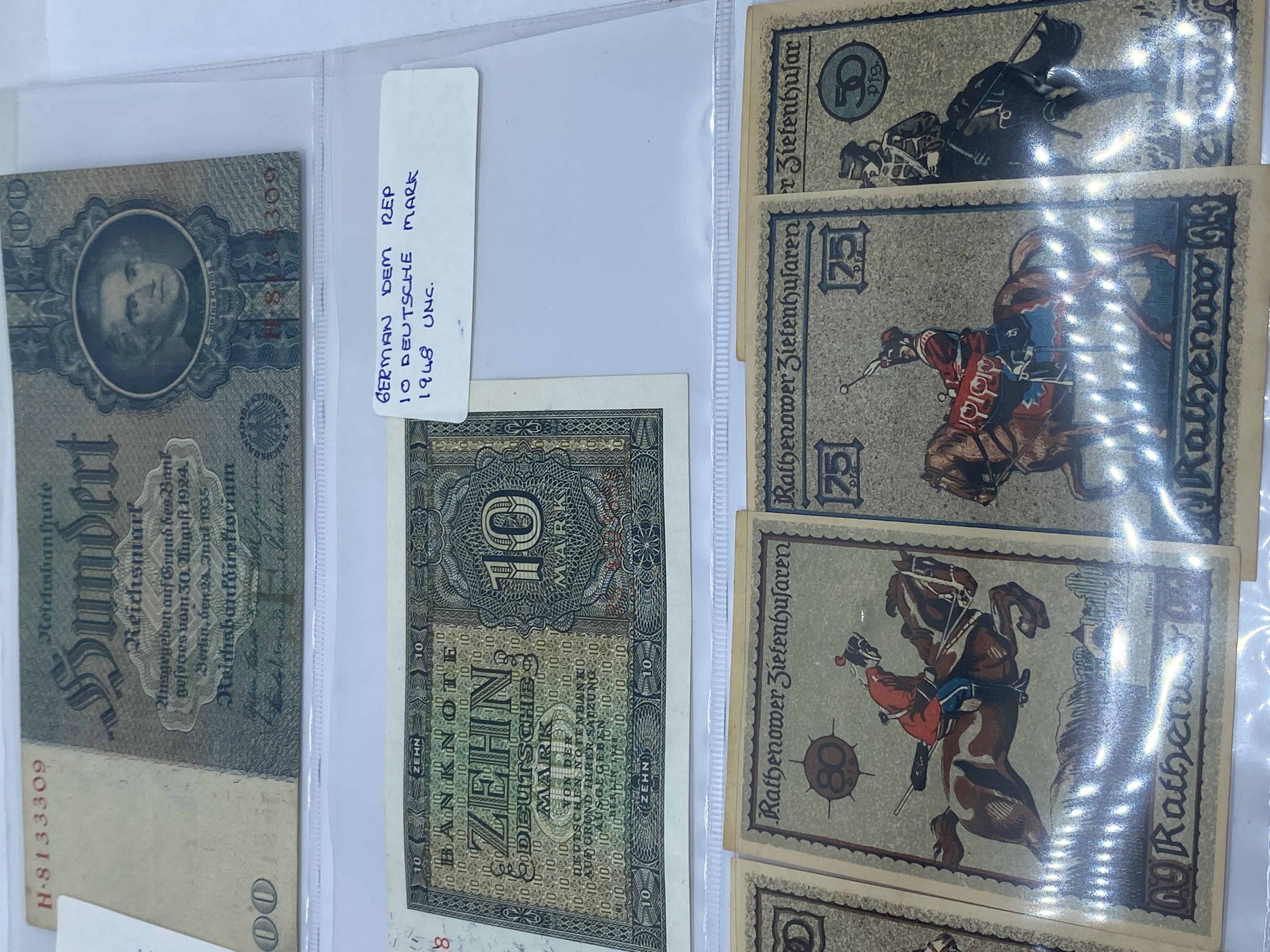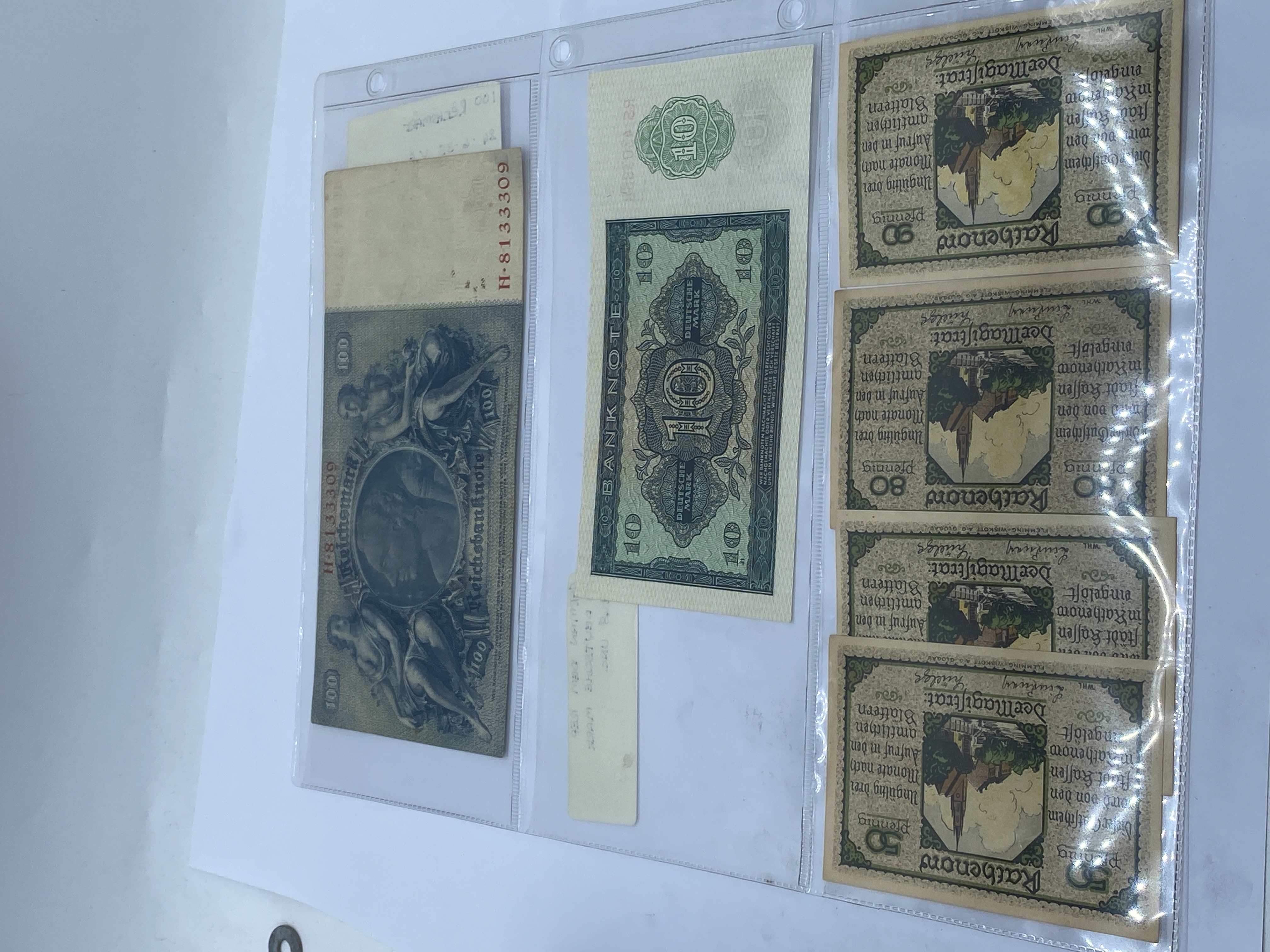 A collection of German banknotes of various denominations and ages.