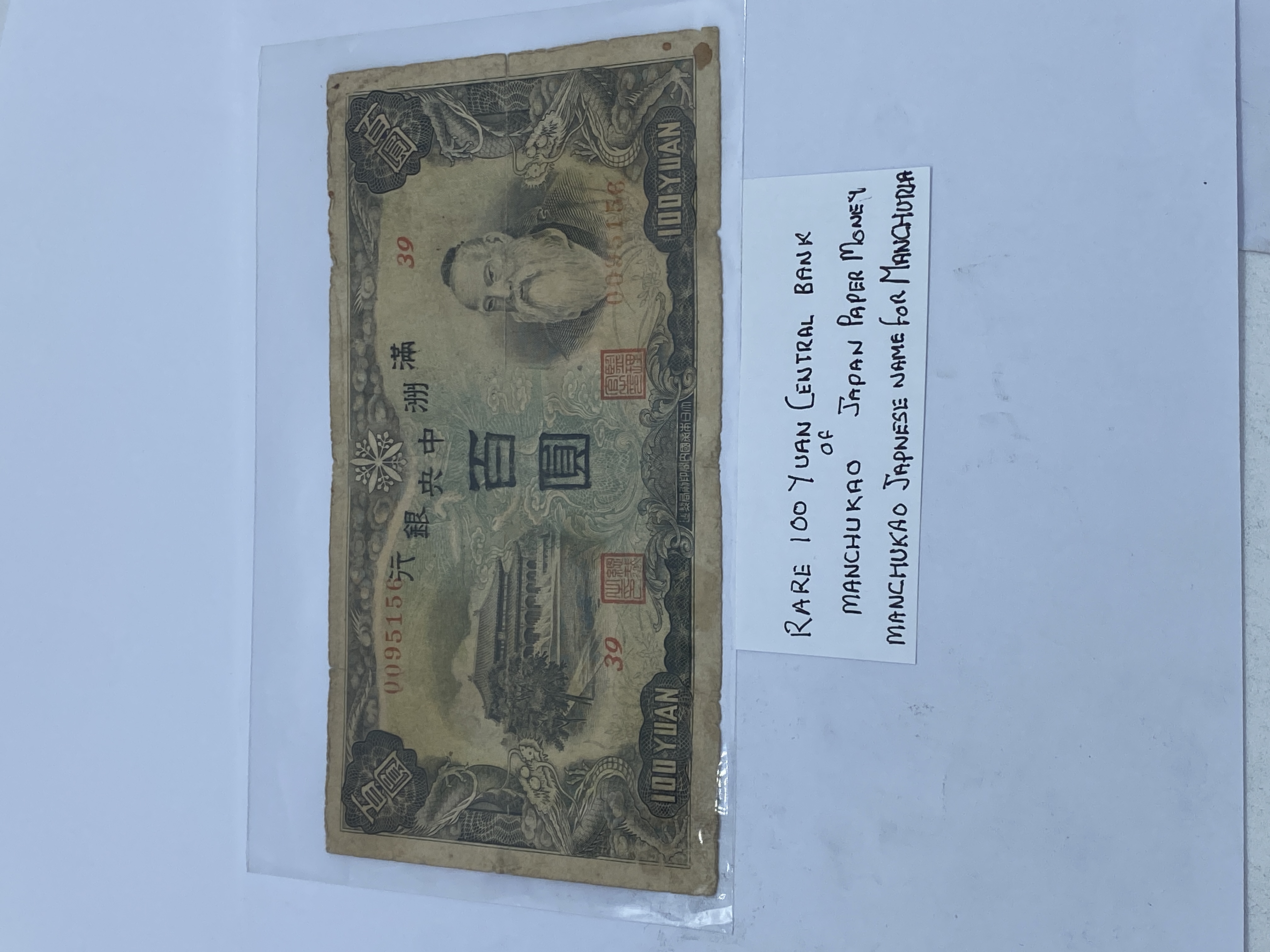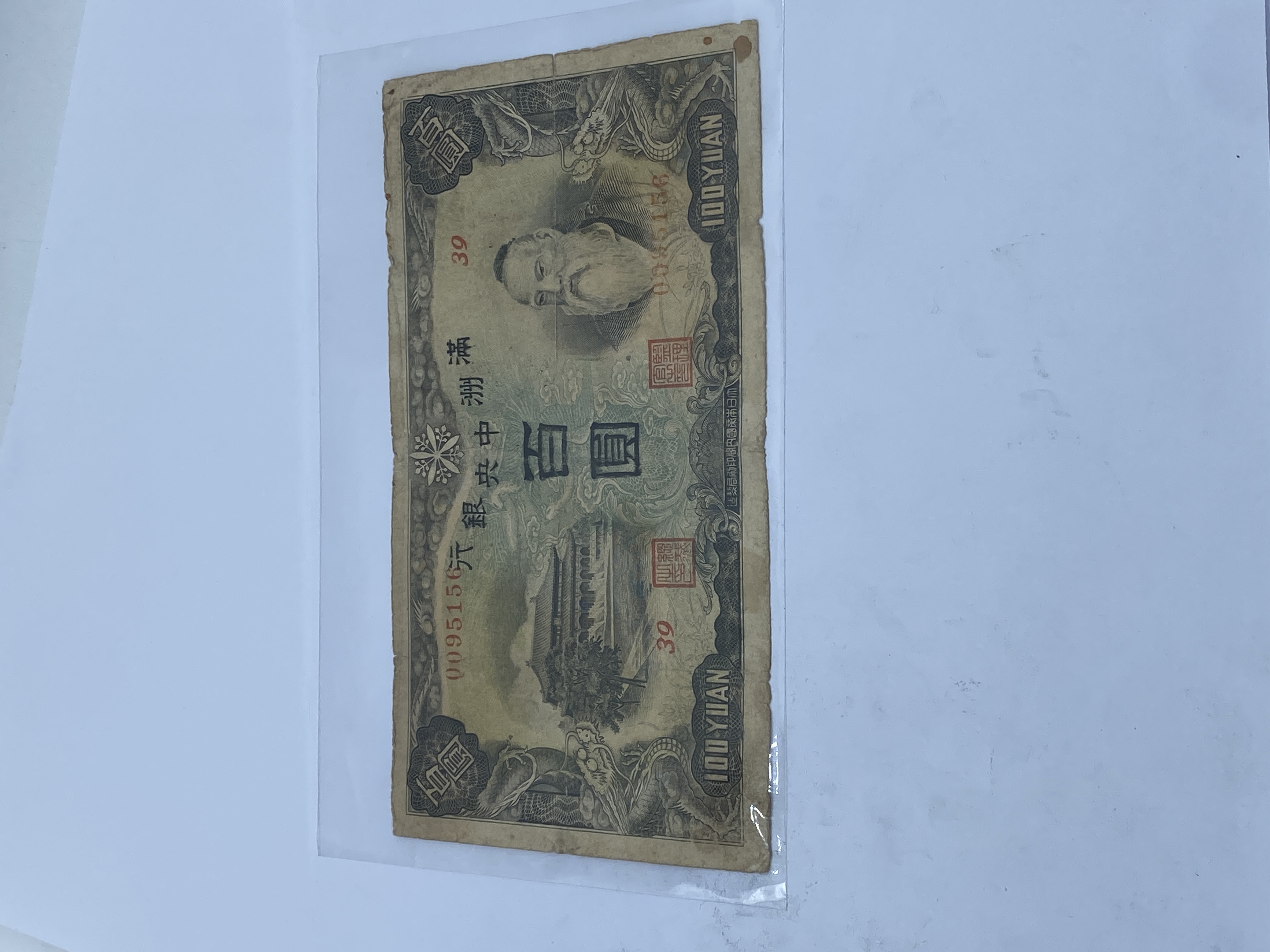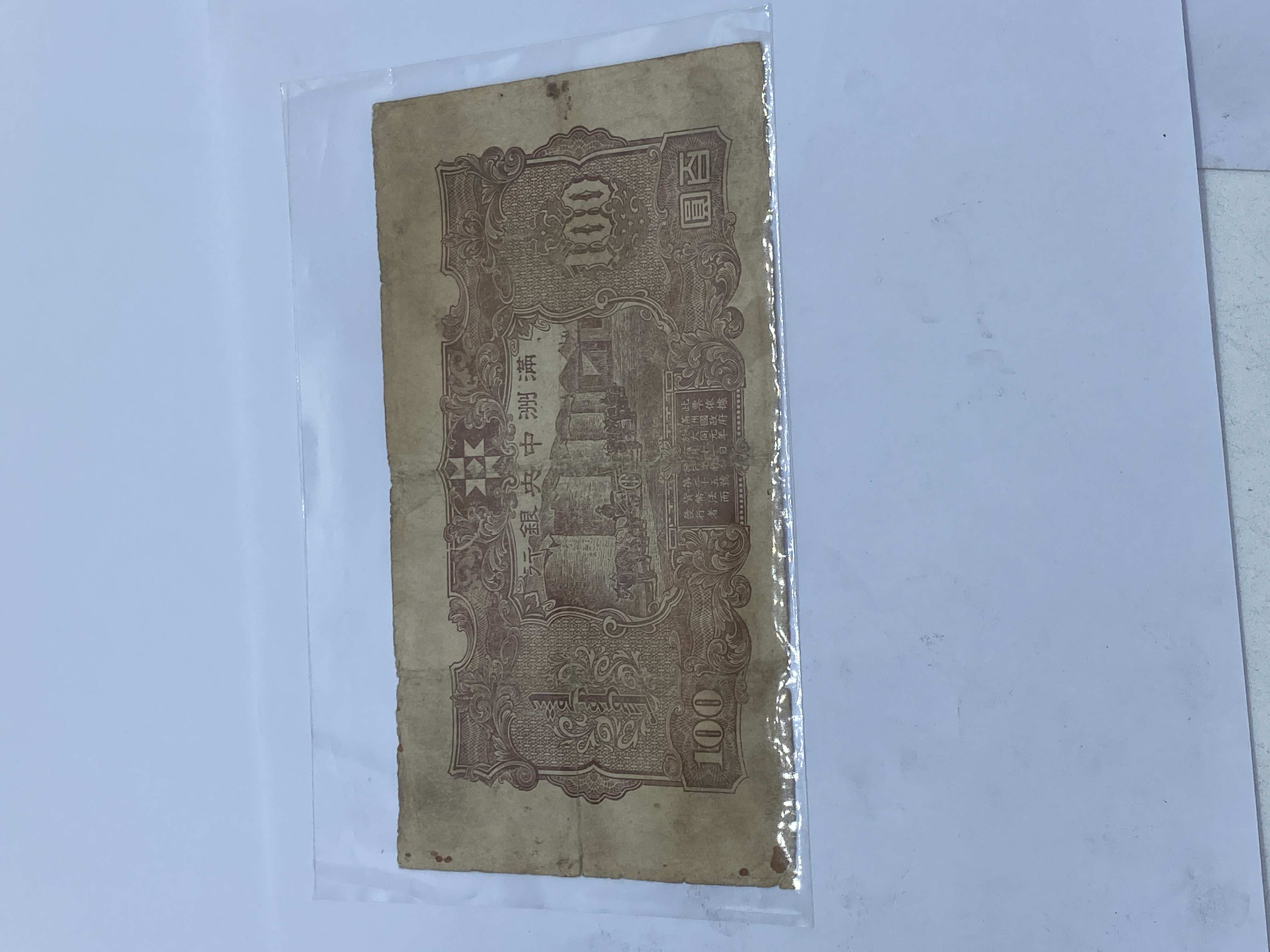 A brown and black Manchukuo 100 Yuan banknote.