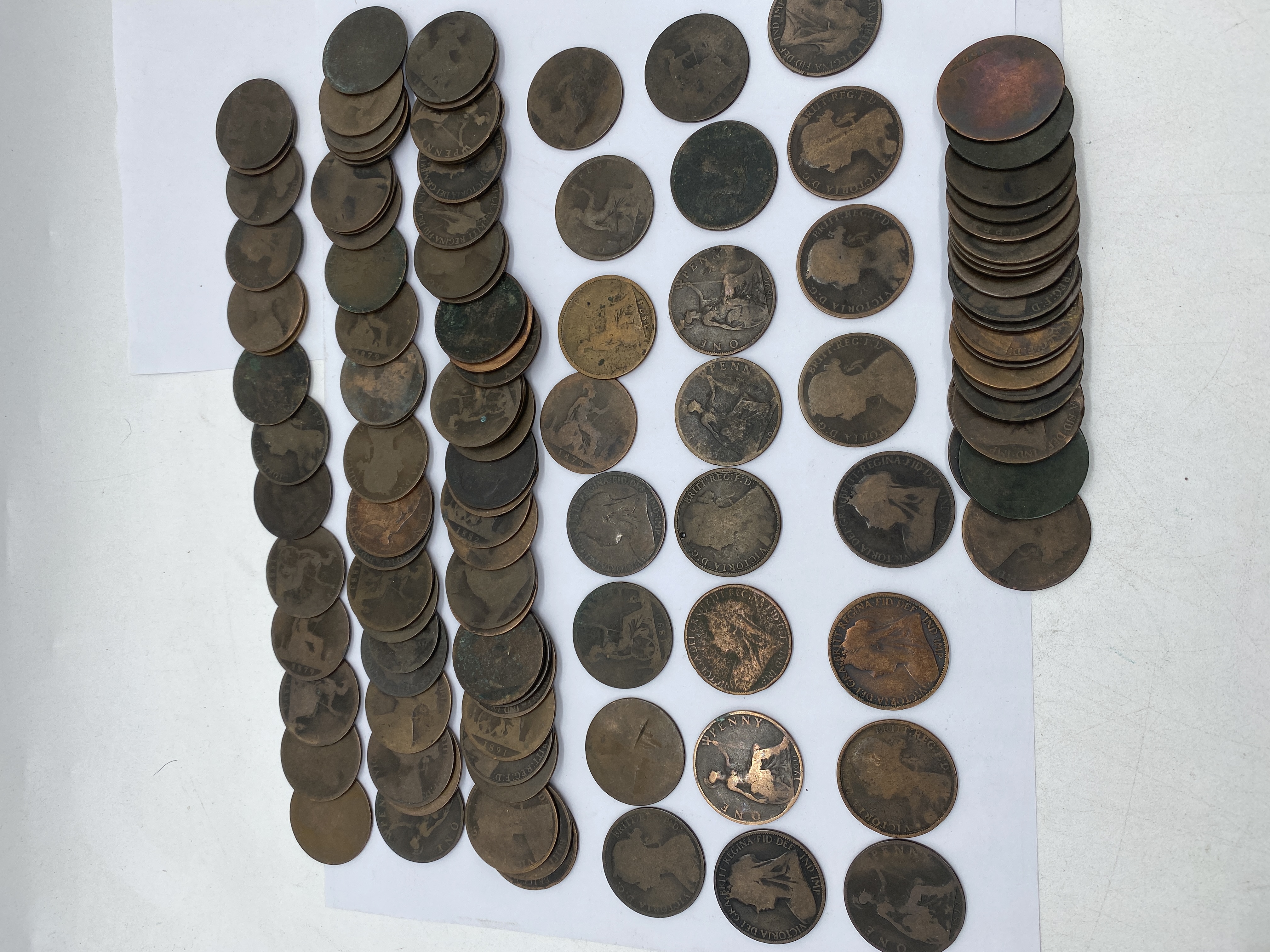 A collection of bronze British coins, including pennies and half pennies, from various years.