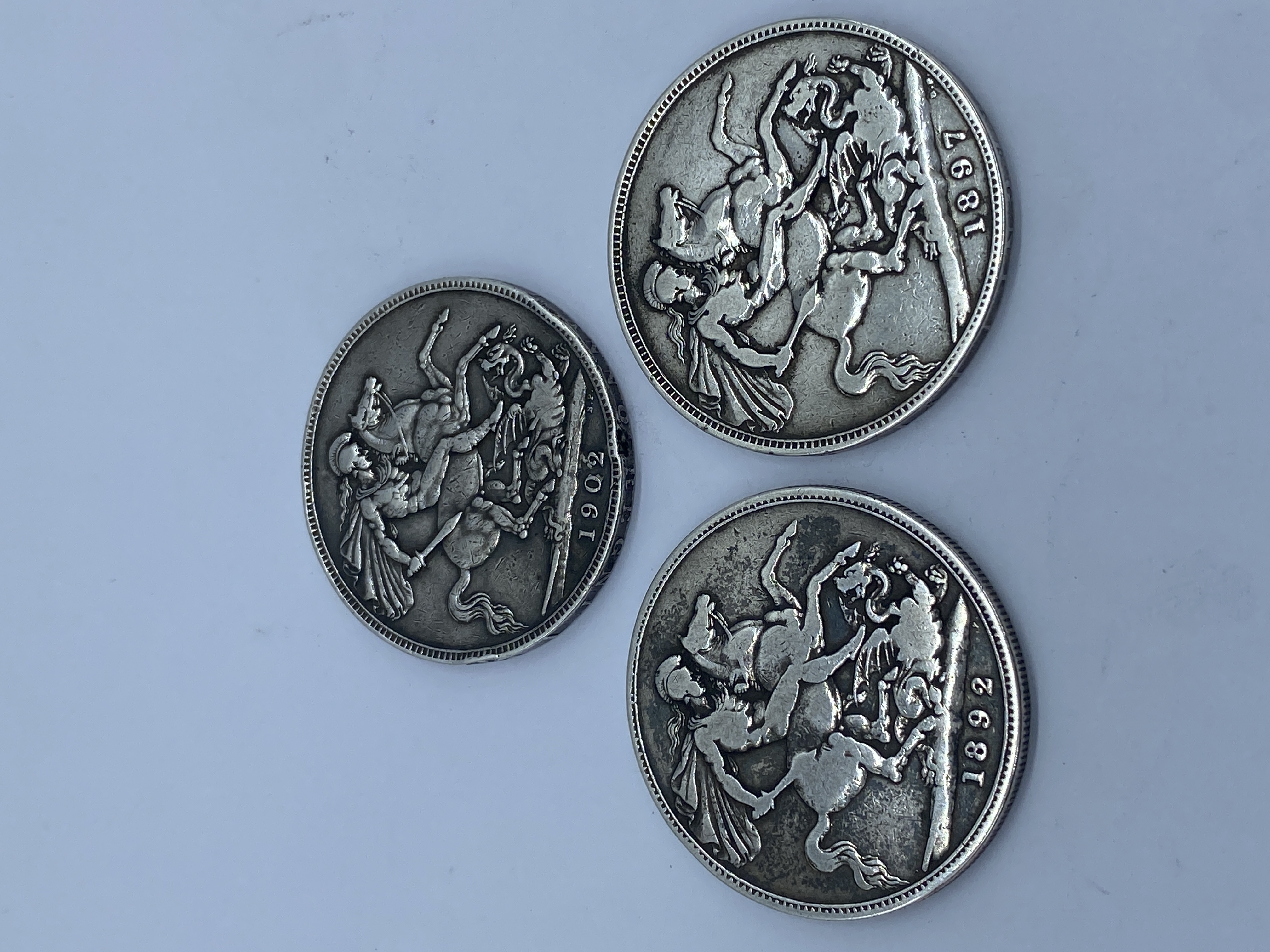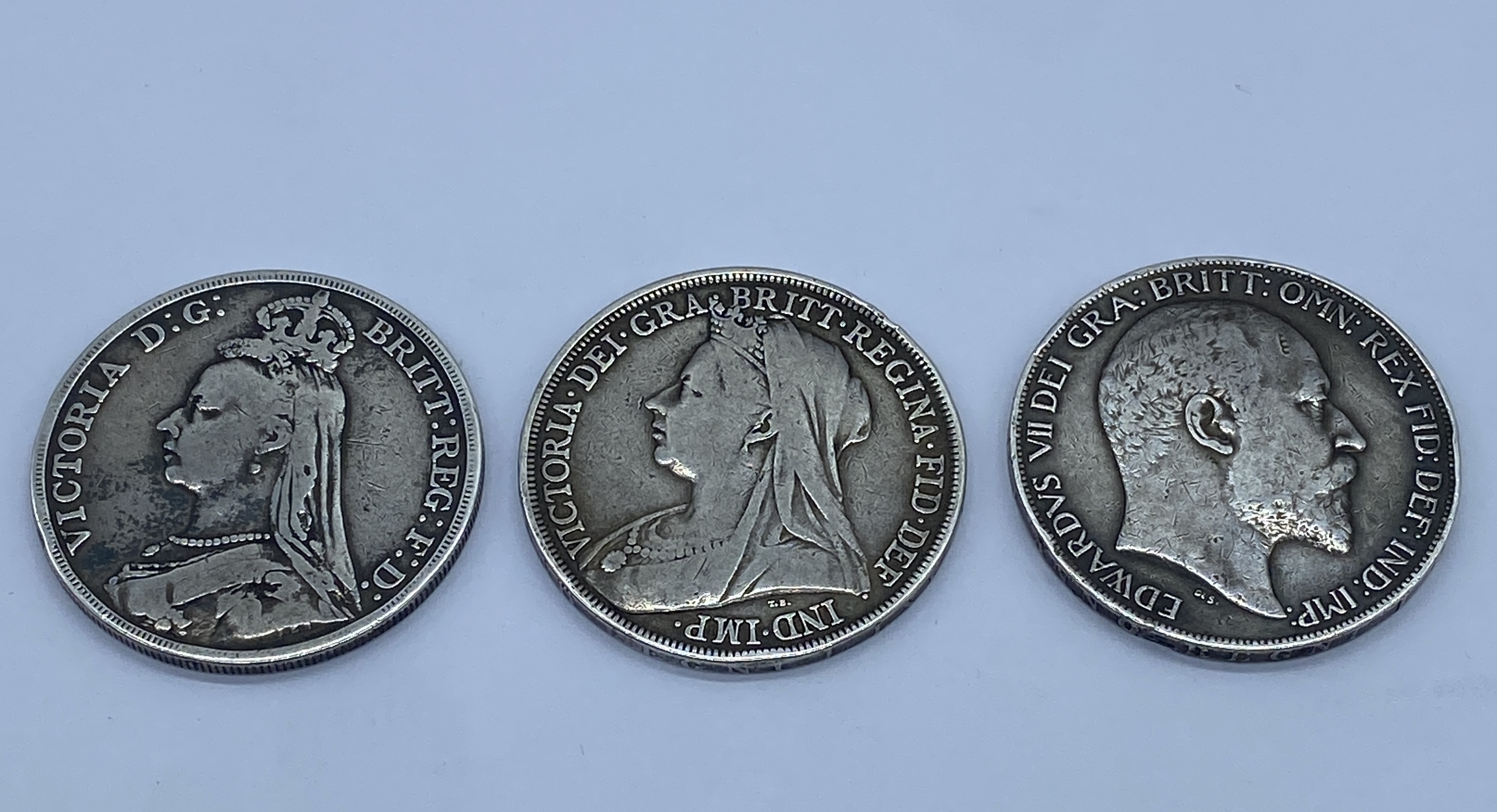 Three silver British coins, two featuring Queen Victoria (1892, 1901) and one Edward VII (1897).