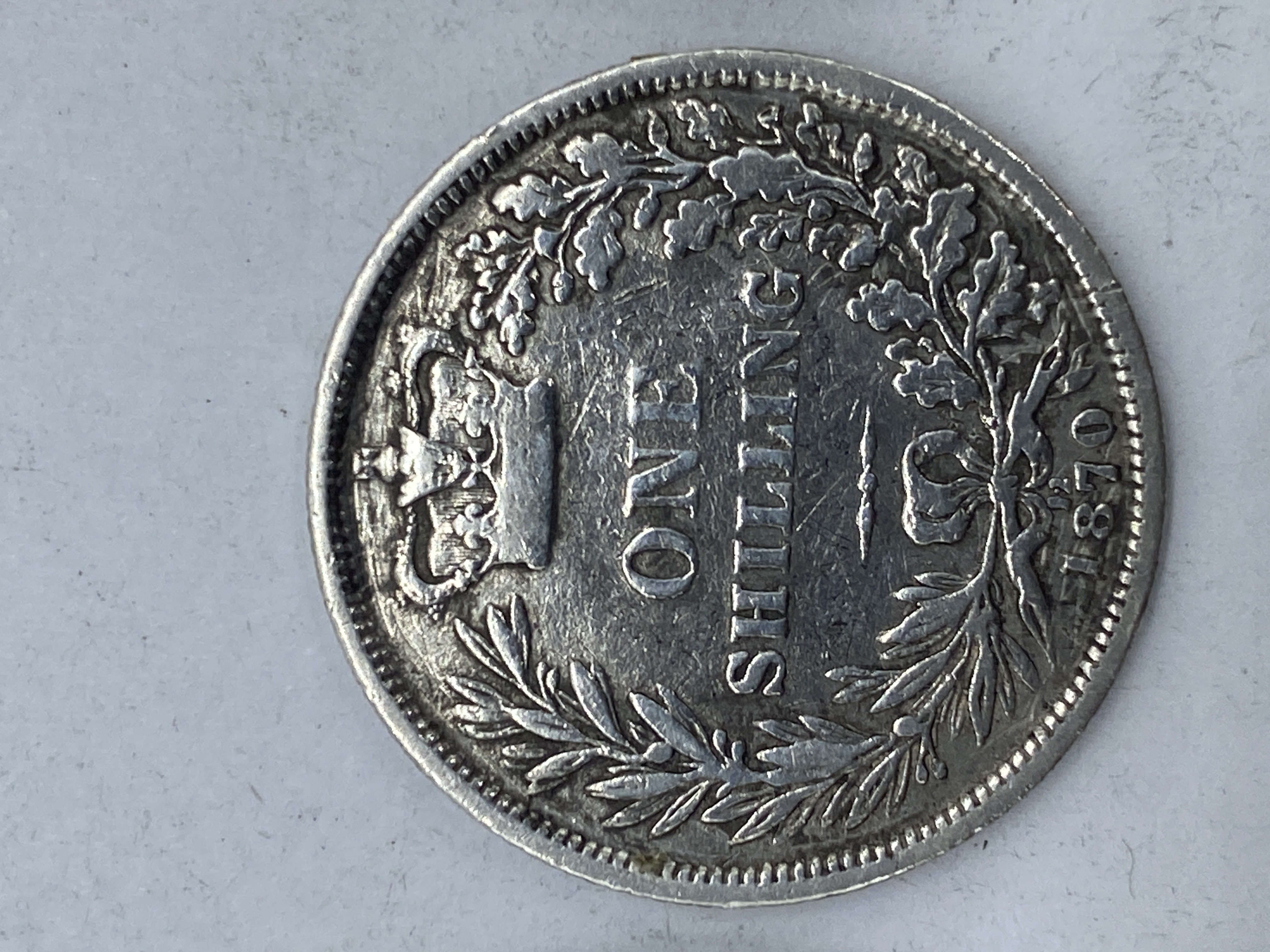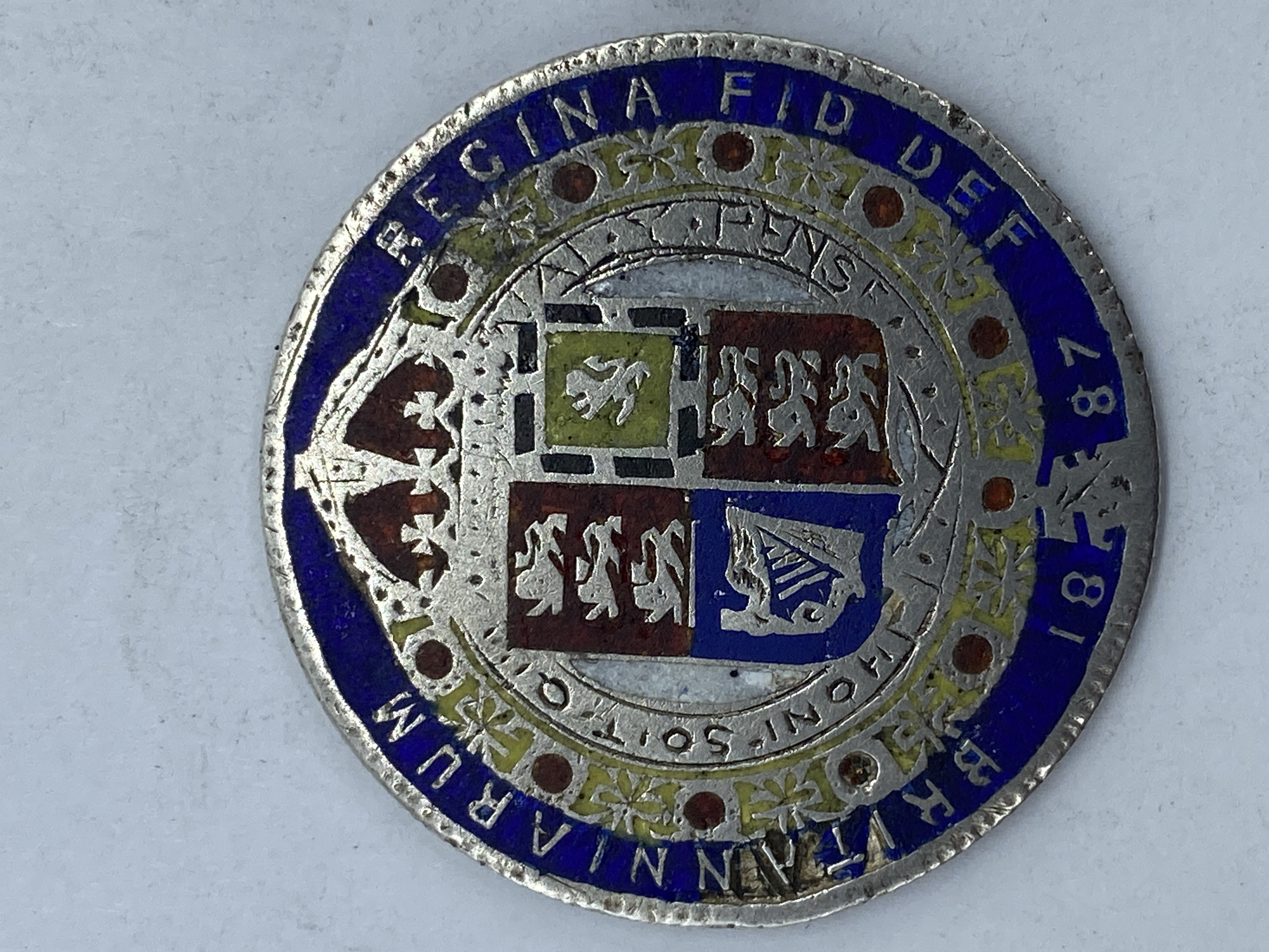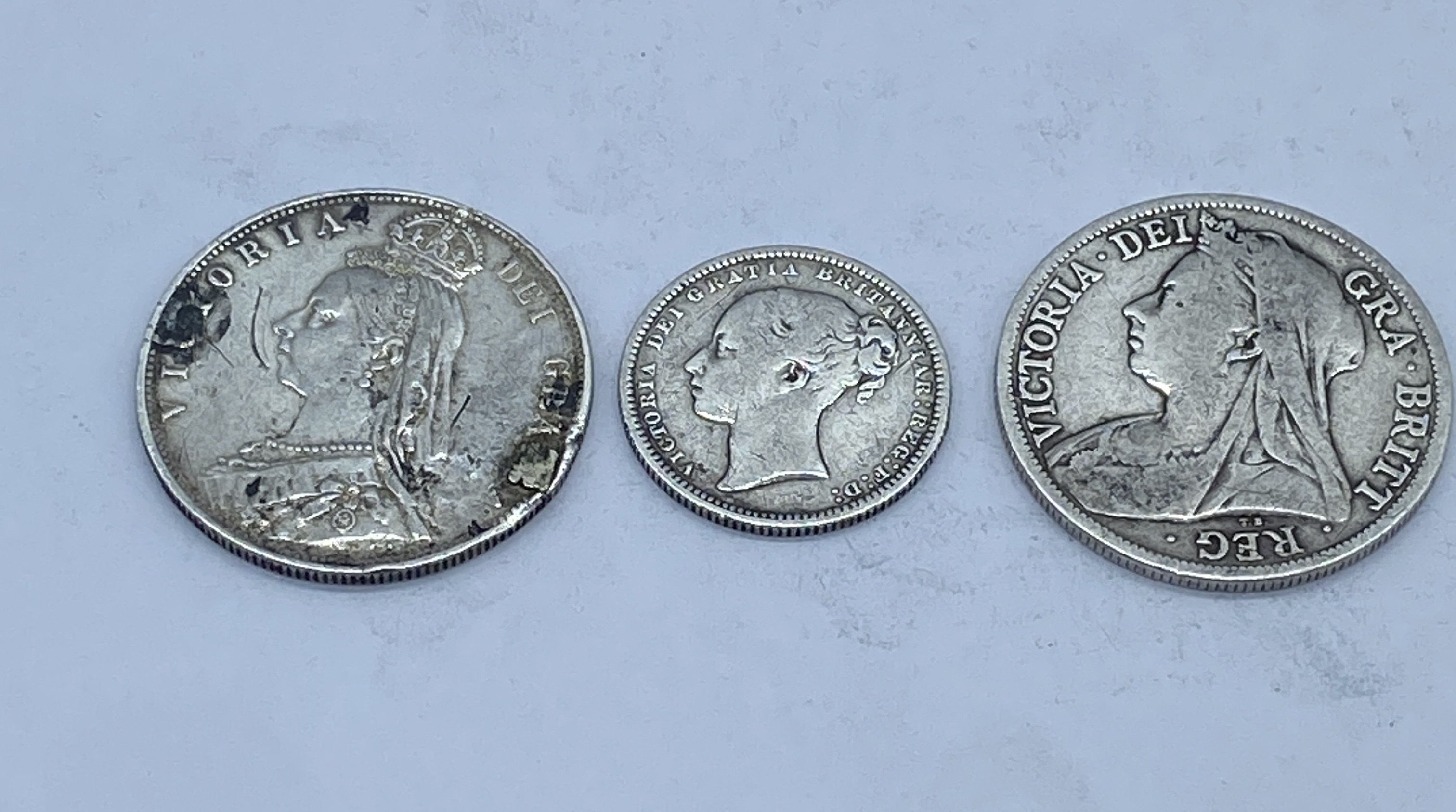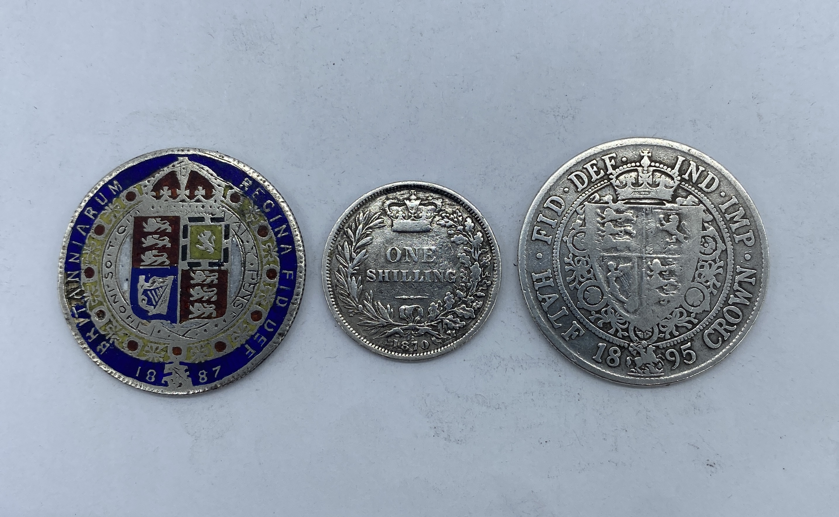 Three British silver coins, including two shillings (one dated 1874, one 1881) and one 1895 half crown, one shilling enamelled.