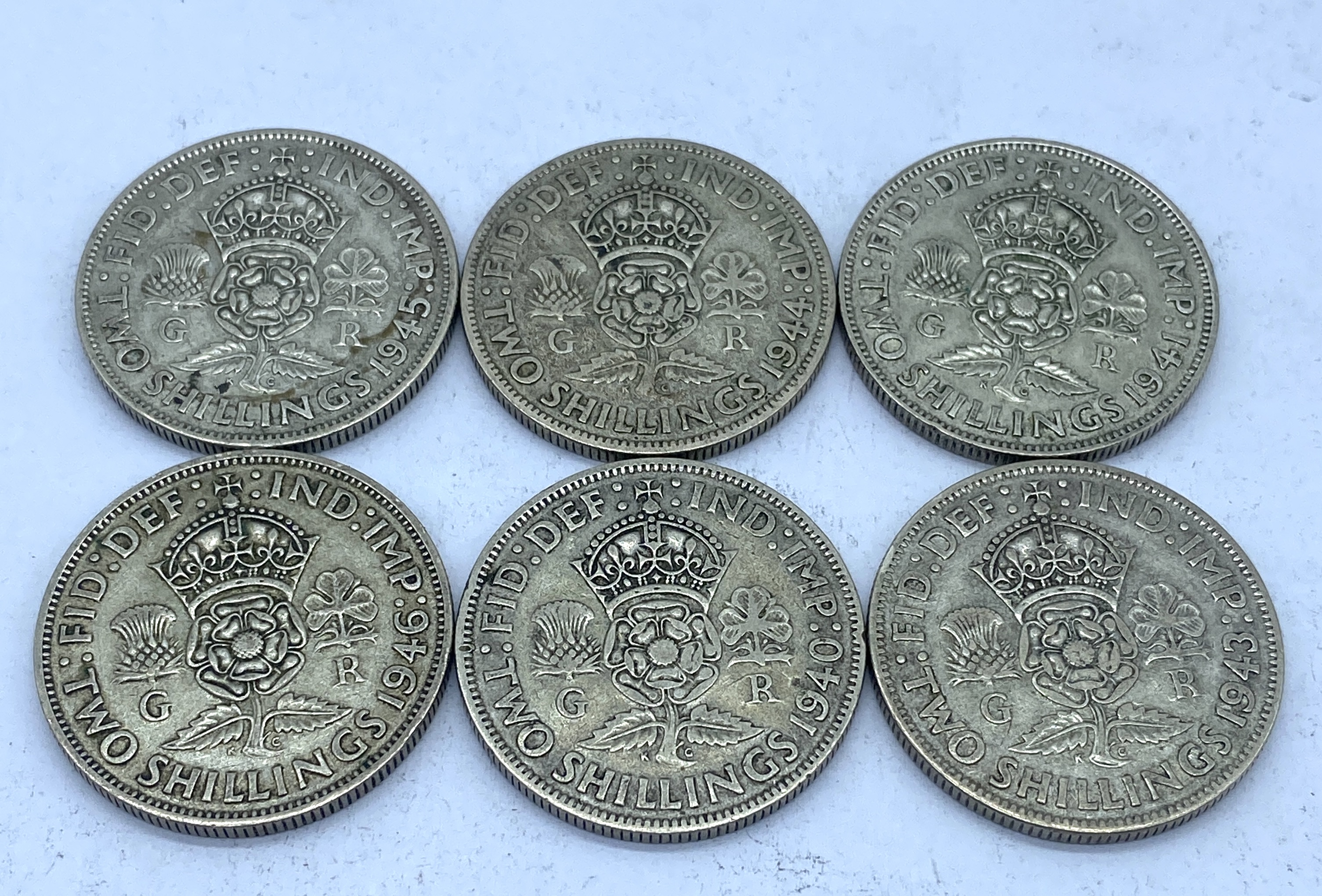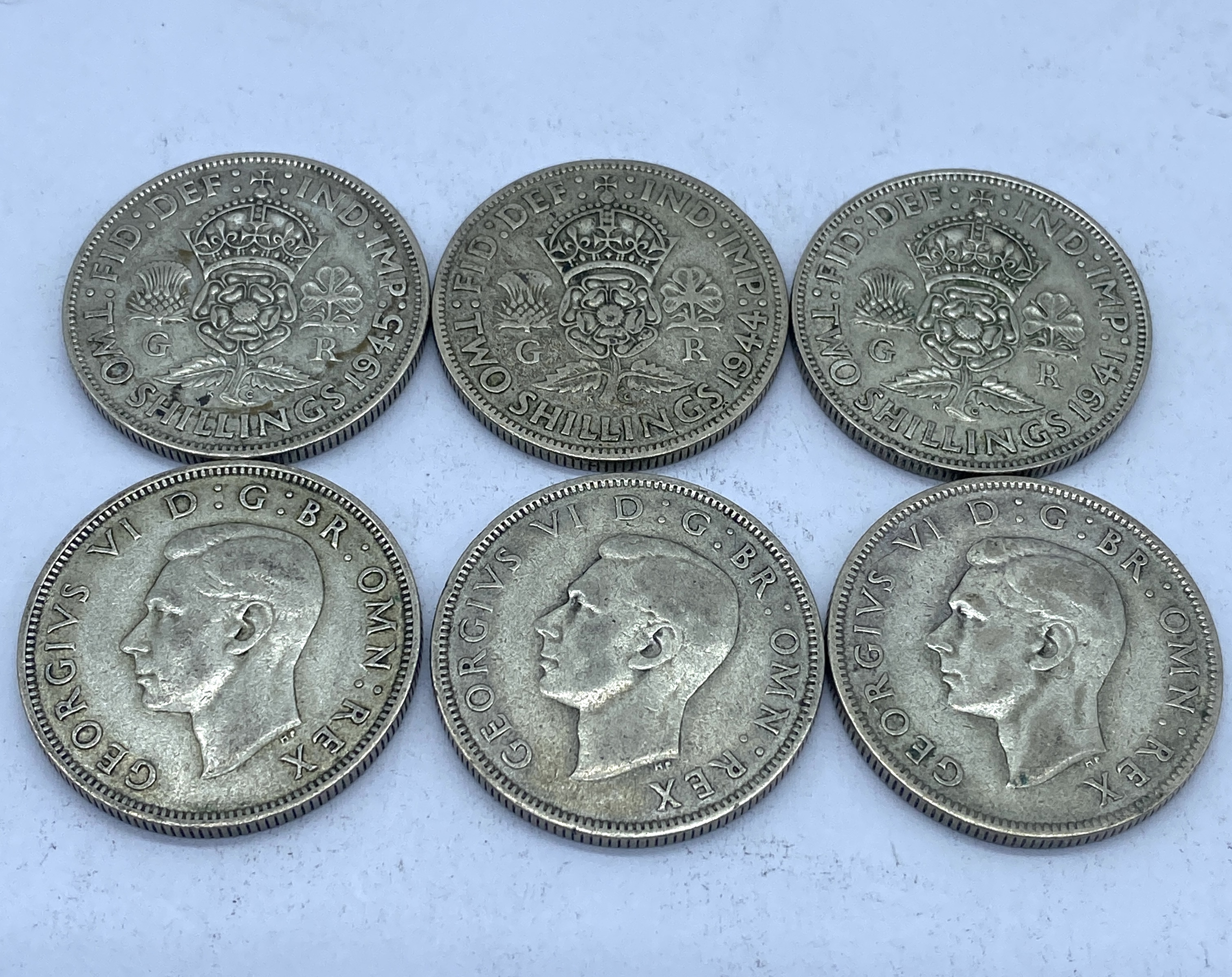 Six silver two shilling coins featuring George VI, three from 1949 and three from 1946.