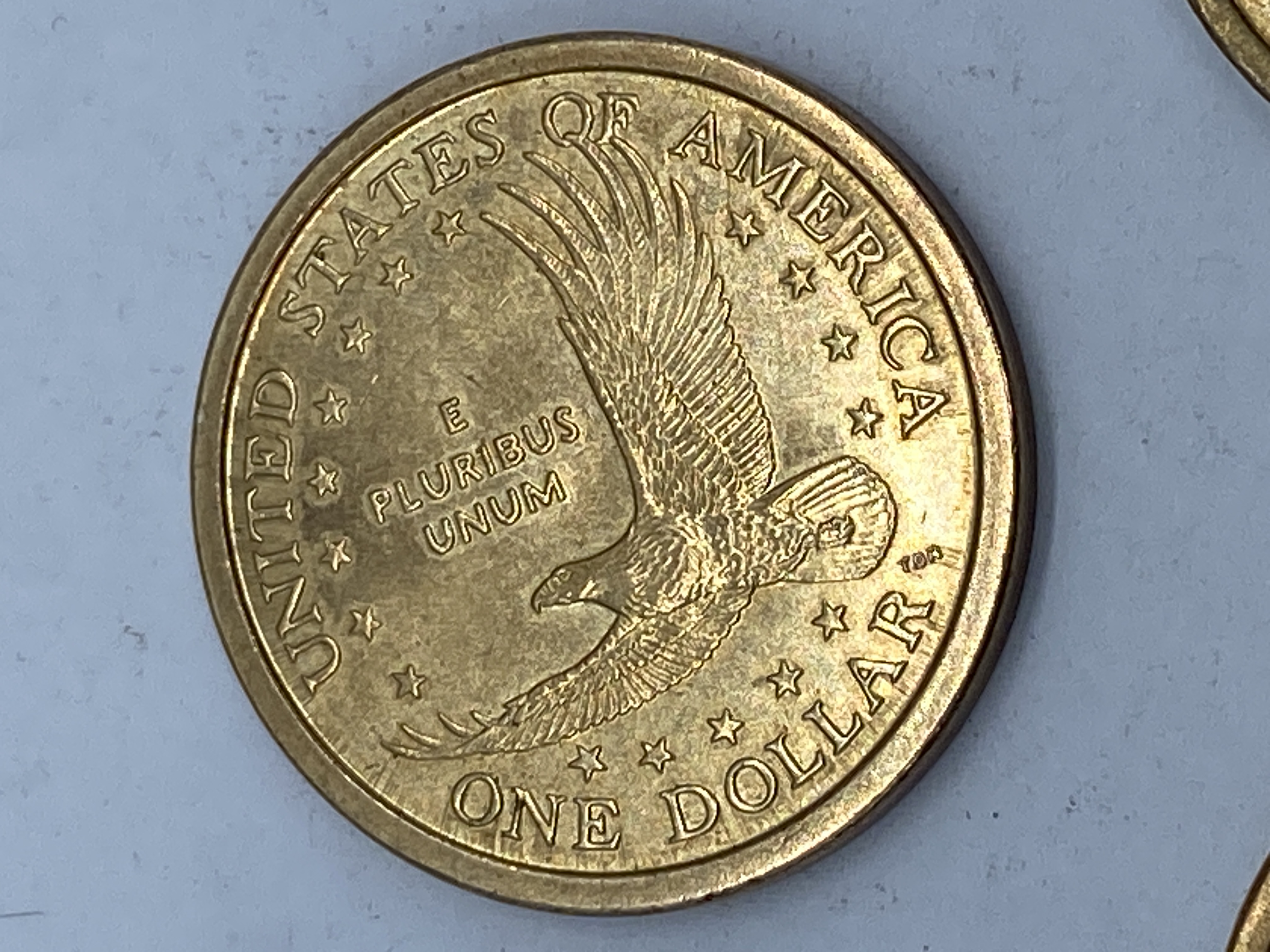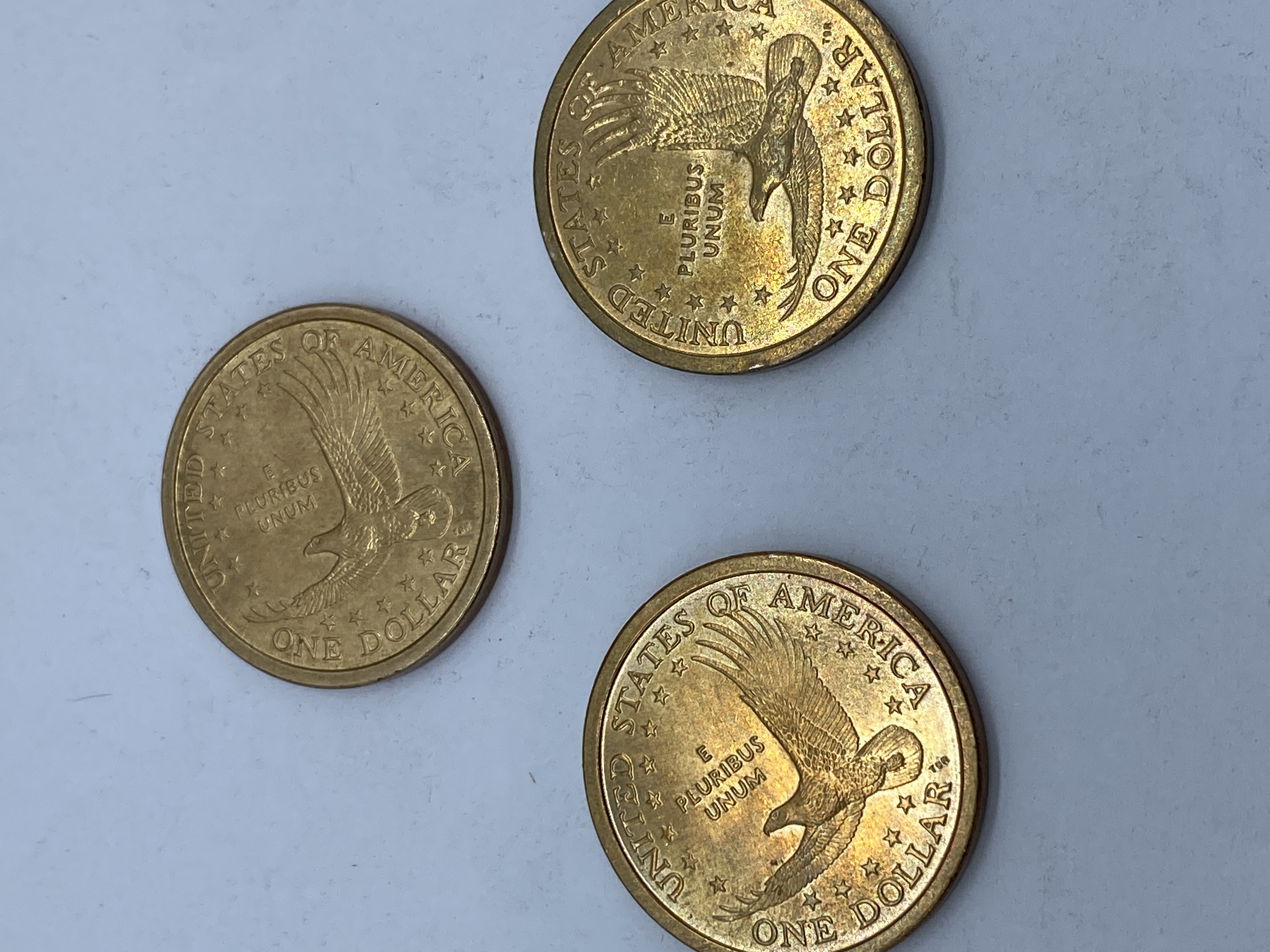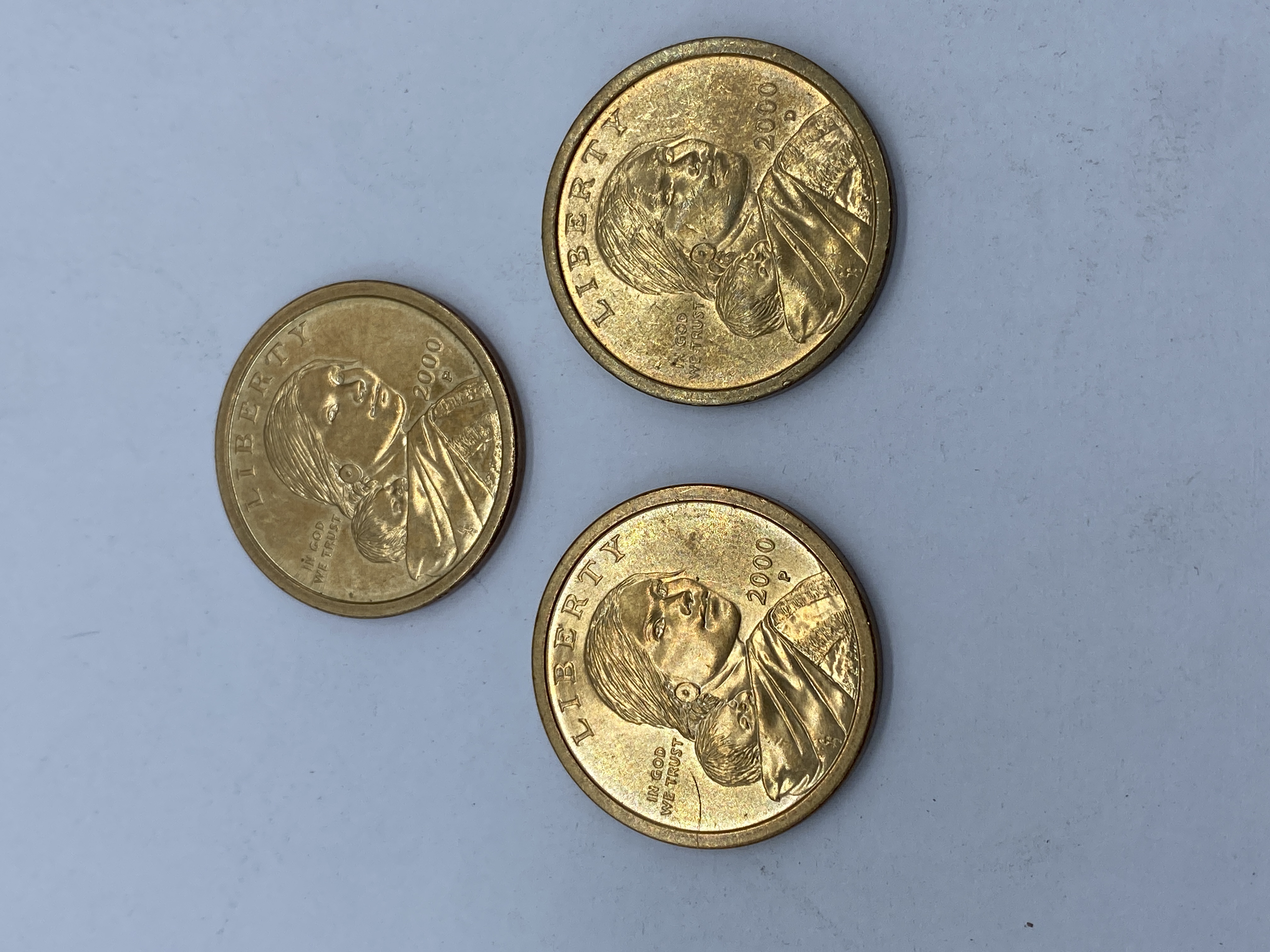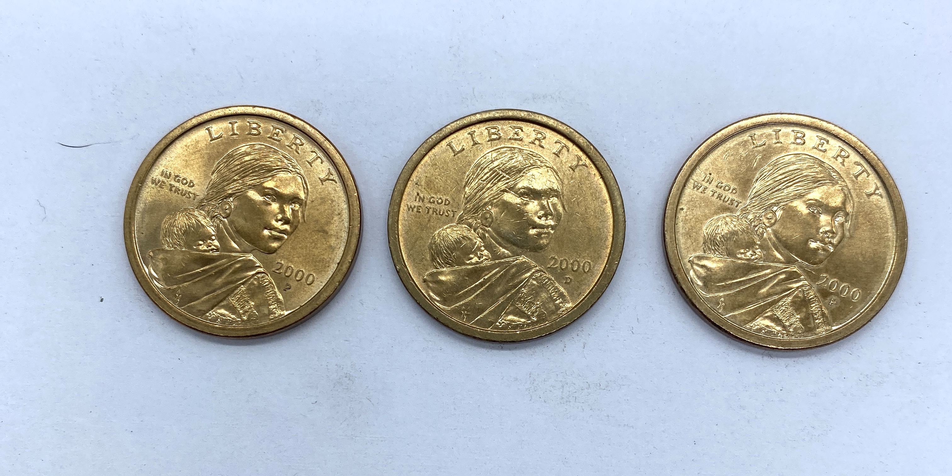 Three gold-colored Sacagawea dollar coins dated 2000.