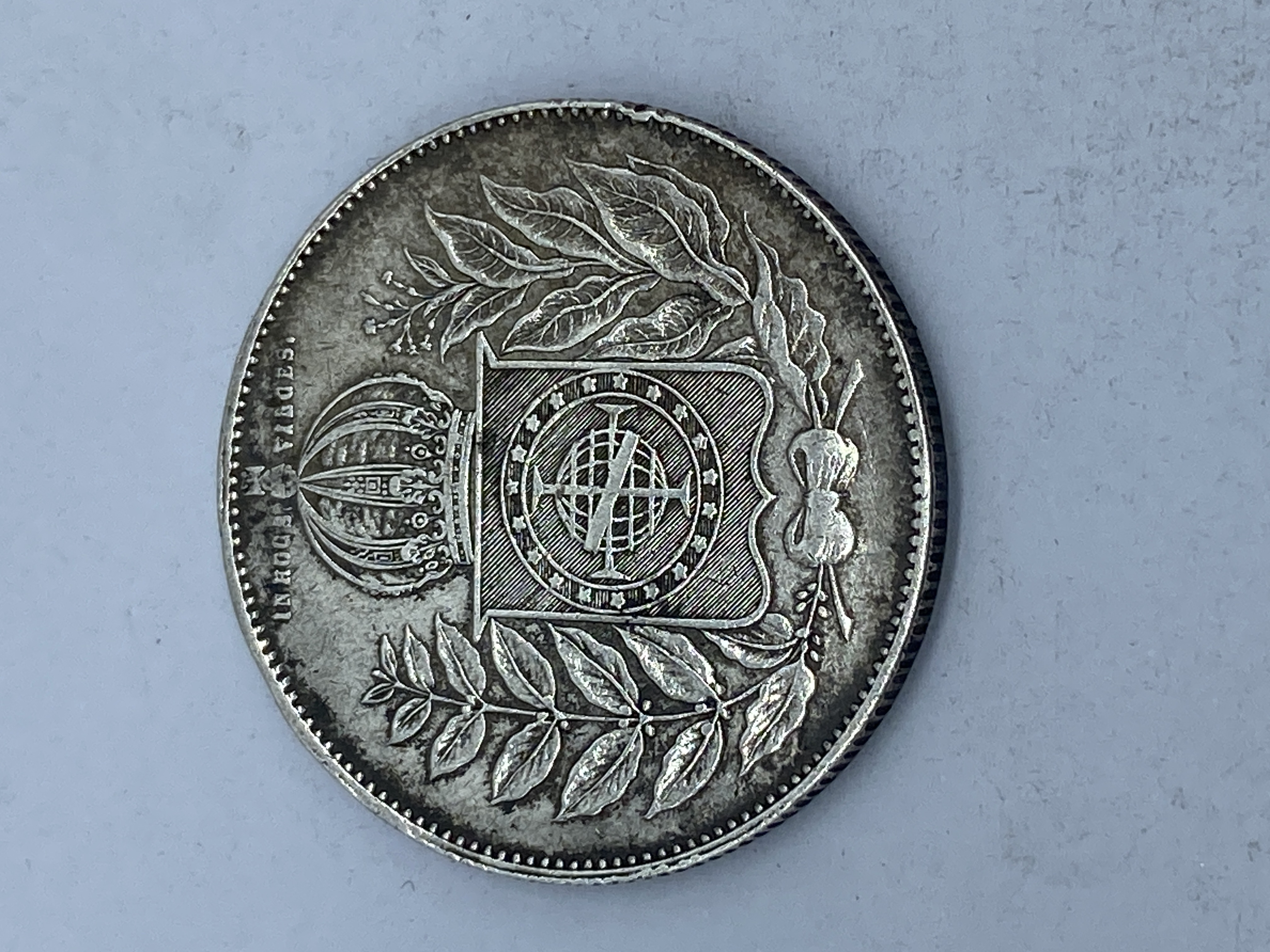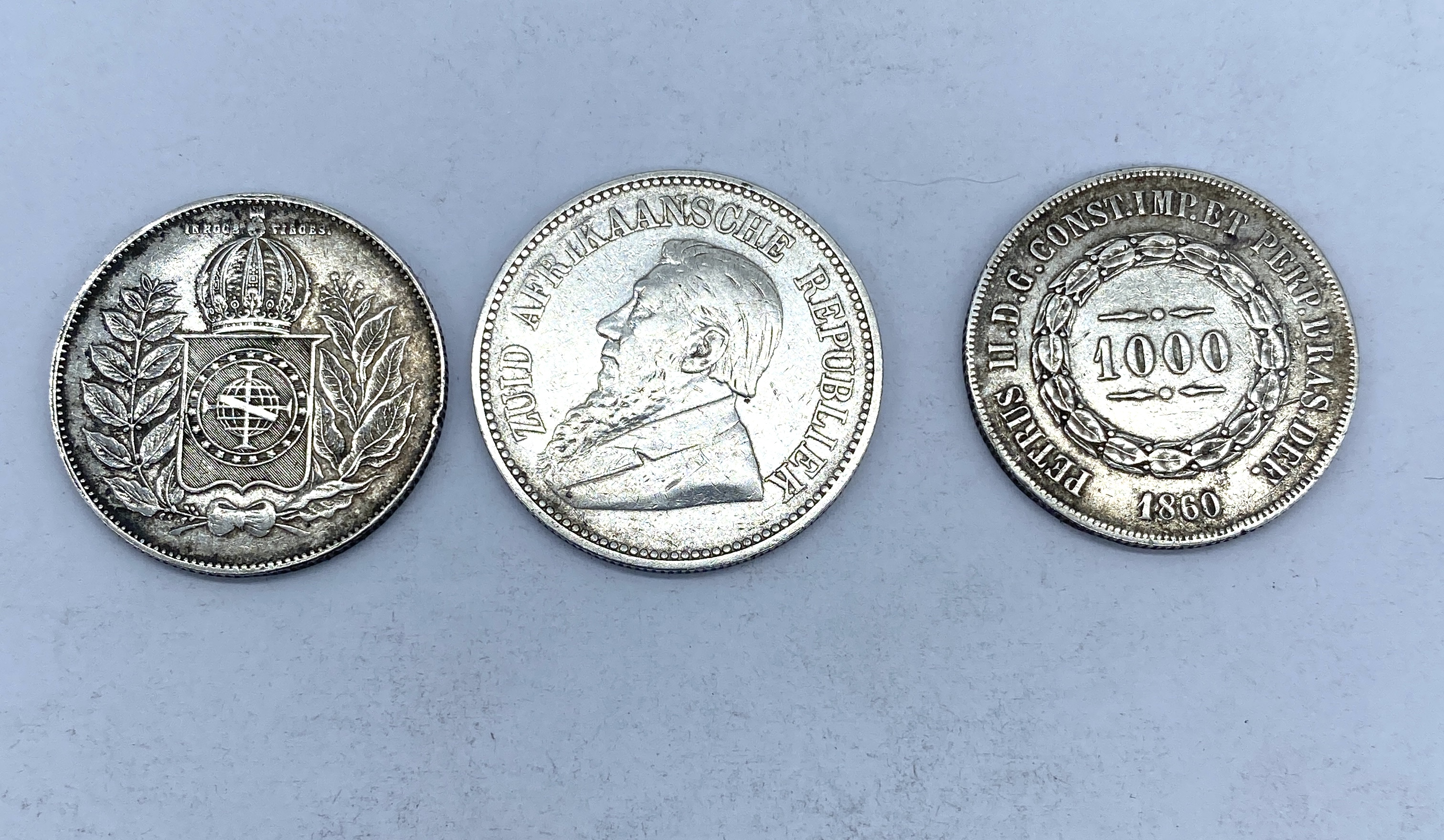 Three silver coins, including a South African 2 1/2 Shillings, a Brazilian 1000 Reis, and a Peruvian 1000 Reis.