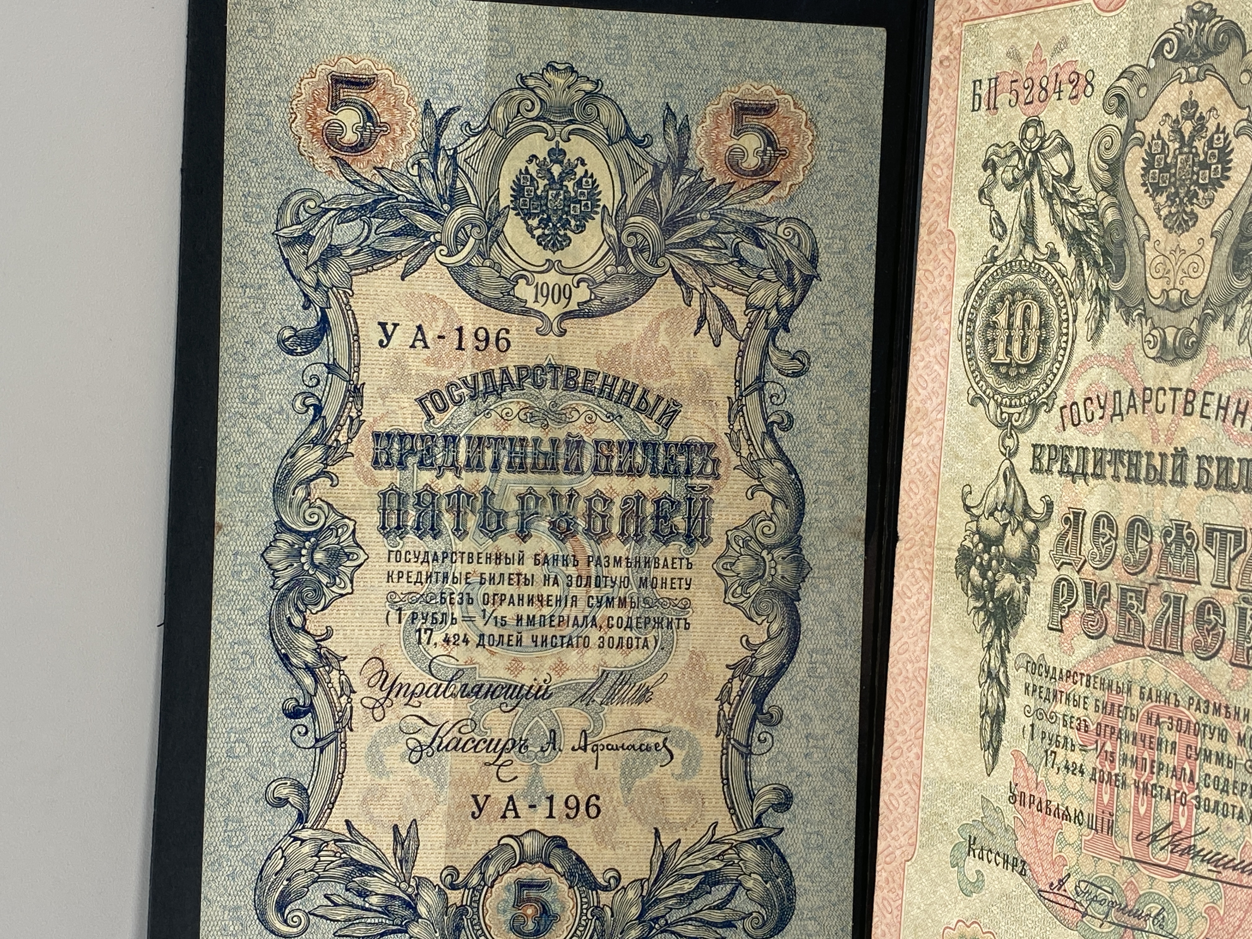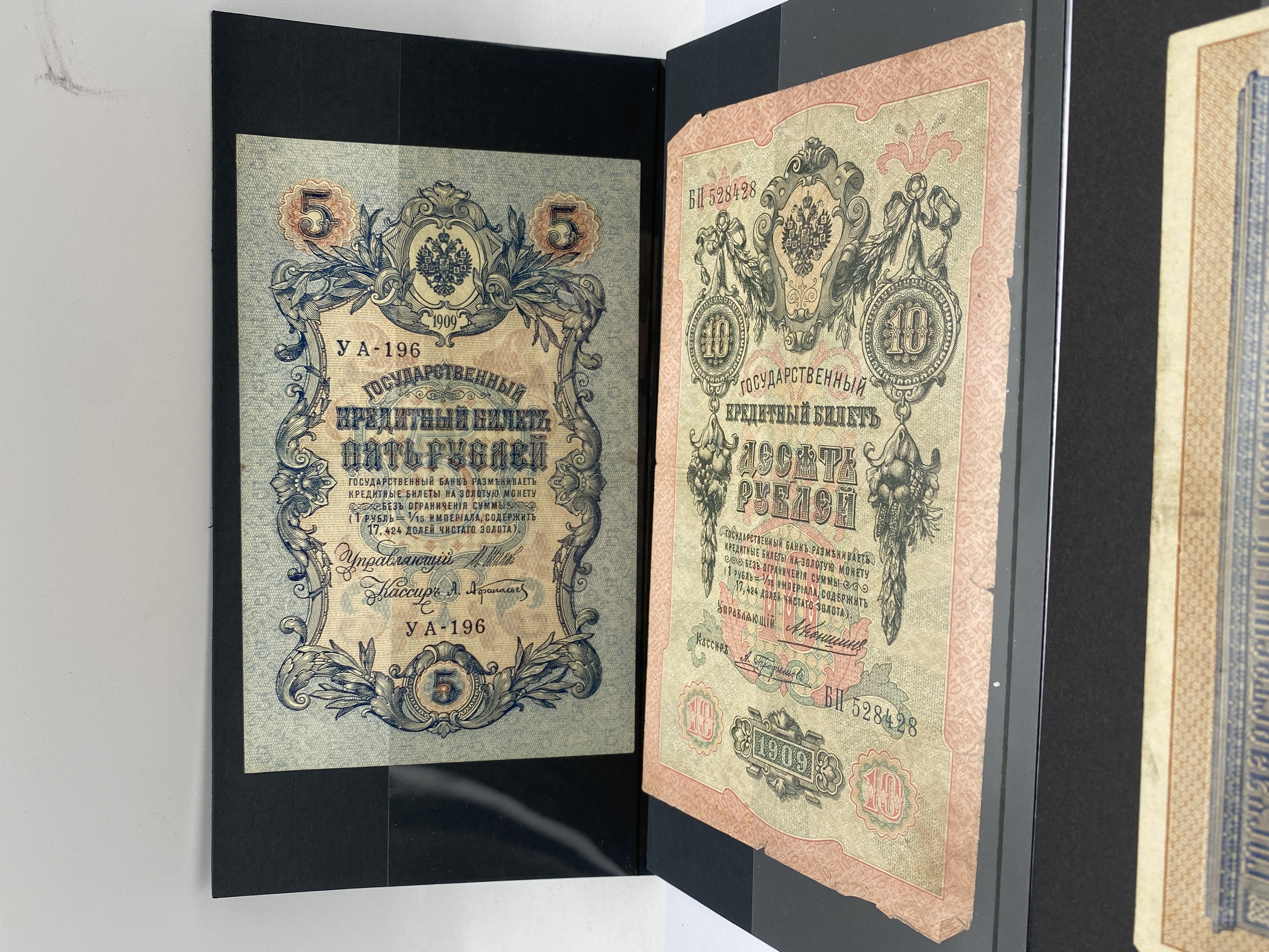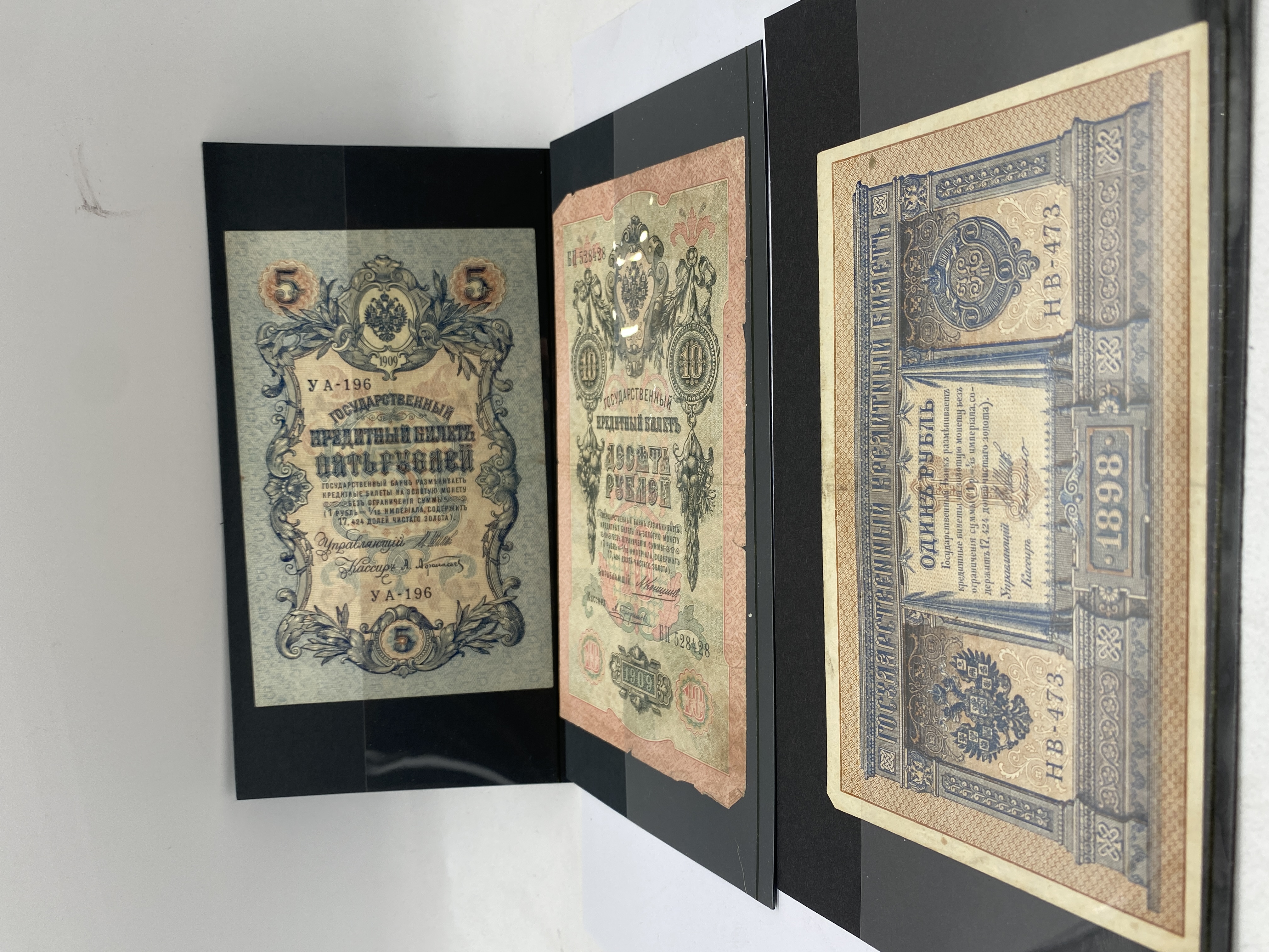 Three Russian banknotes, including a 1 ruble 1898, a 5 ruble 1909, and a 10 ruble note.