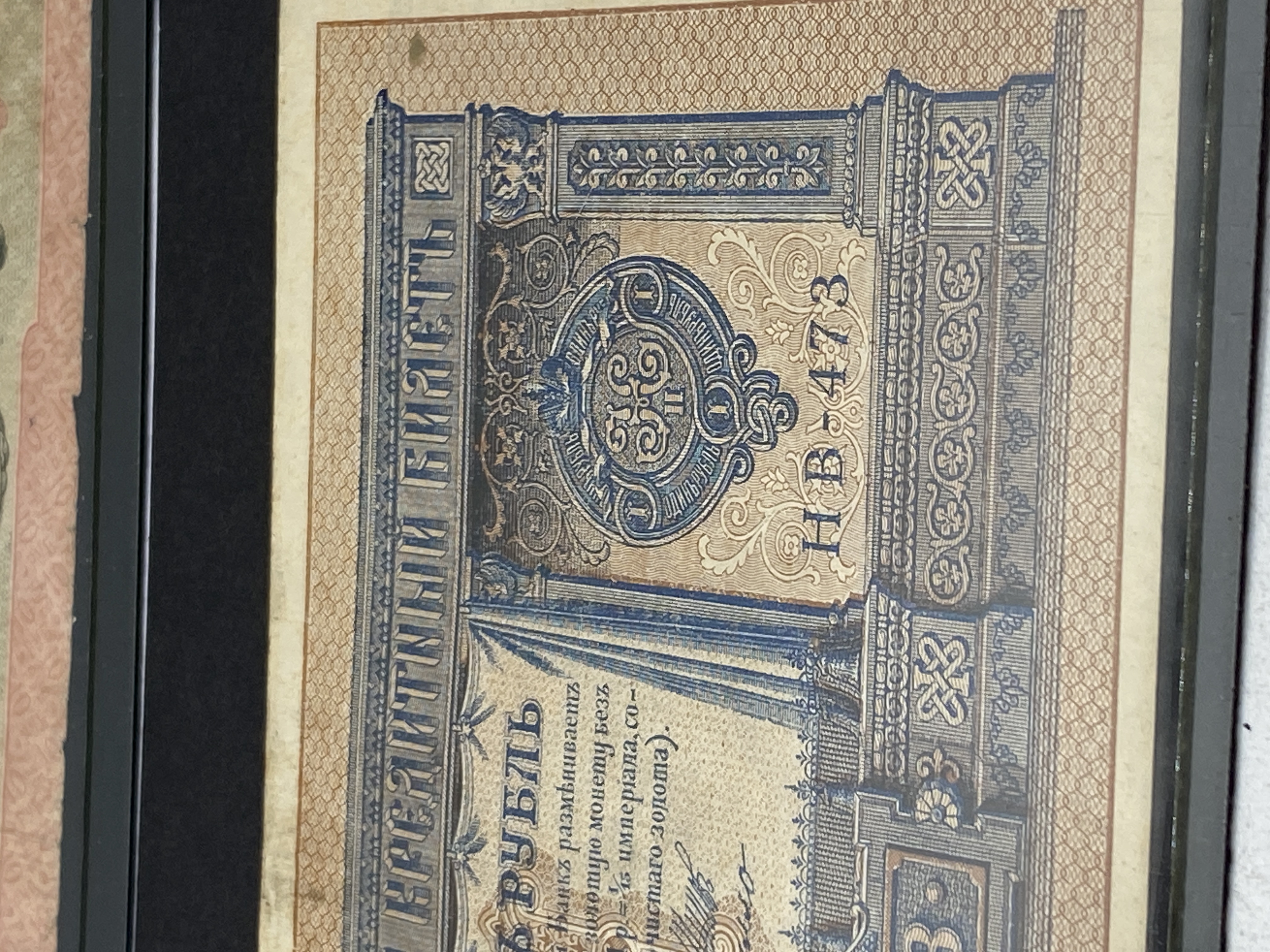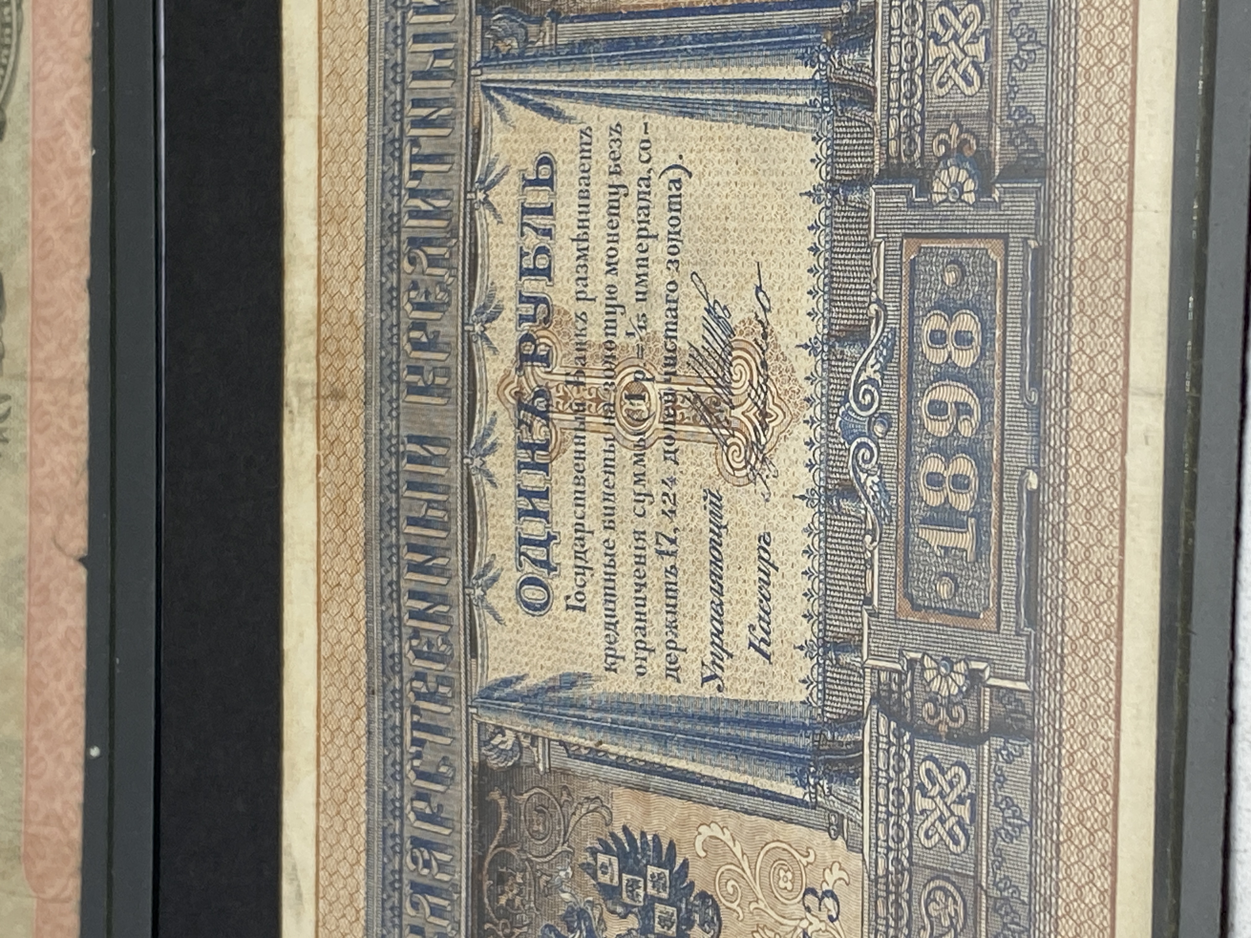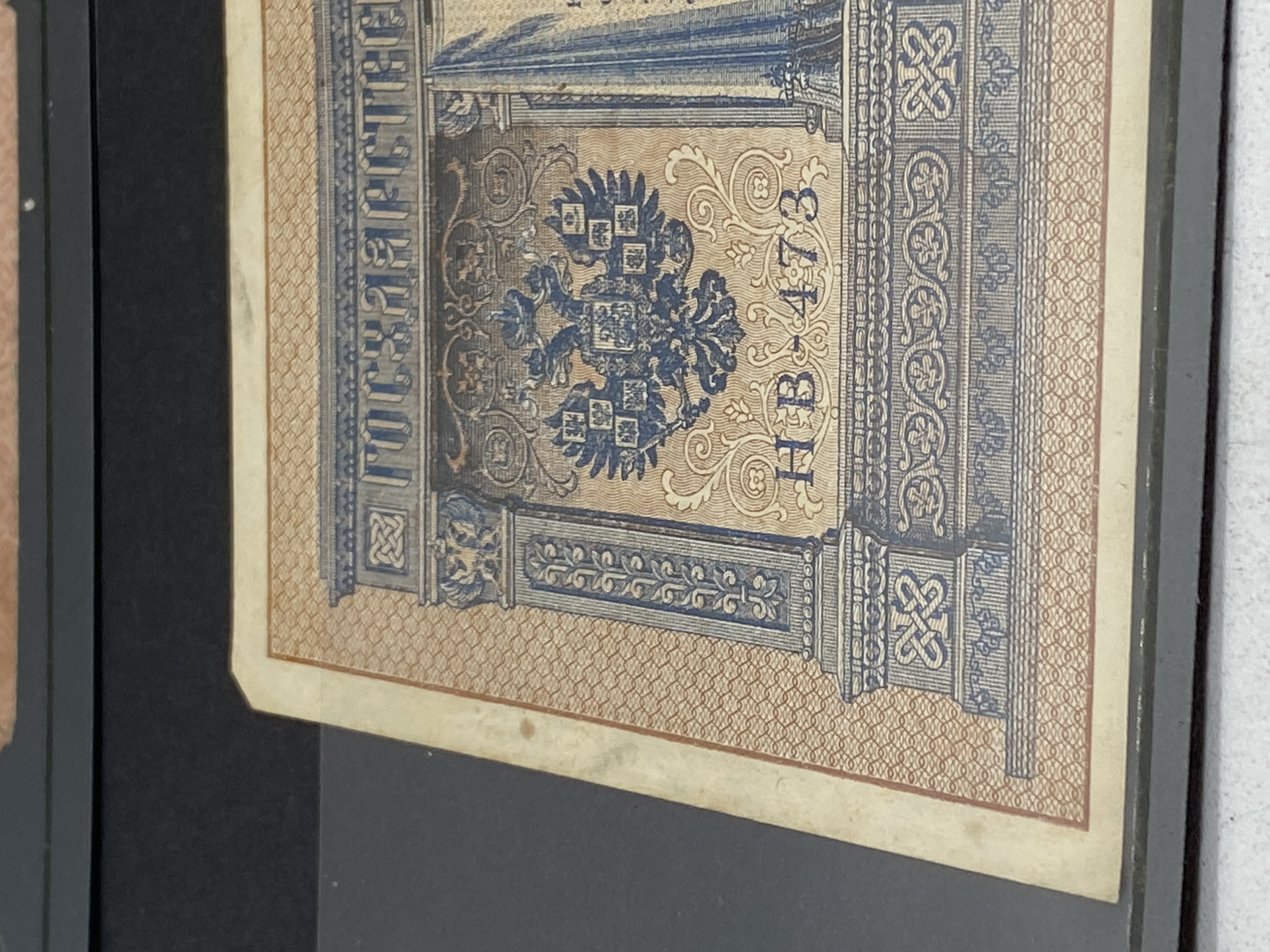 Three Russian banknotes, including a 1 ruble 1898, a 5 ruble 1909, and a 10 ruble note.
