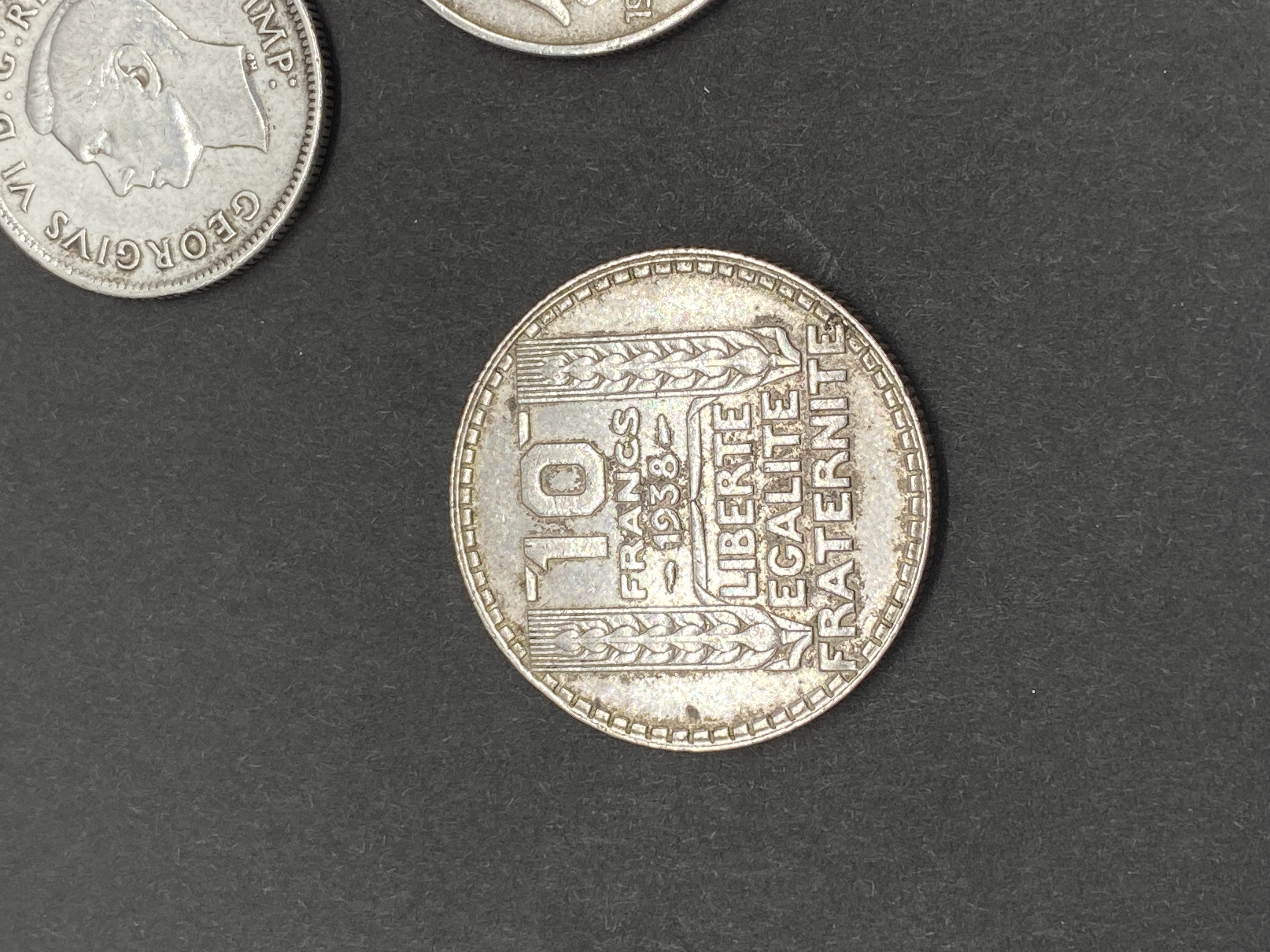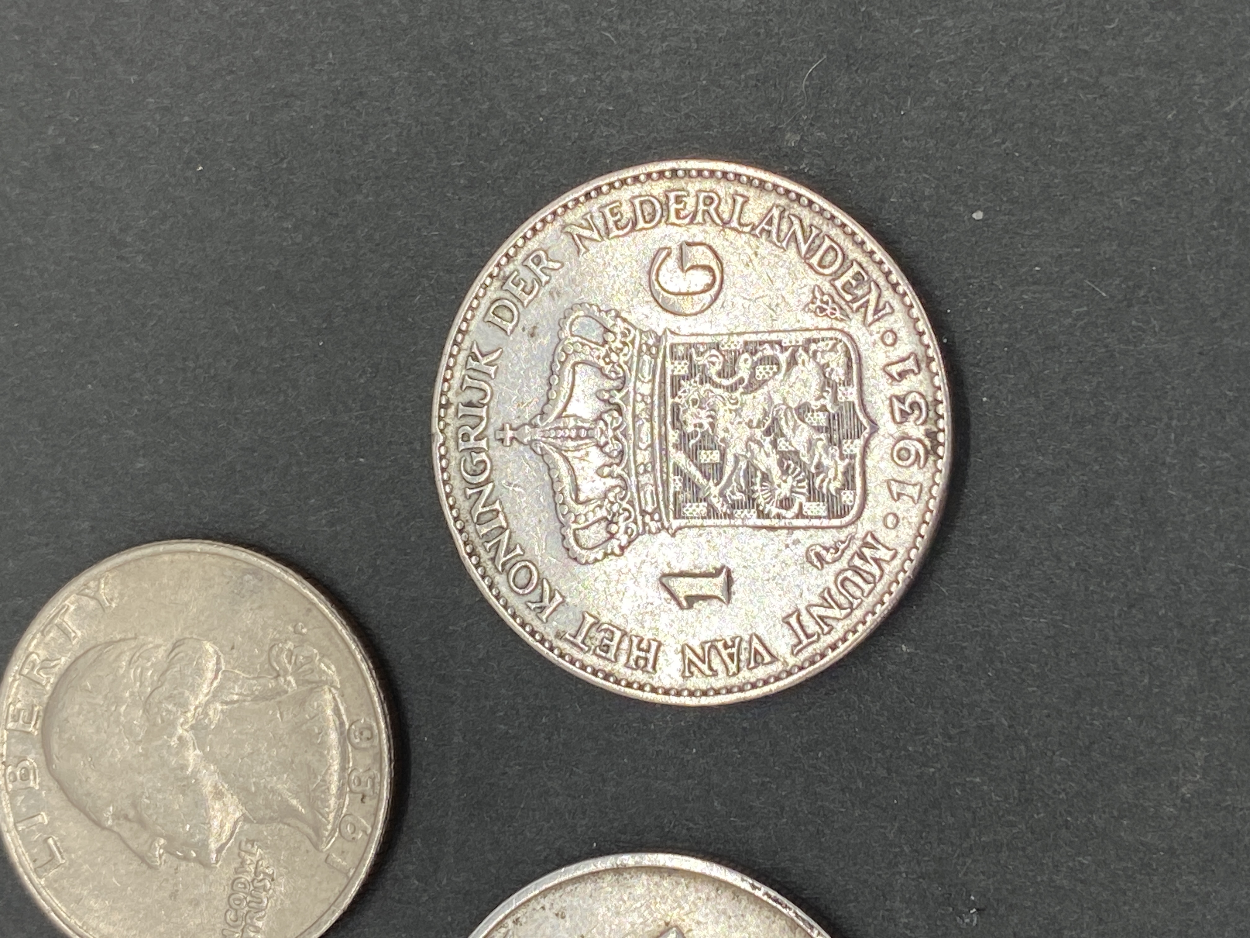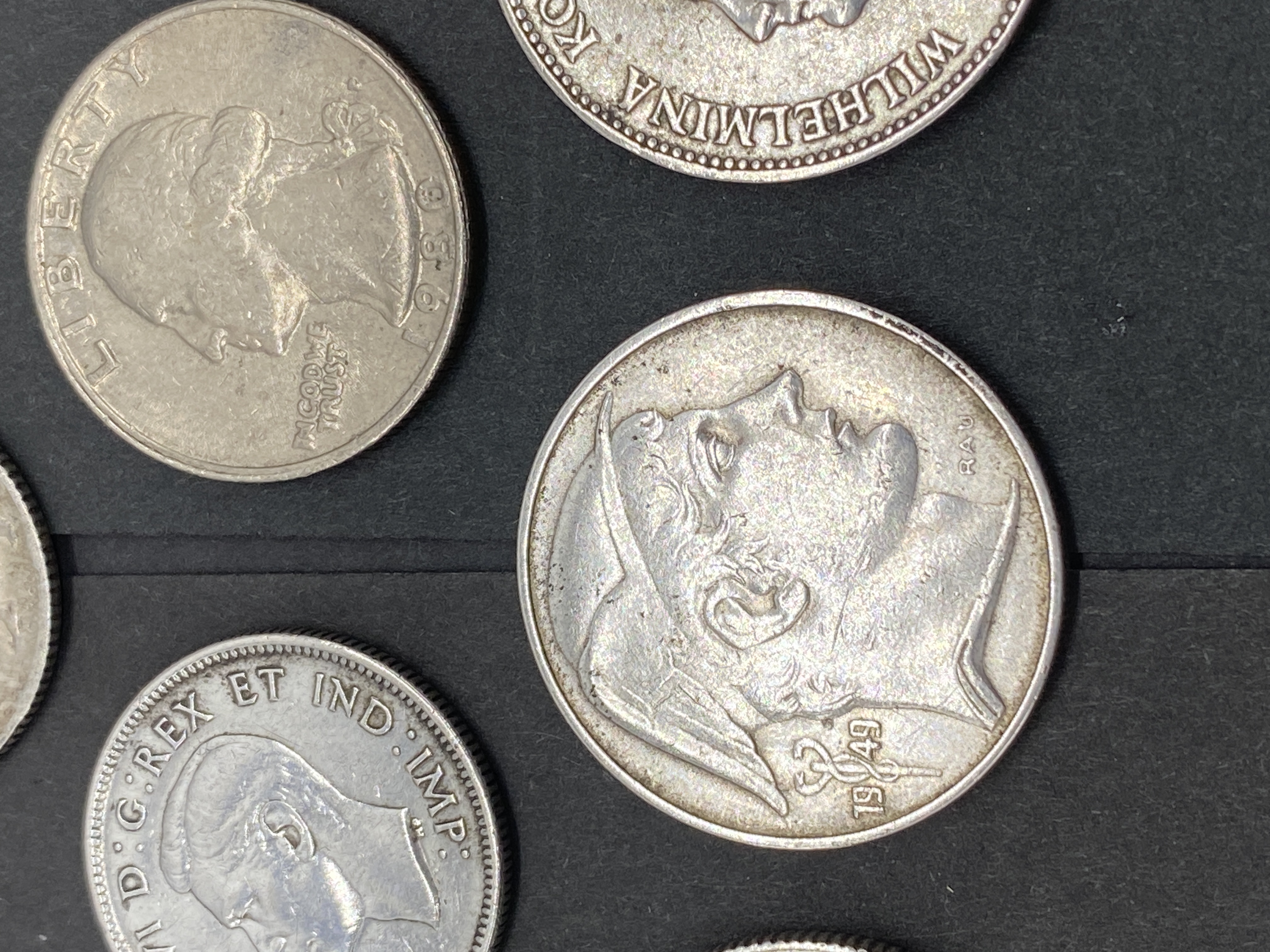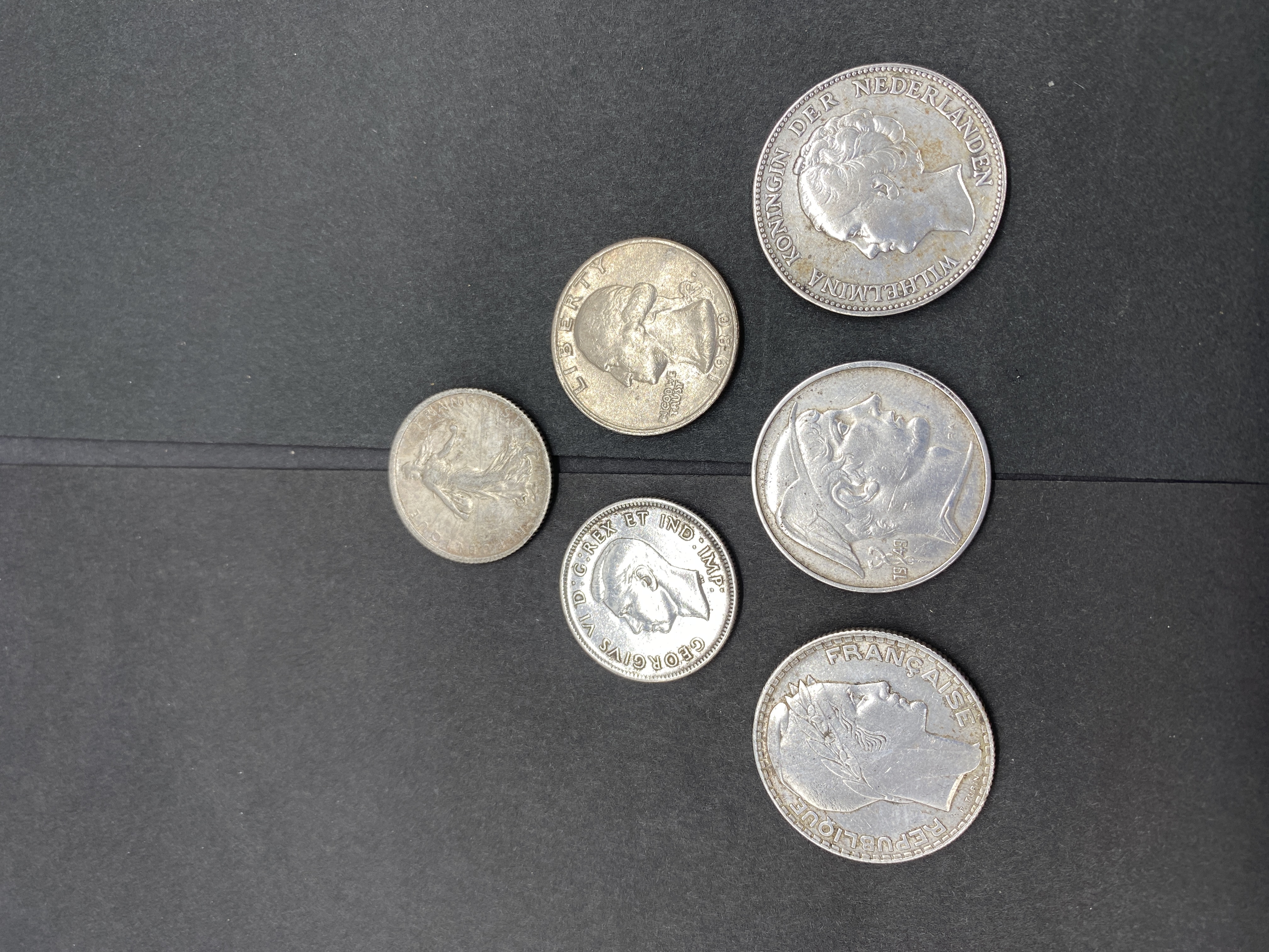 A collection of various silver world coins.