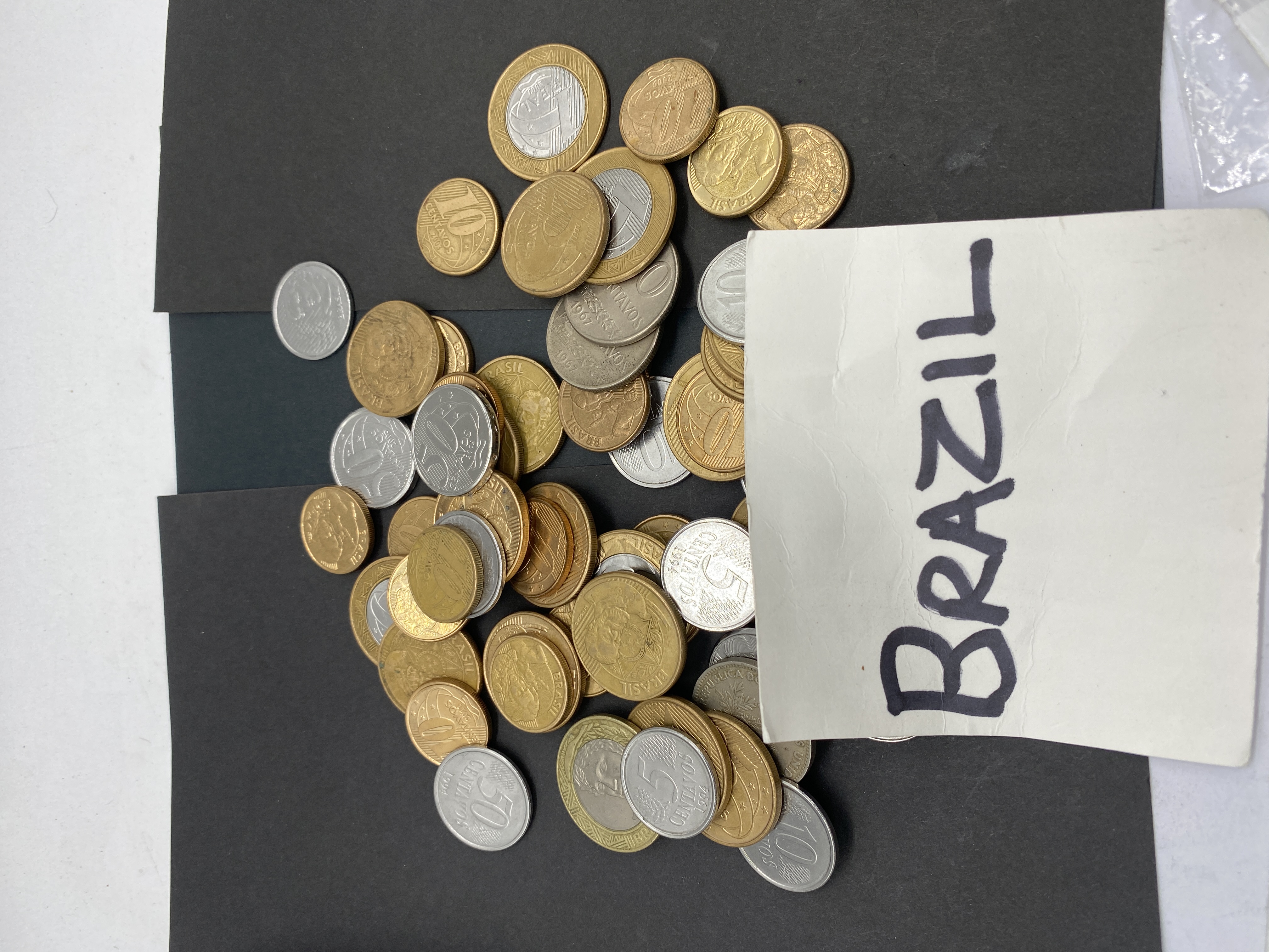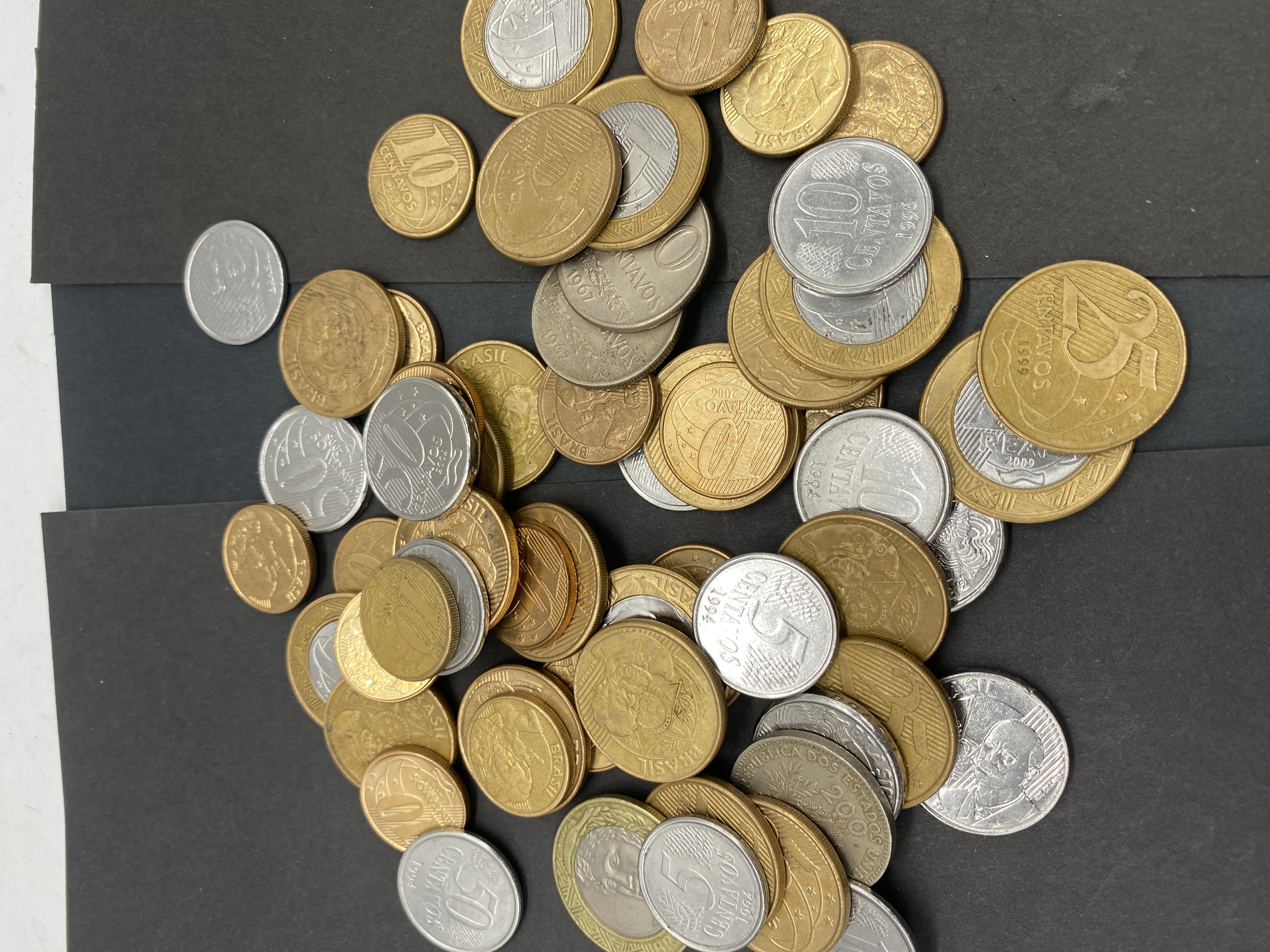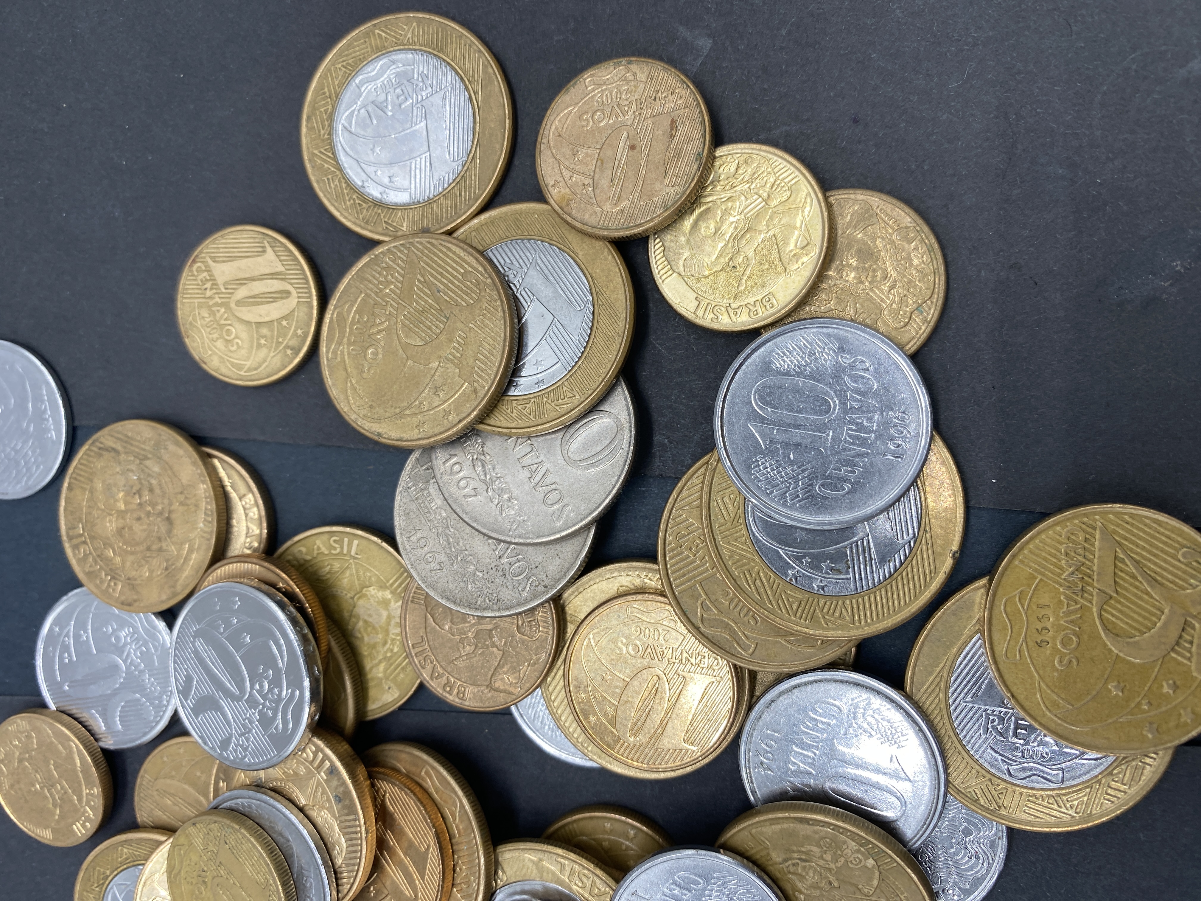 A pile of assorted Brazilian Real coins.